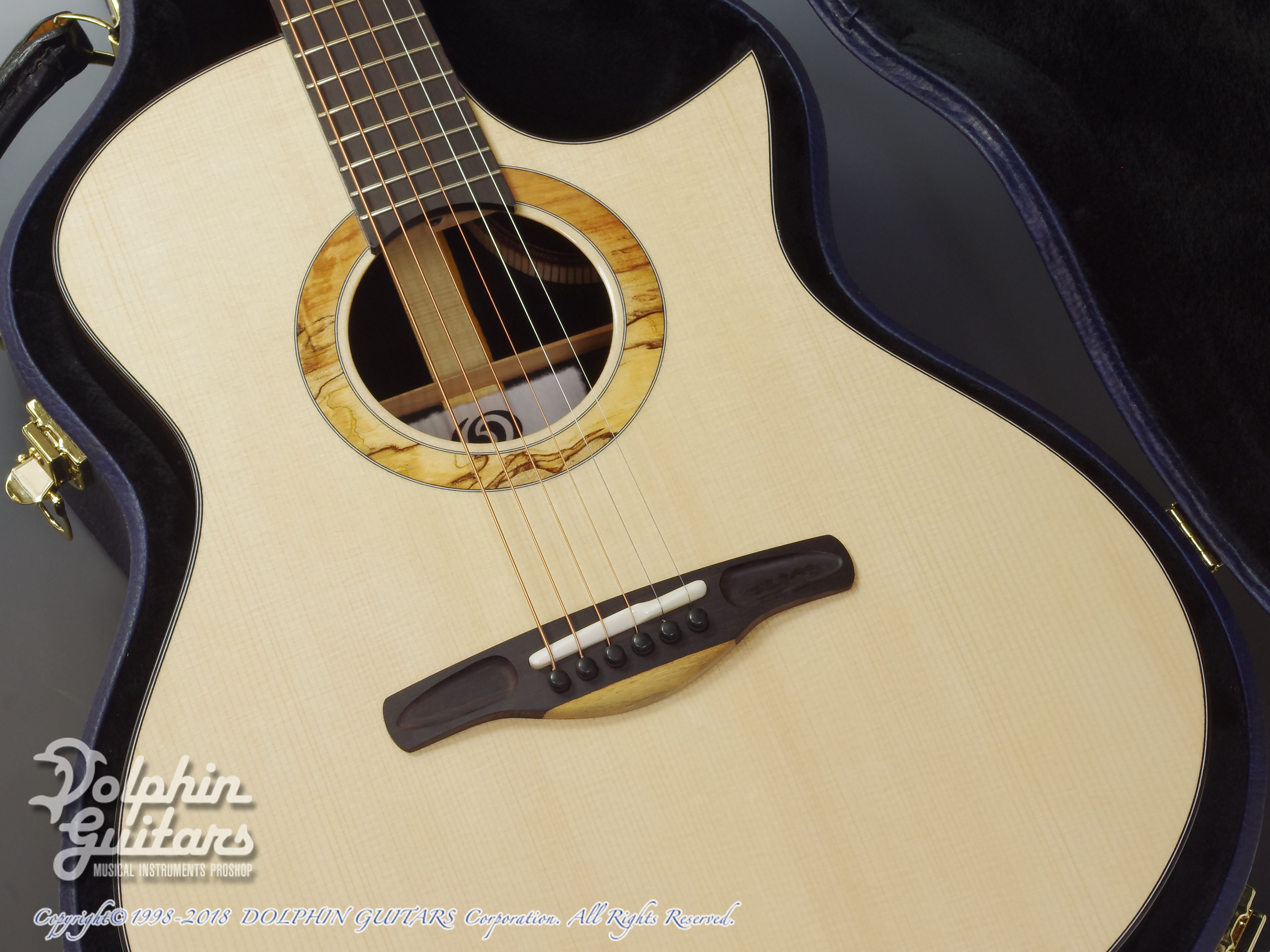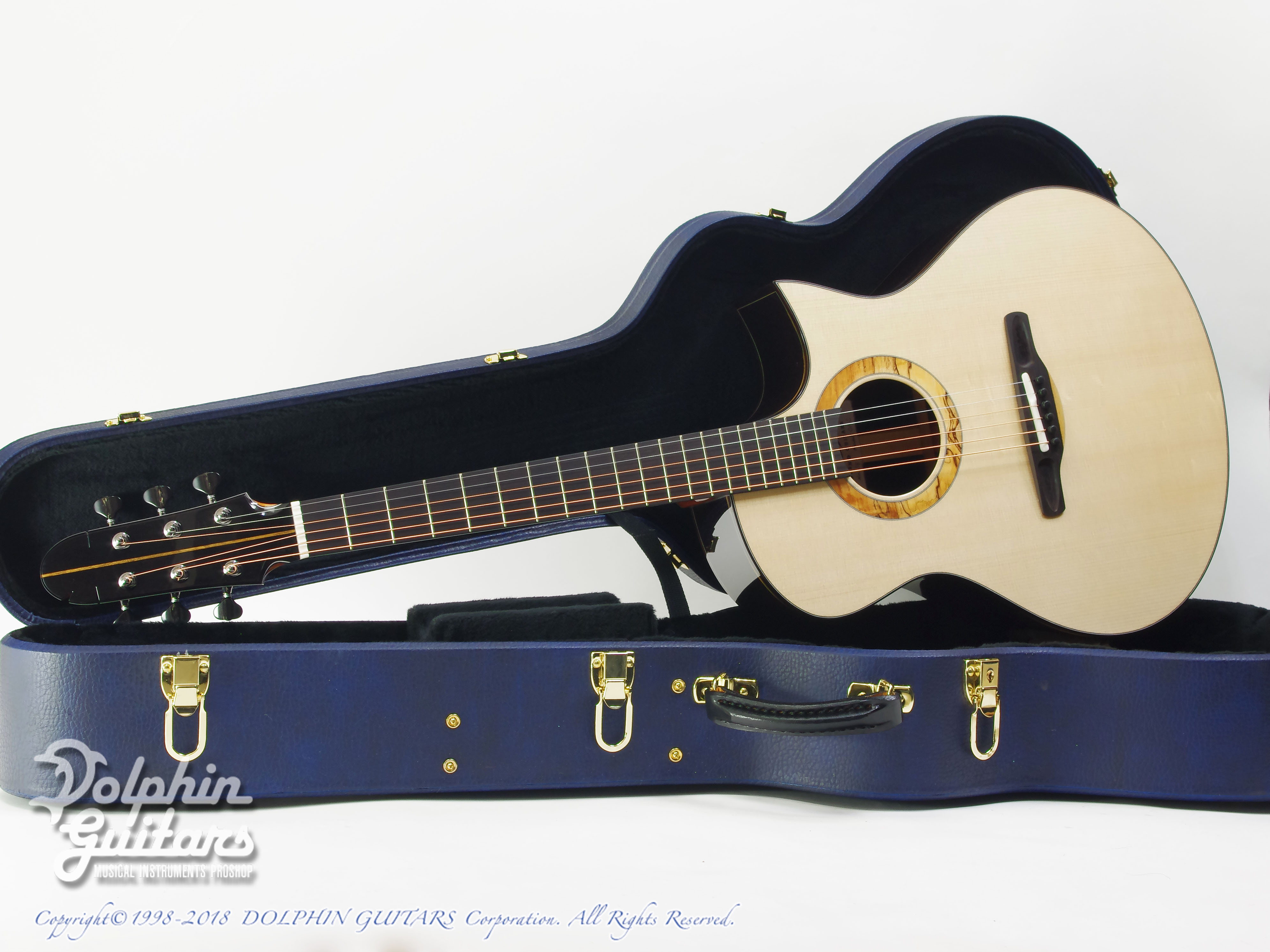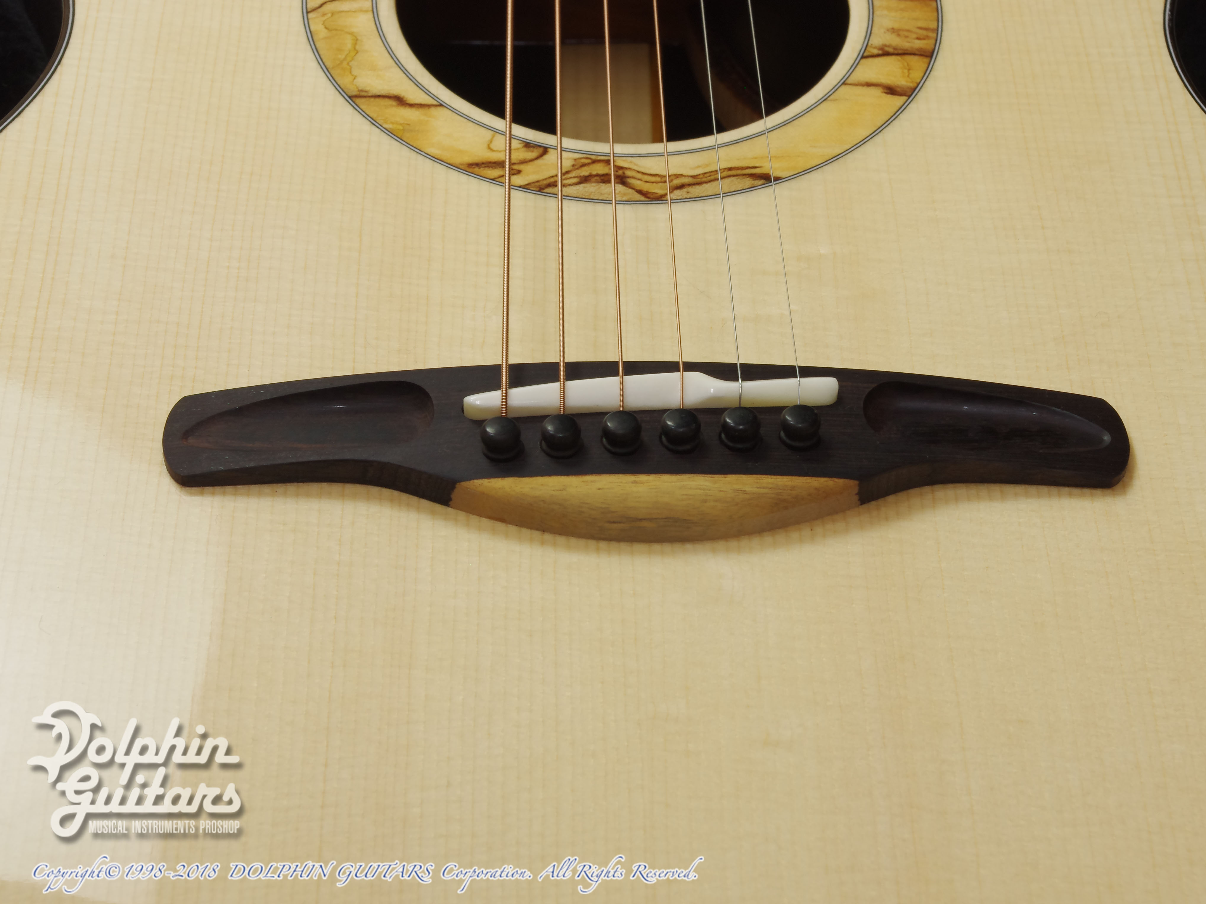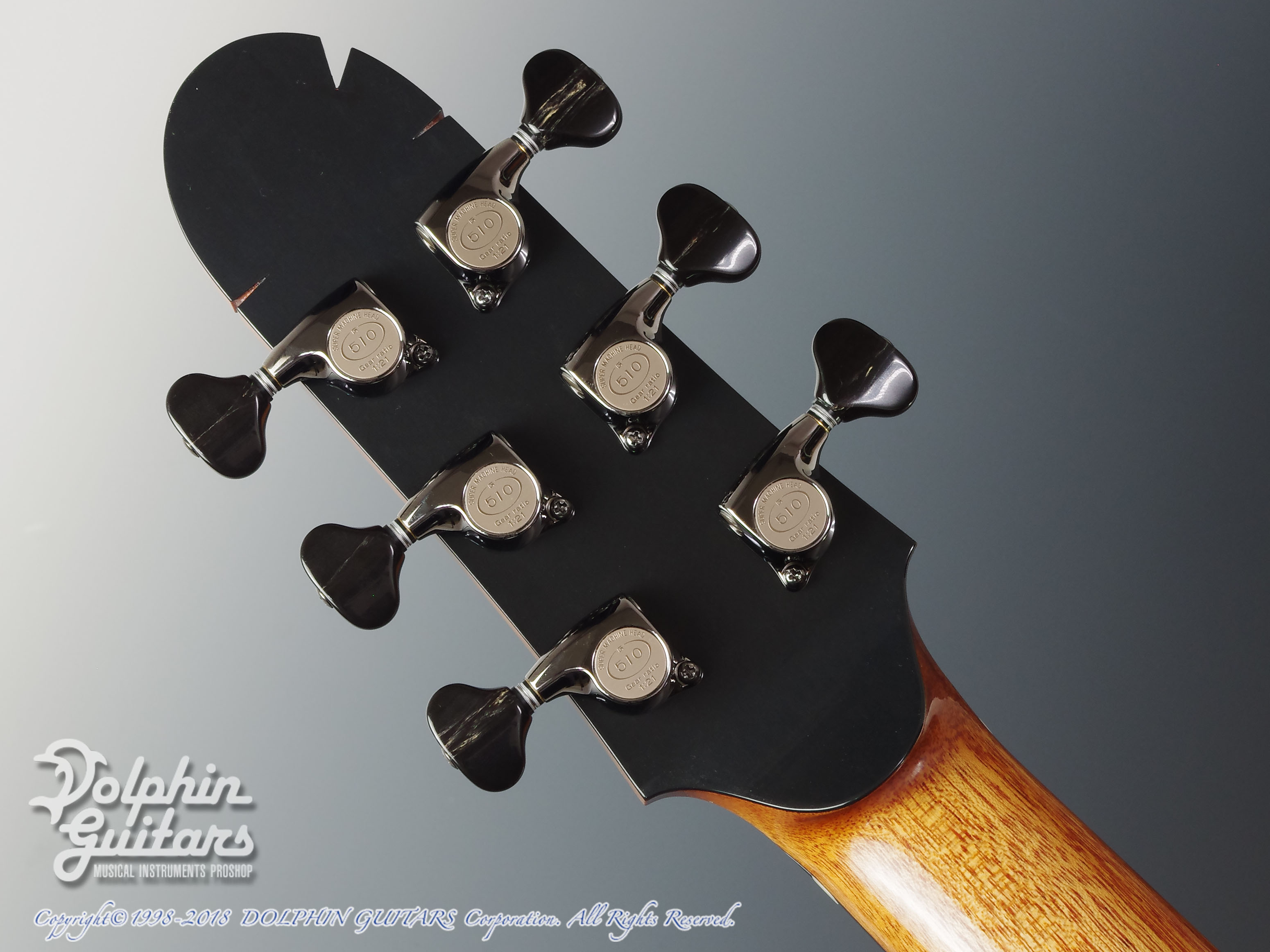 ジャーマン・スプルーストップ、アフリカンブラックウッドS&B、ホンデュラスマホガニー1pネック(アジャスタブルロッド)、オリジナルブレイスパターン、エボニー指板、アフリカンブラックウッドブリッジ、44,5mm幅・スキャロップドナット、約641mmスケール、ウッドロゼッタ、Gotoh510ペグ仕様。