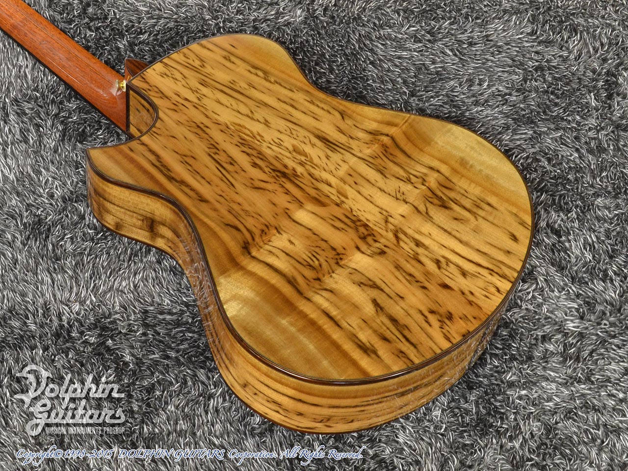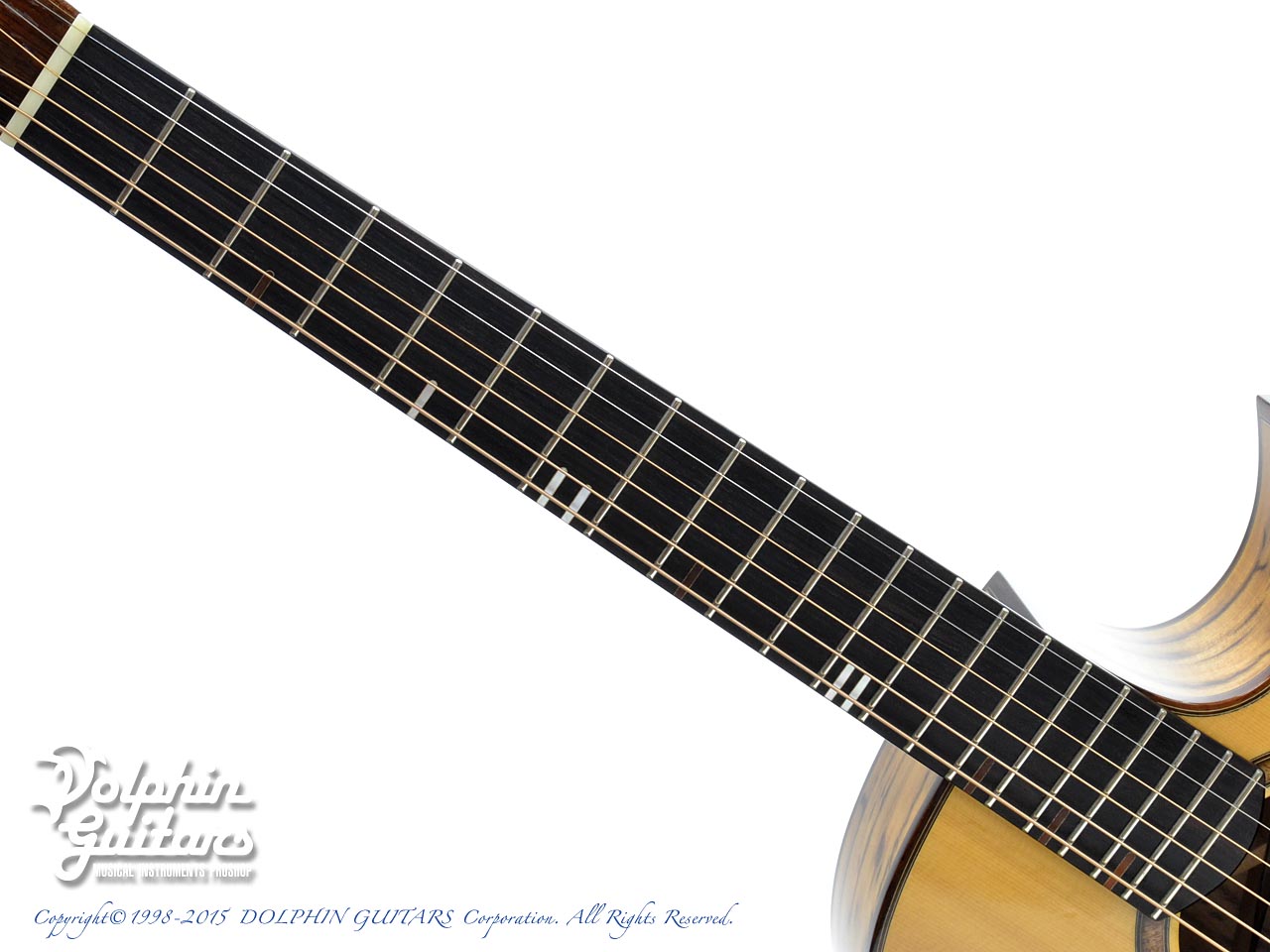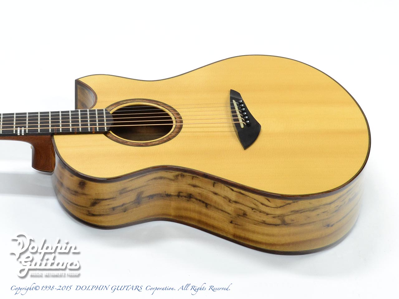 スプルース・トップ、タイガー・マートルウッド・サイド&バック、カッタウェイ、エボニー指板&駒、ローズウッド・バインディング、ゴトー糸巻き。