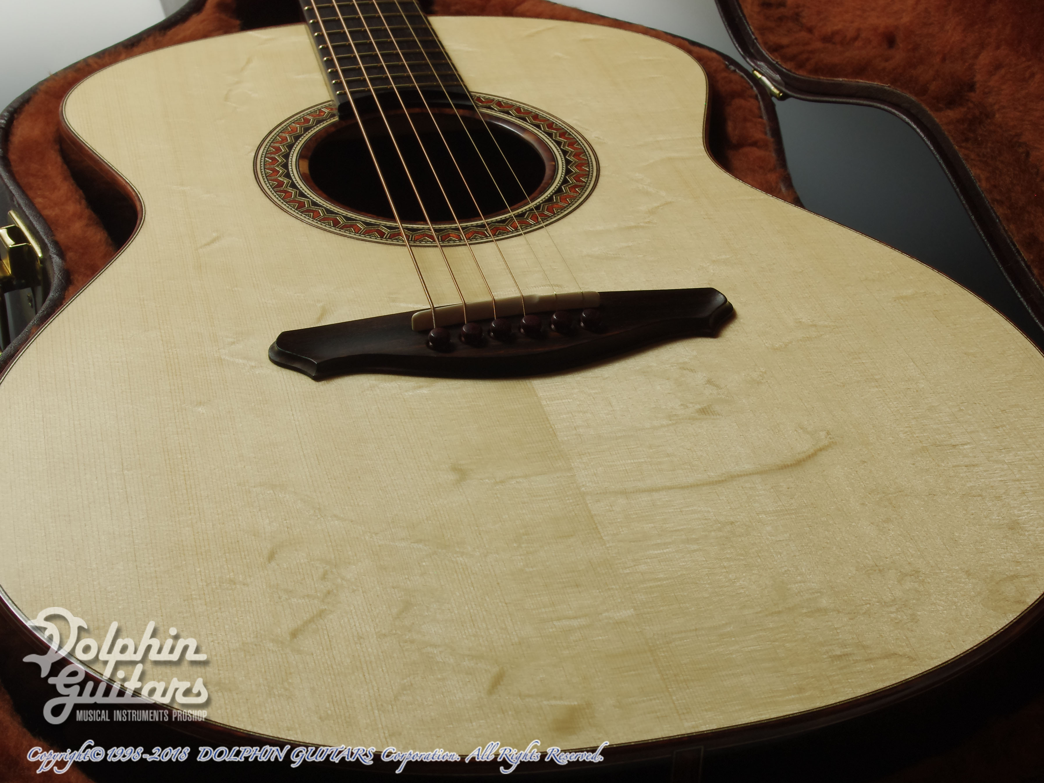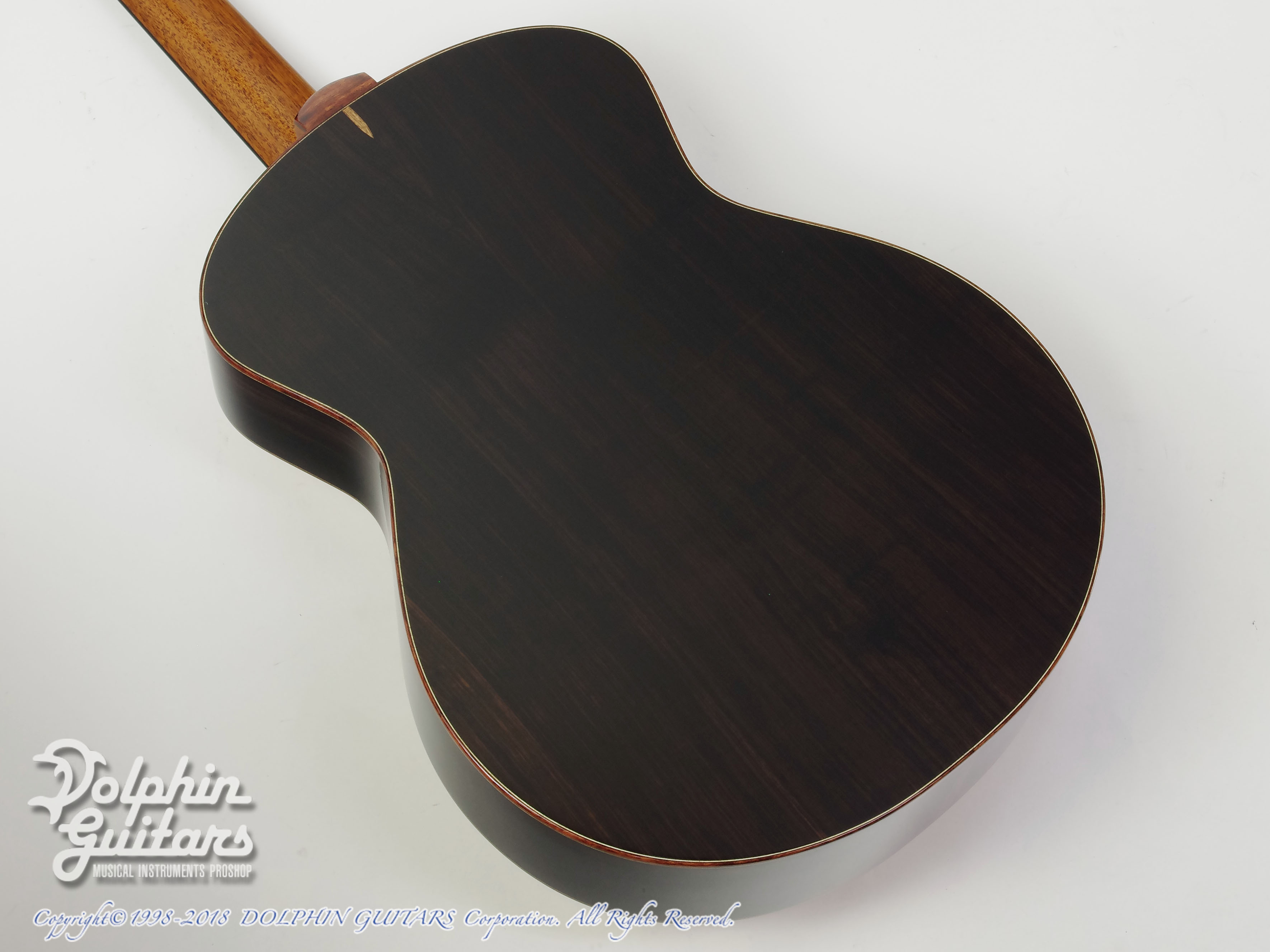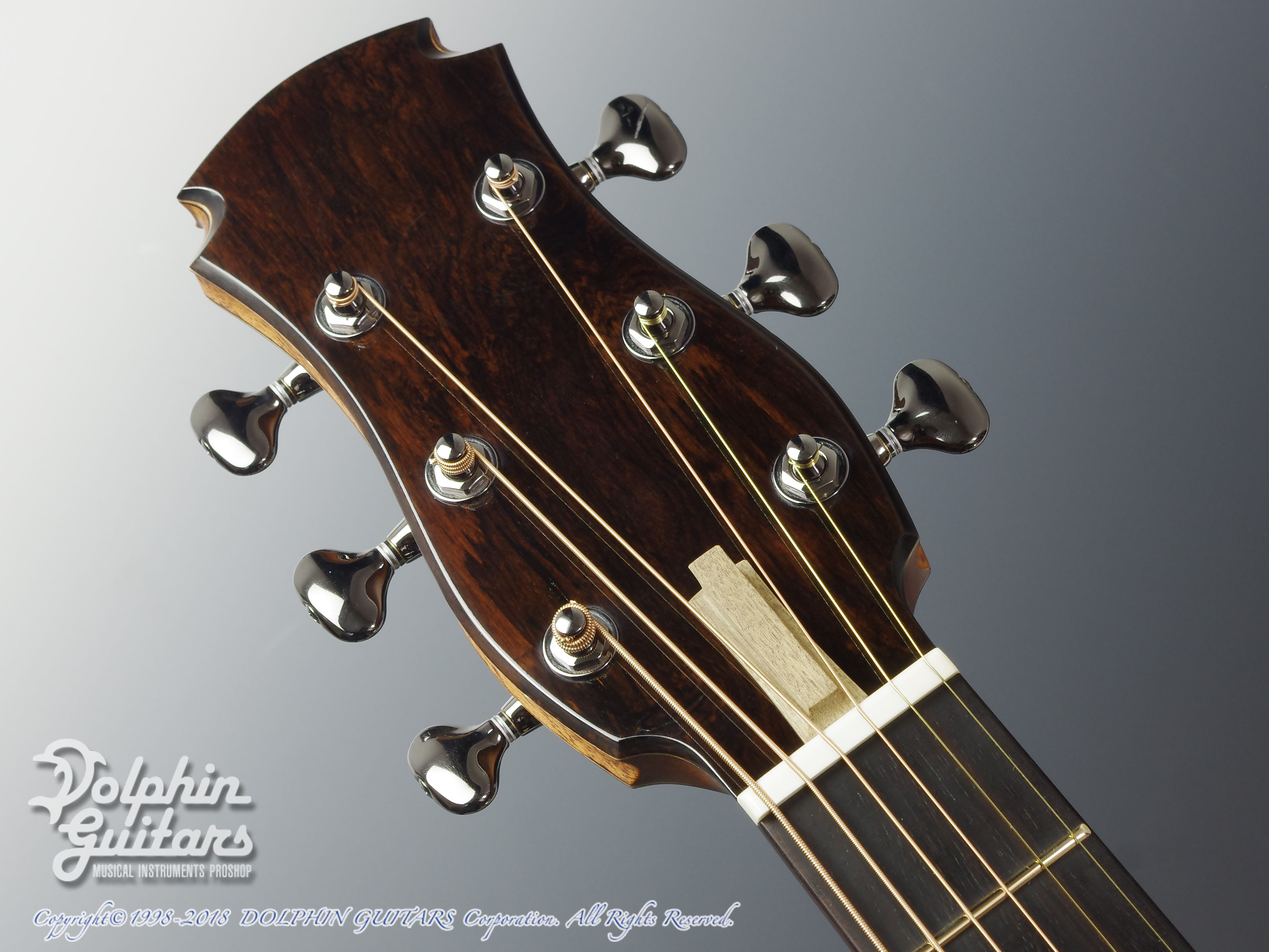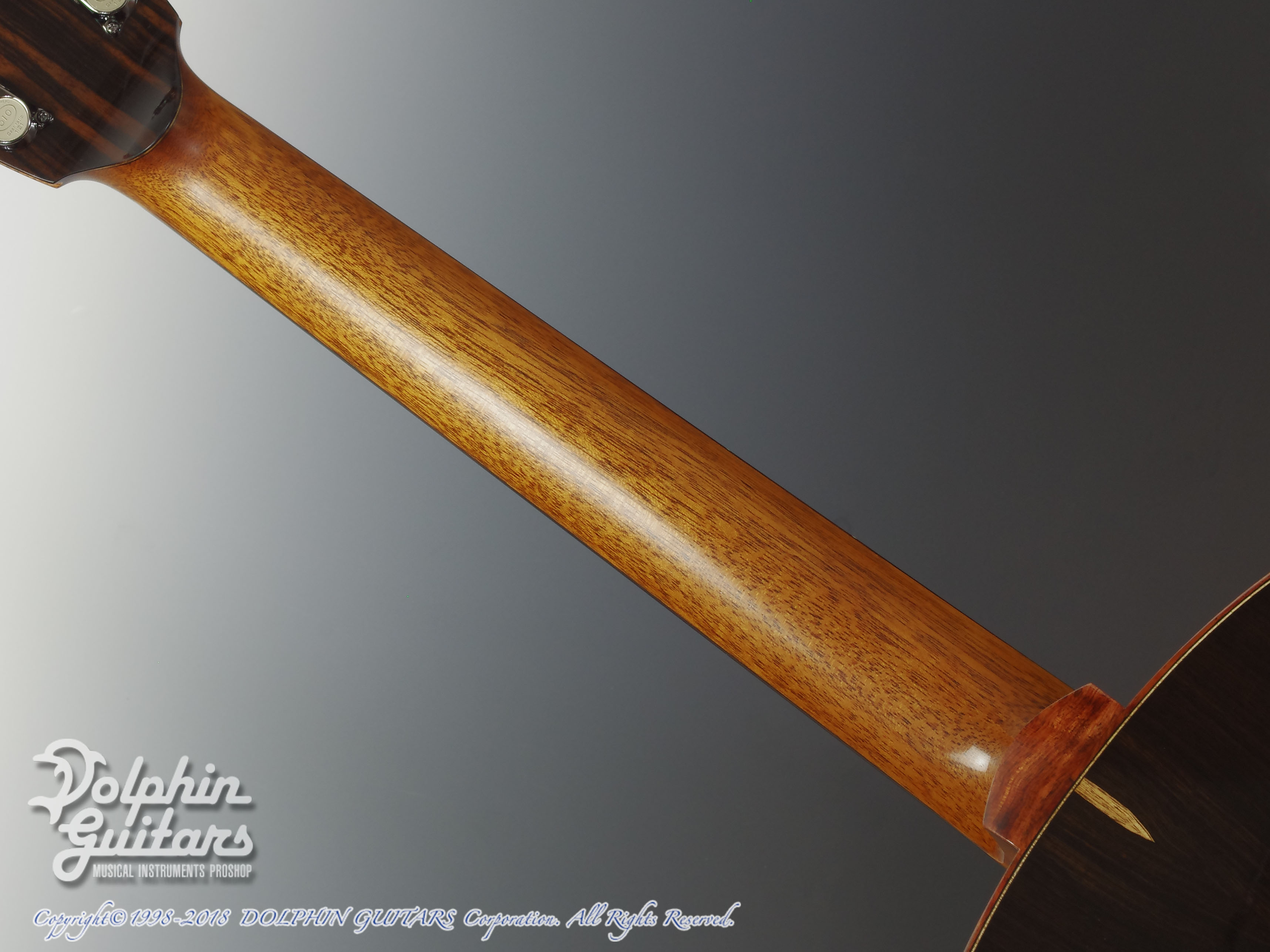 ジャーマン・スプルーストップ、アフリカン・ブラックウッドS&B、マホガニーネック(アジャスタブルロッド)、44mmナット幅、象牙ナット・サドル、エボニー指板、アマゾンローズブリッジ、ウッドモザイクロゼッタ、Gotoh510ペグ、ボブレンハードケース。