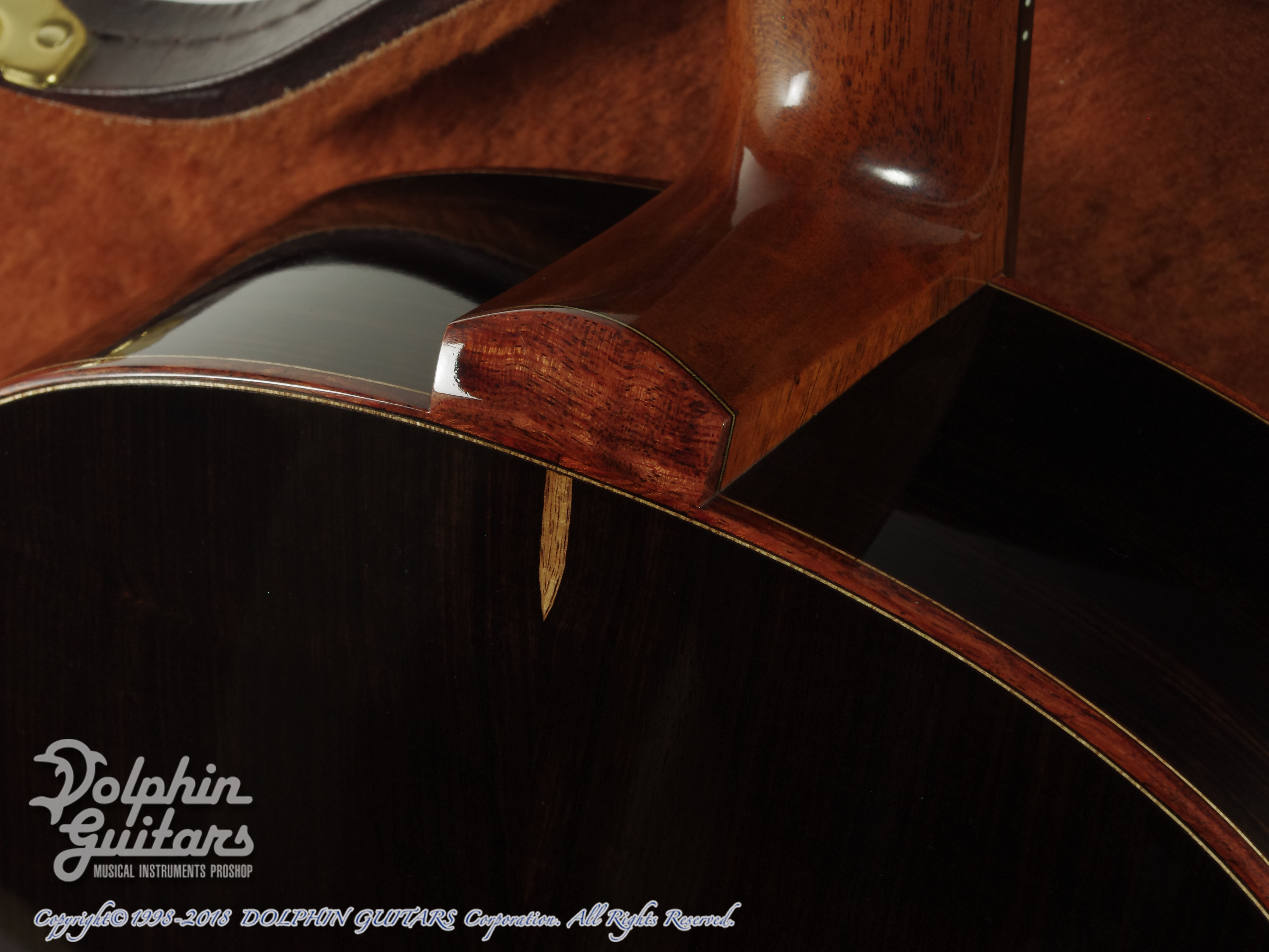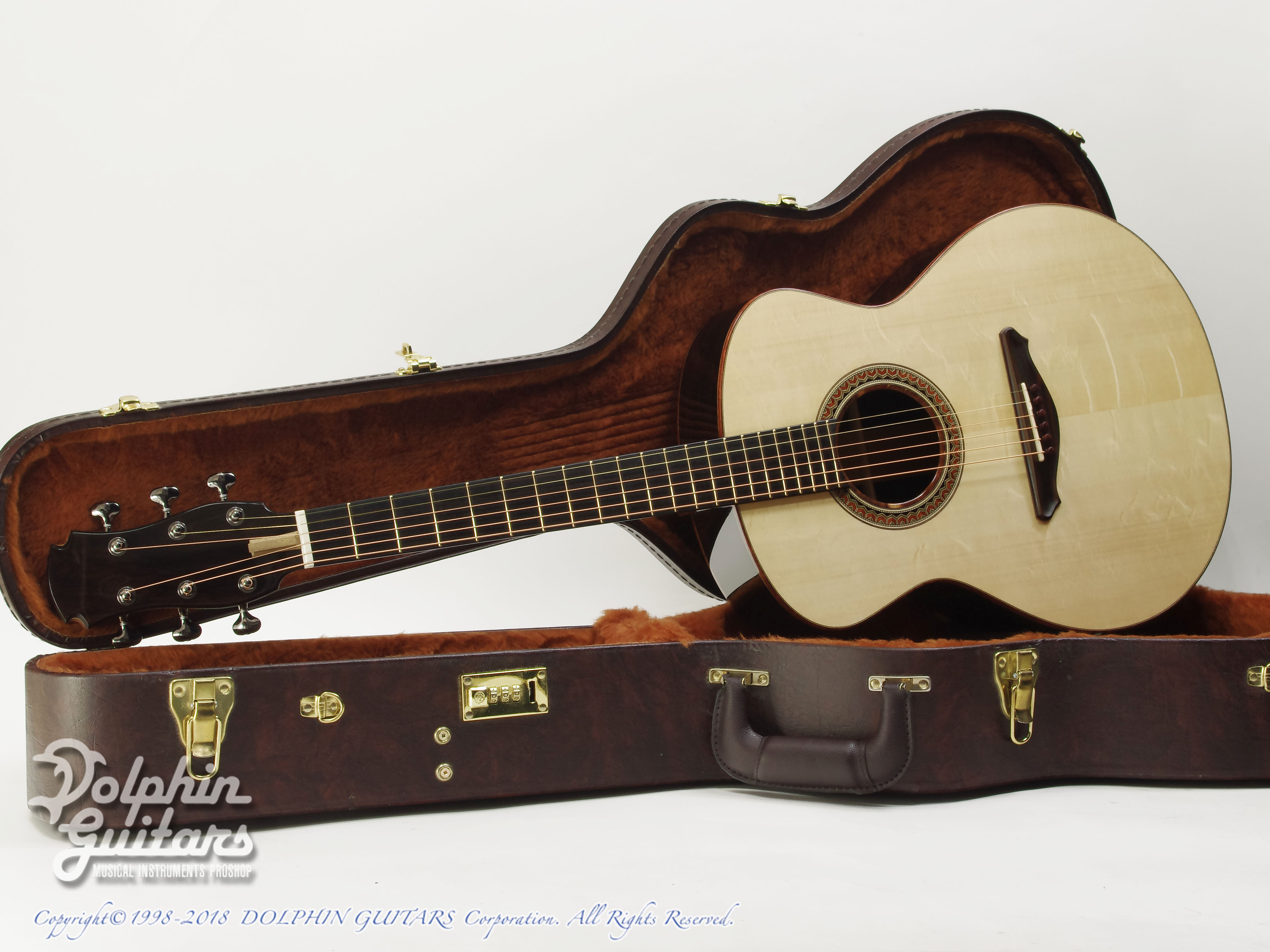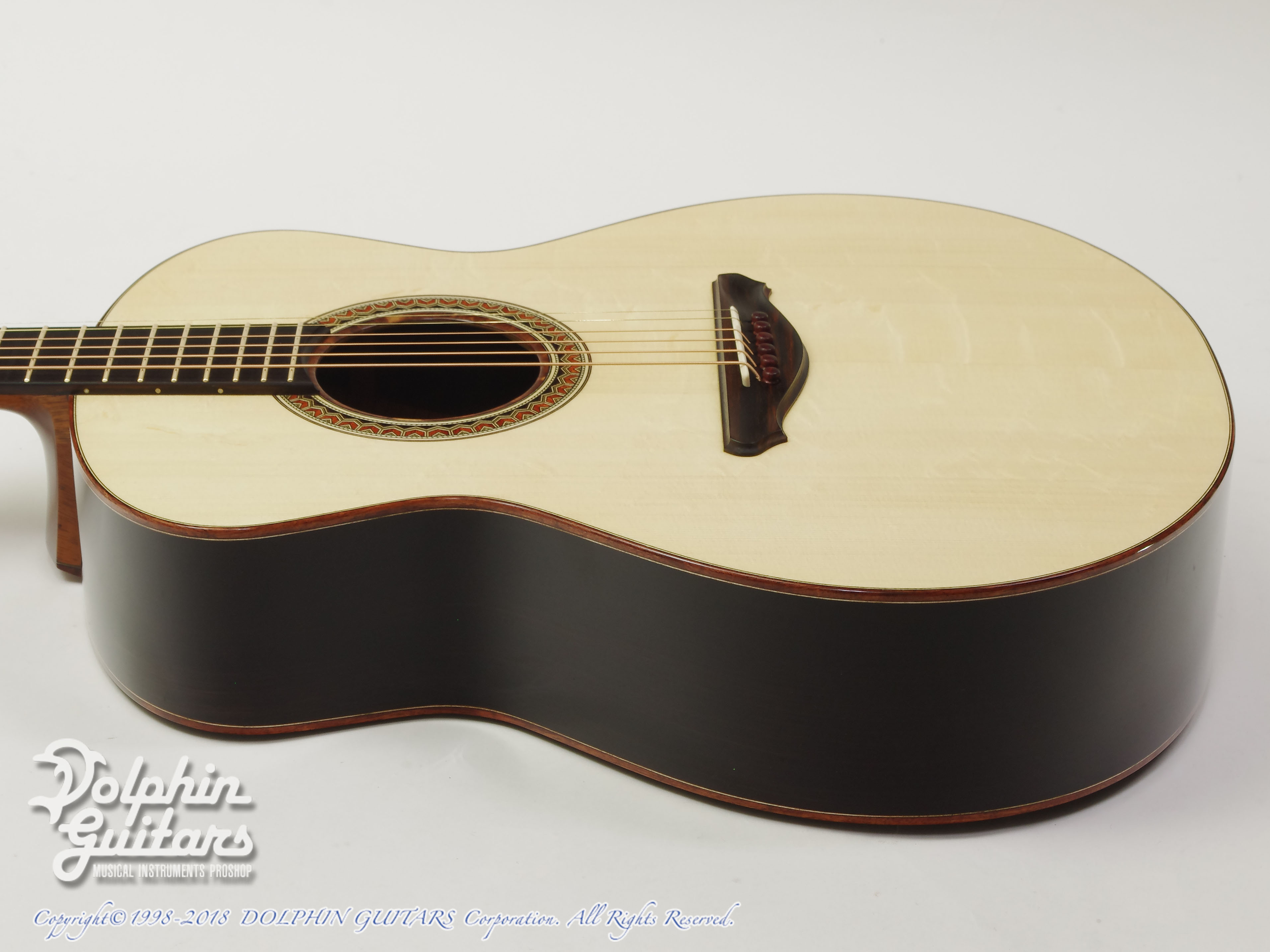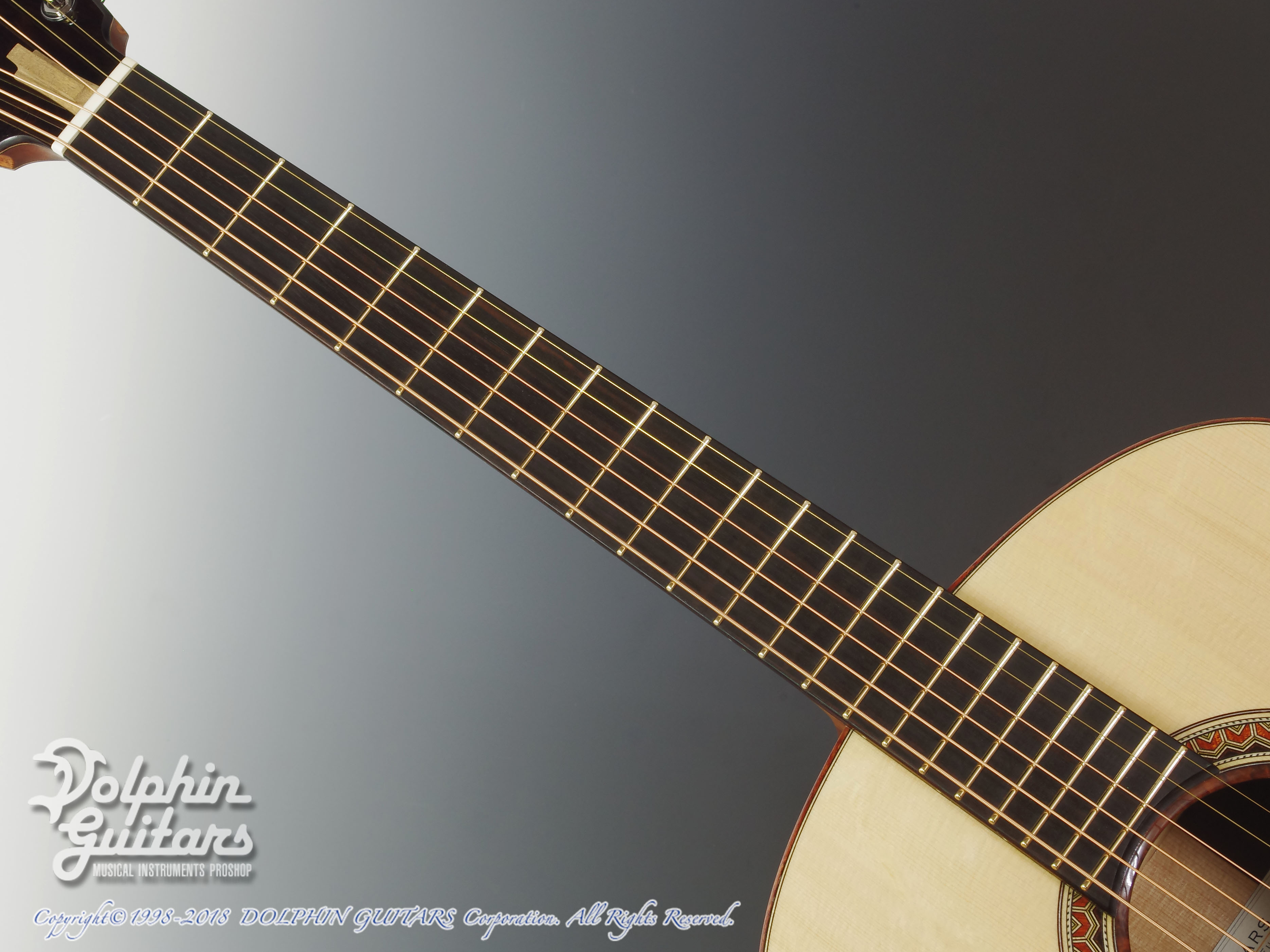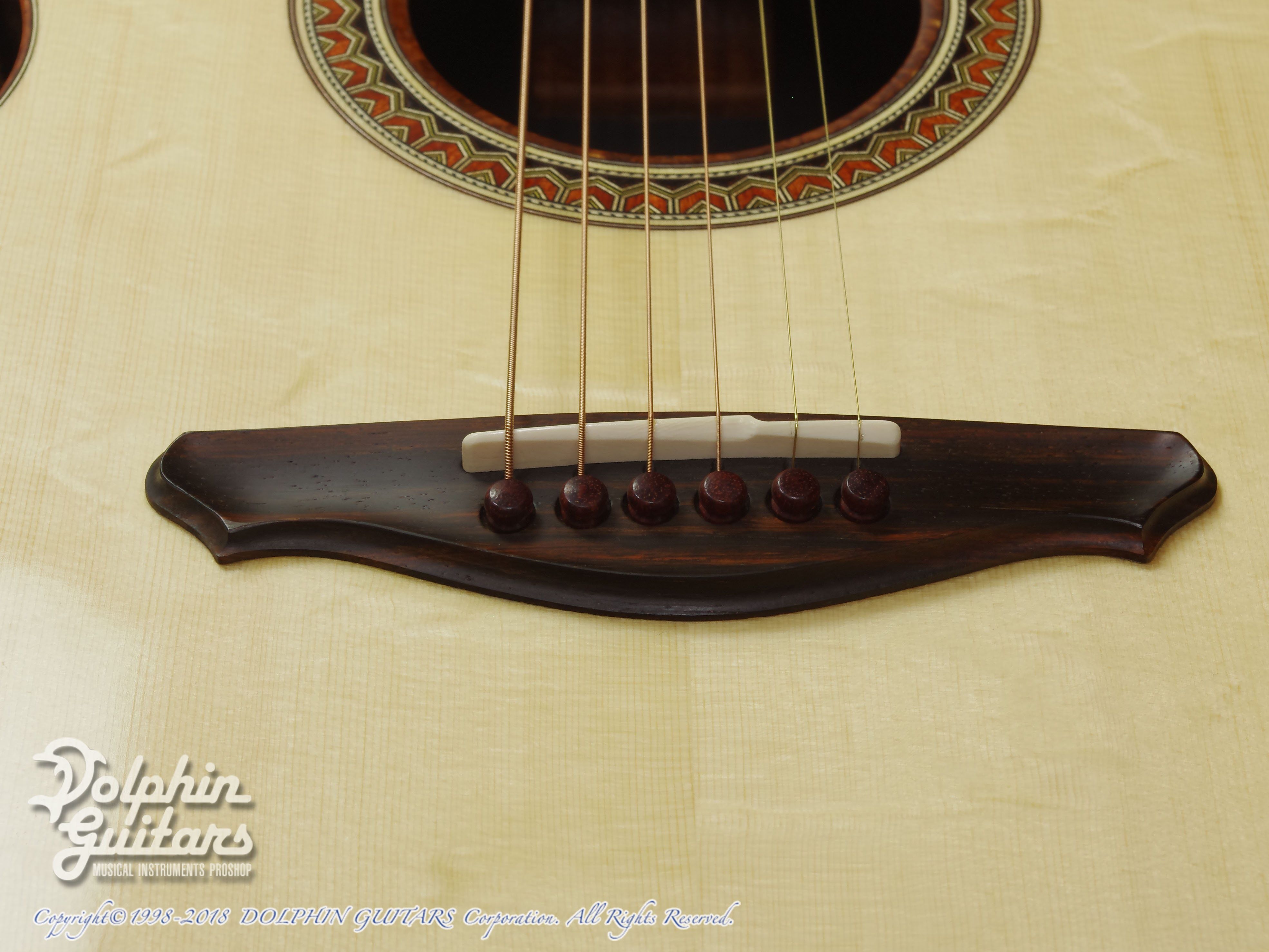 ジャーマン・スプルーストップ、アフリカン・ブラックウッドS&B、マホガニーネック(アジャスタブルロッド)、44mmナット幅、象牙ナット・サドル、エボニー指板、アマゾンローズブリッジ、ウッドモザイクロゼッタ、Gotoh510ペグ、ボブレンハードケース。