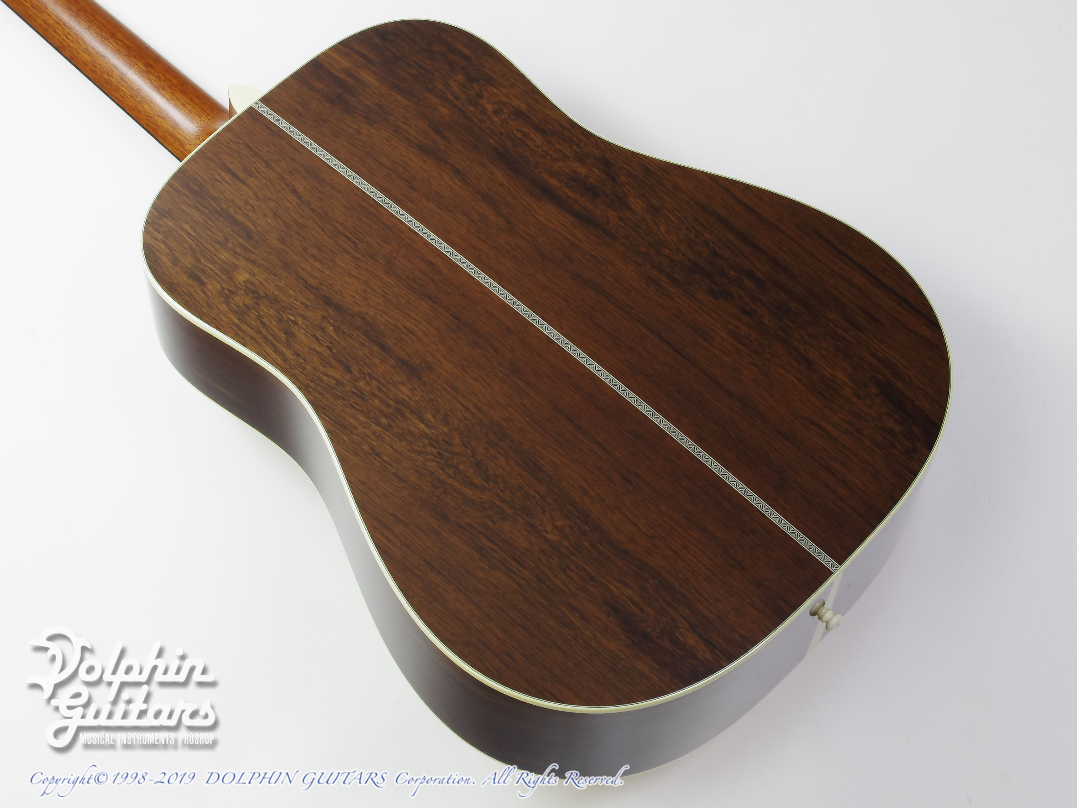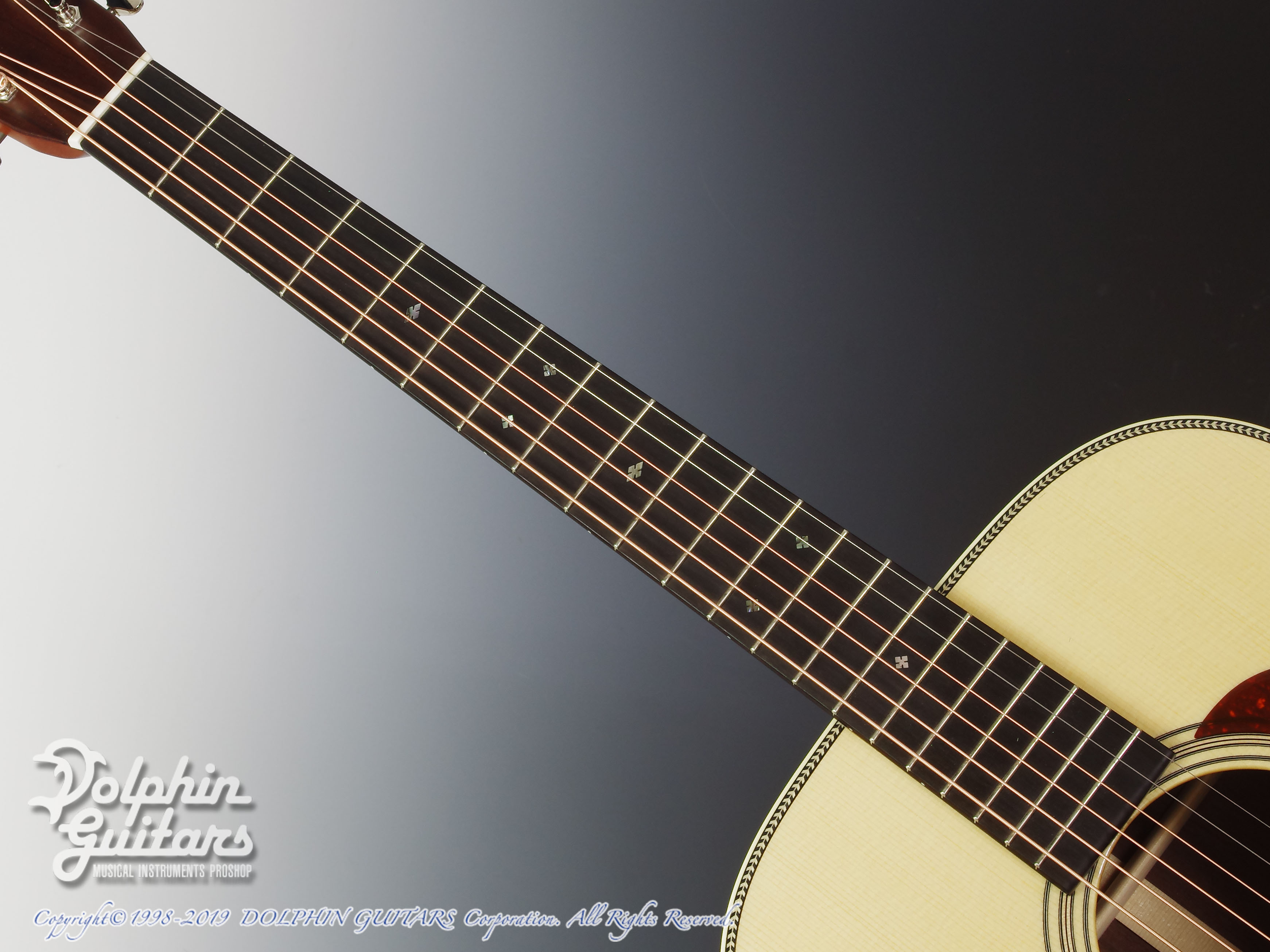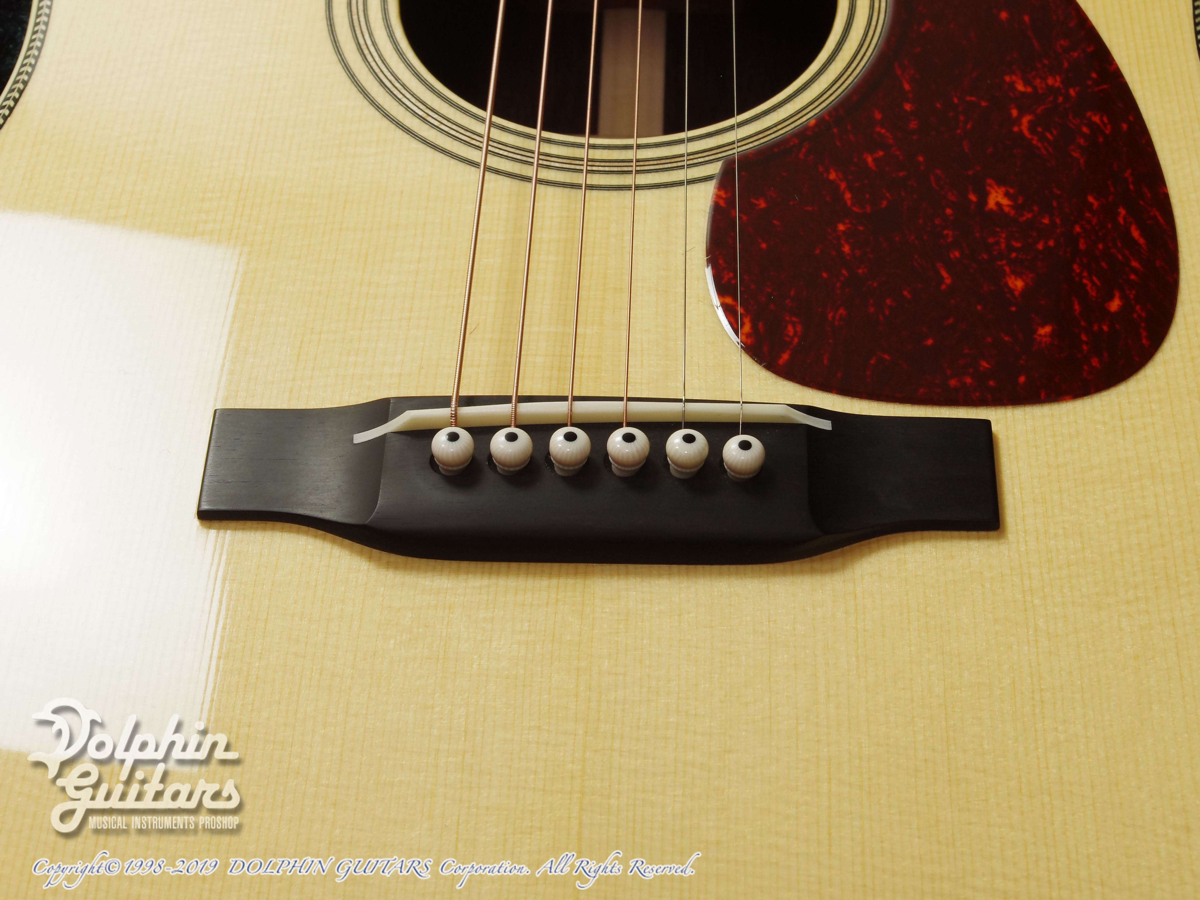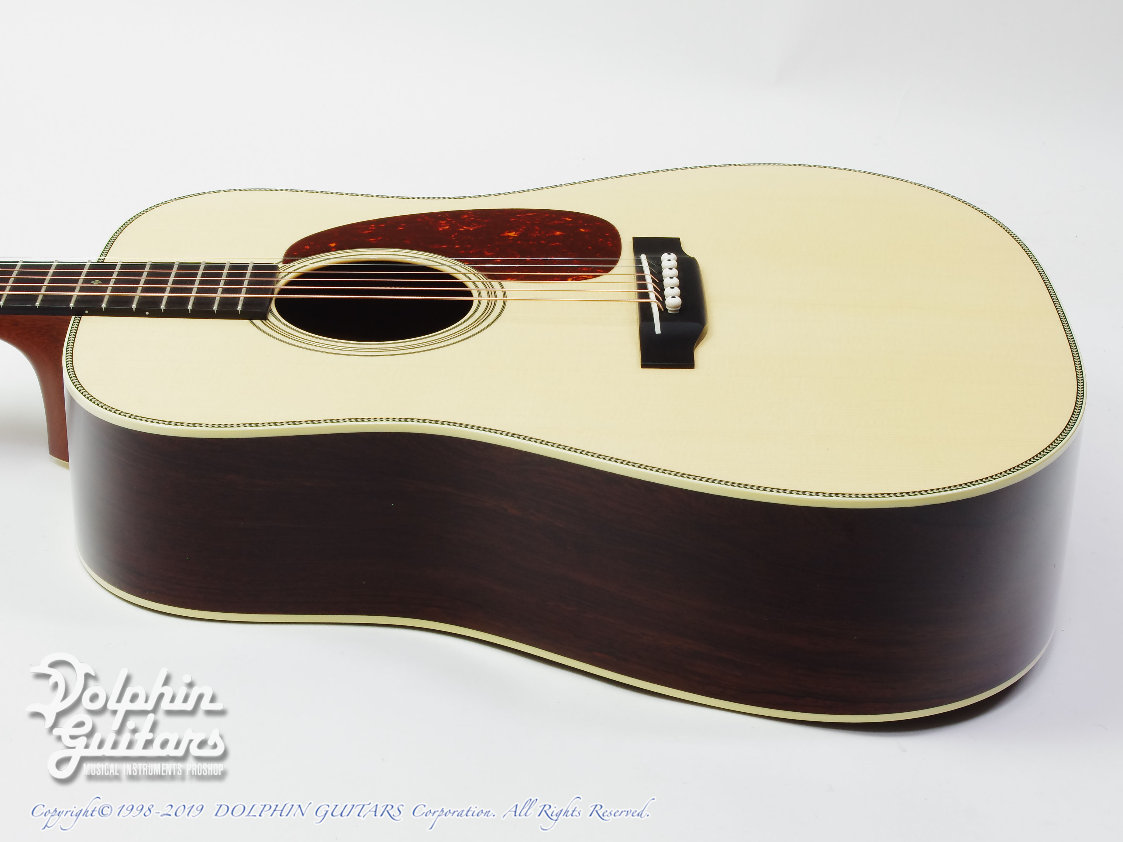ジャーマン・スプルースTop、マダガスカル・ローズウッドS&B、ホンデュラス・マホガニーネック、エボニー指板&駒、リアシフト・ノンスキャロップド・Xブレーシング、ヘリンボーントリム、塗り込みピックガード仕様。