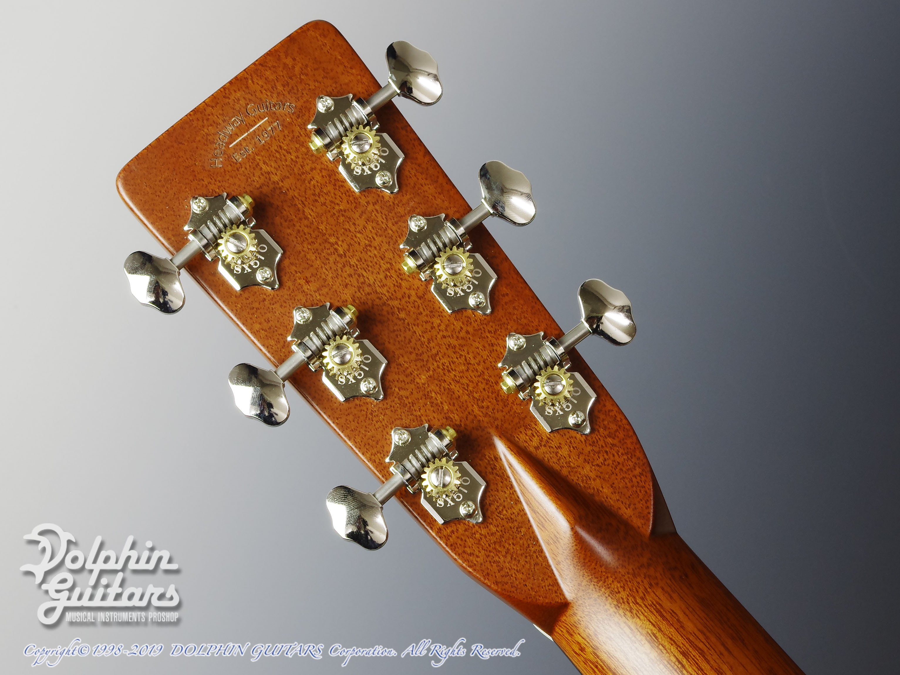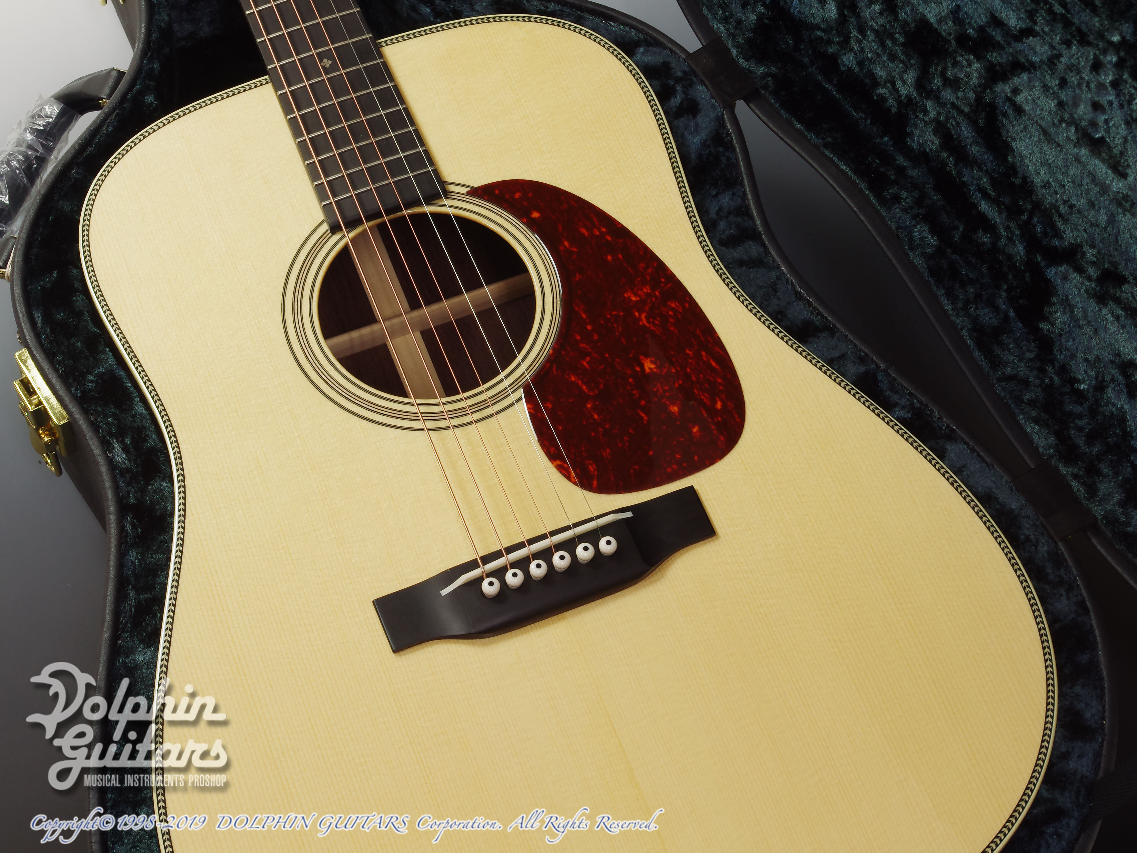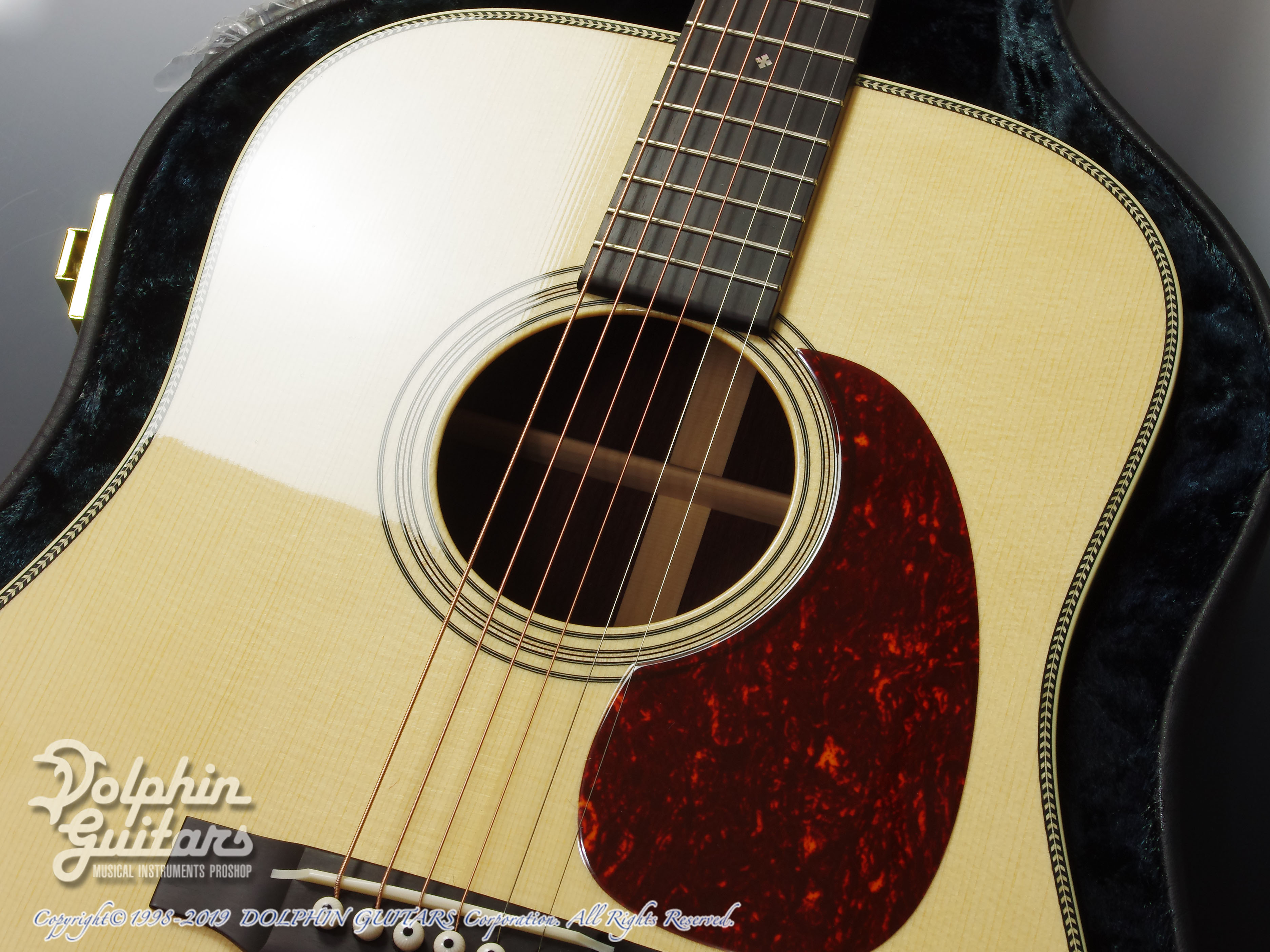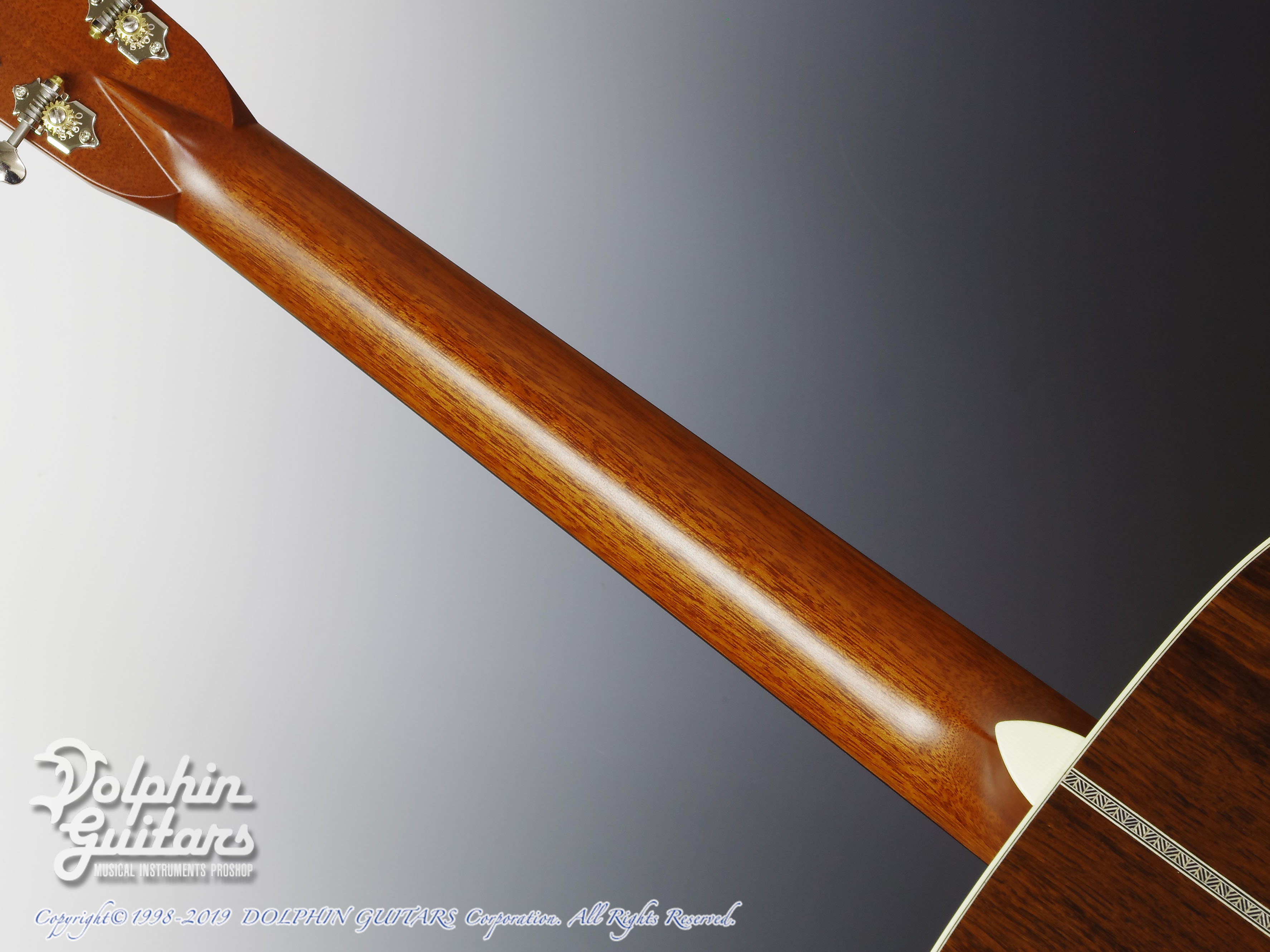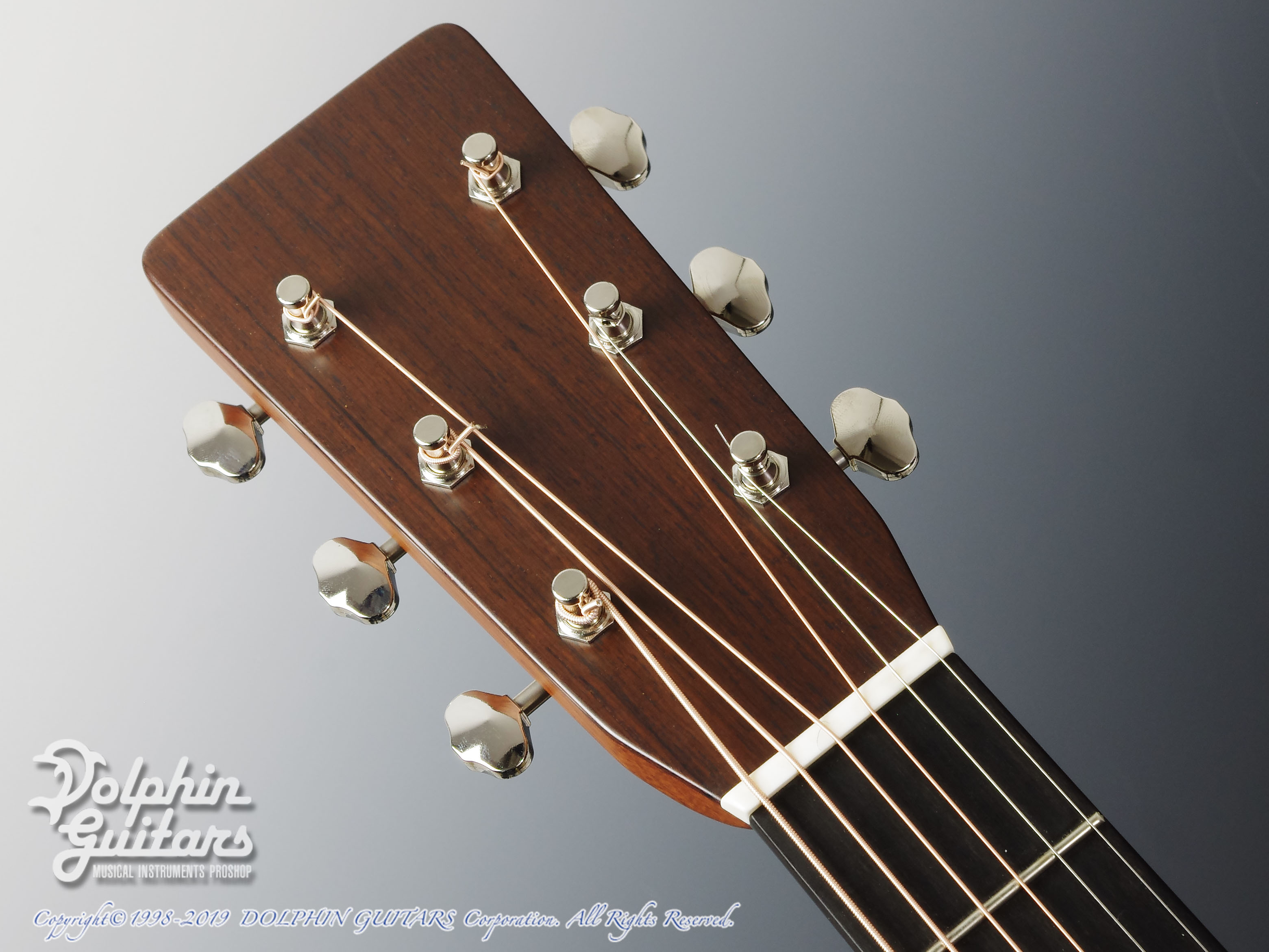 ジャーマン・スプルースTop、マダガスカル・ローズウッドS&B、ホンデュラス・マホガニーネック、エボニー指板&駒、リアシフト・ノンスキャロップド・Xブレーシング、ヘリンボーントリム、塗り込みピックガード仕様。