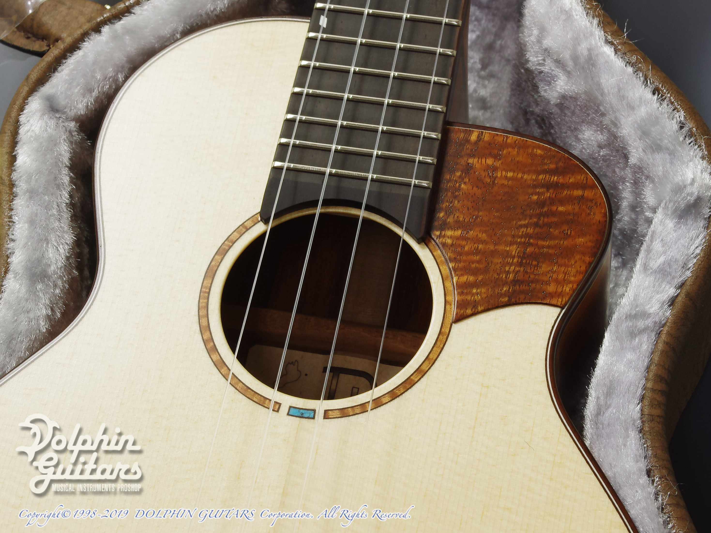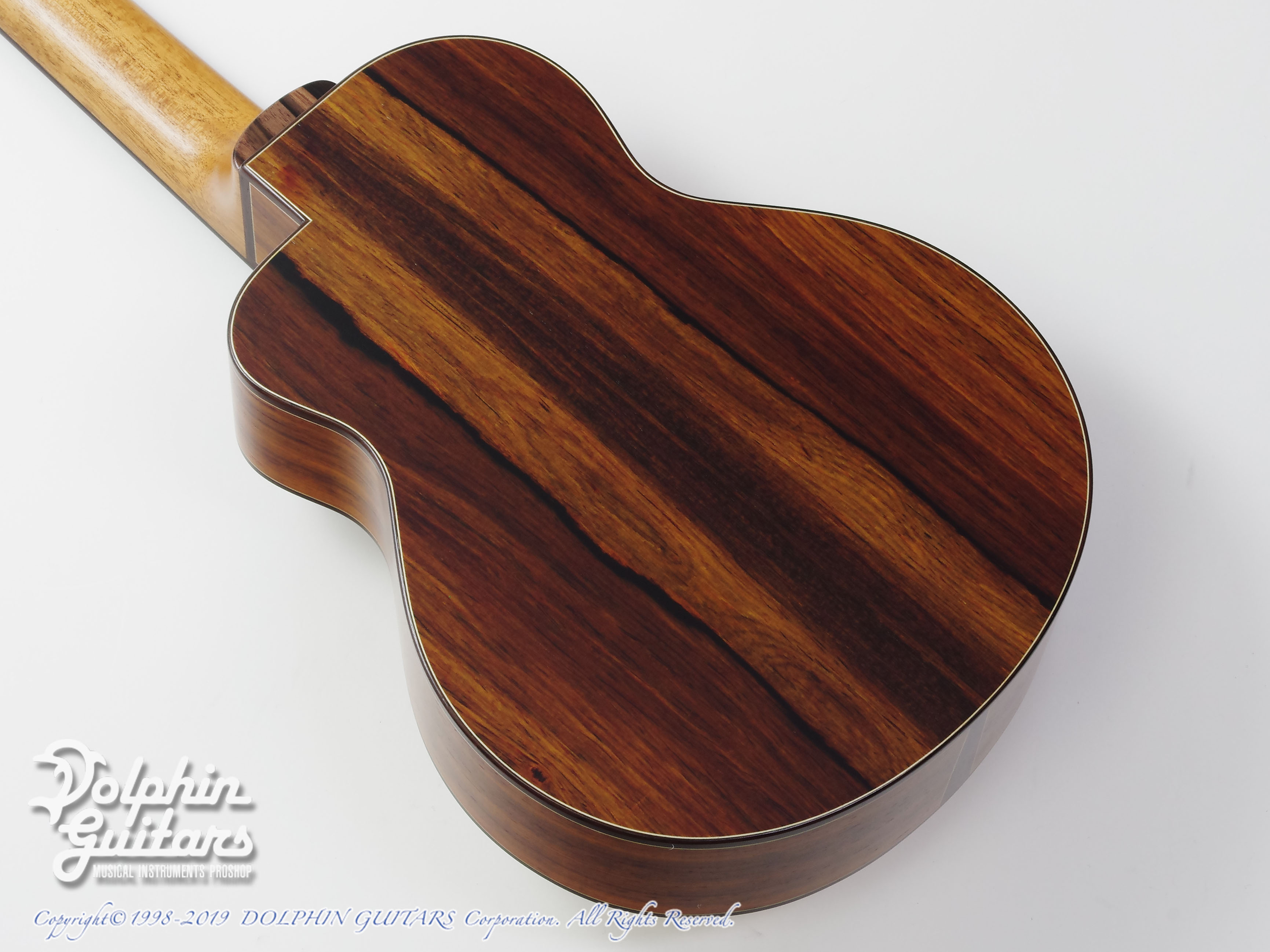イングルマン・スプルーストップ、ココボロS&B、ホンデュラス・マホガニーネック、エボニー指板&ブリッジ、ジリコーテヘッドプレート、ハワイアンコアPG&ロゼッタ、ウッドバインディング、Gotohオープンバックペグ。