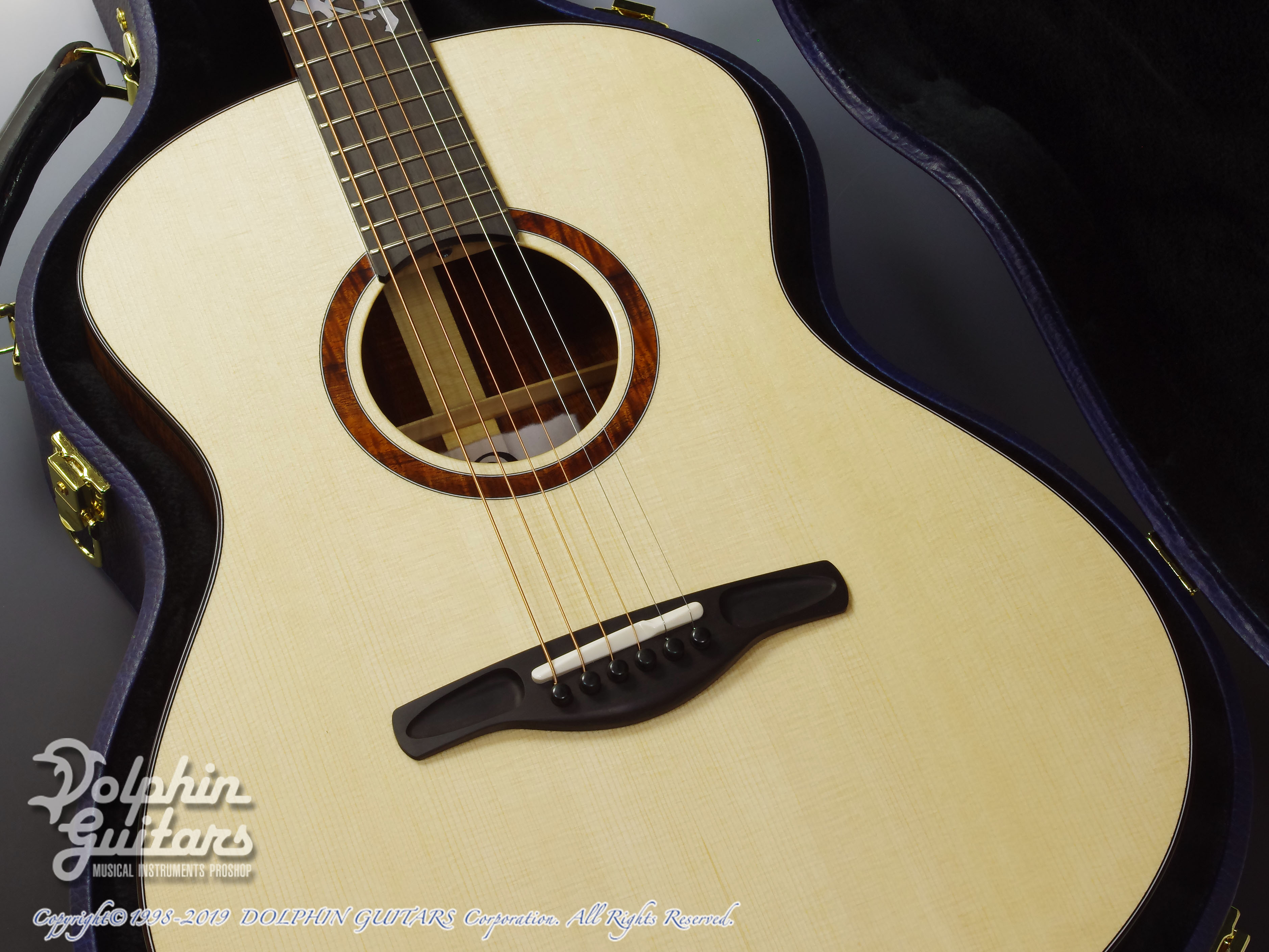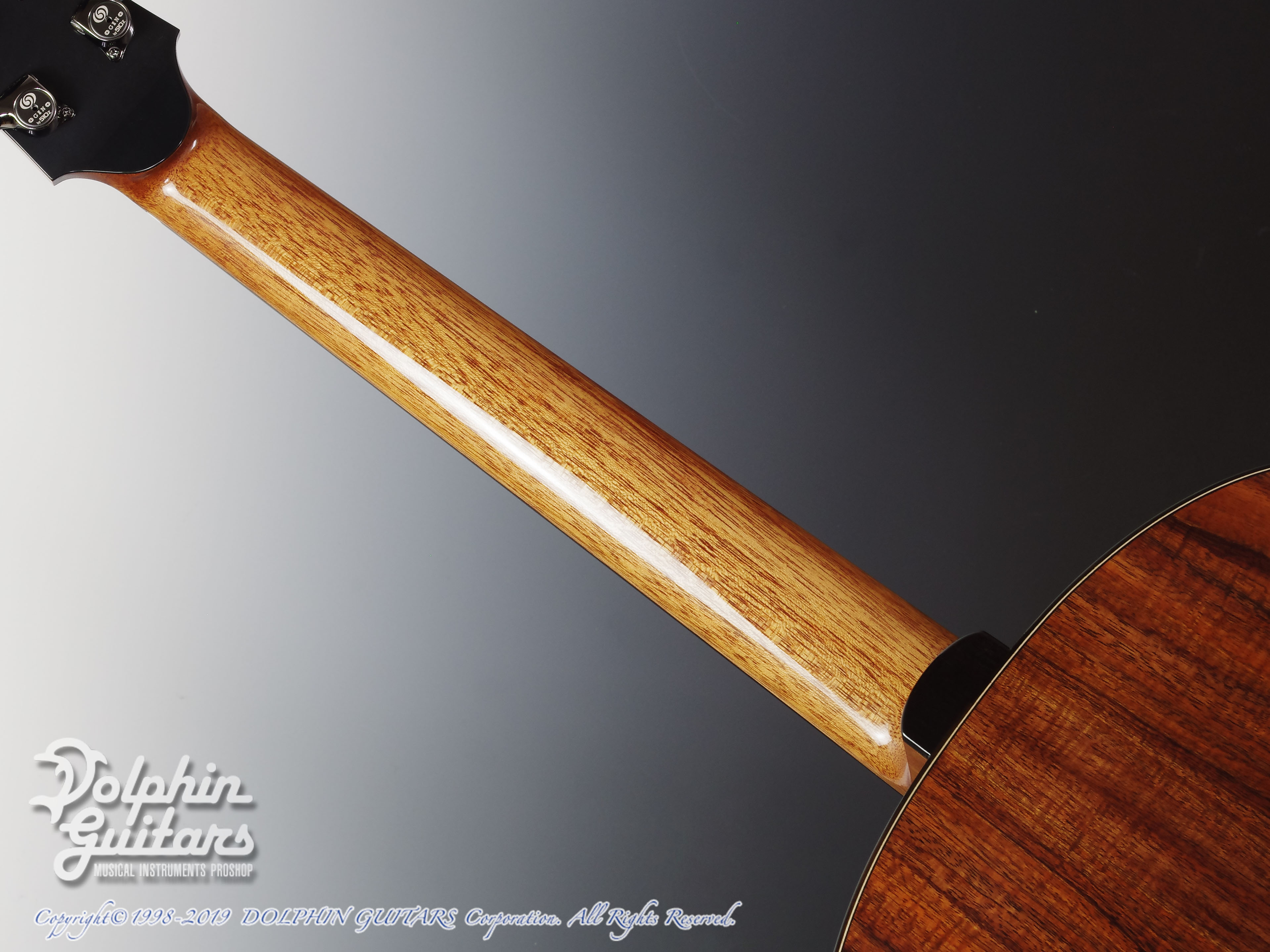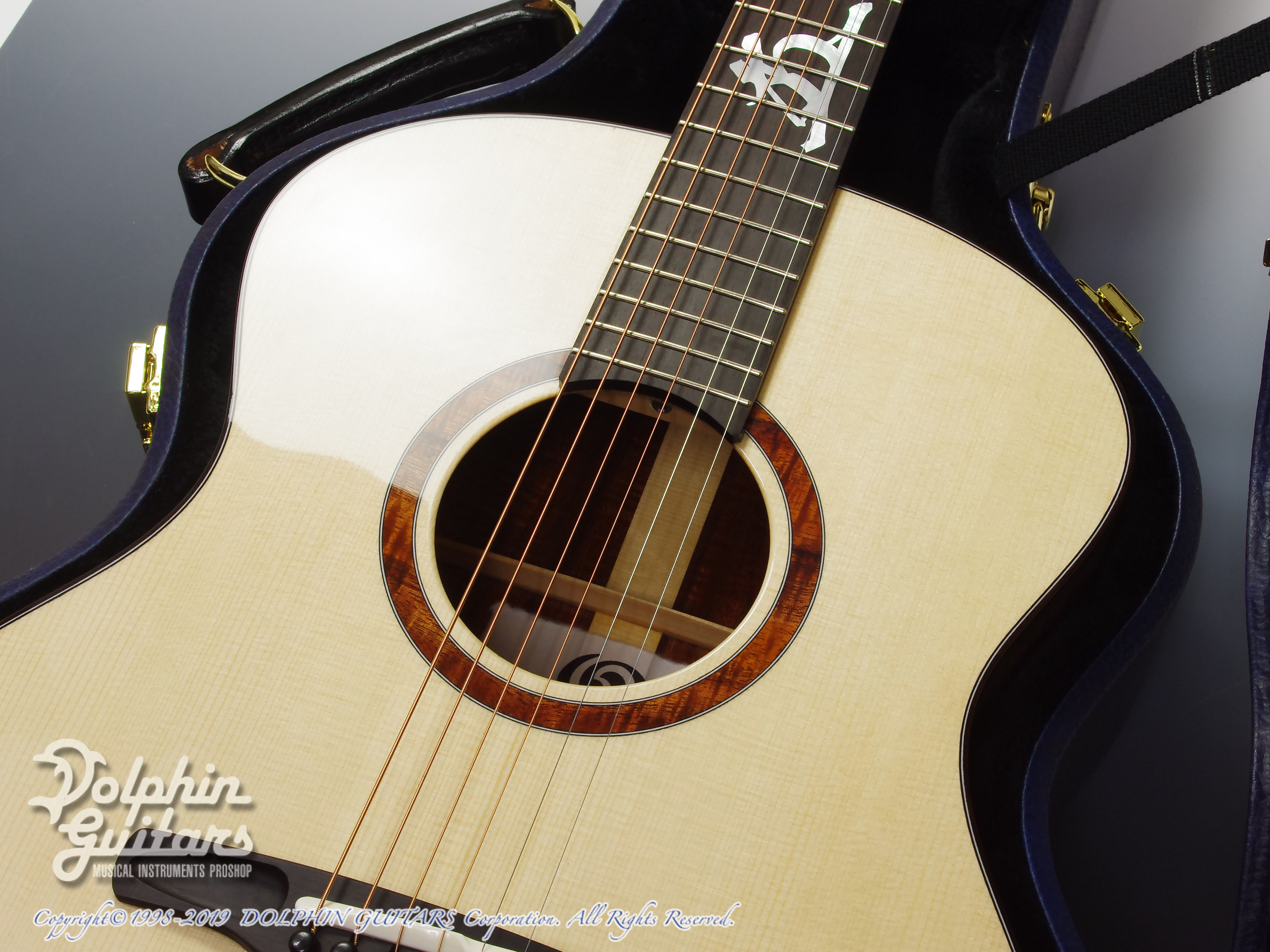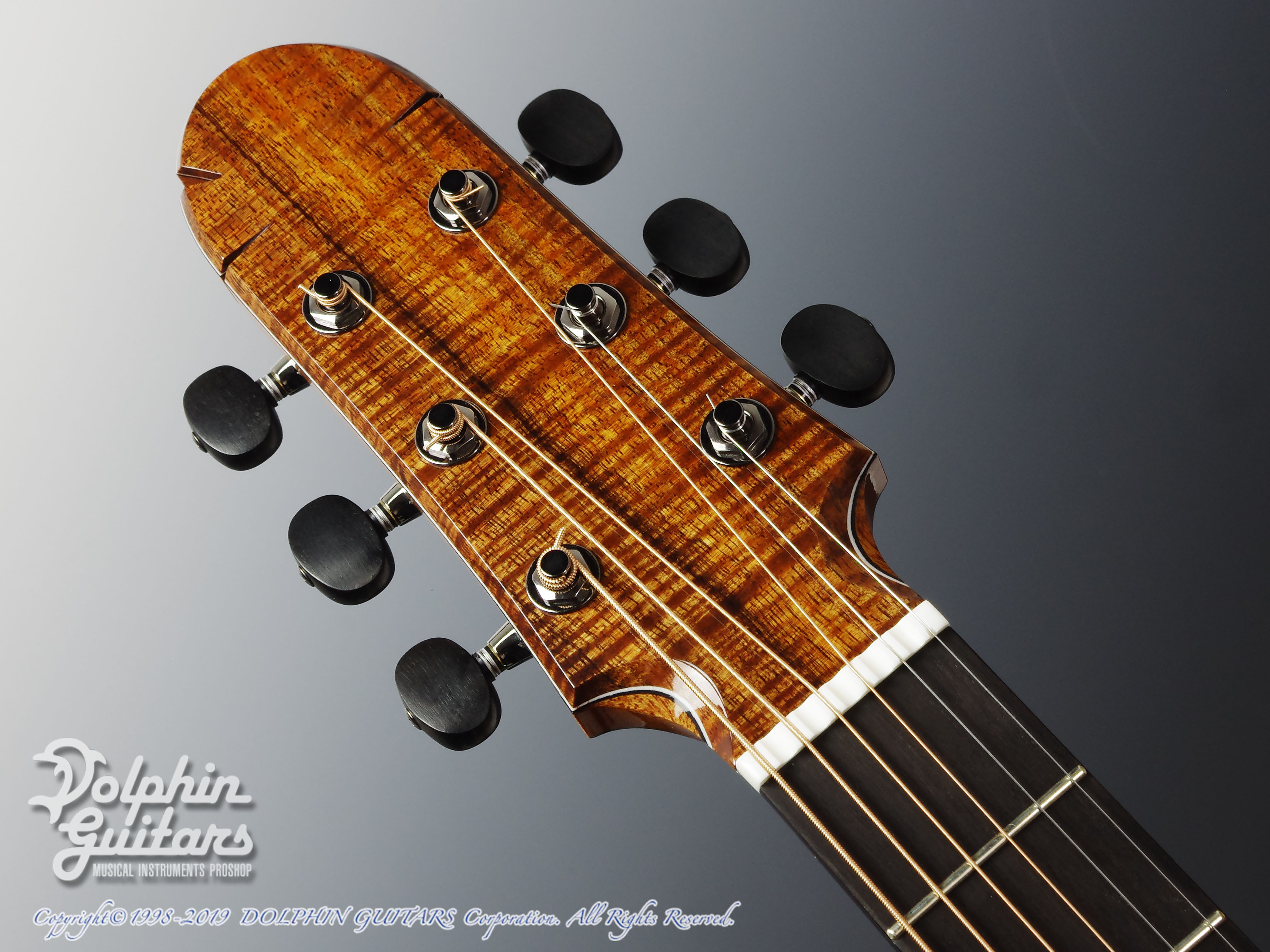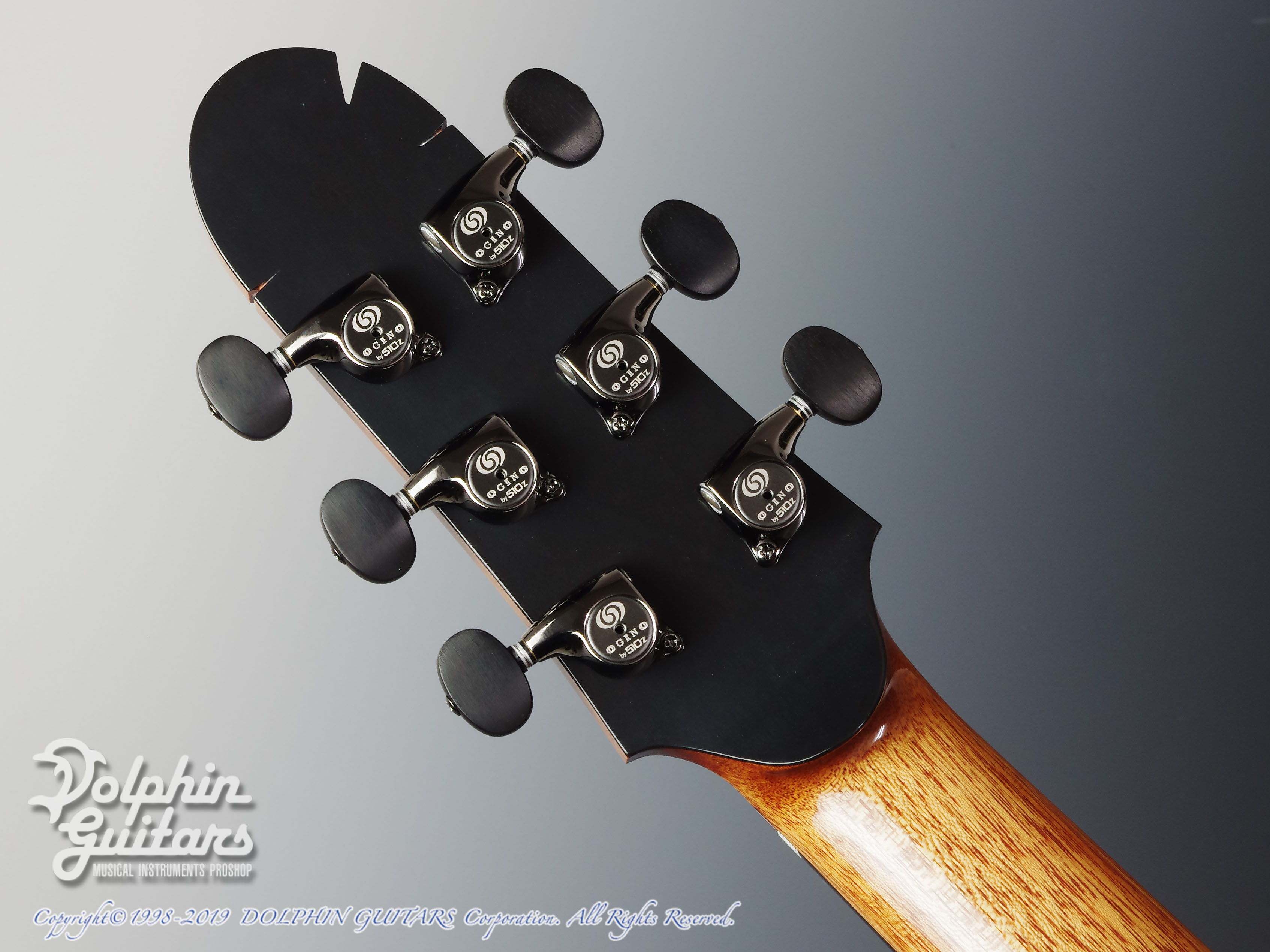 ジャーマン・スプルーストップ、フィギャード・コアウッド・サイド&バック、ホンデュラスマホガニー1pネック(アジャスタブルロッド)、オリジナルブレイスパターン、エボニー指板、アフリカンブラックウッドブリッジ、44mm幅・スキャロップドナット、約641mmスケール、ウッドロゼッタ、Gotoh510ペグ仕様。