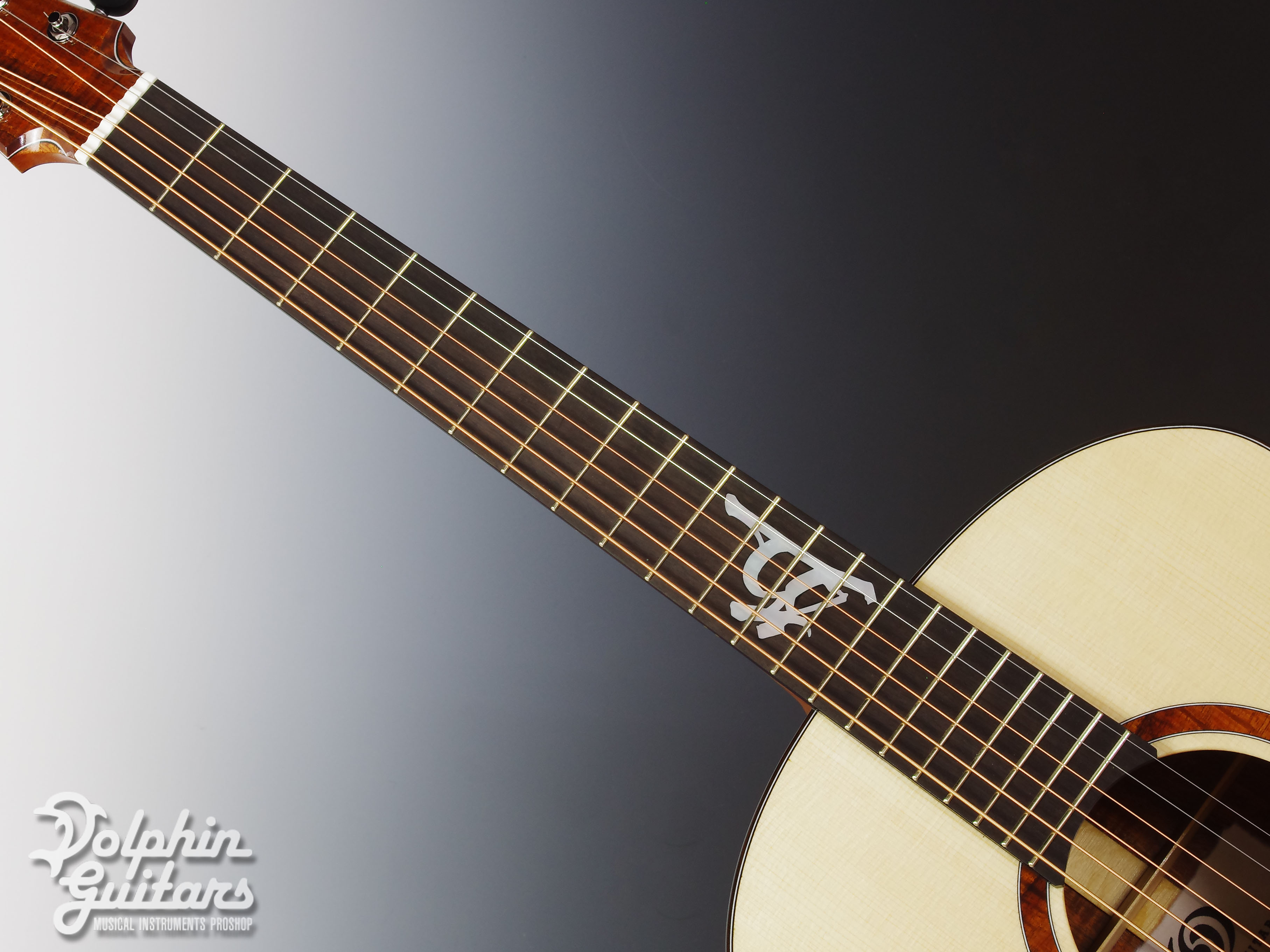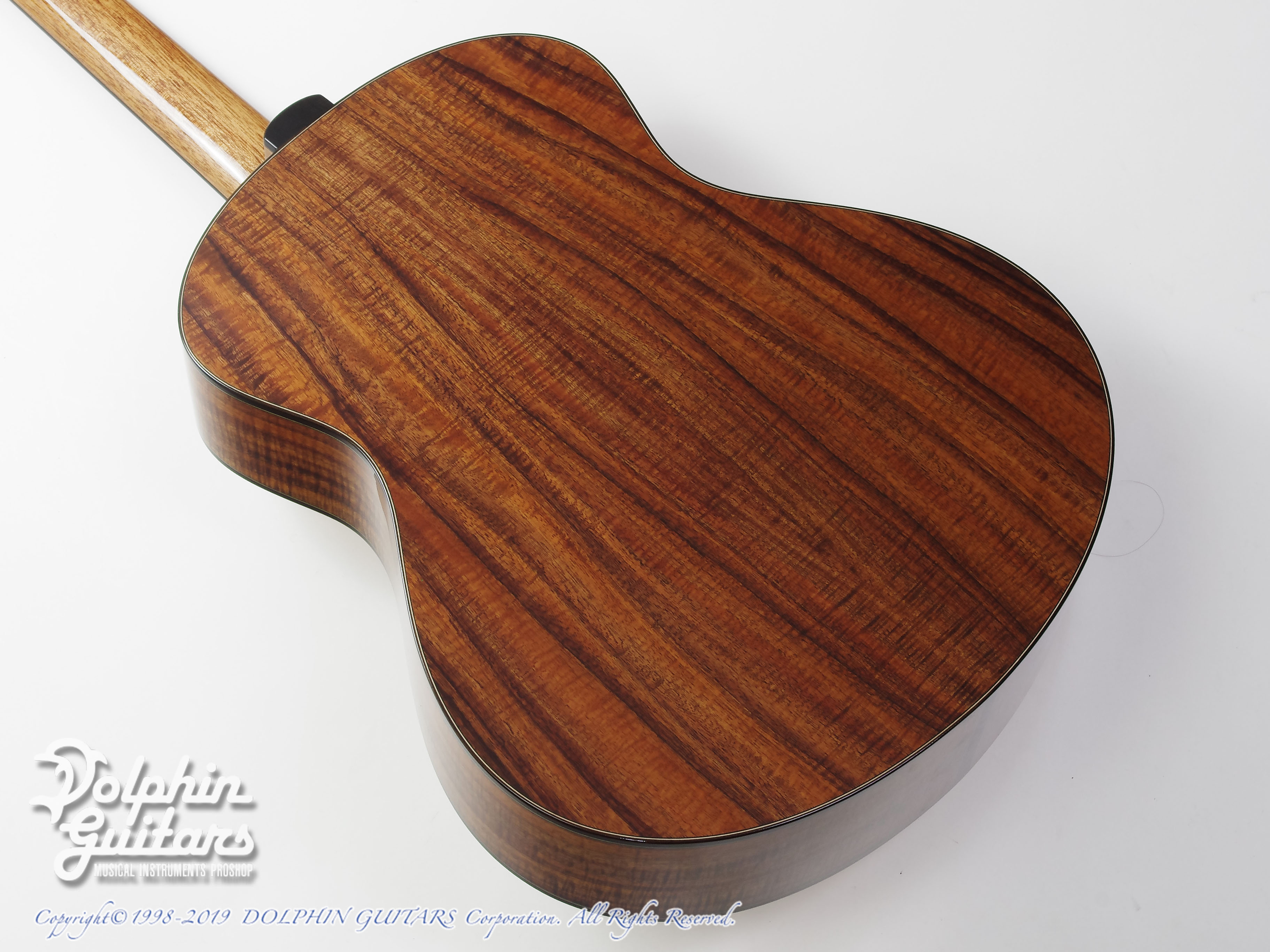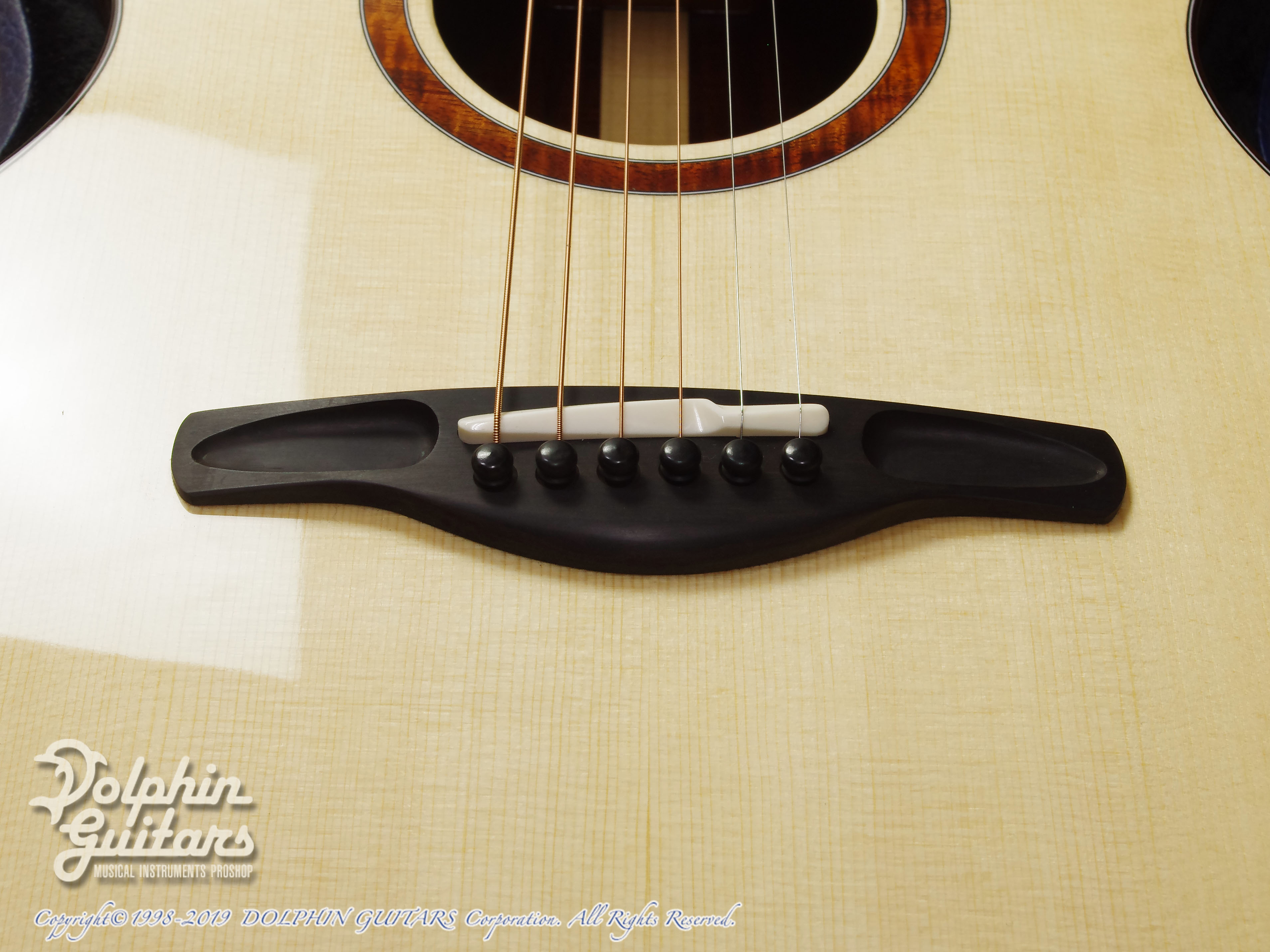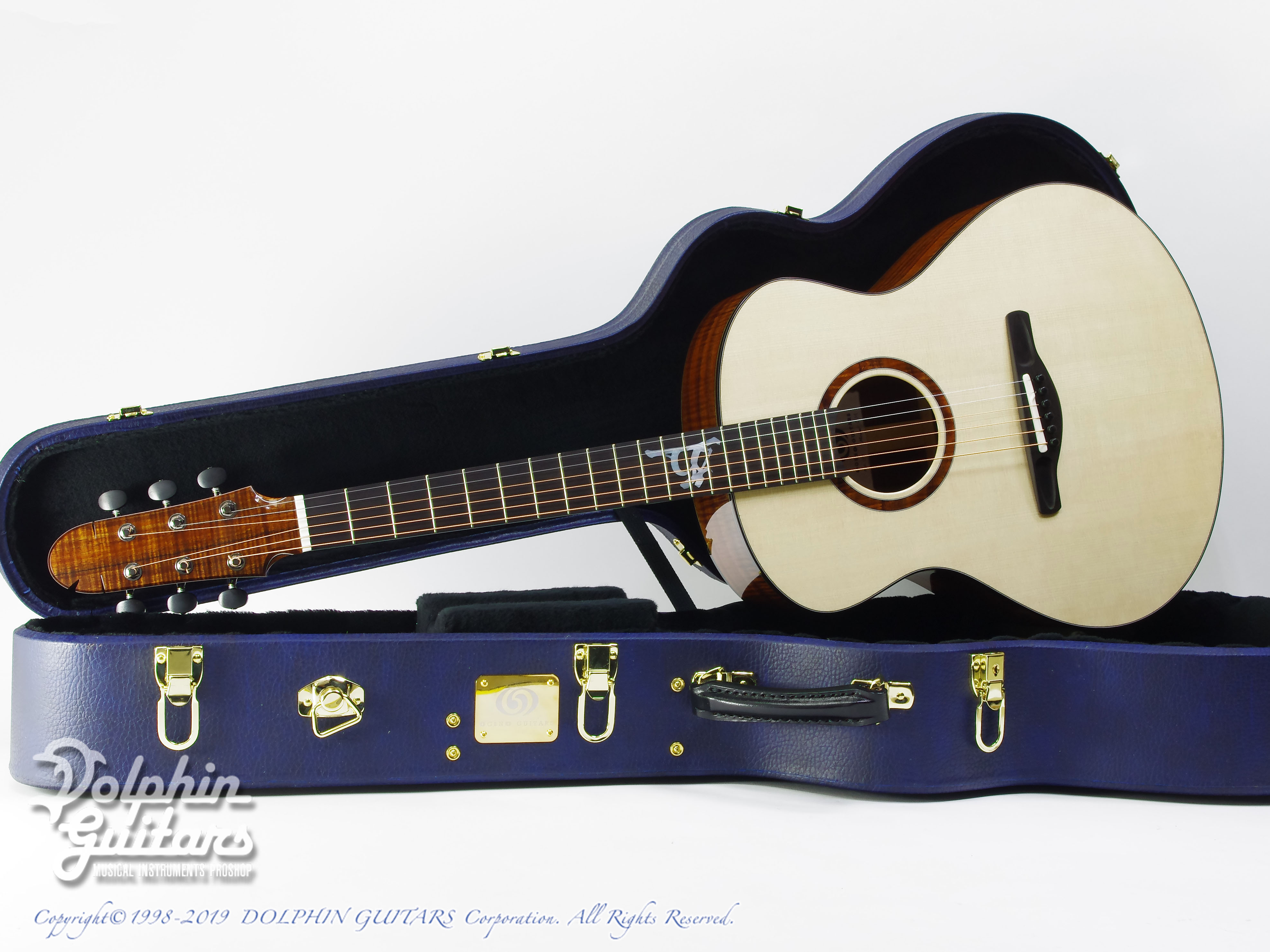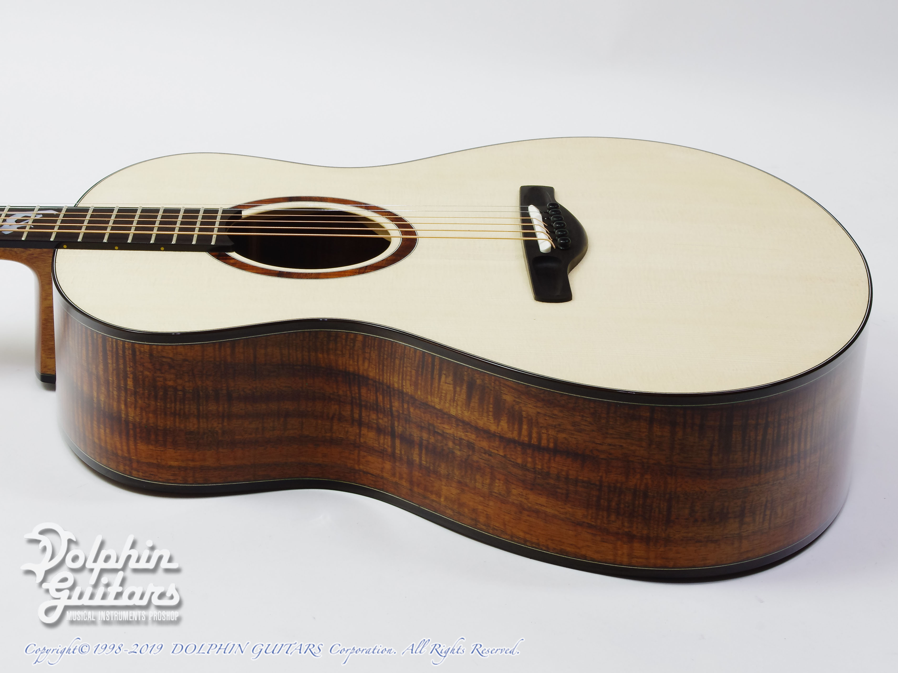 ジャーマン・スプルーストップ、フィギャード・コアウッド・サイド&バック、ホンデュラスマホガニー1pネック(アジャスタブルロッド)、オリジナルブレイスパターン、エボニー指板、アフリカンブラックウッドブリッジ、44mm幅・スキャロップドナット、約641mmスケール、ウッドロゼッタ、Gotoh510ペグ仕様。