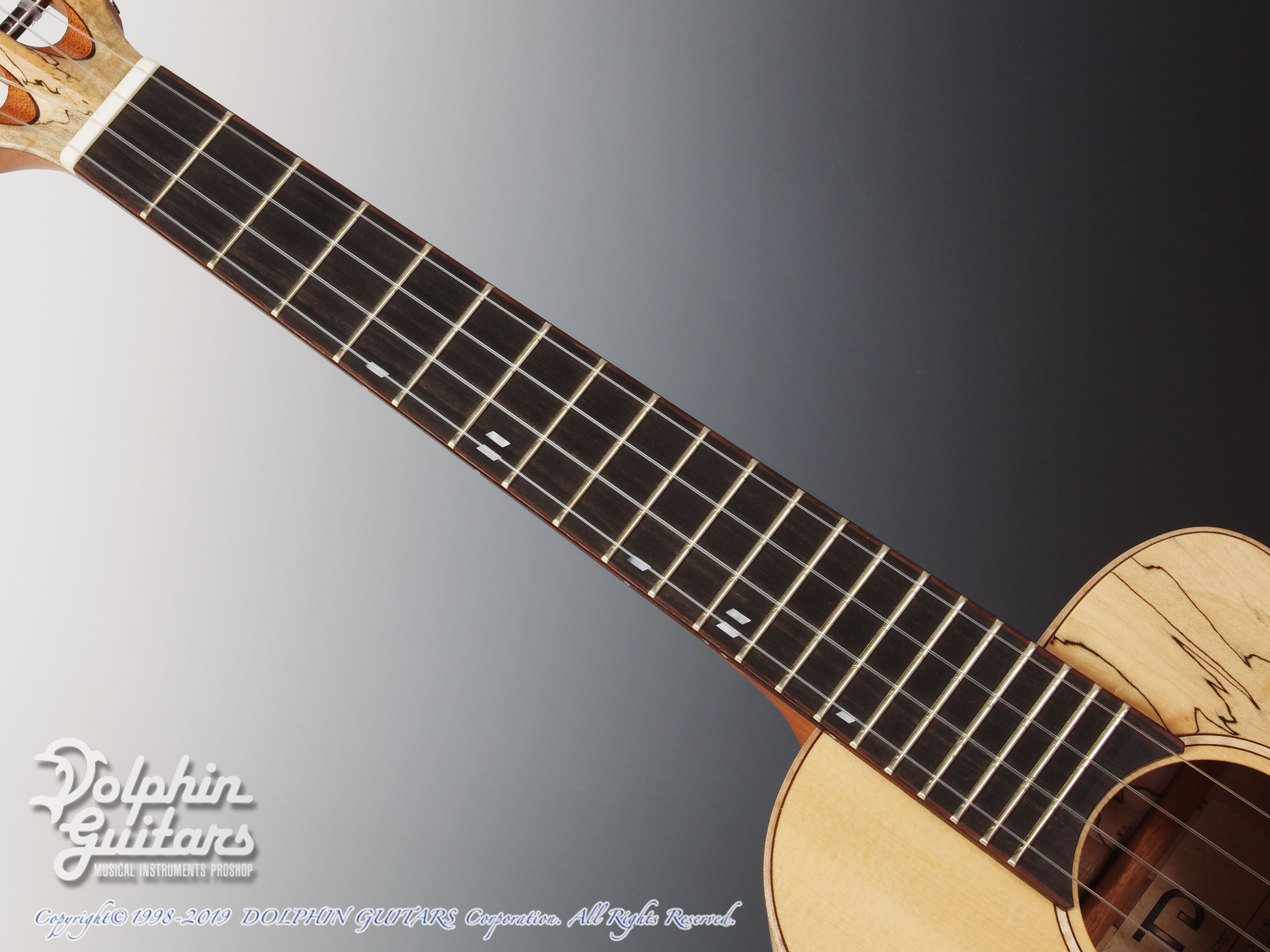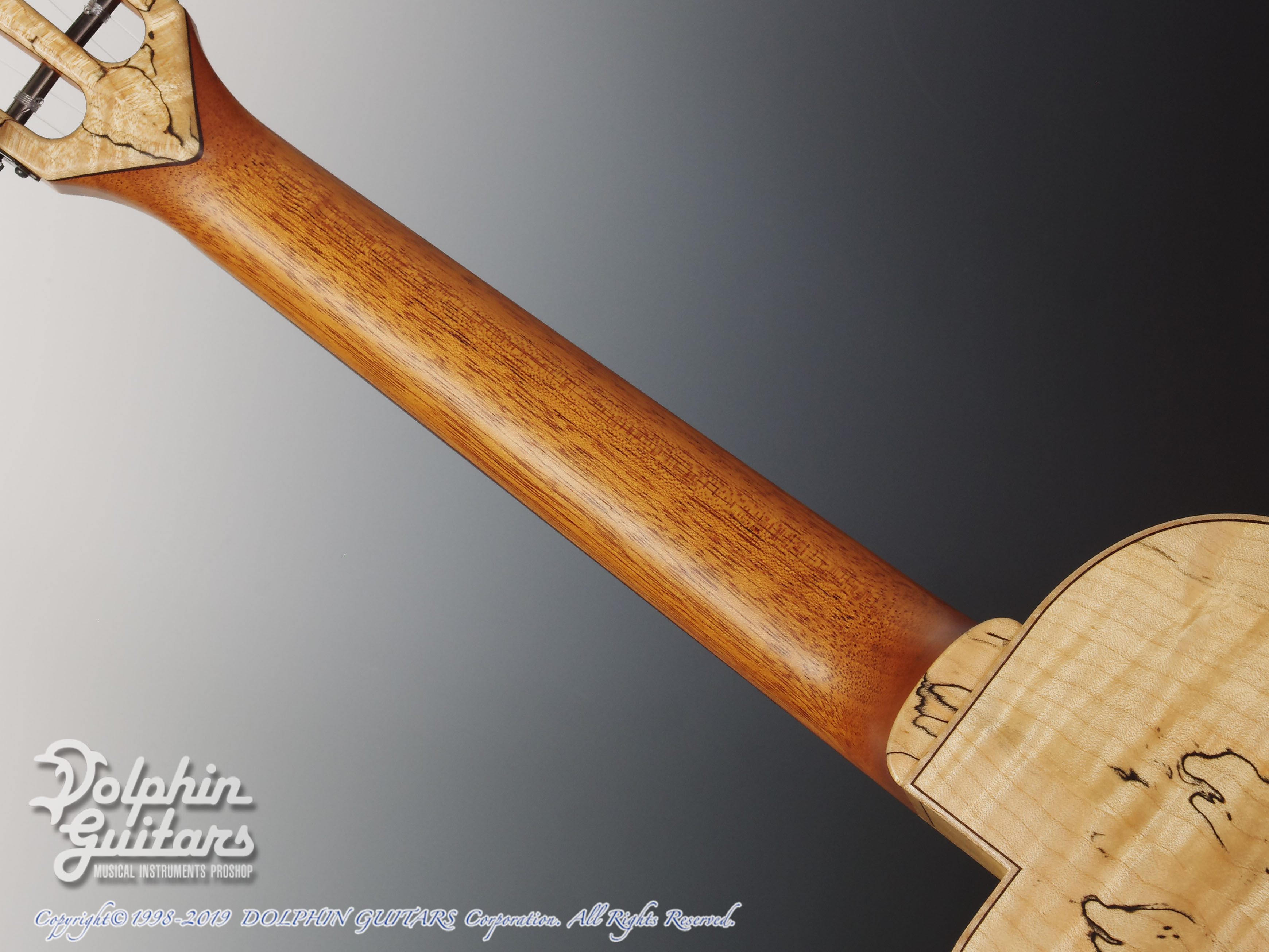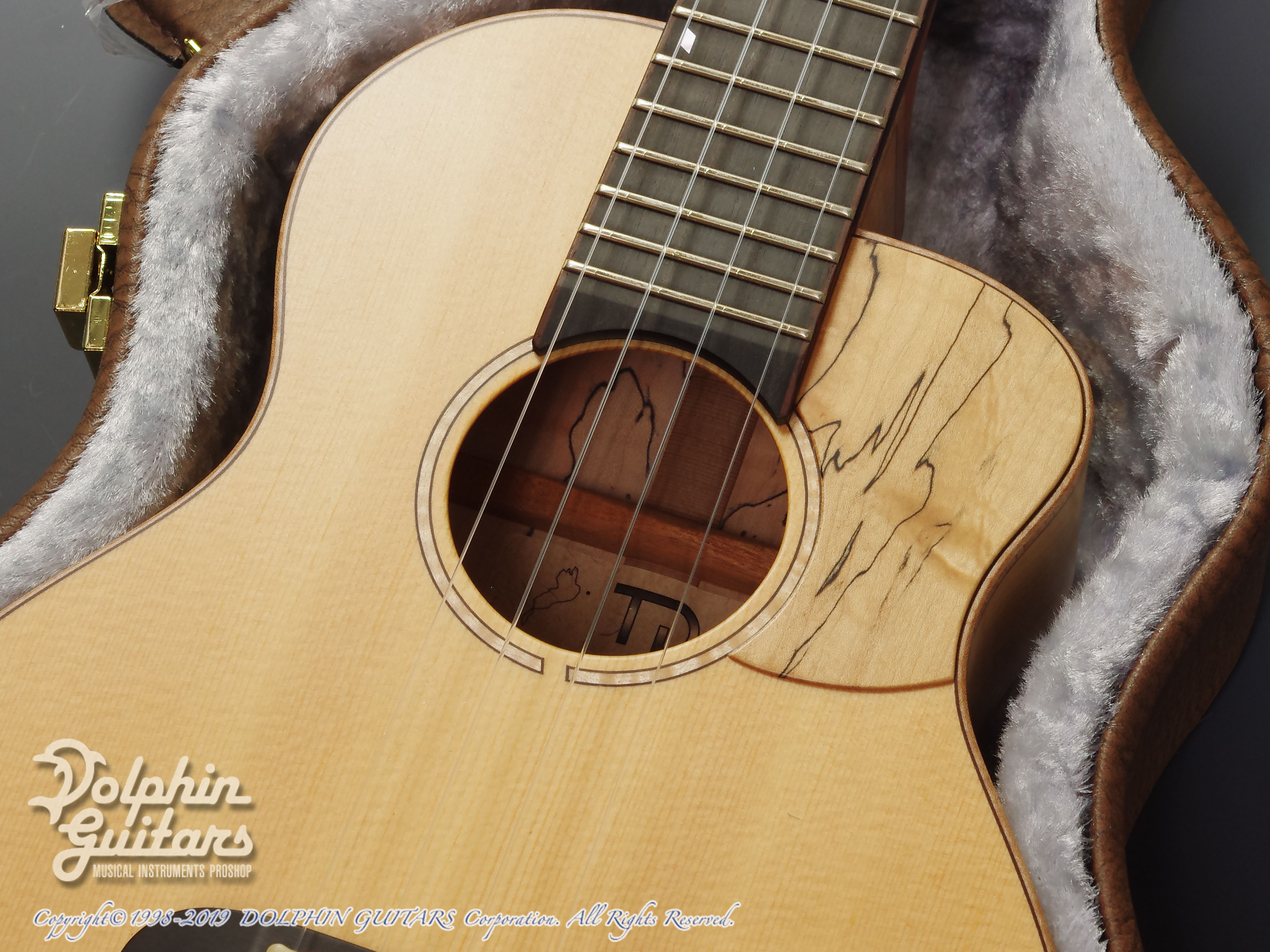 トップには木目の詰まった美しいシトカ・スプルース、エキゾチックな見た目が美しいスポルテッドメイプルS&B、マホガニーネック、ヘッドプレート&ピックガードにはS&Bと同じくスポルテッドメイプルを使用。