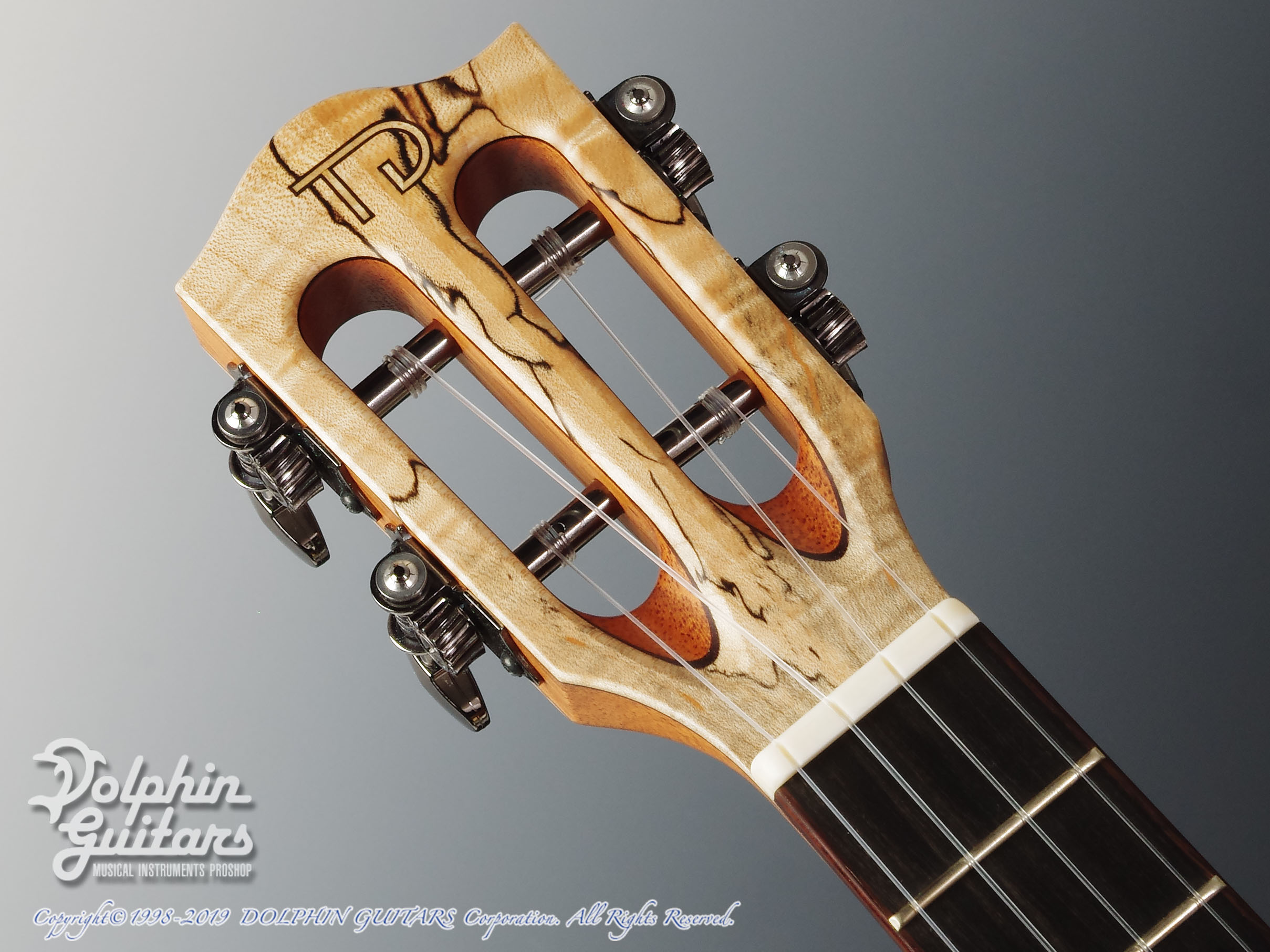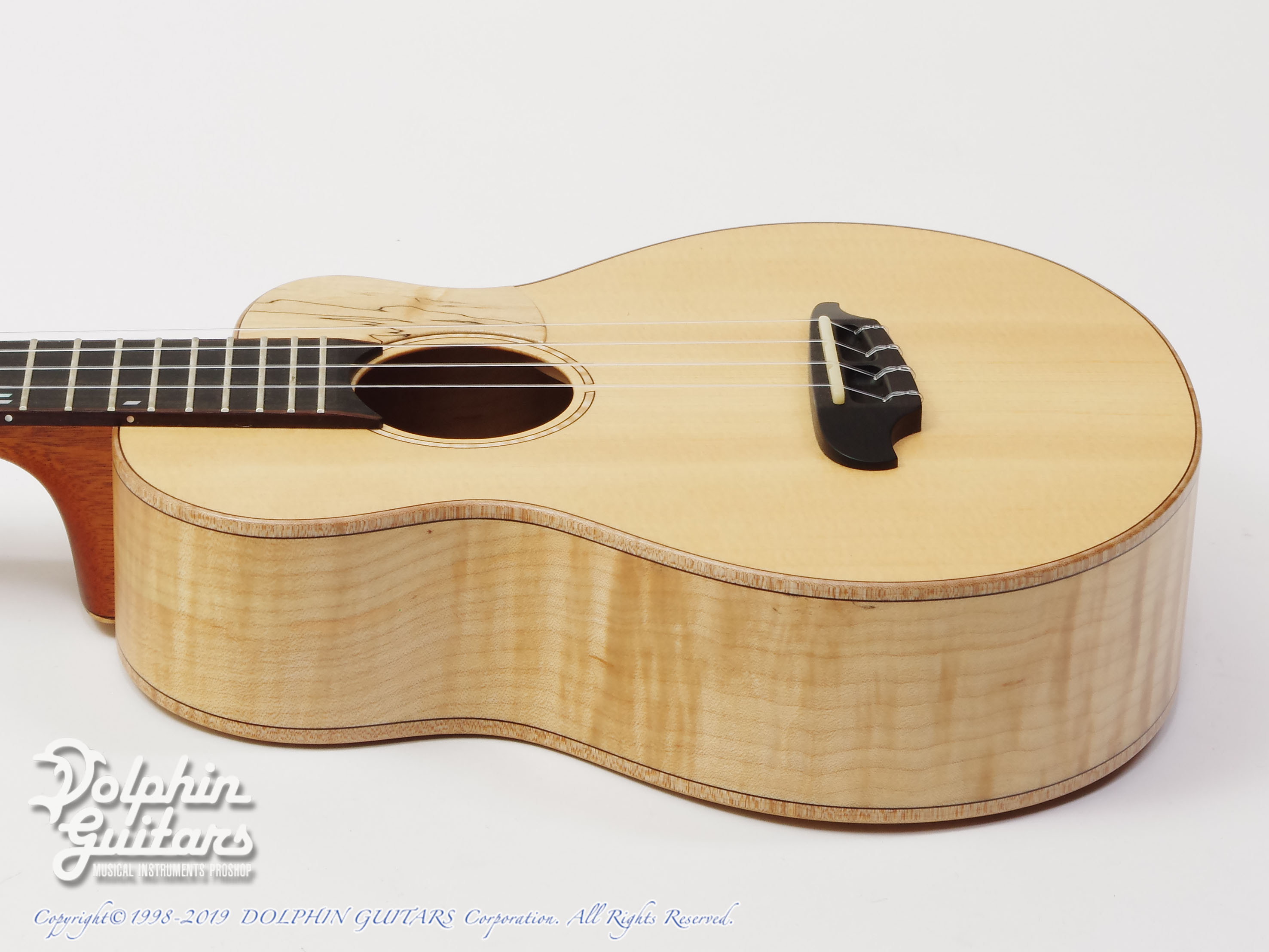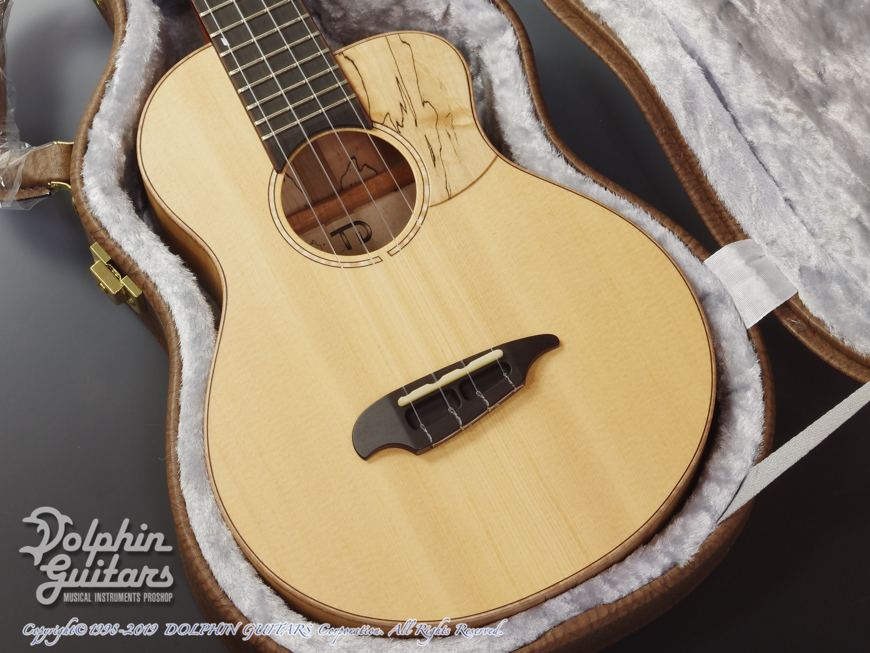 トップには木目の詰まった美しいシトカ・スプルース、エキゾチックな見た目が美しいスポルテッドメイプルS&B、マホガニーネック、ヘッドプレート&ピックガードにはS&Bと同じくスポルテッドメイプルを使用。