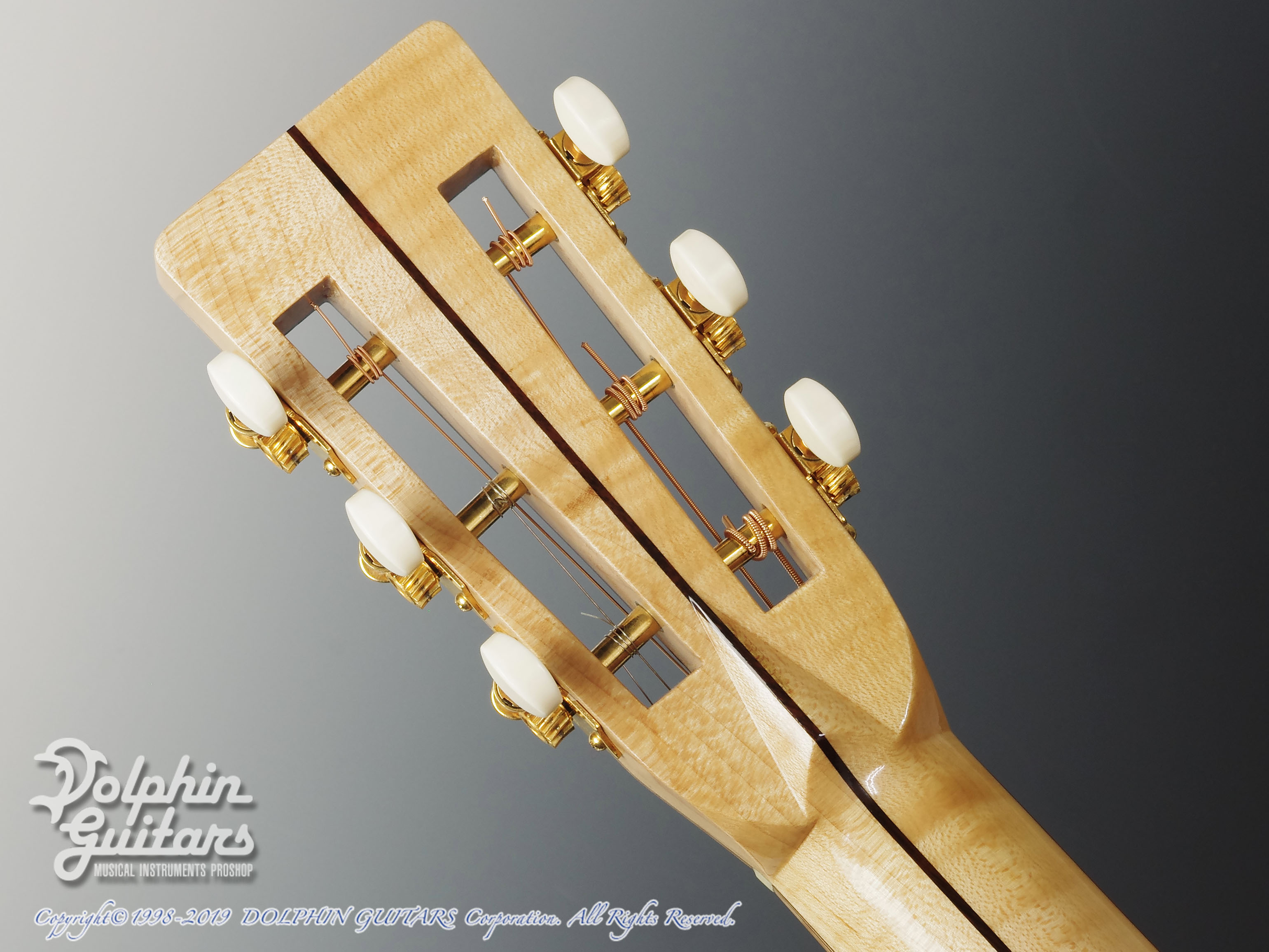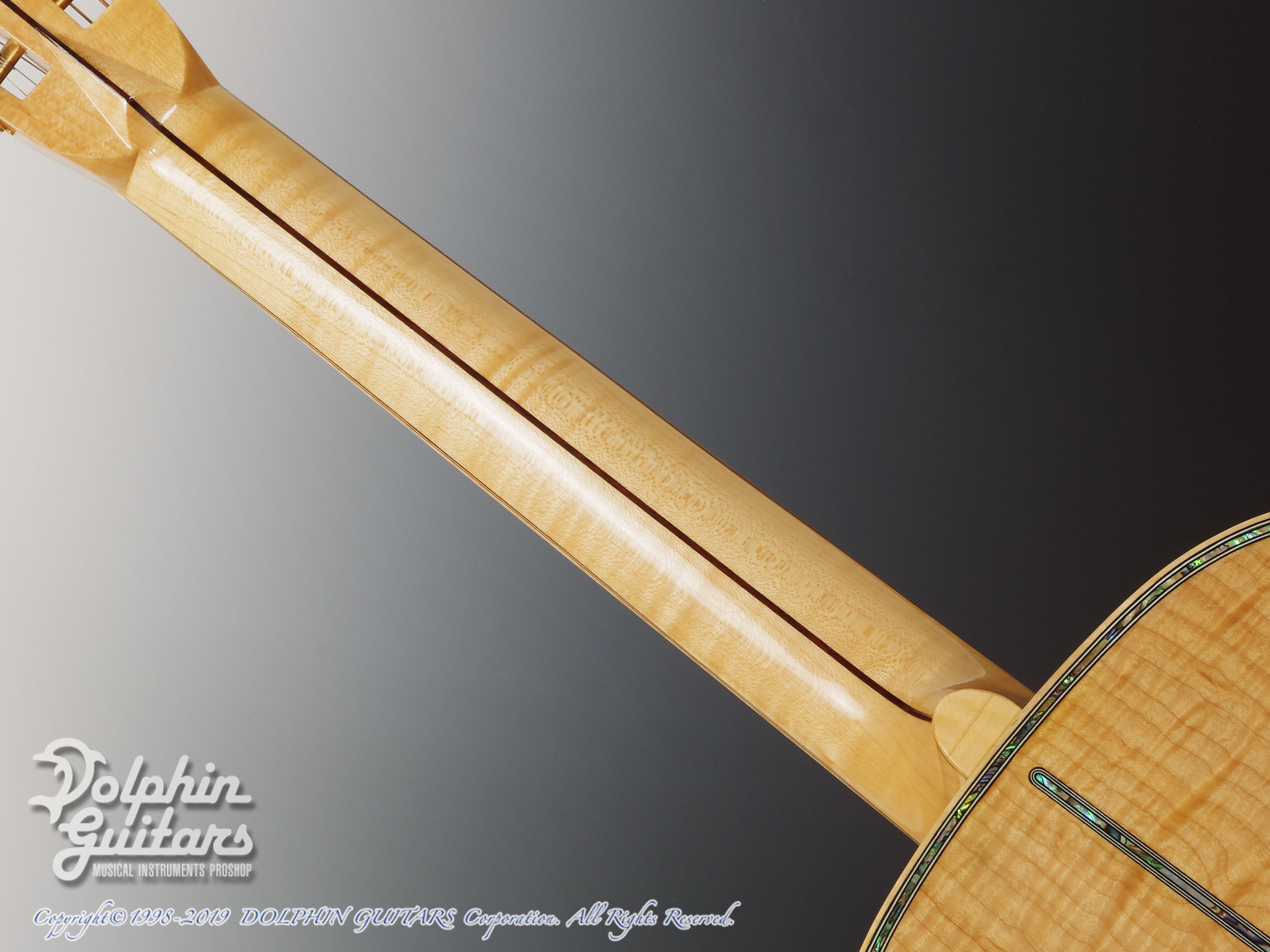 エゾマツ・トップ、フレイム・メイプルS&B、メイプルネック(アジャスタブルロッド)、エボニー指板&ブリッジ、メイプルウッドバインディング、Gotohオープンバック糸巻き。