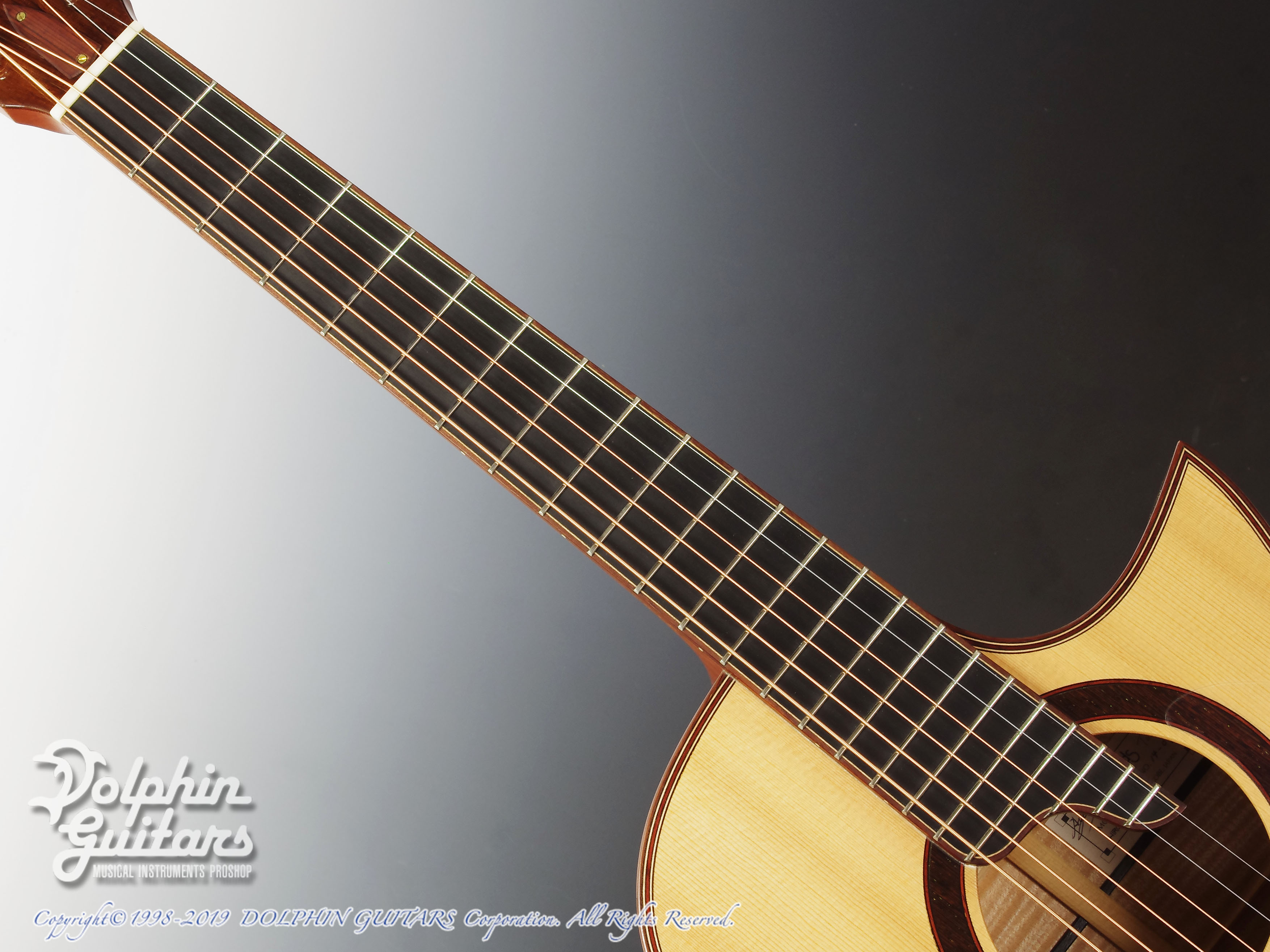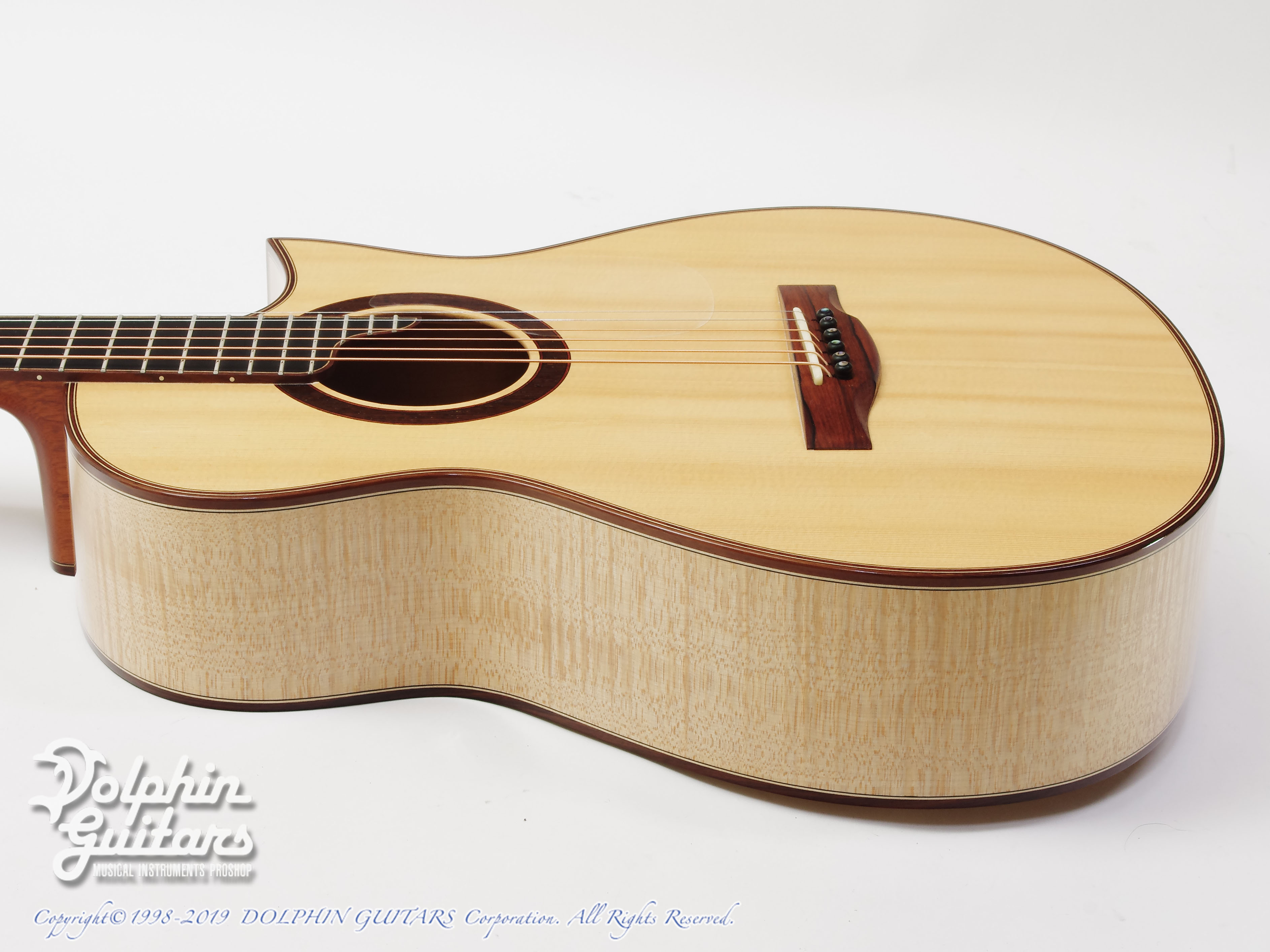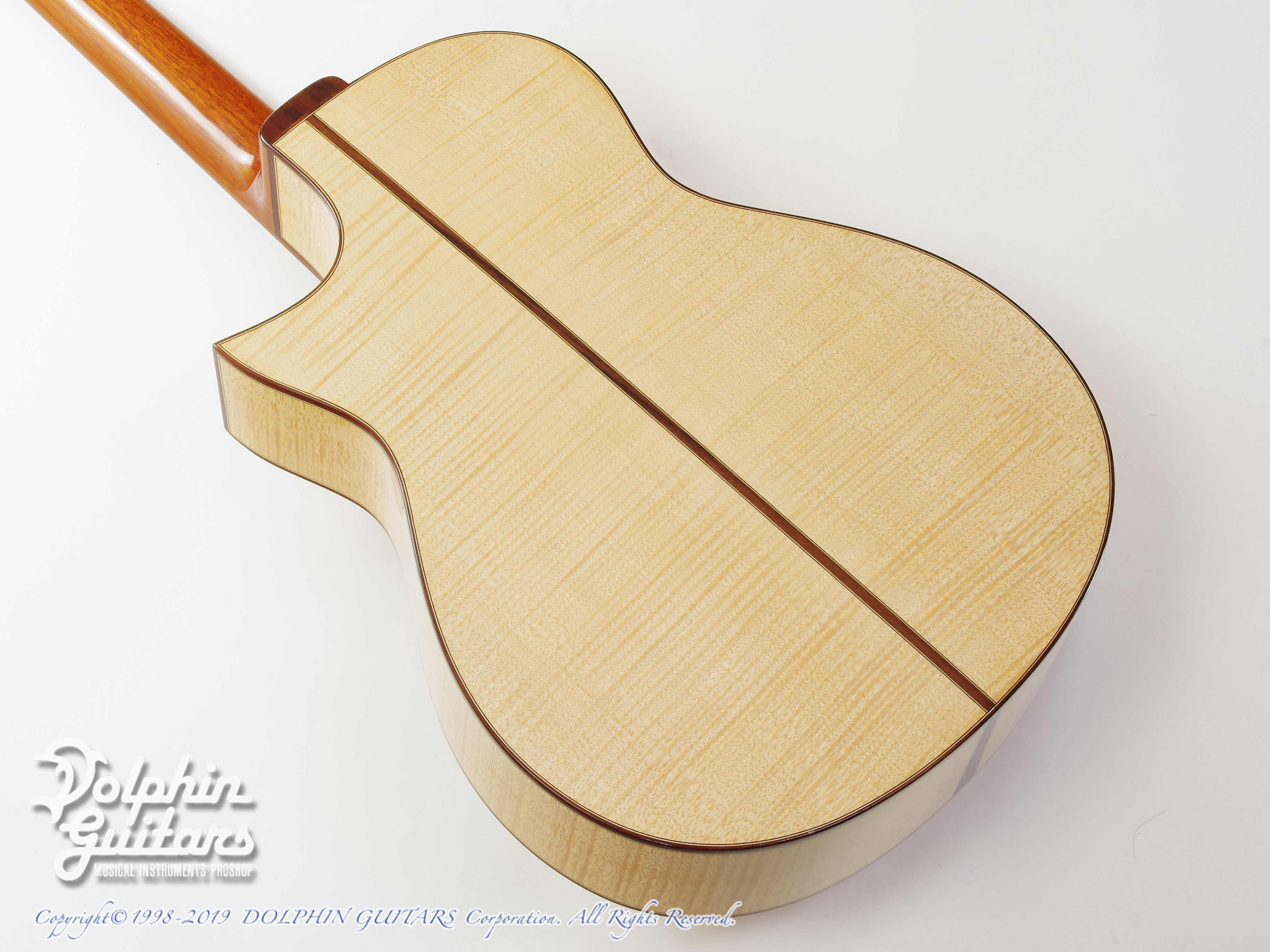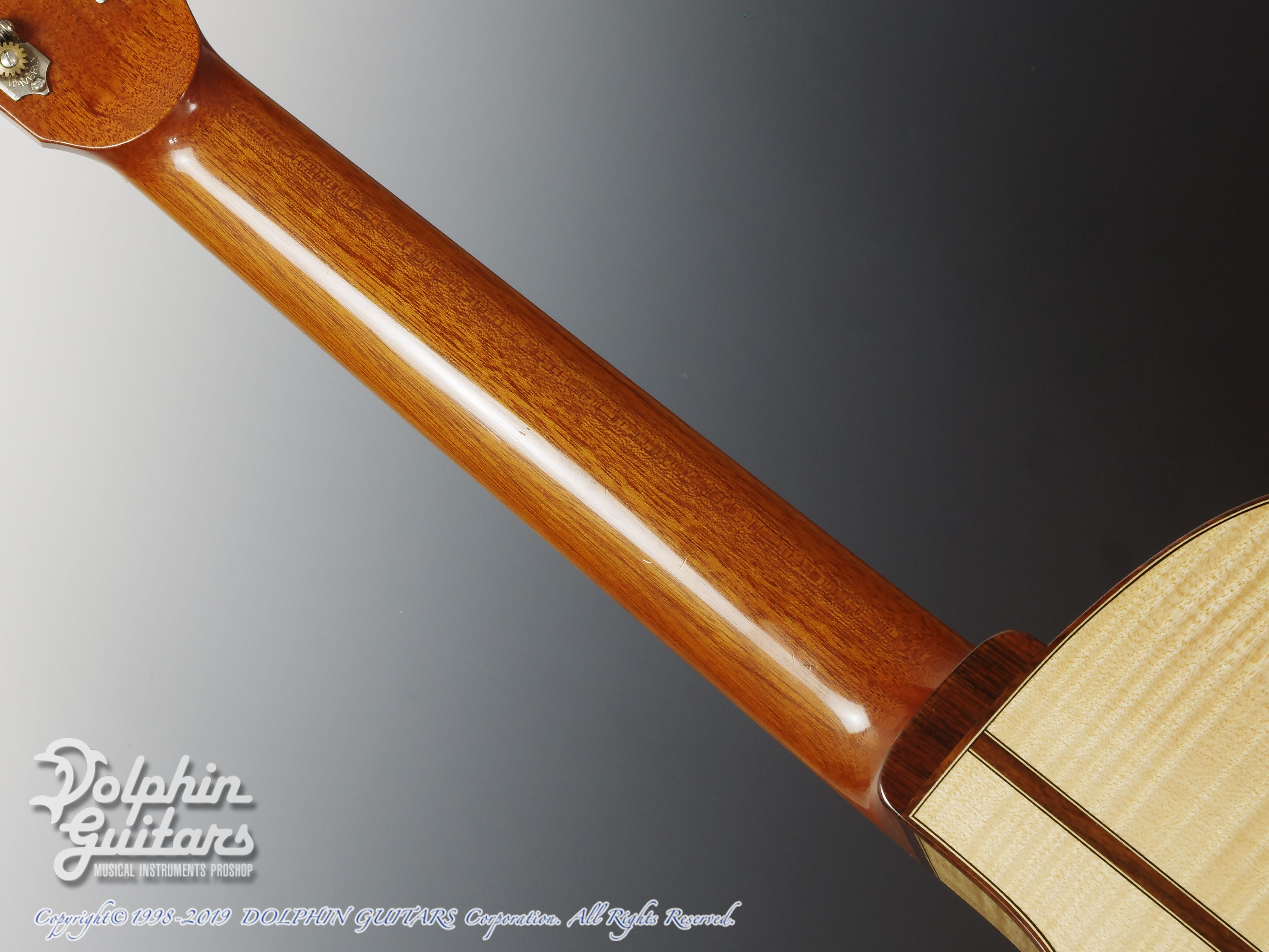 ヨーロピアン・スプルーストップ、フレイムドメイプルS&B、エボニー指板(エクステンションフィンガーボード)、マダガスカルローズウッド駒、ウェバリー糸巻き仕様。