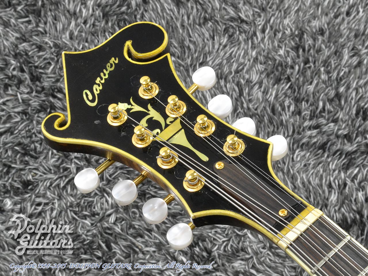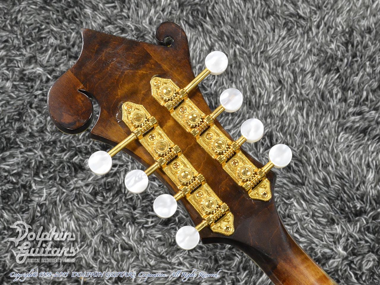 やや平坦なスクロールの仕上げやかわいいヘッドのインレイ、ハンドメイド感漂うマンドリンです。