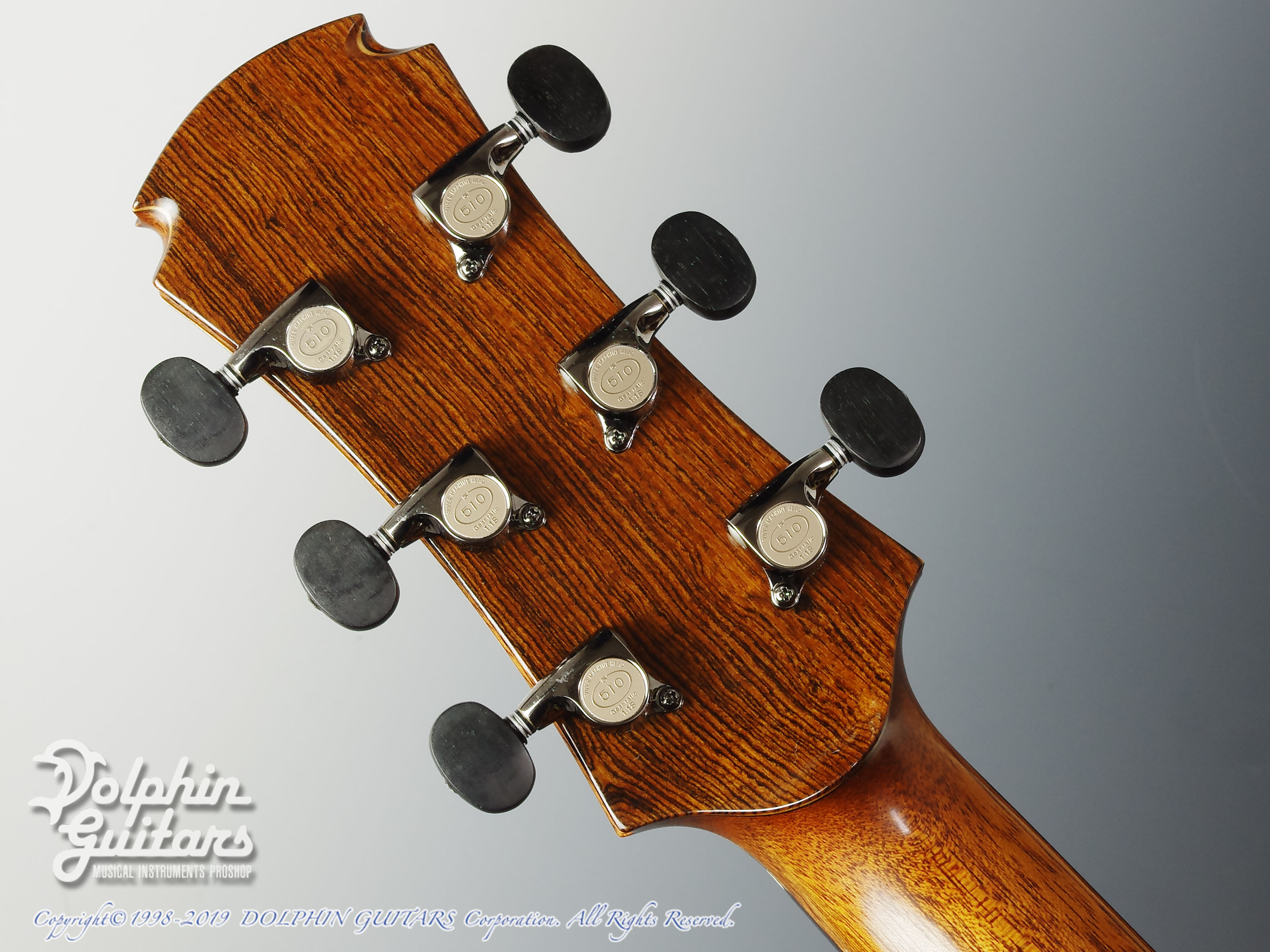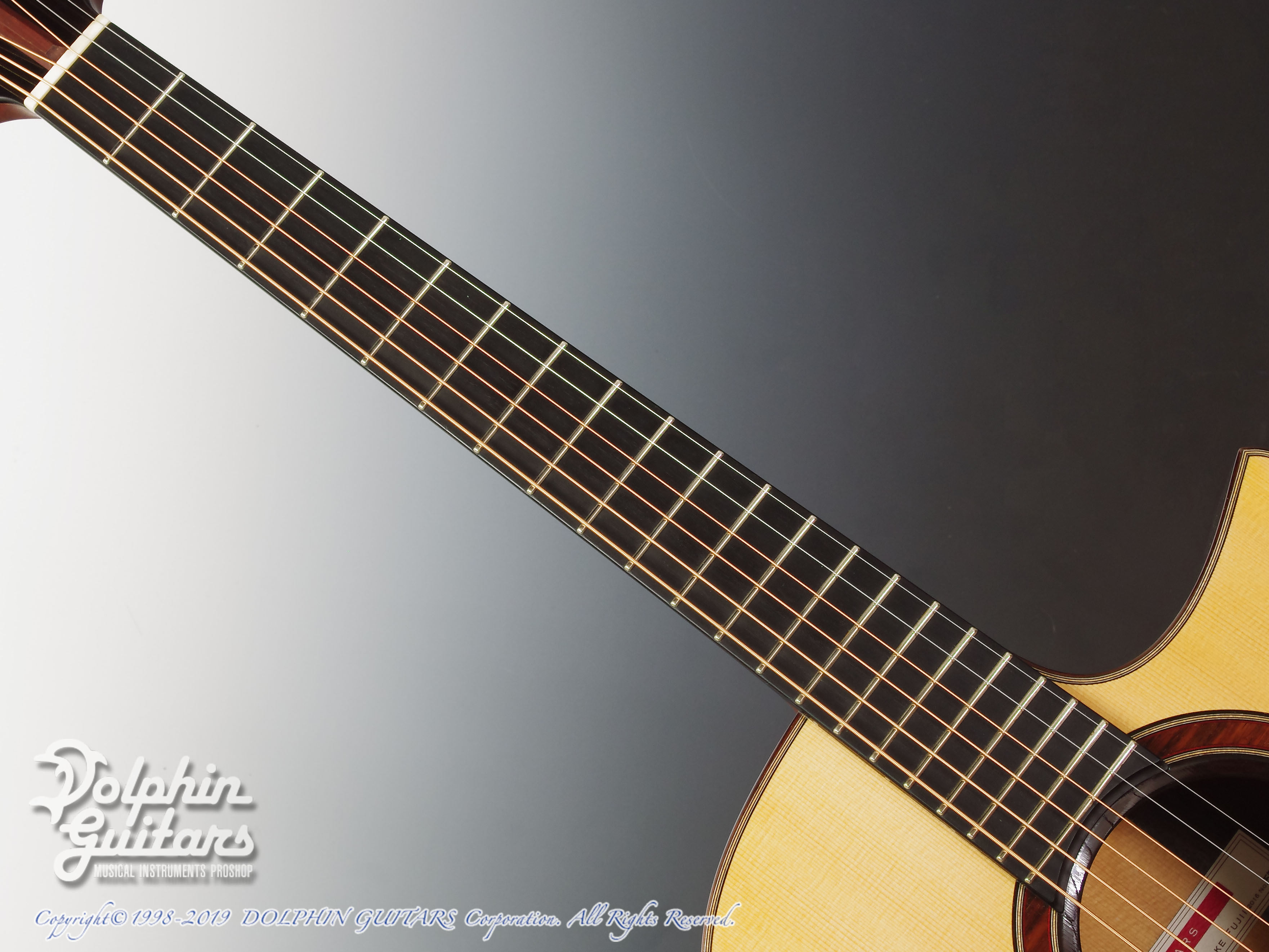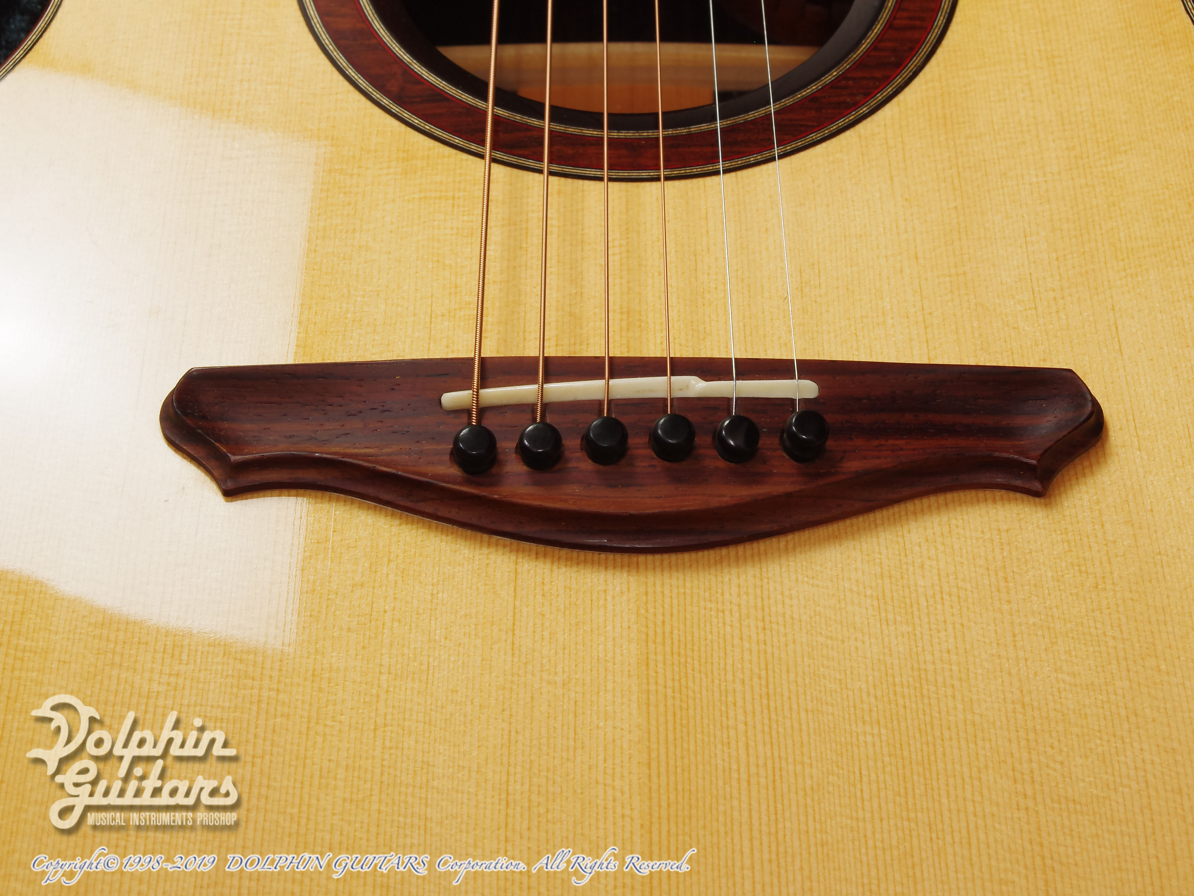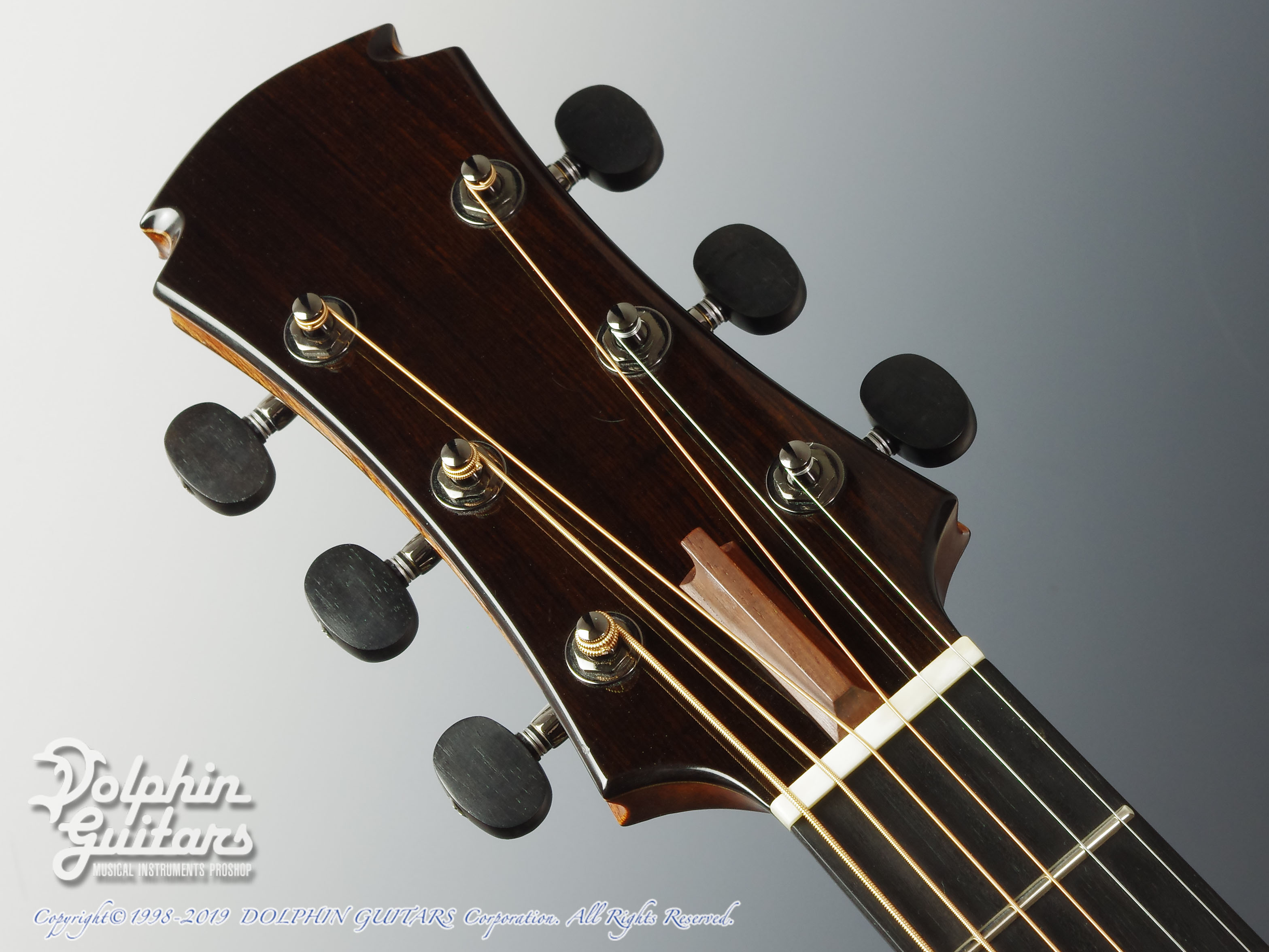 イングルマン・スプルーストップ、インディアン・ローズウッドS&B、マホガニーネック、アジャスタブルロッド、44mmナット幅、エボニー指板&ブリッジ、ウッドロゼッタ、ゴトー510ペグ。