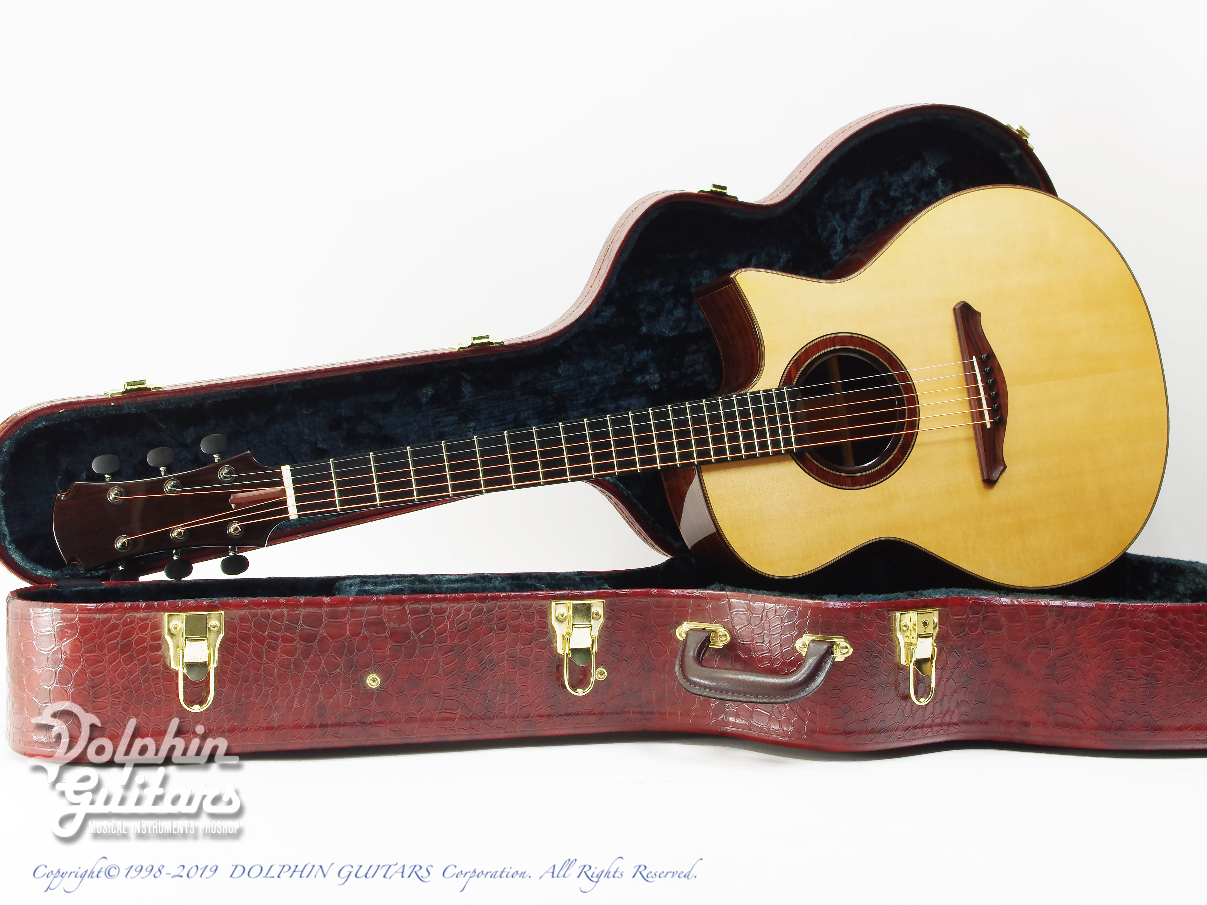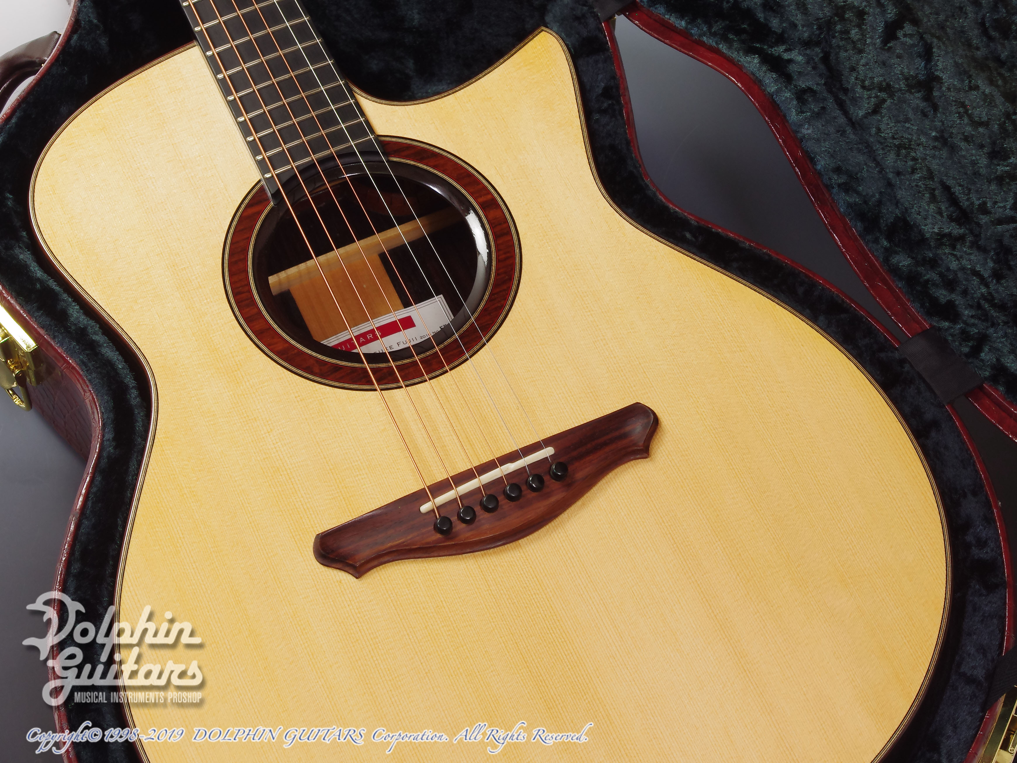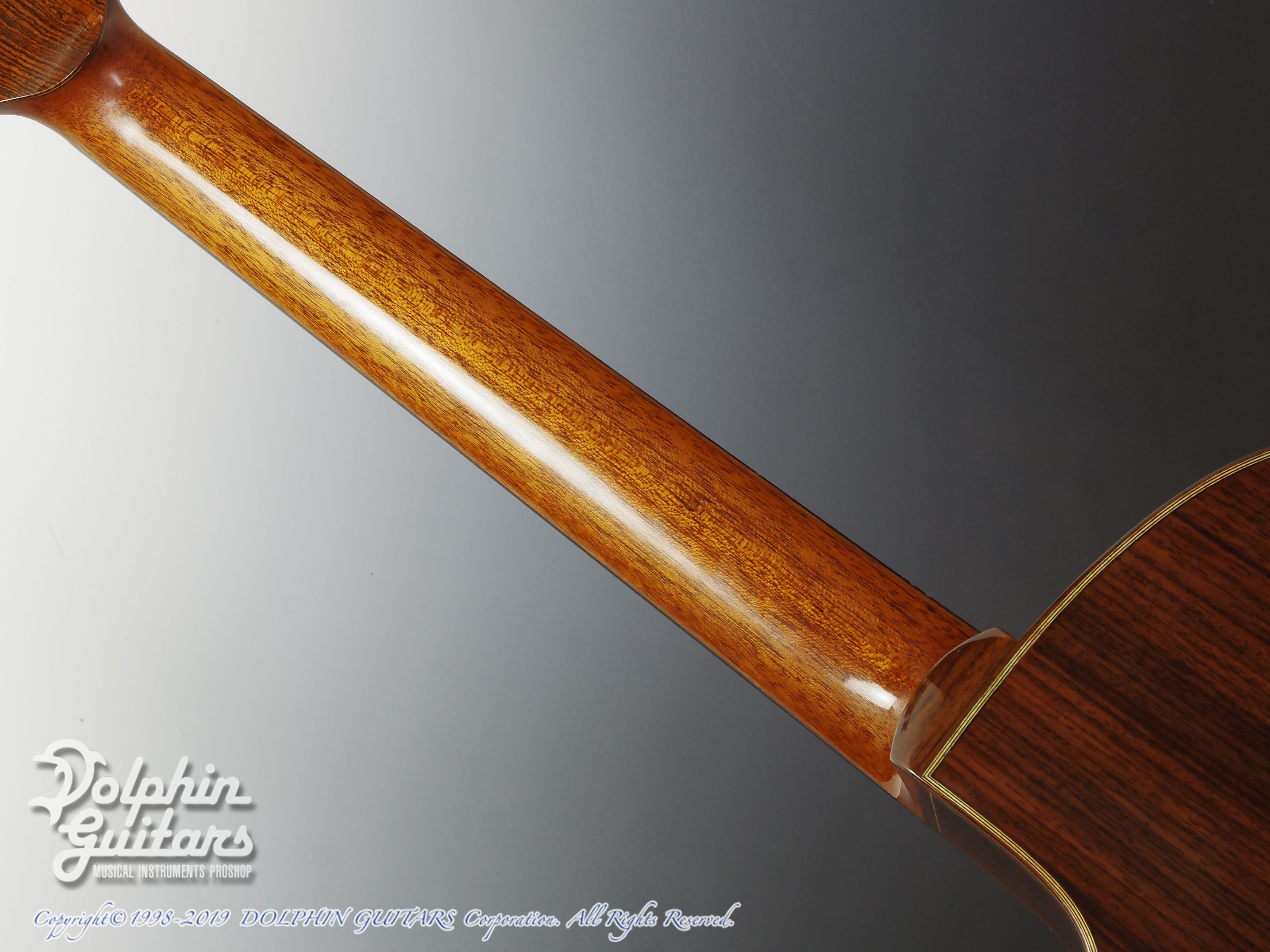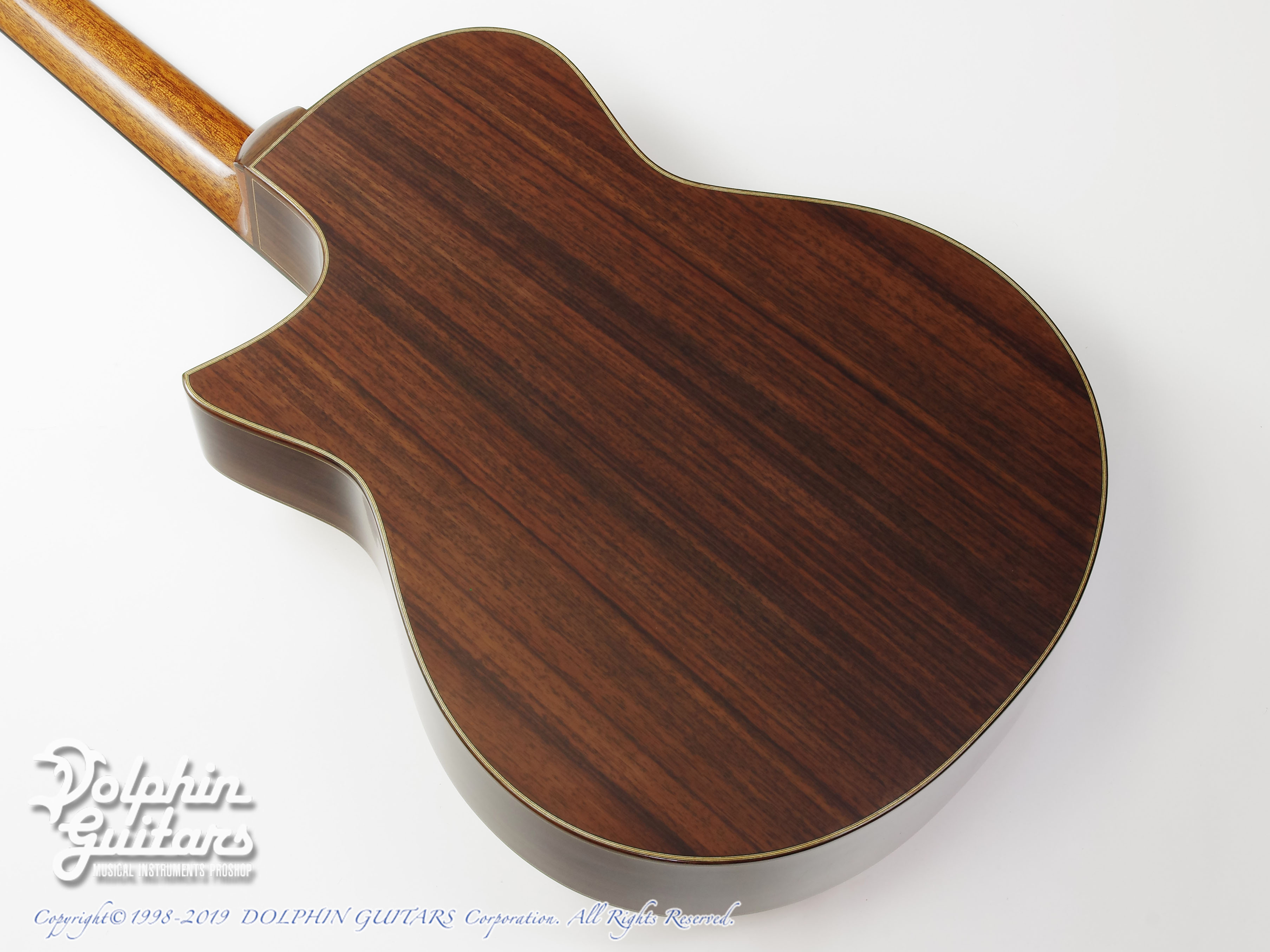 イングルマン・スプルーストップ、インディアン・ローズウッドS&B、マホガニーネック、アジャスタブルロッド、44mmナット幅、エボニー指板&ブリッジ、ウッドロゼッタ、ゴトー510ペグ。