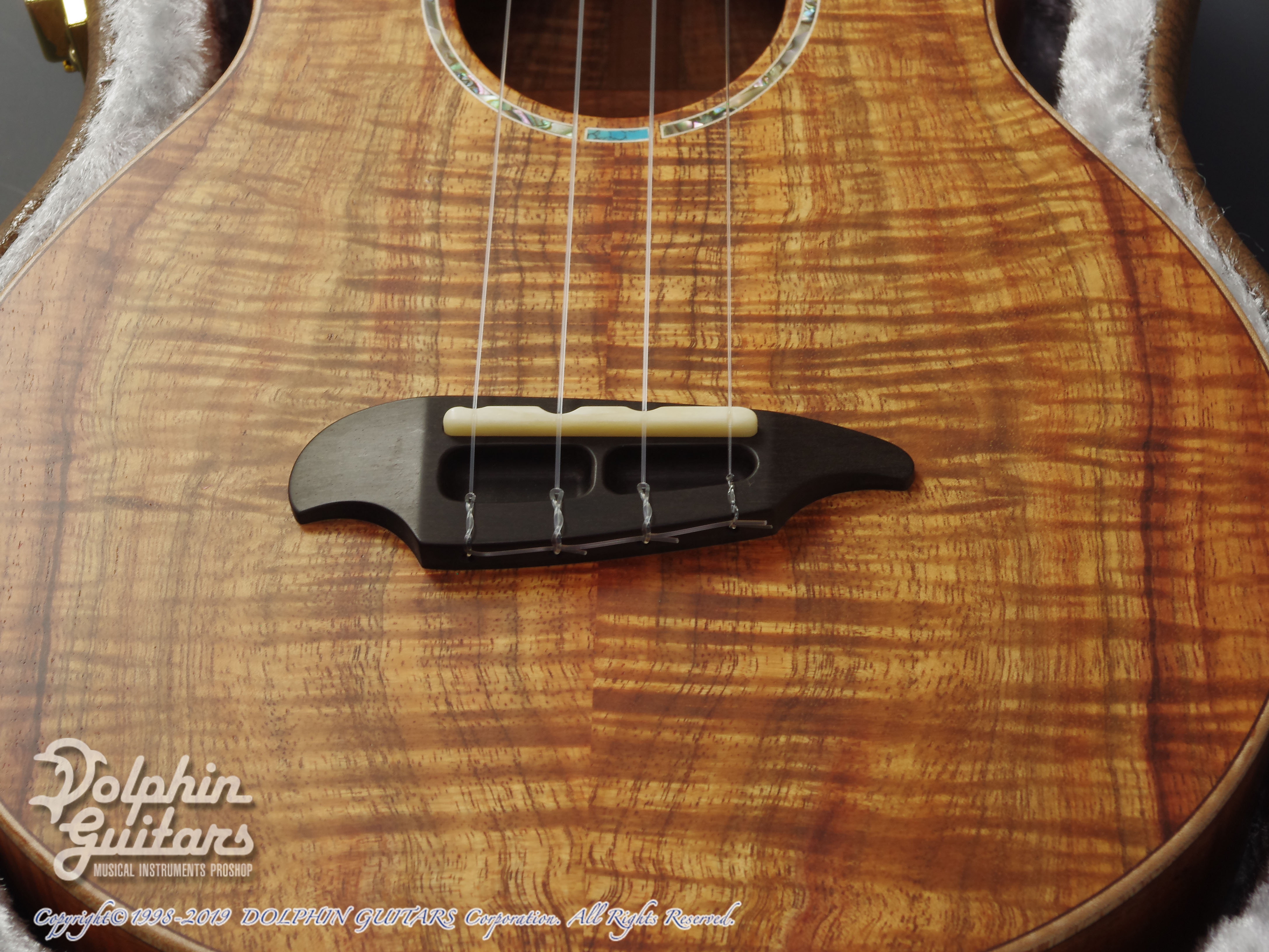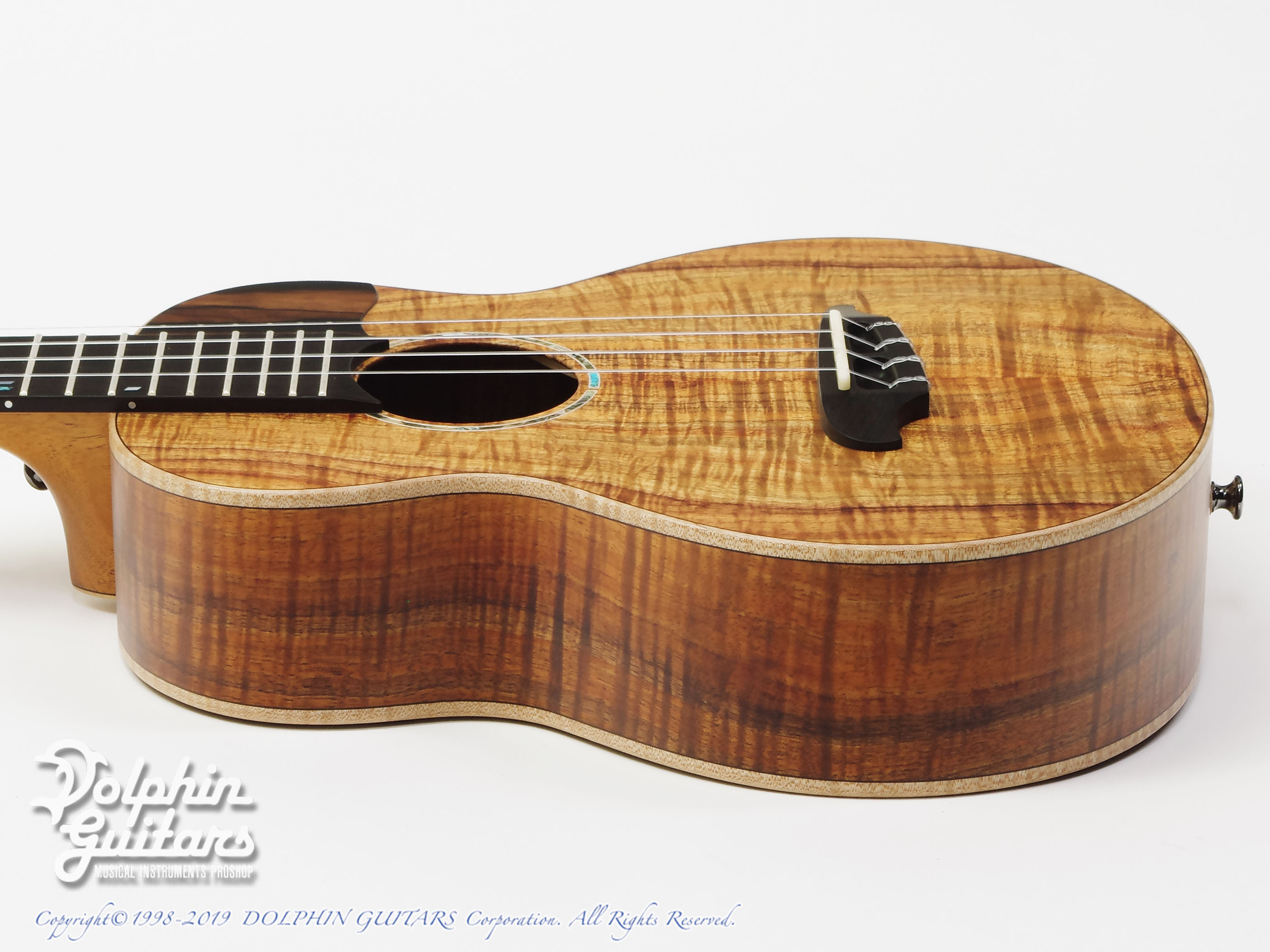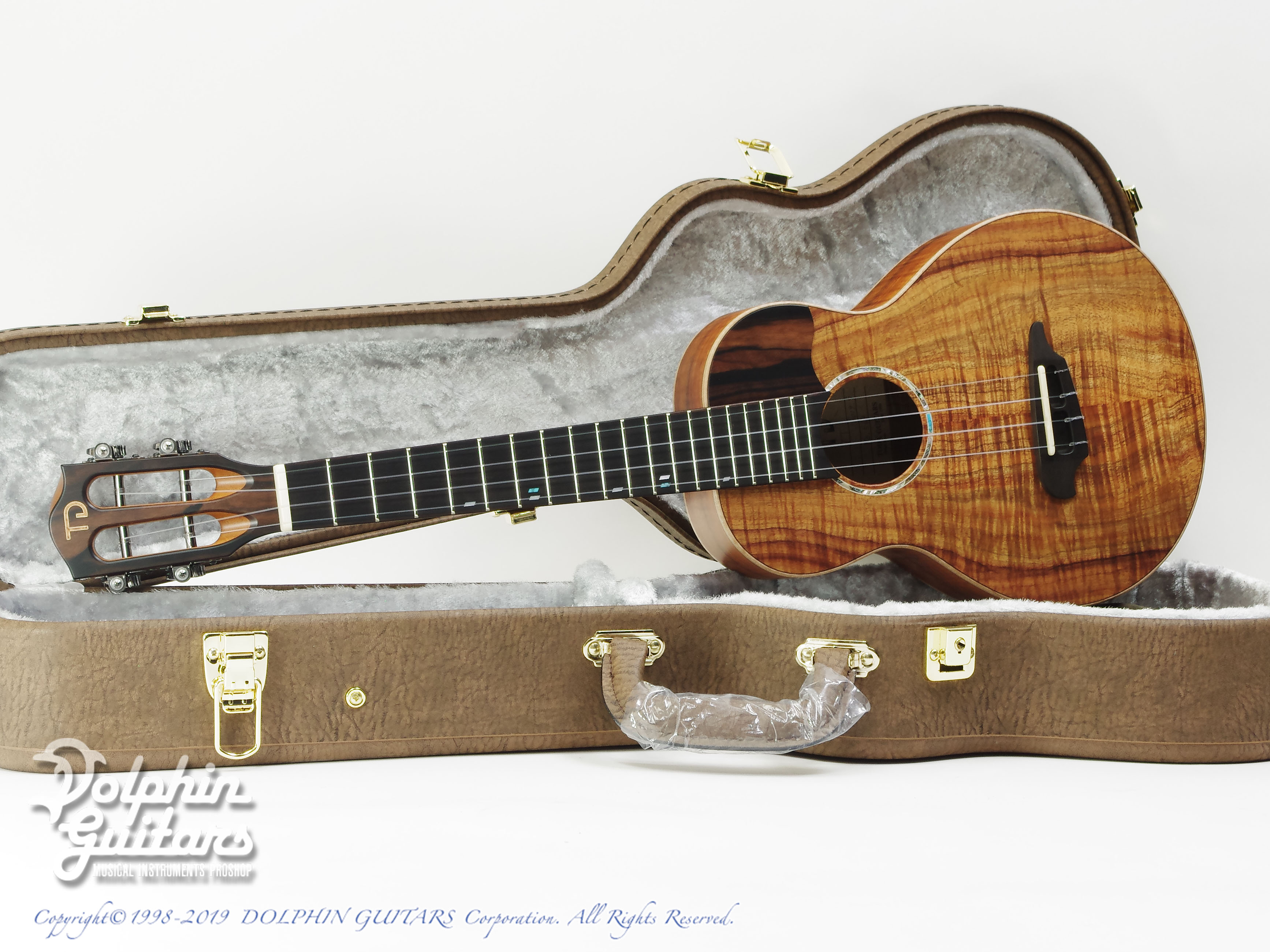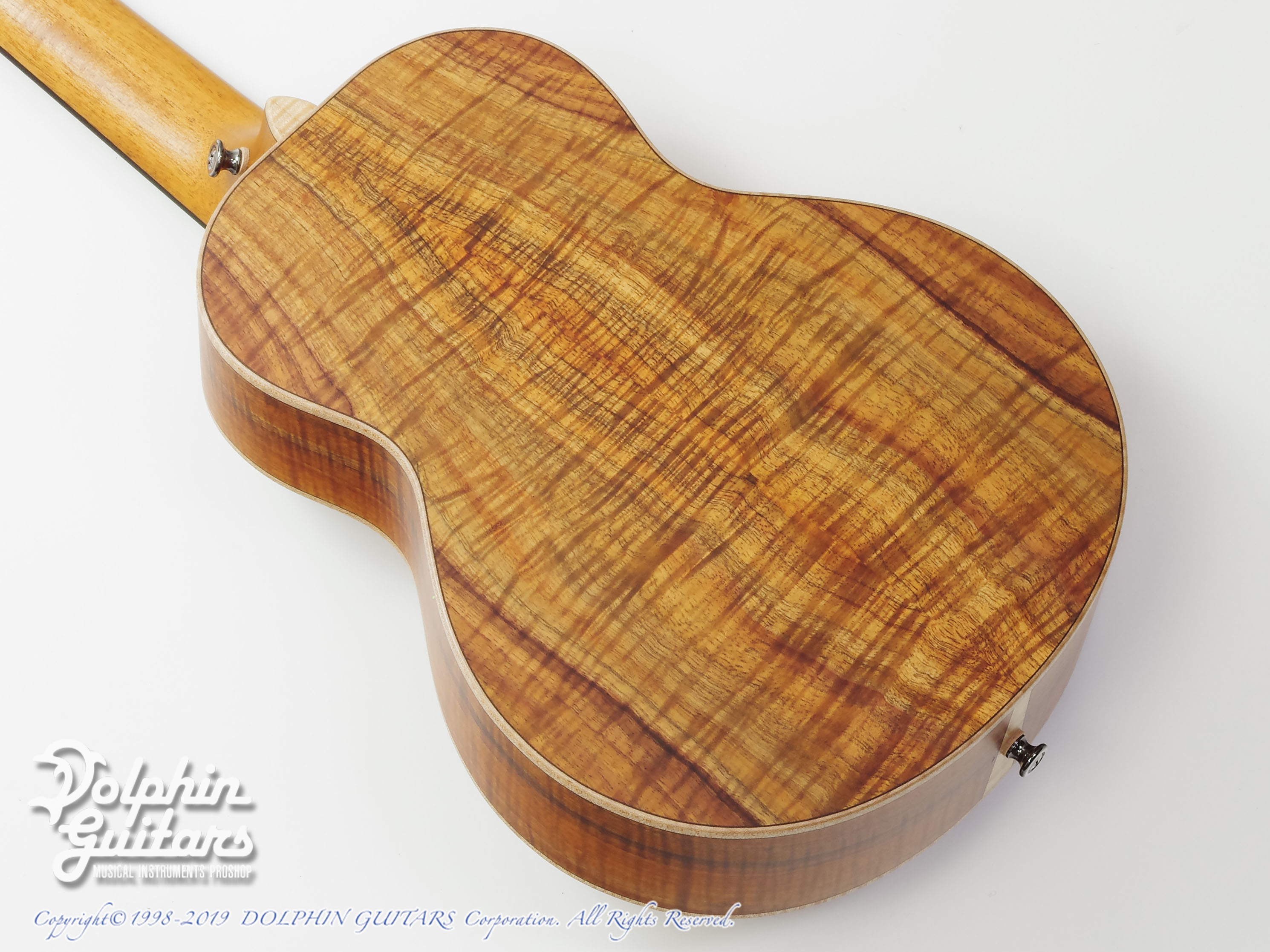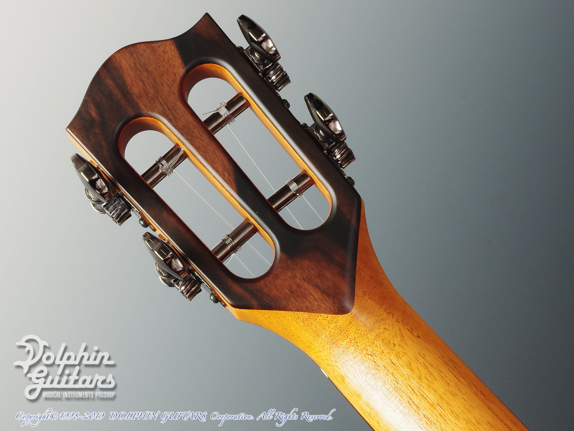 5Aグレードのハワイアン・コア・ボディ、ホンジュラス・マホガ二ー・ネック、エボニー指板&ブリッジ、スロッテッド・ヘッド、コア・バインディング、エボニー・ピックガード、ゴトー糸巻き。