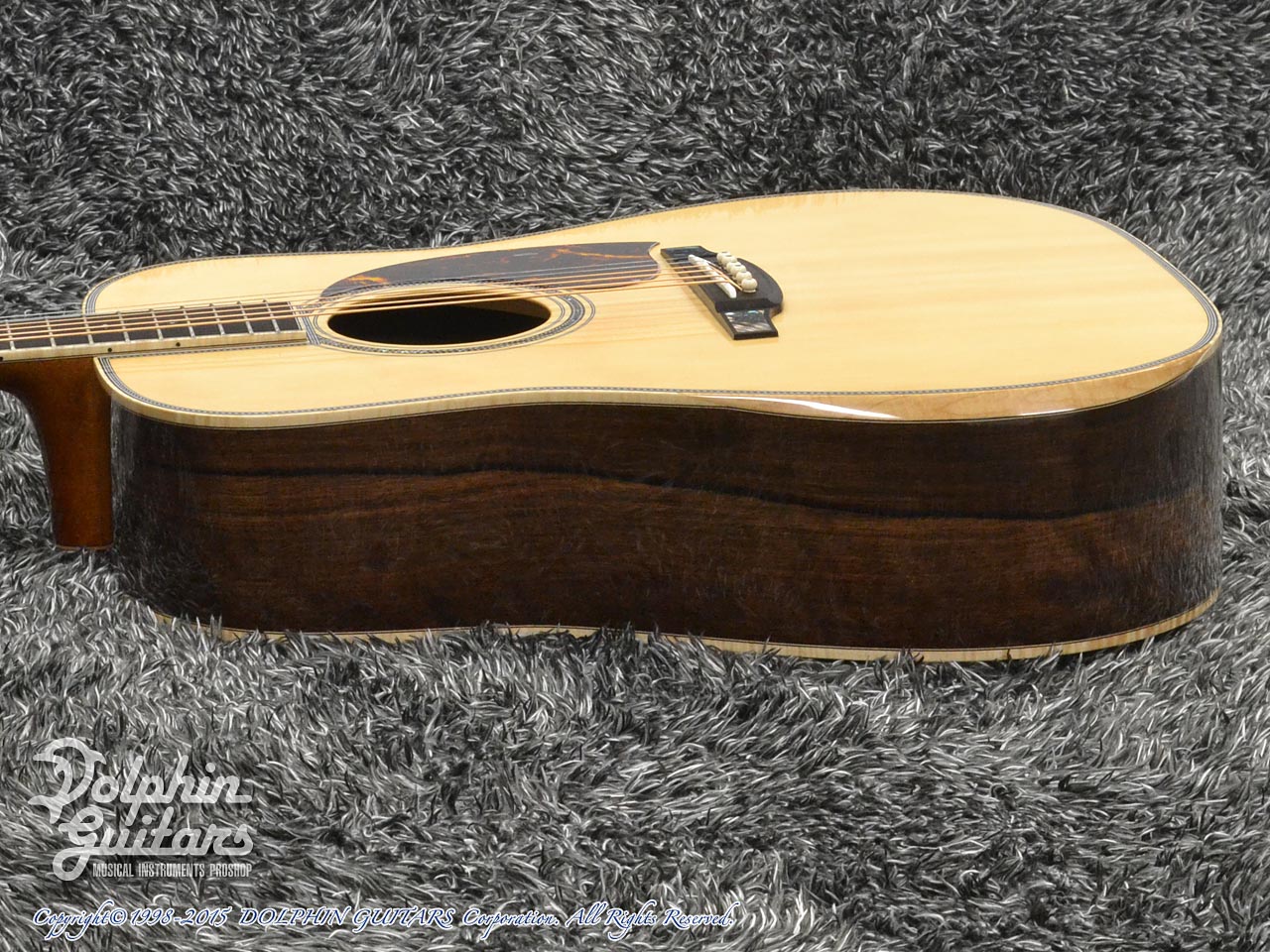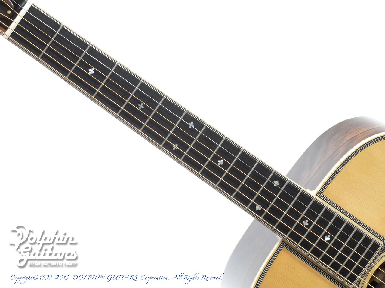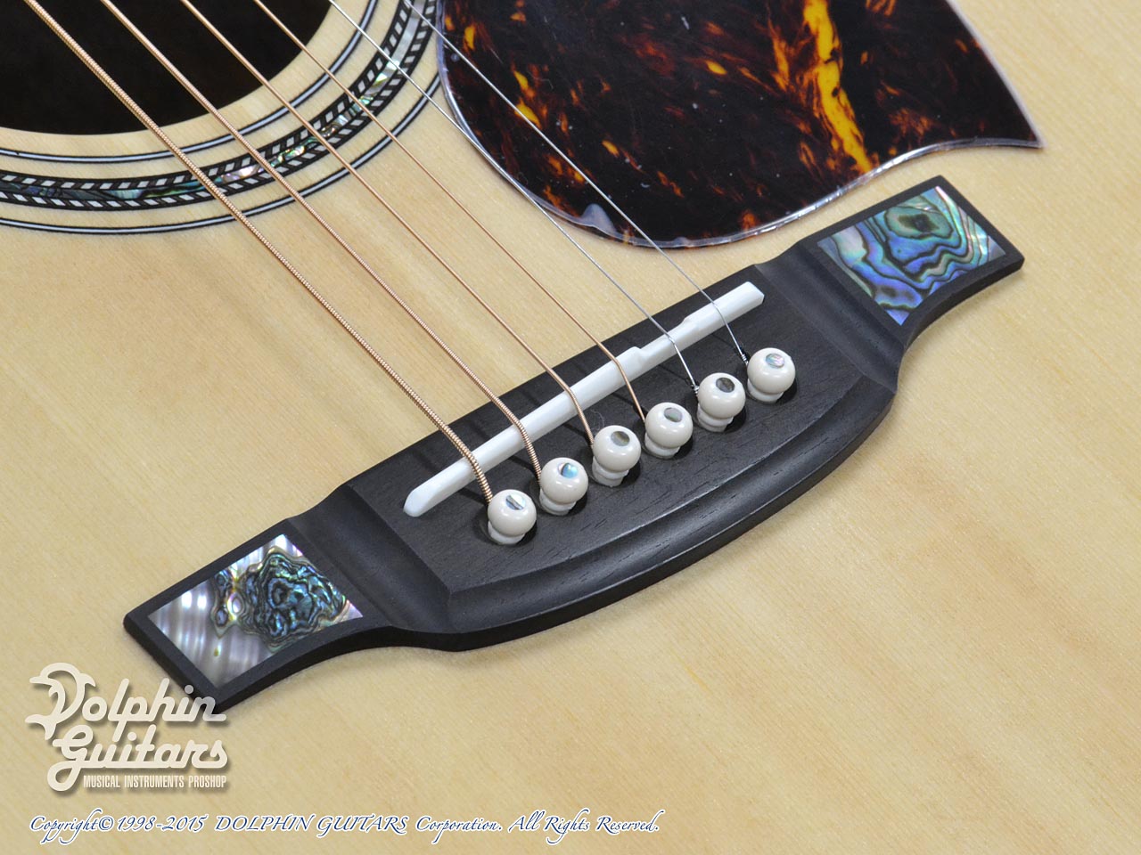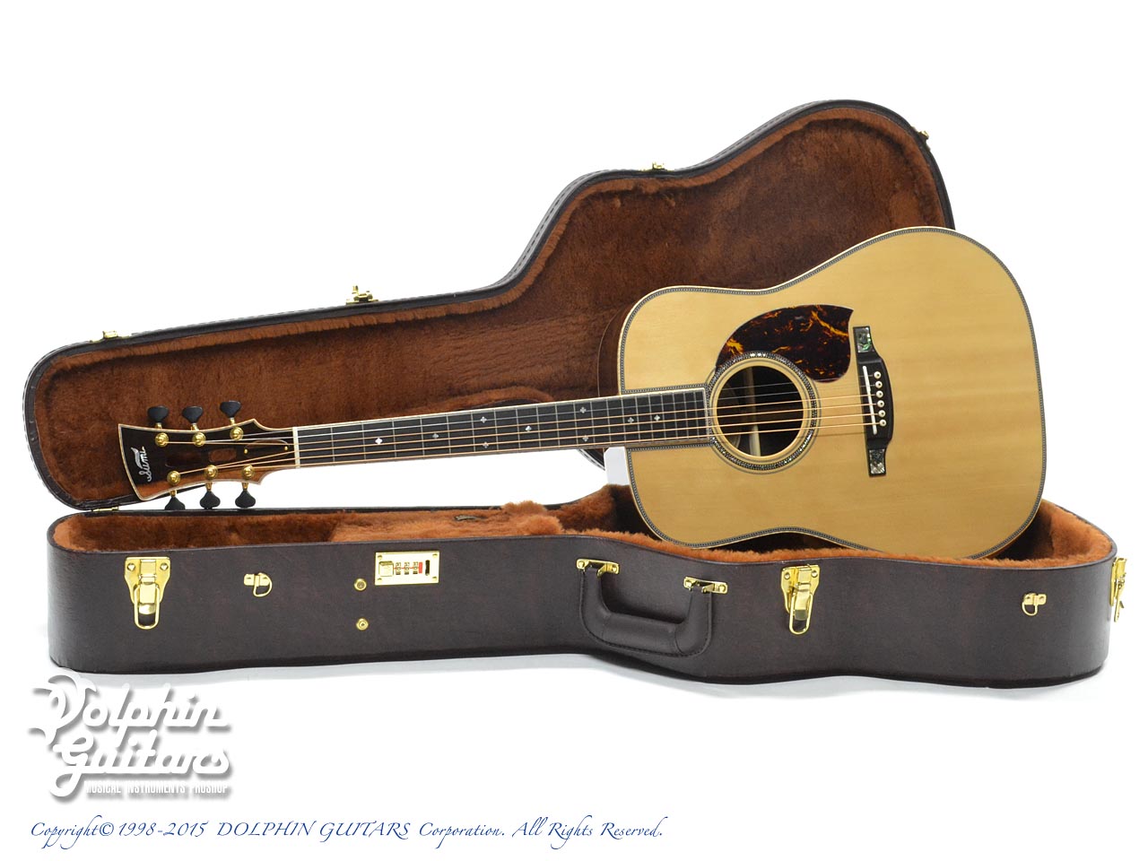 赤エゾ松トップ、フレイム・カリマンタン・エボニー・サイド&バック、スキャロップドXブレイス、マホガニーネック、アジャスタブルロッド、エボニー指板&駒、メイプル・バインディング&アームレスト、べっ甲柄PG、ゴトー製510糸巻き。