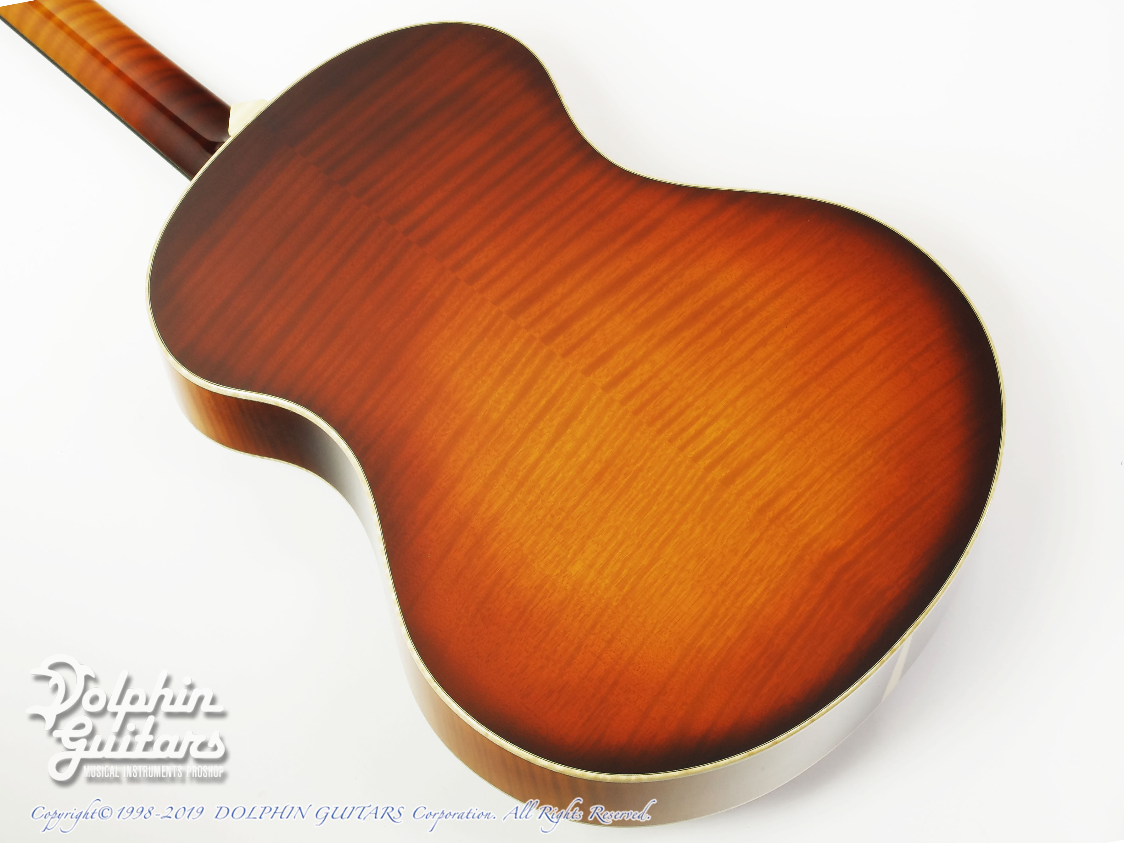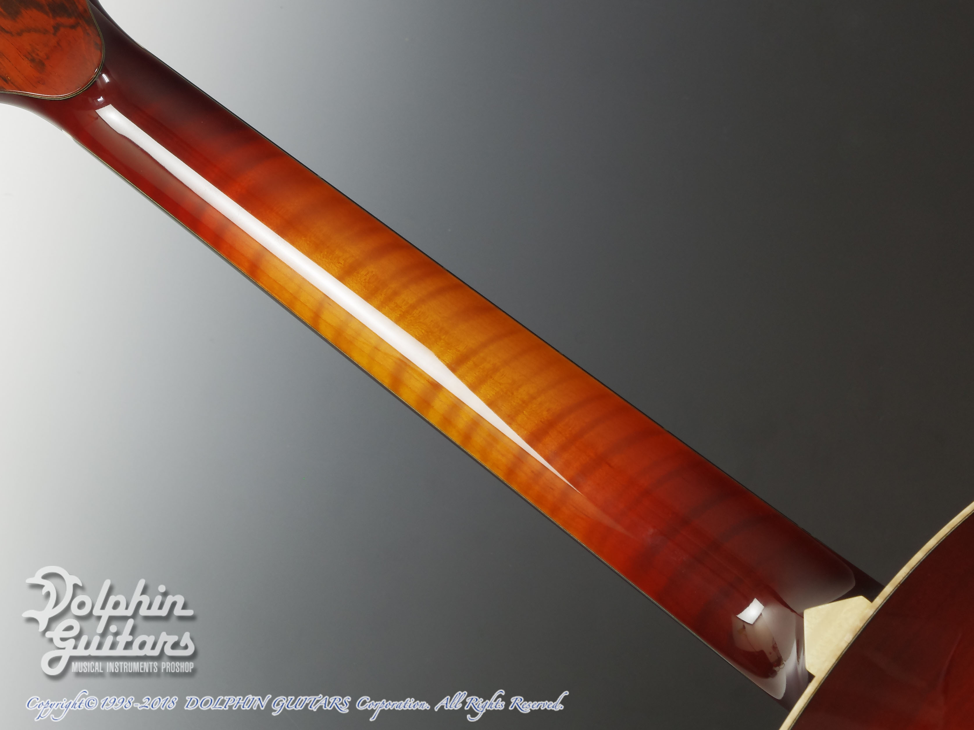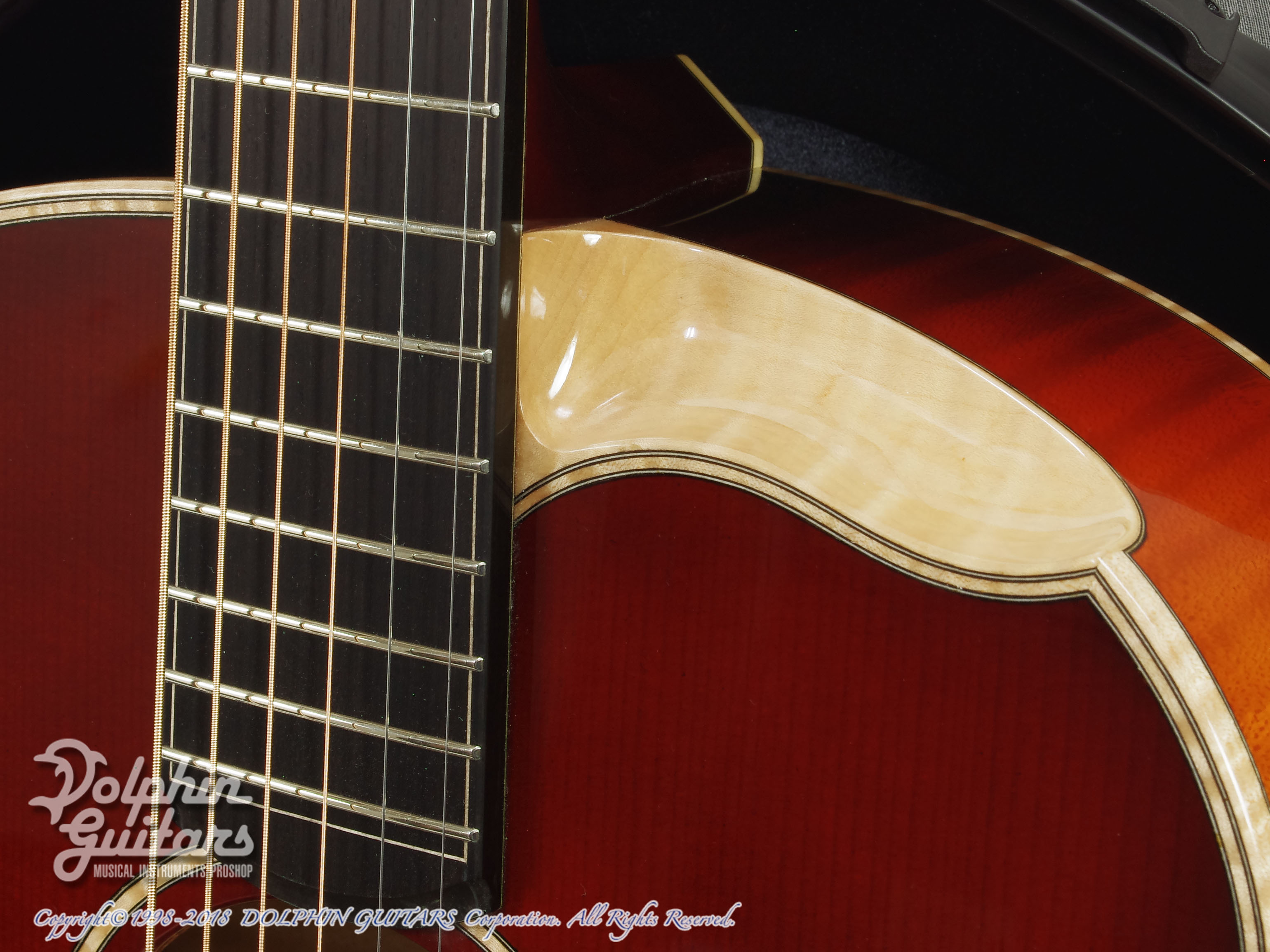 アディロンダック・スプルーストップ、スイス・メイプルS&B、スキャロップドXブレイス、メイプル1pネック、エボニー指板、ハカランダブリッジ、メイプルバインディング、スコープド・カッタウェイ、オールサンバーストフィニッシュ。