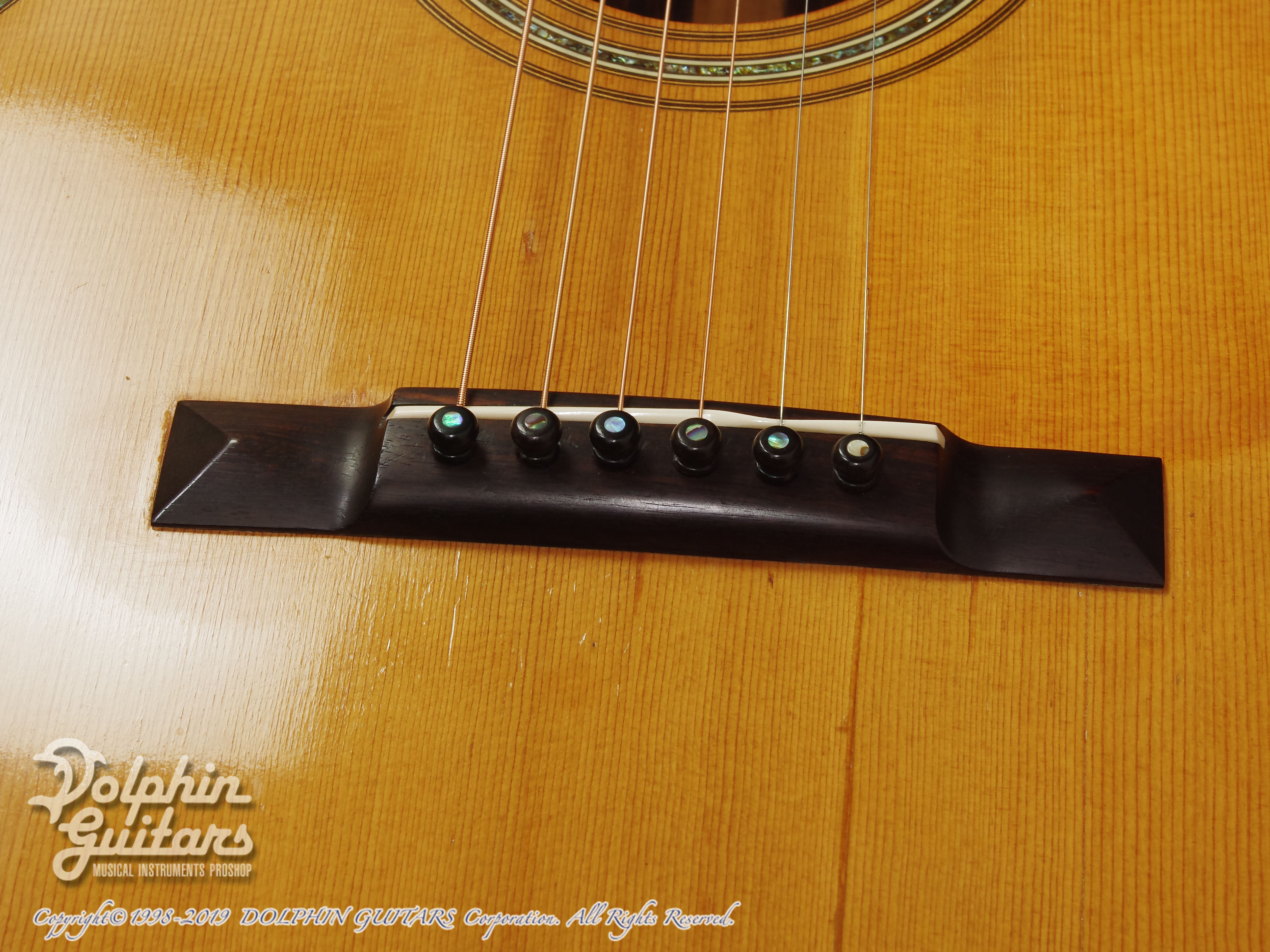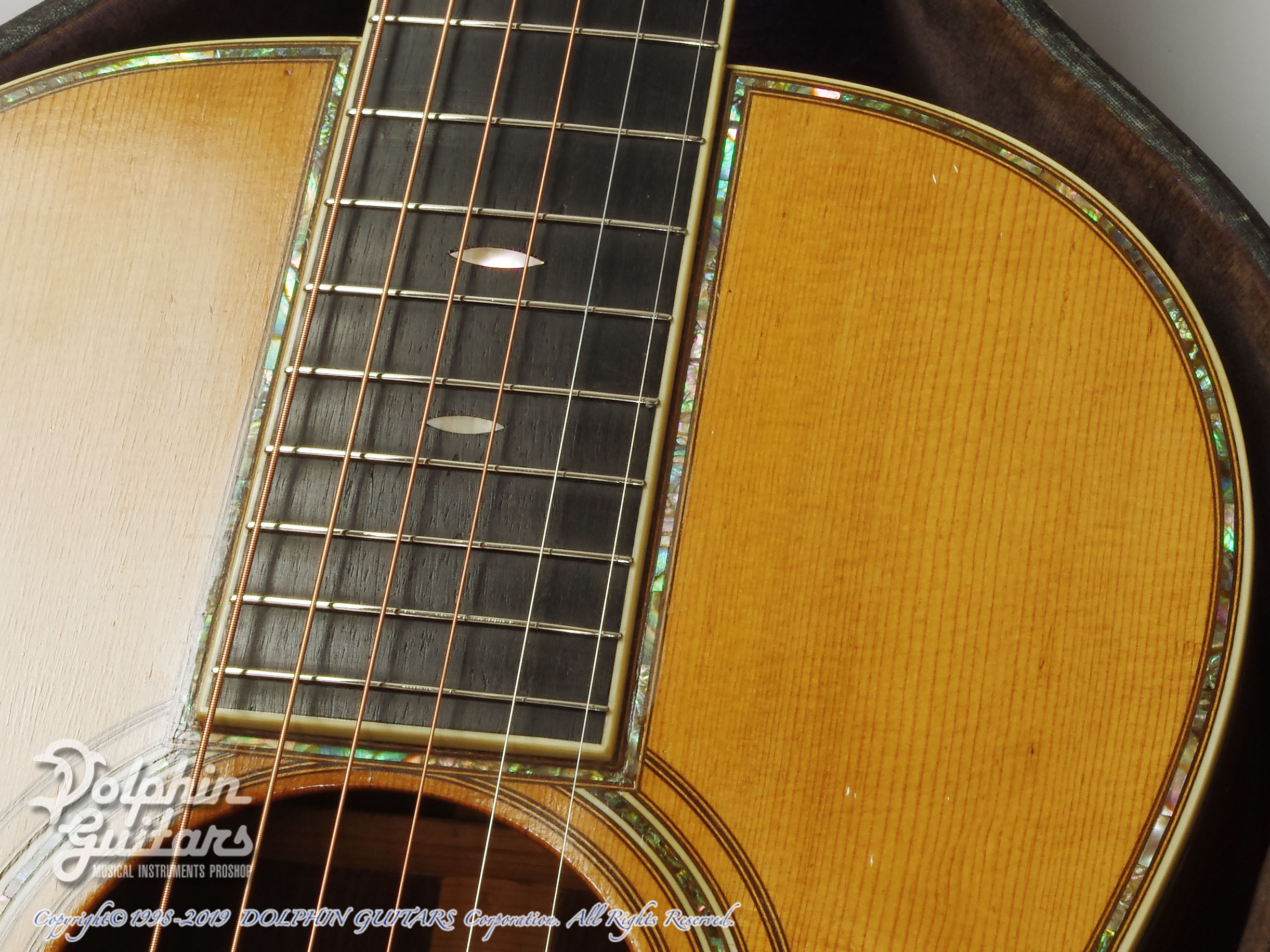 過去にクラック補修やブリッジ交換が施されており、ブリッジ材はハカランダにて製作されてます。この時代ではピックガードなしが標準でしたが、本器は後付けでピックガードが貼られた跡が見られます。