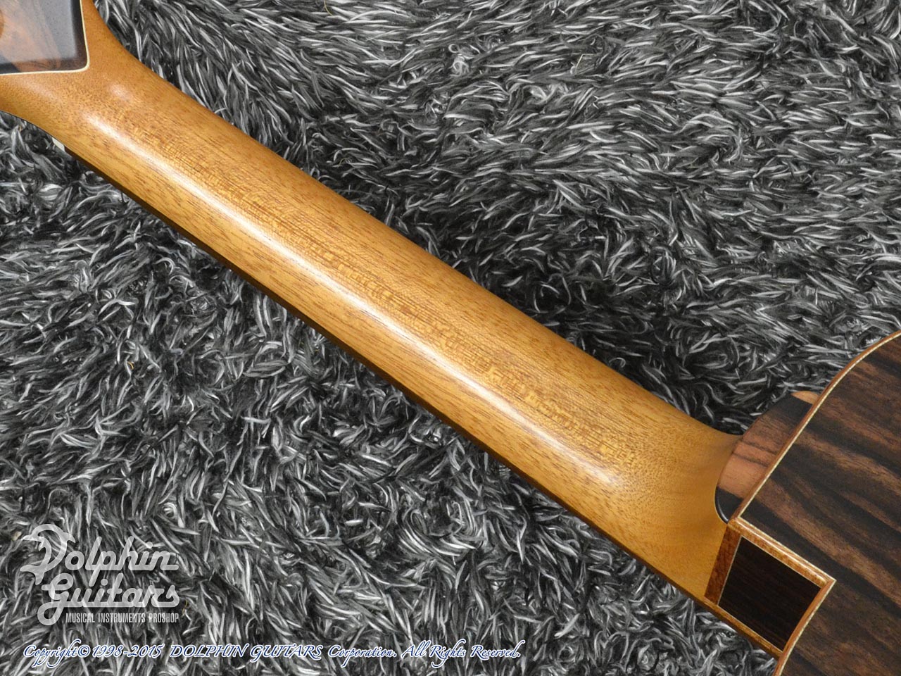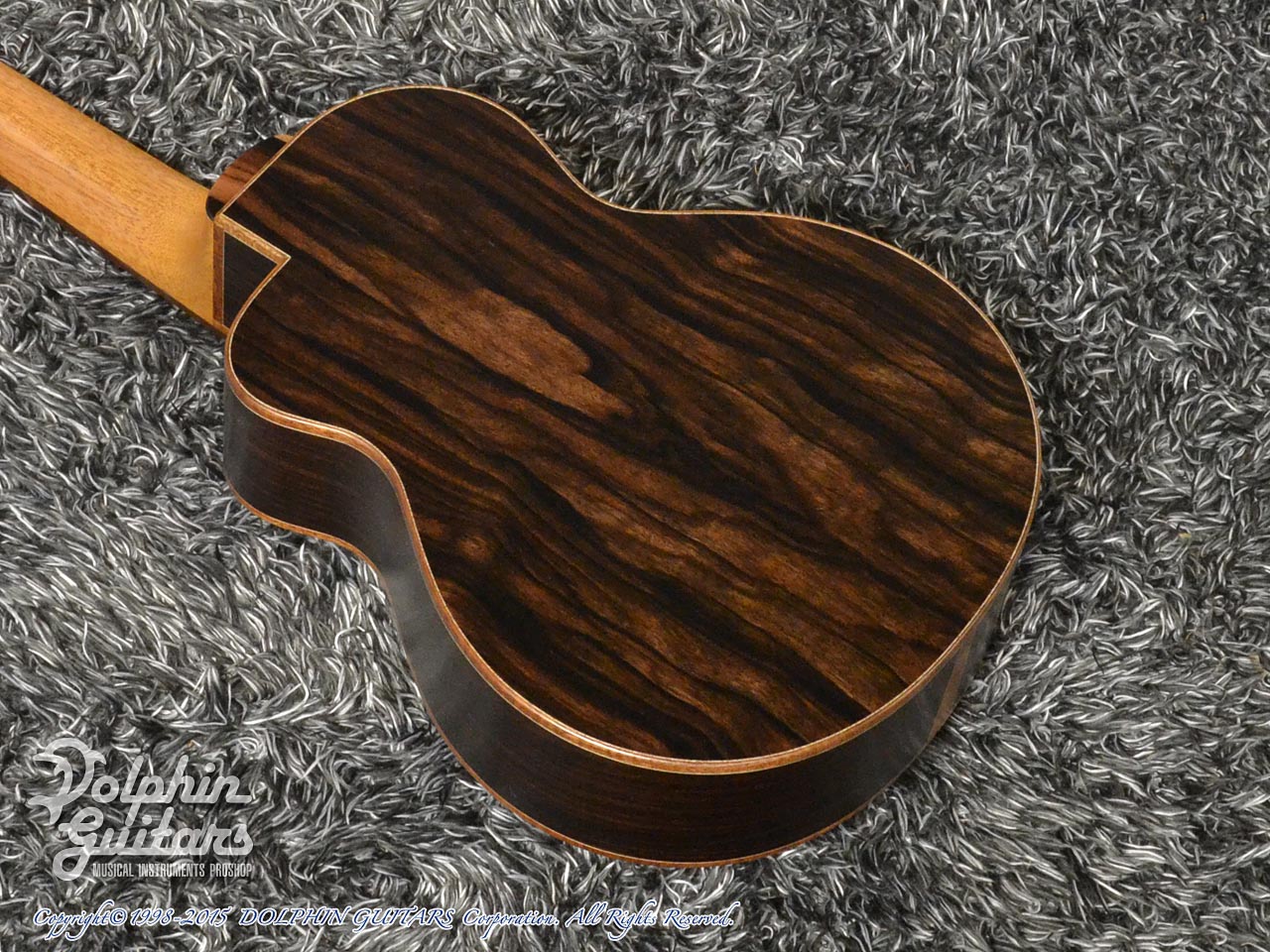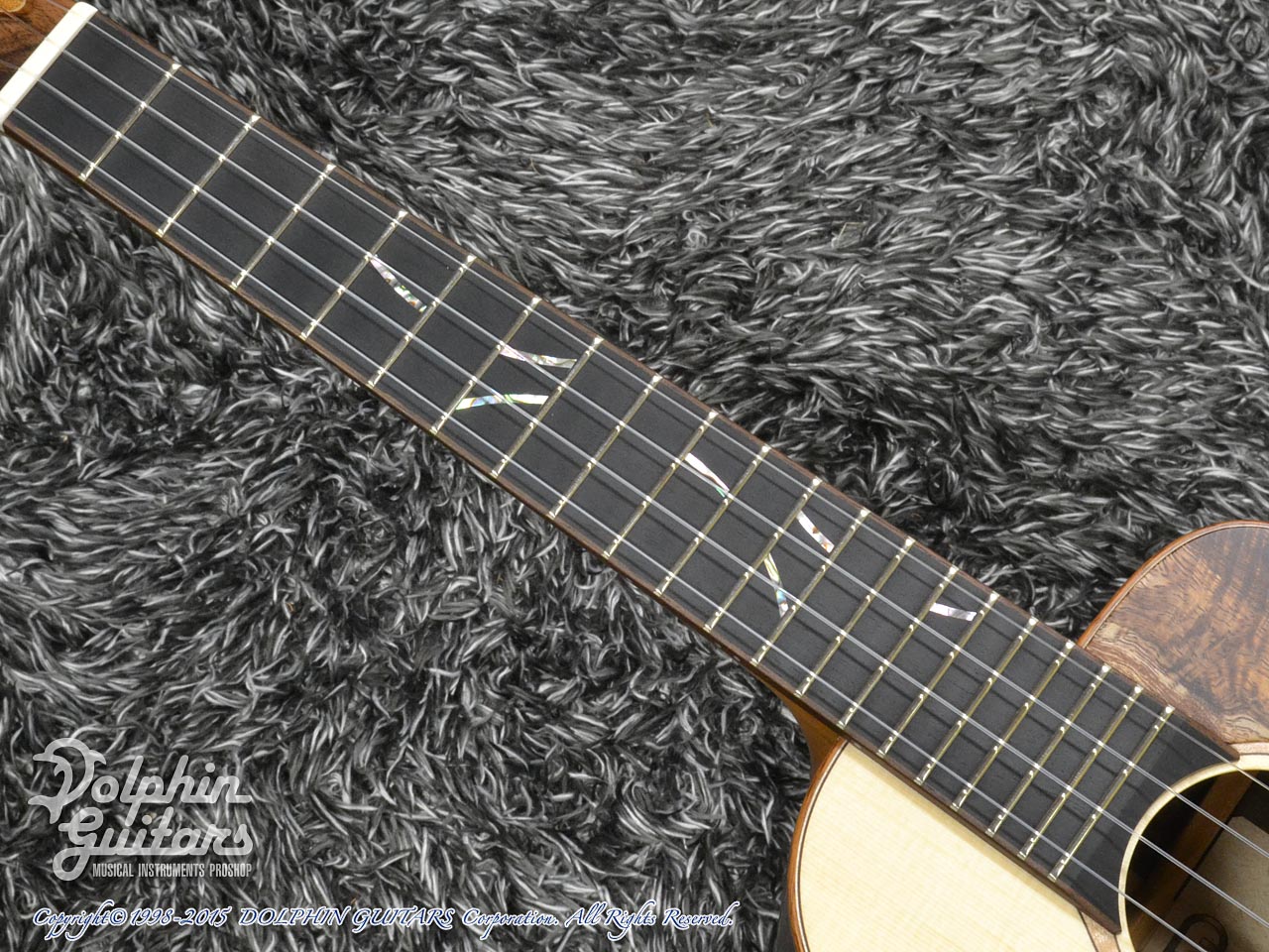 イングルマン・スプルーストップ、マッカーサー・エボニー・サイド&バック、マホガニー1ピースネック、エボニー指板、スロッテッドヘッド、ゴトー製オープンバック糸巻き仕様。