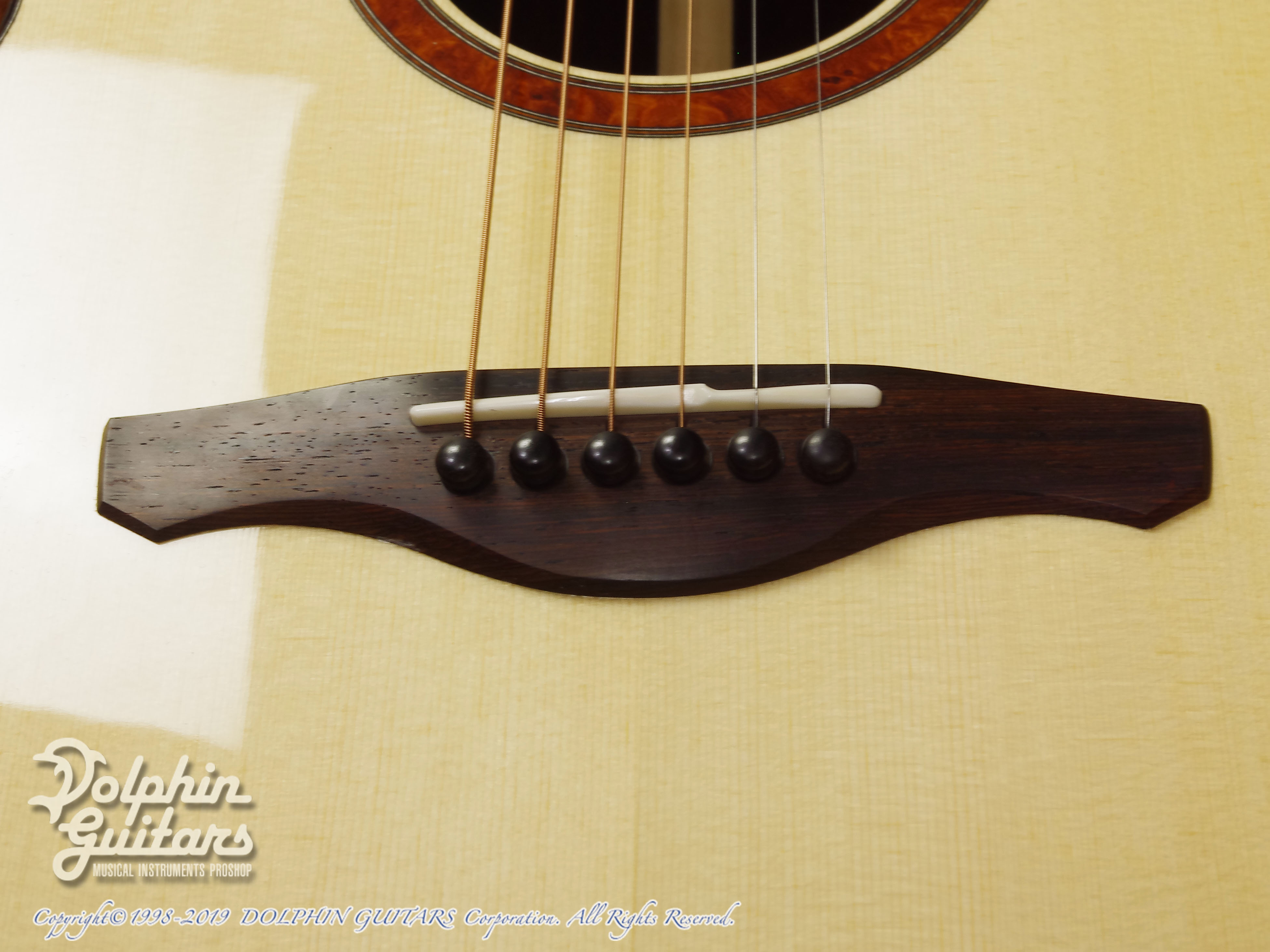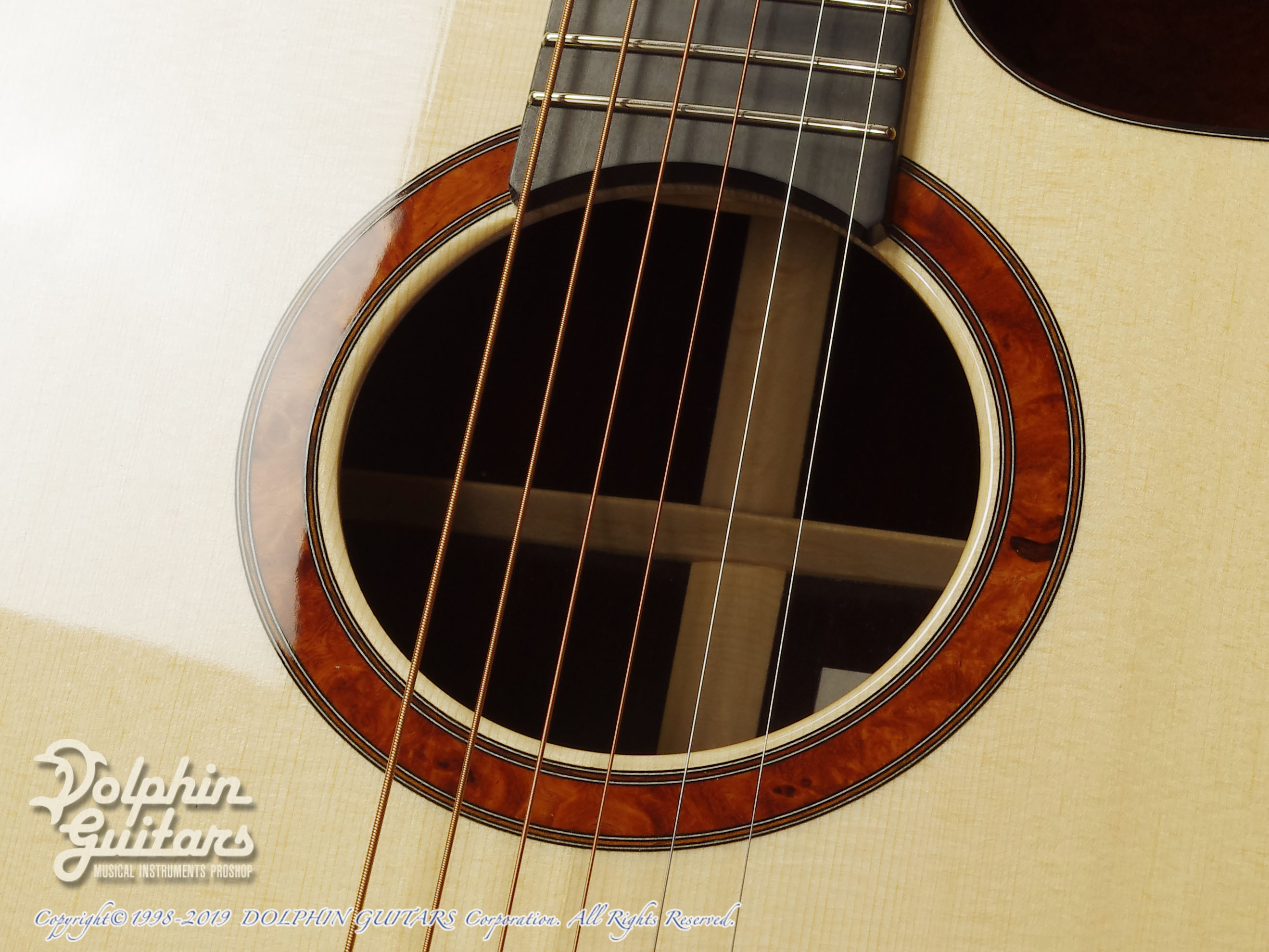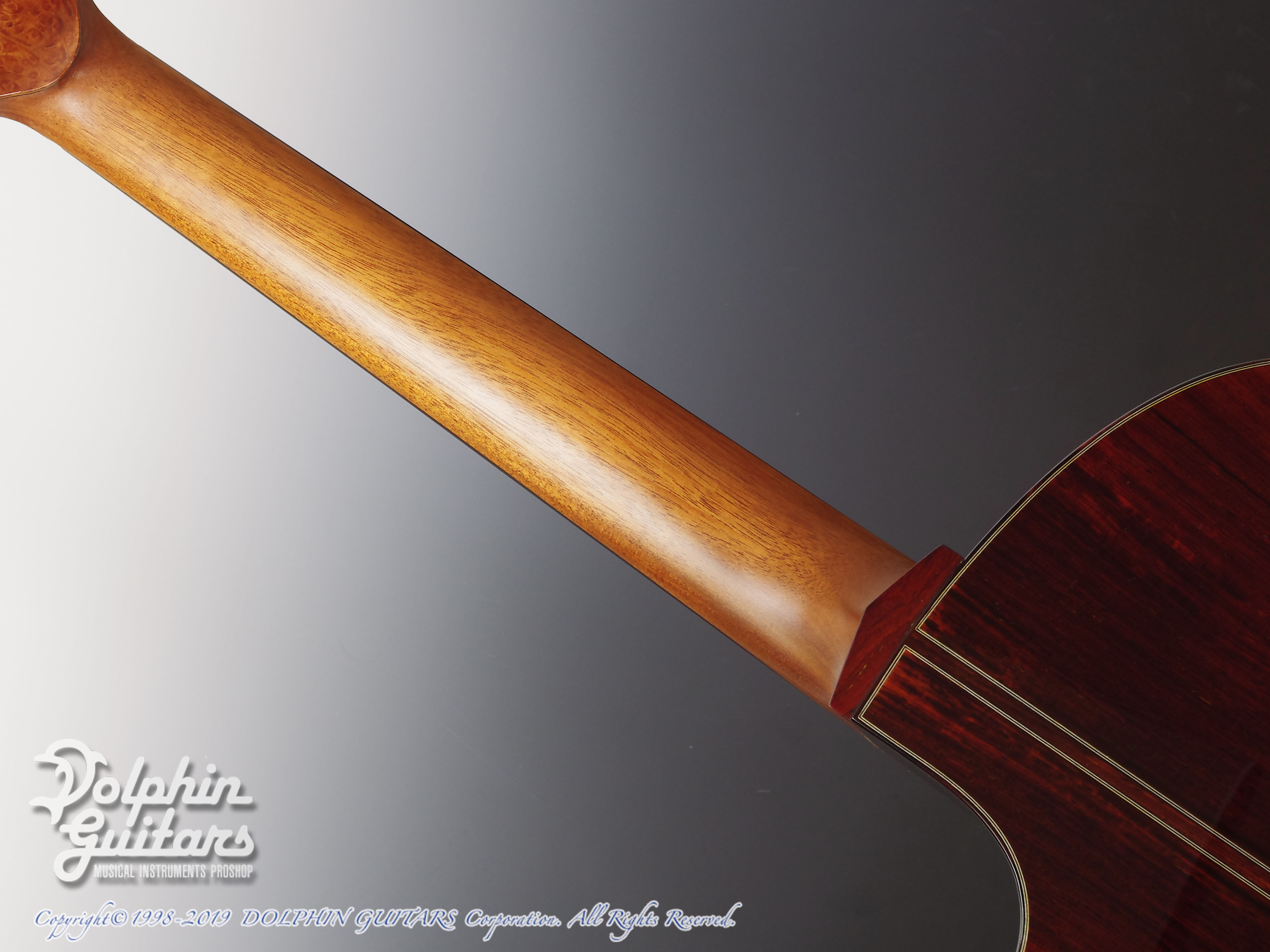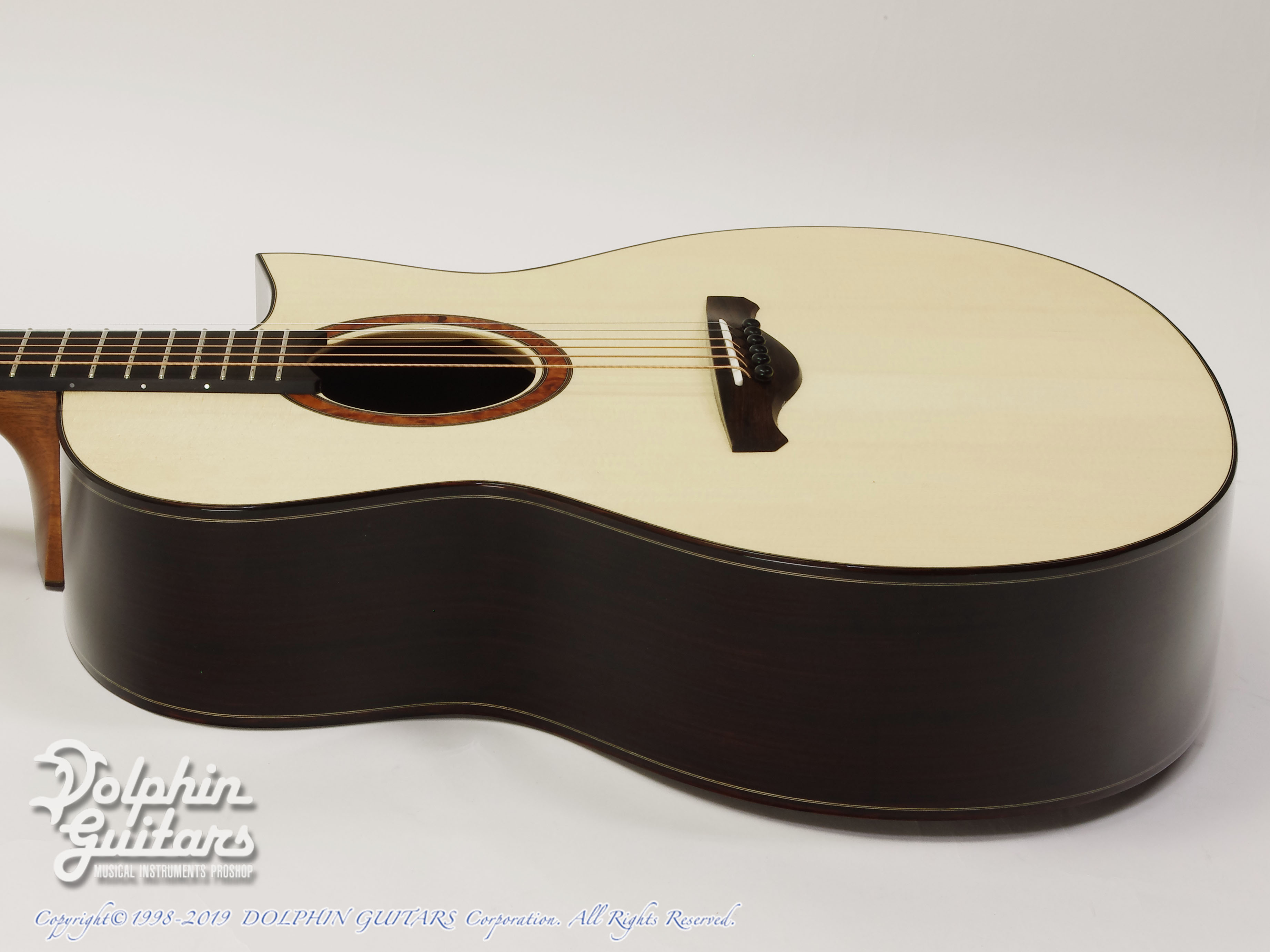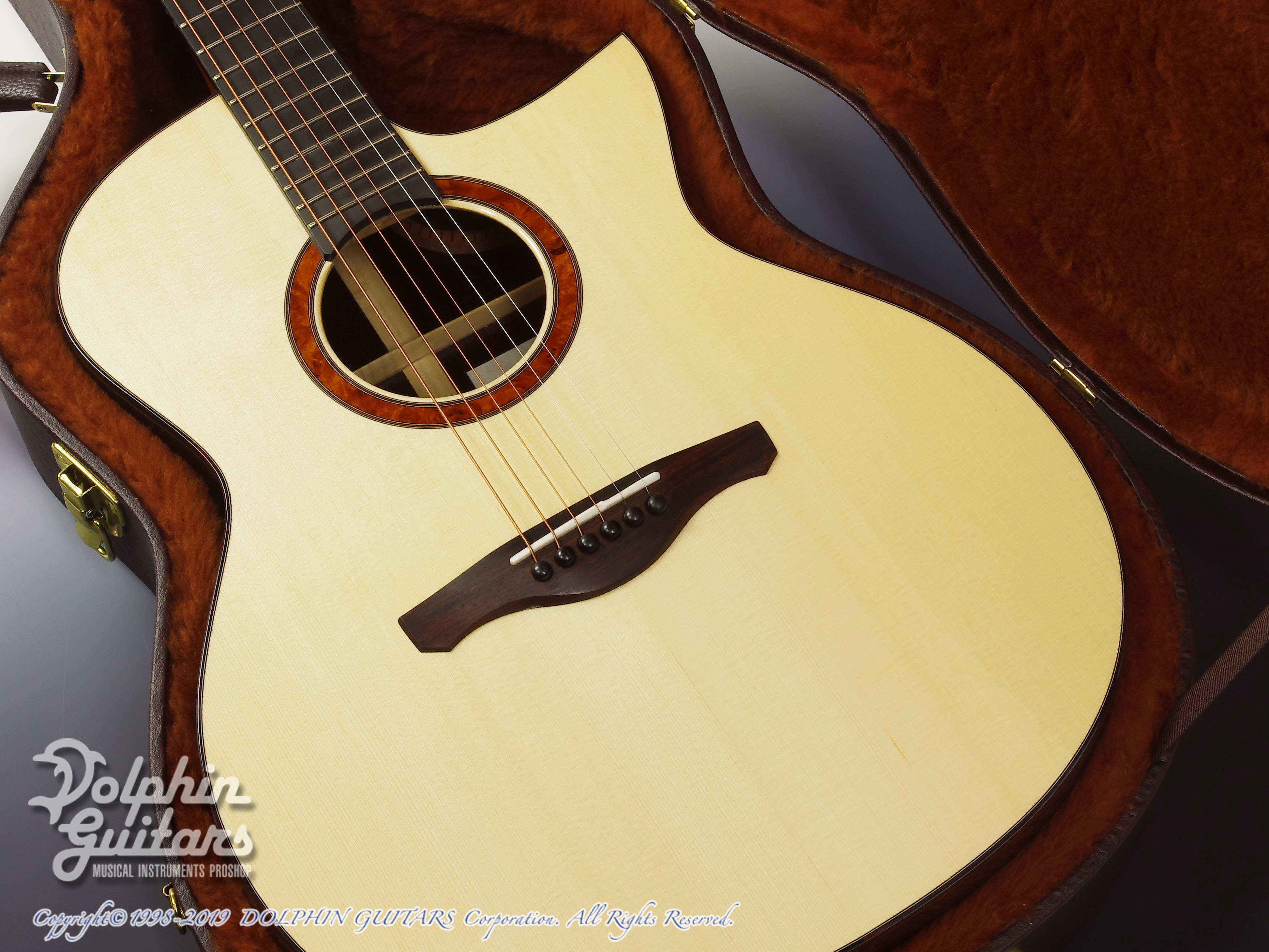ジャーマン・スプルーストップ、ココボロS&B(マスターグレード)、マホガニーネック、エボニー指板、アンボイナバール・ロゼッタ、ココボロ・ウッドバインディング、フローレンタイン・カッタウェイ、44mmナット、630mmスケール、Gotoh510ペグ。