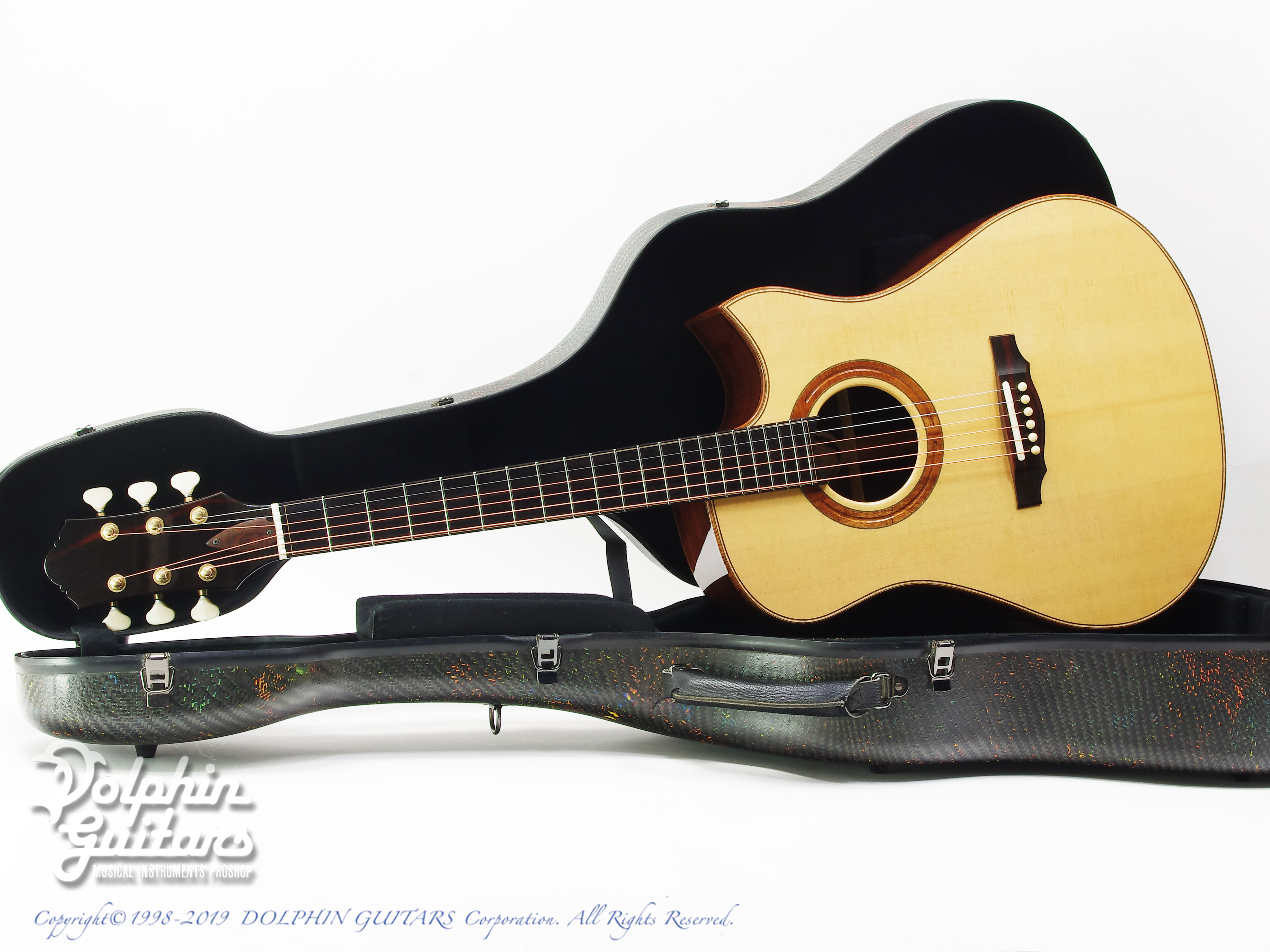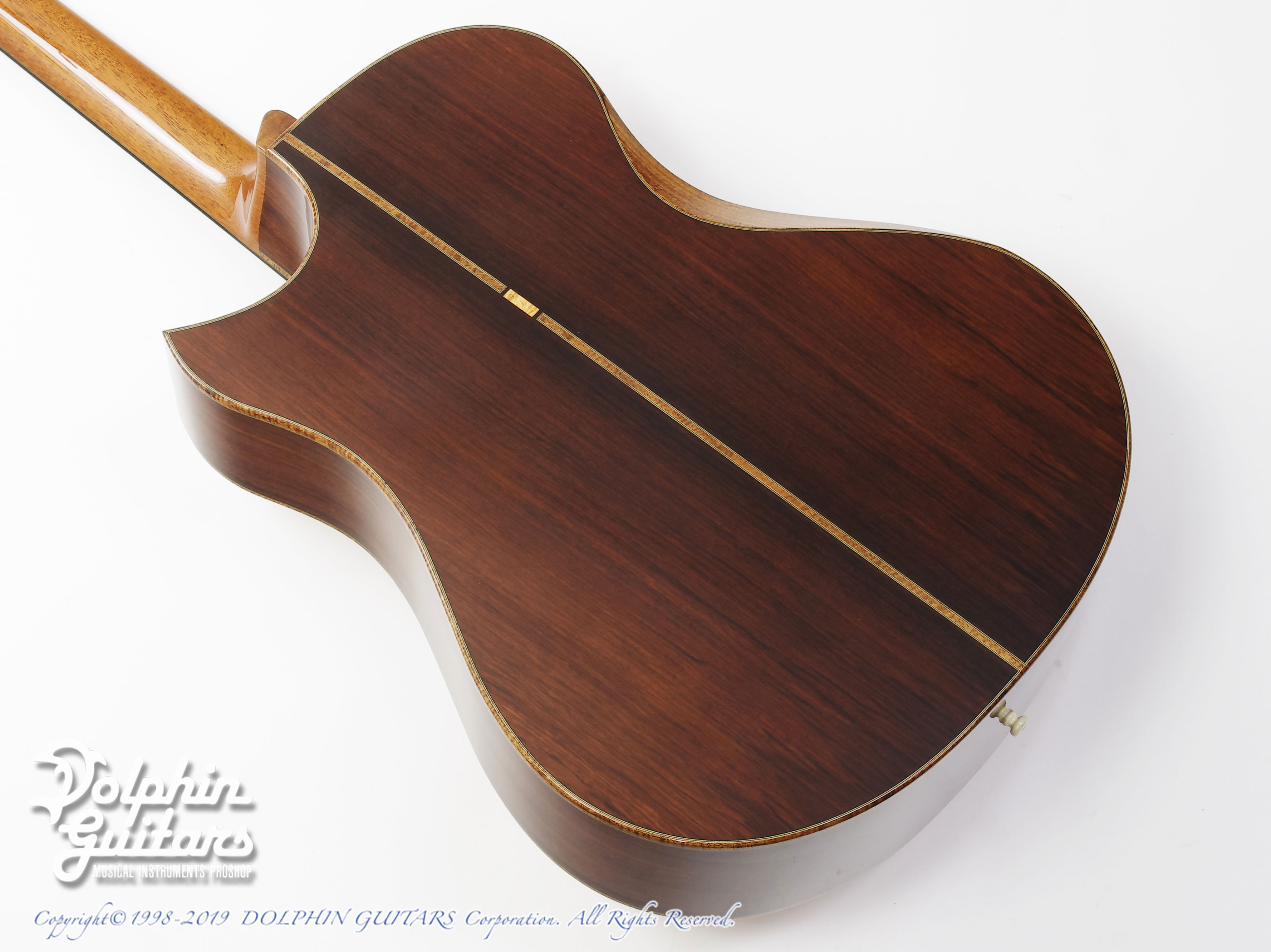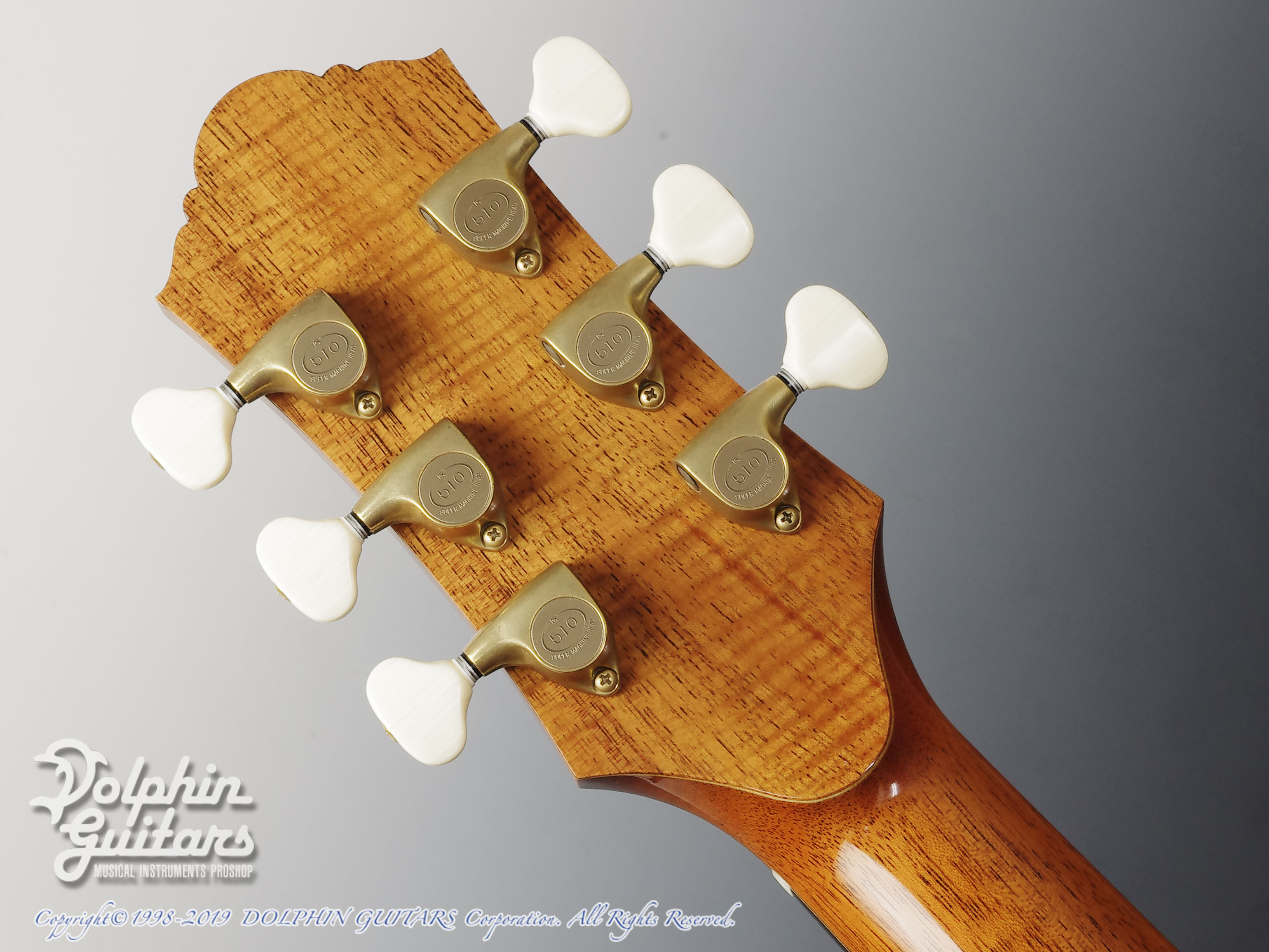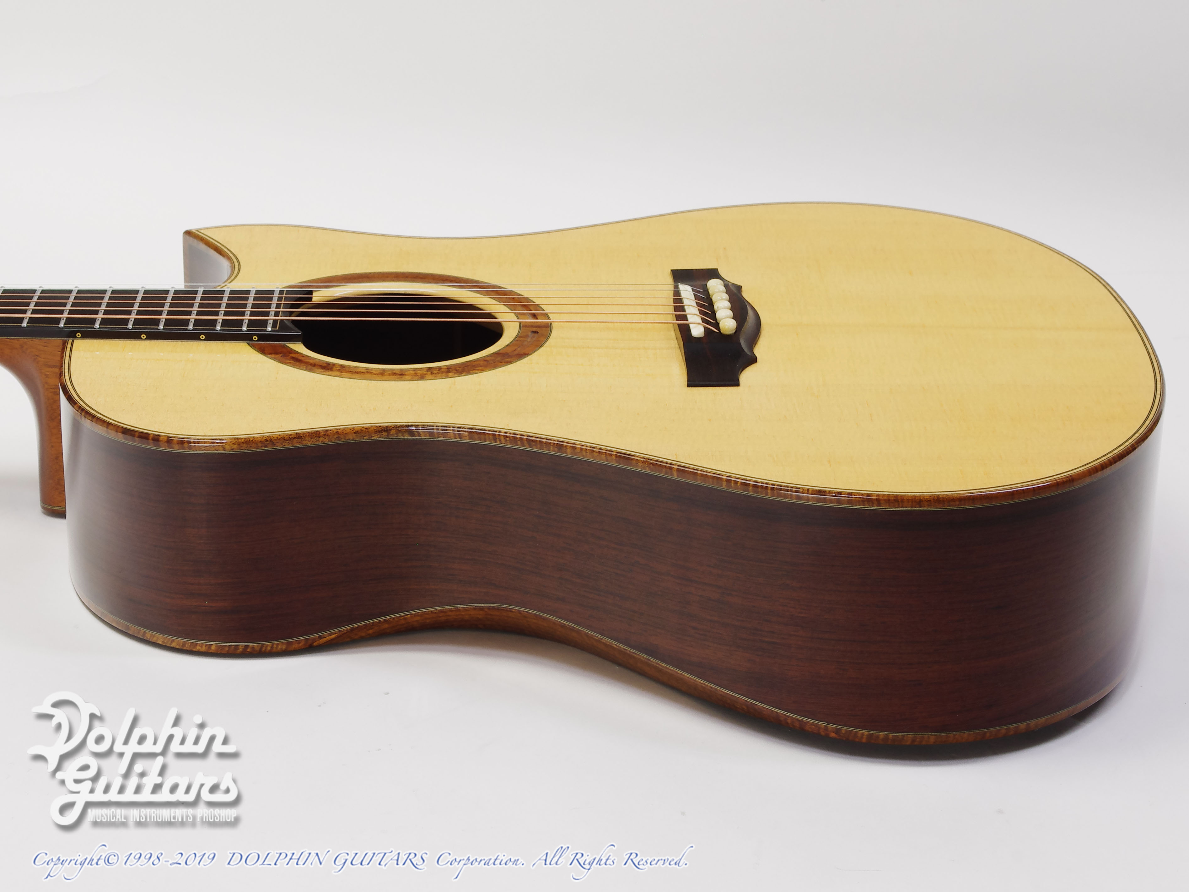 コーカシアン・スプルーストップ(*ロシア南部コーカサス地方原産の木材)、マダガスカル・ローズウッドS&B、ホンデュラス・マホガニー1ピースネック、ブラジリアン・ローズ指板&ブリッジ、バックコンター加工(リブレスト)、カーリーコアバインディング、オリジナルウッドロゼッタ、ステンレスフレット、フローレンタイン3Dカッタウェイ、Gotoh510ペグ仕様。