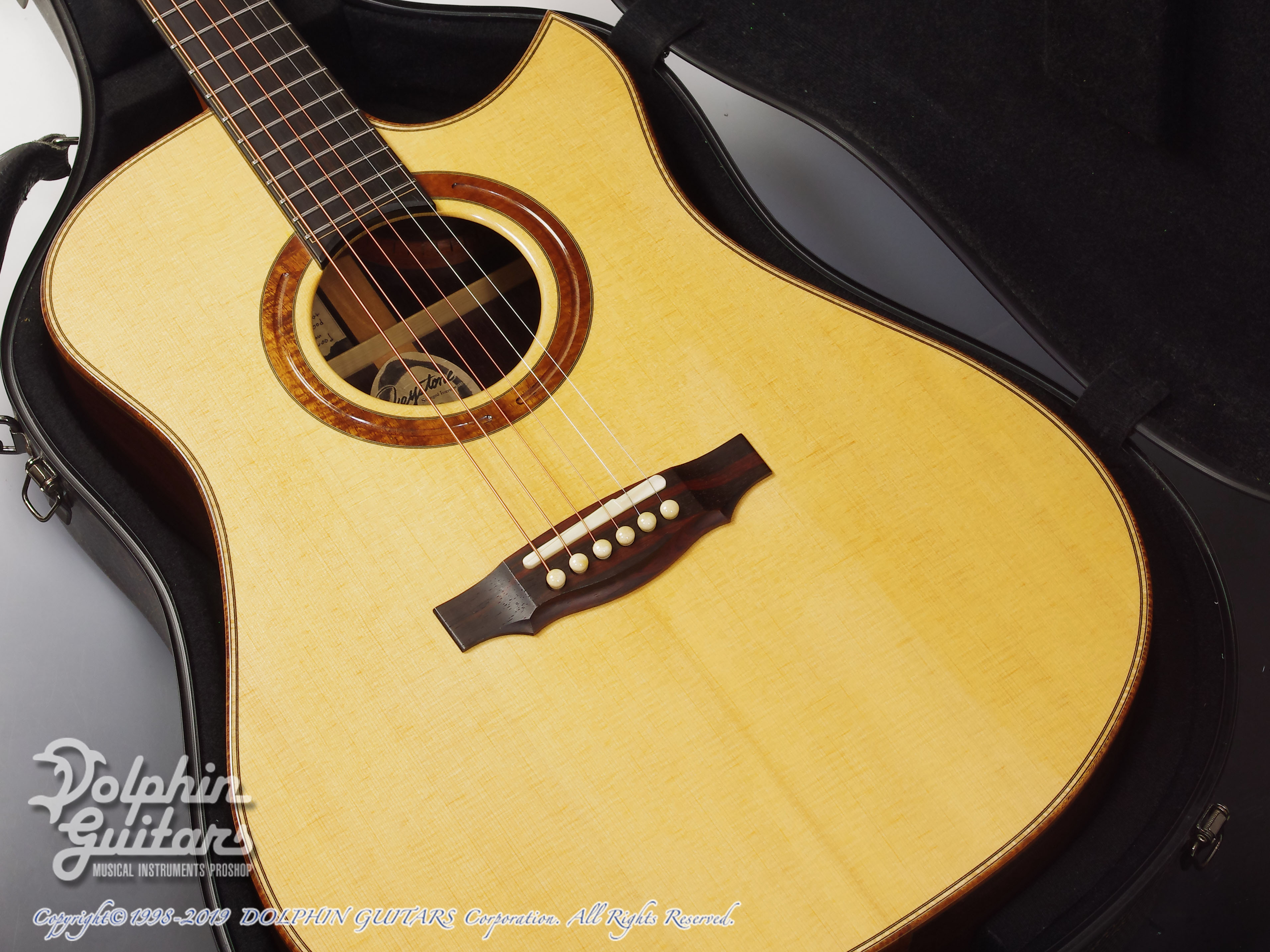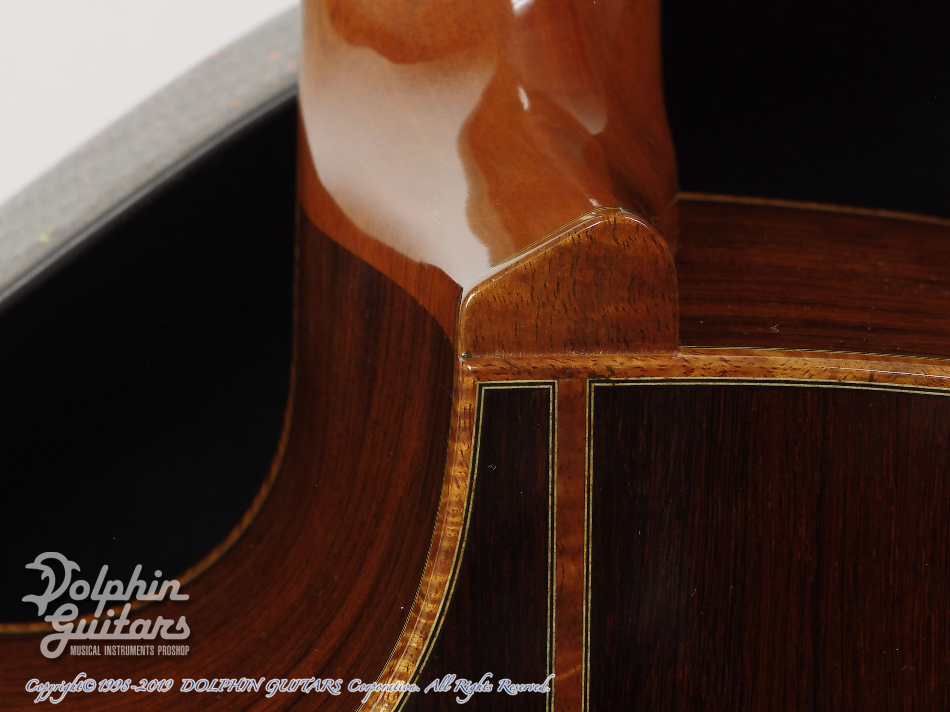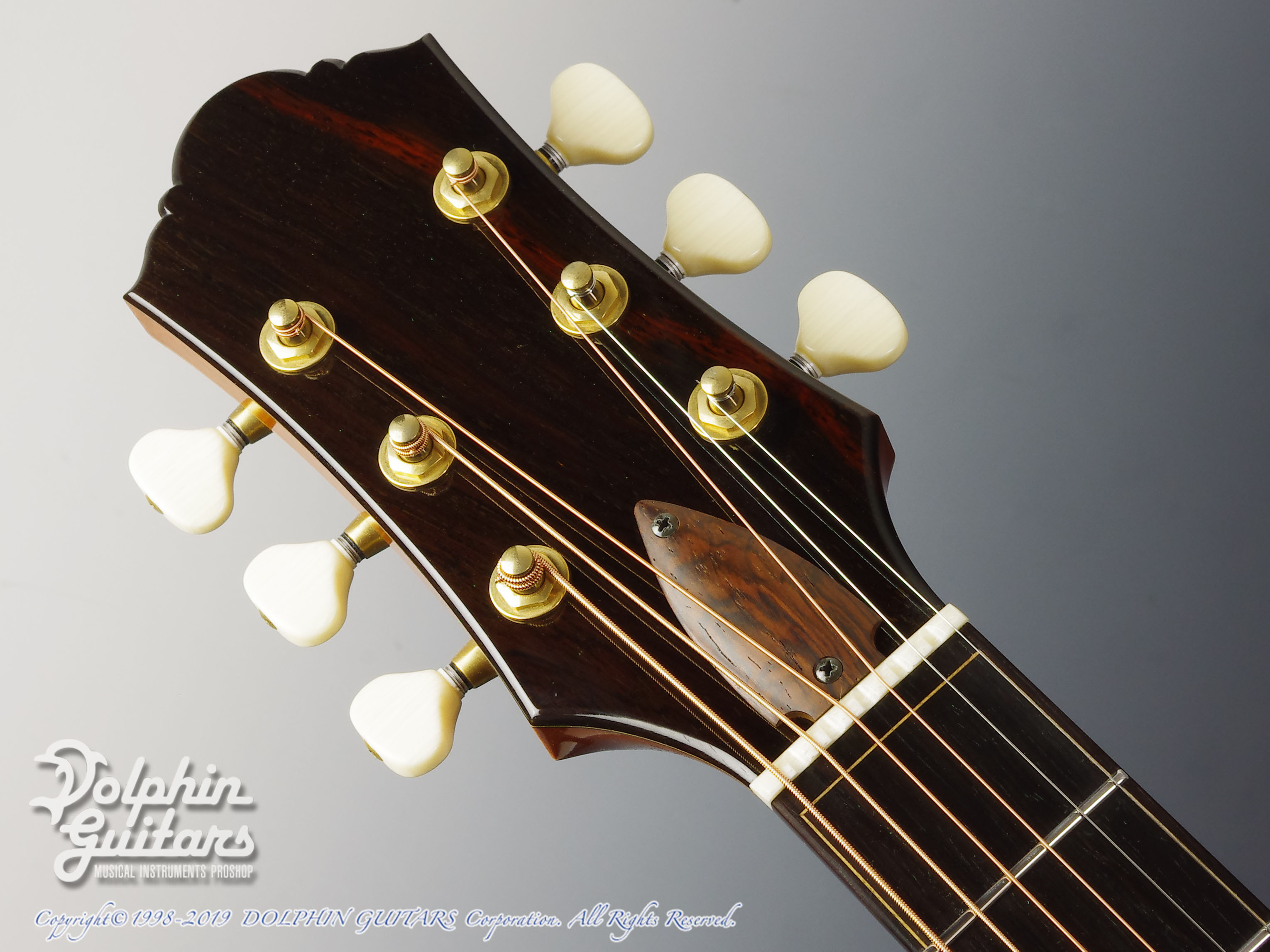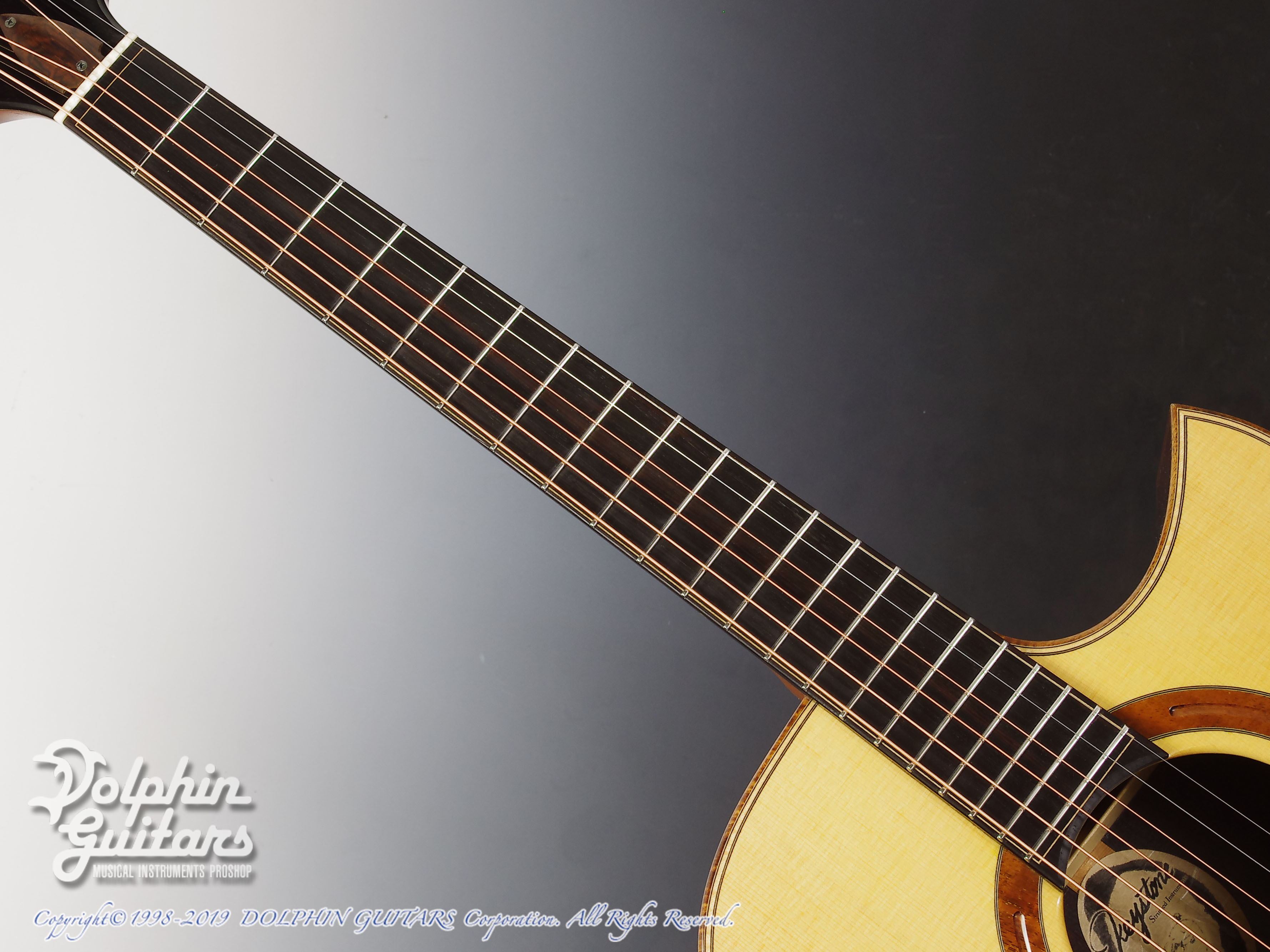 コーカシアン・スプルーストップ(*ロシア南部コーカサス地方原産の木材)、マダガスカル・ローズウッドS&B、ホンデュラス・マホガニー1ピースネック、ブラジリアン・ローズ指板&ブリッジ、バックコンター加工(リブレスト)、カーリーコアバインディング、オリジナルウッドロゼッタ、ステンレスフレット、フローレンタイン3Dカッタウェイ、Gotoh510ペグ仕様。