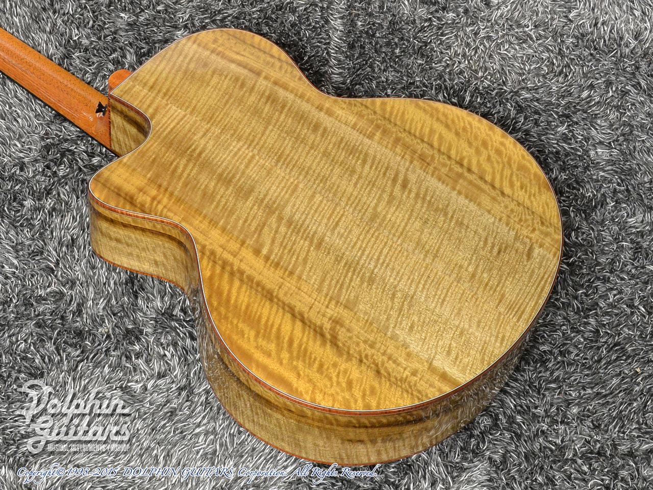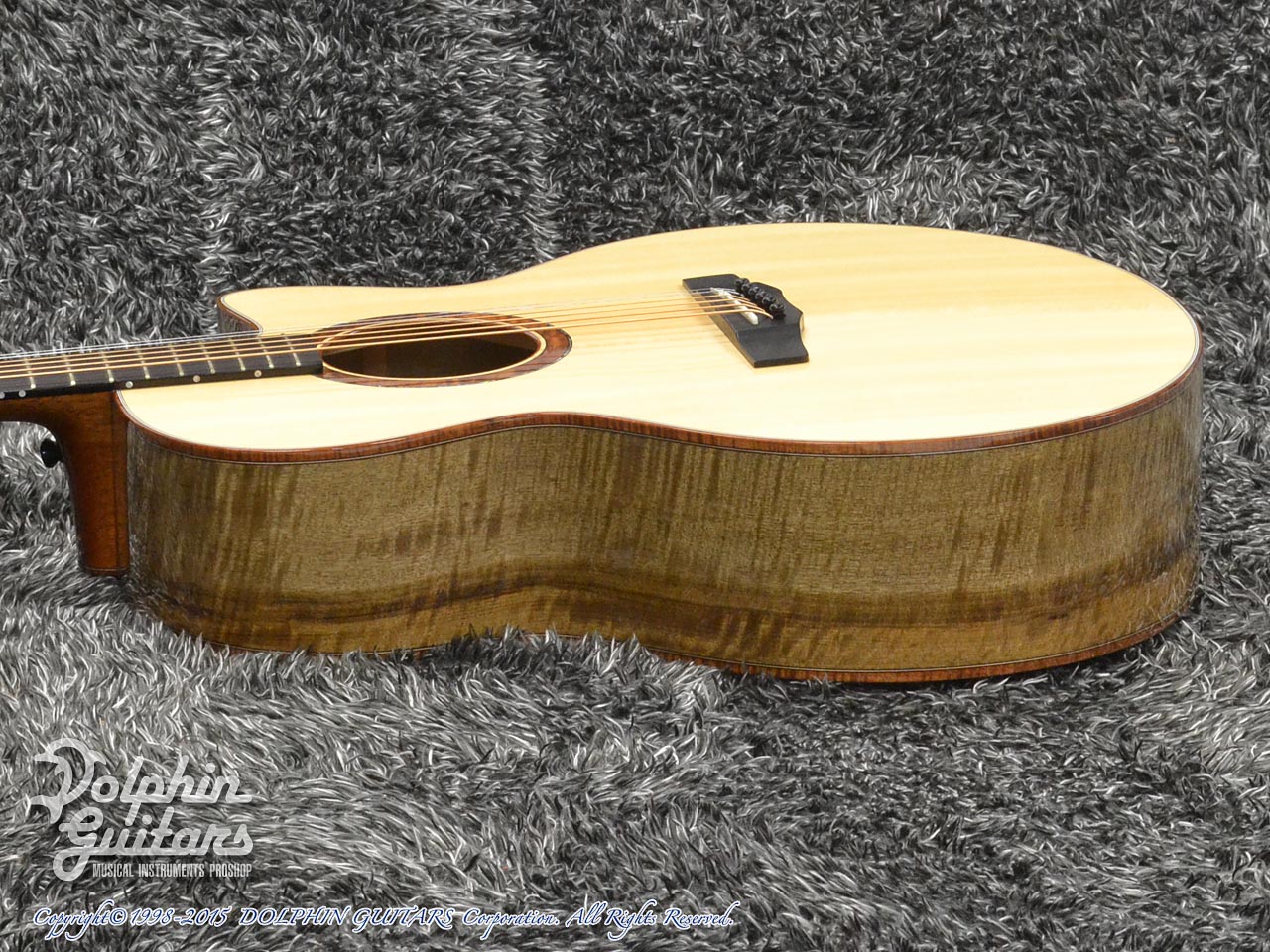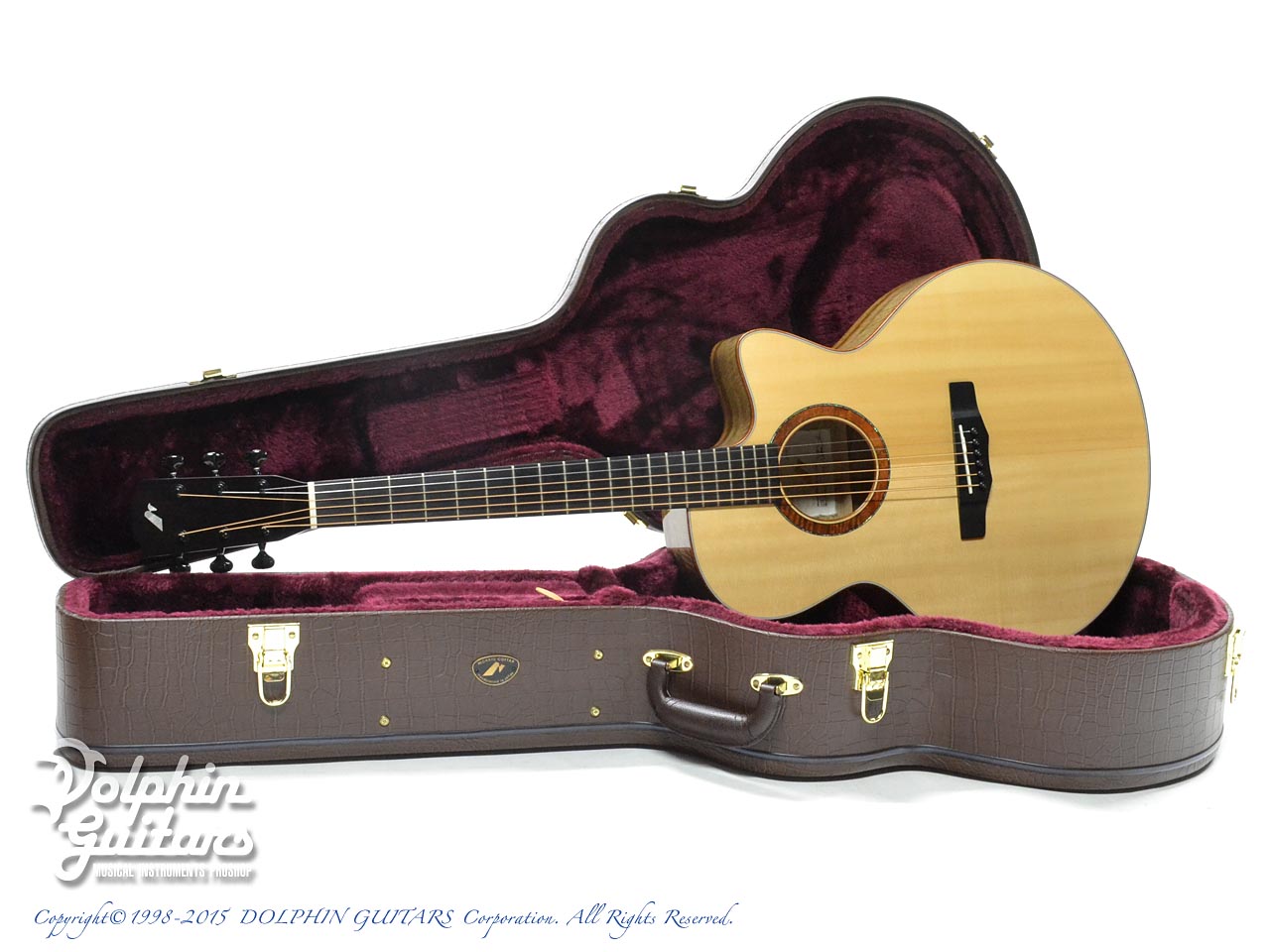 迫力のサウンドとボディラインの美しさで人気のSJ (スモールジャンボ)シェイプに、ドイツ南アルプスで買い付けたジャーマン・スプルース・トップを使用、サイド&バックは極上の杢が出たFigured Myrtlewood仕様となっております。ヴェネチアンカッタウェイもSJシェイプではほとんど製作されていない希少スペックです。