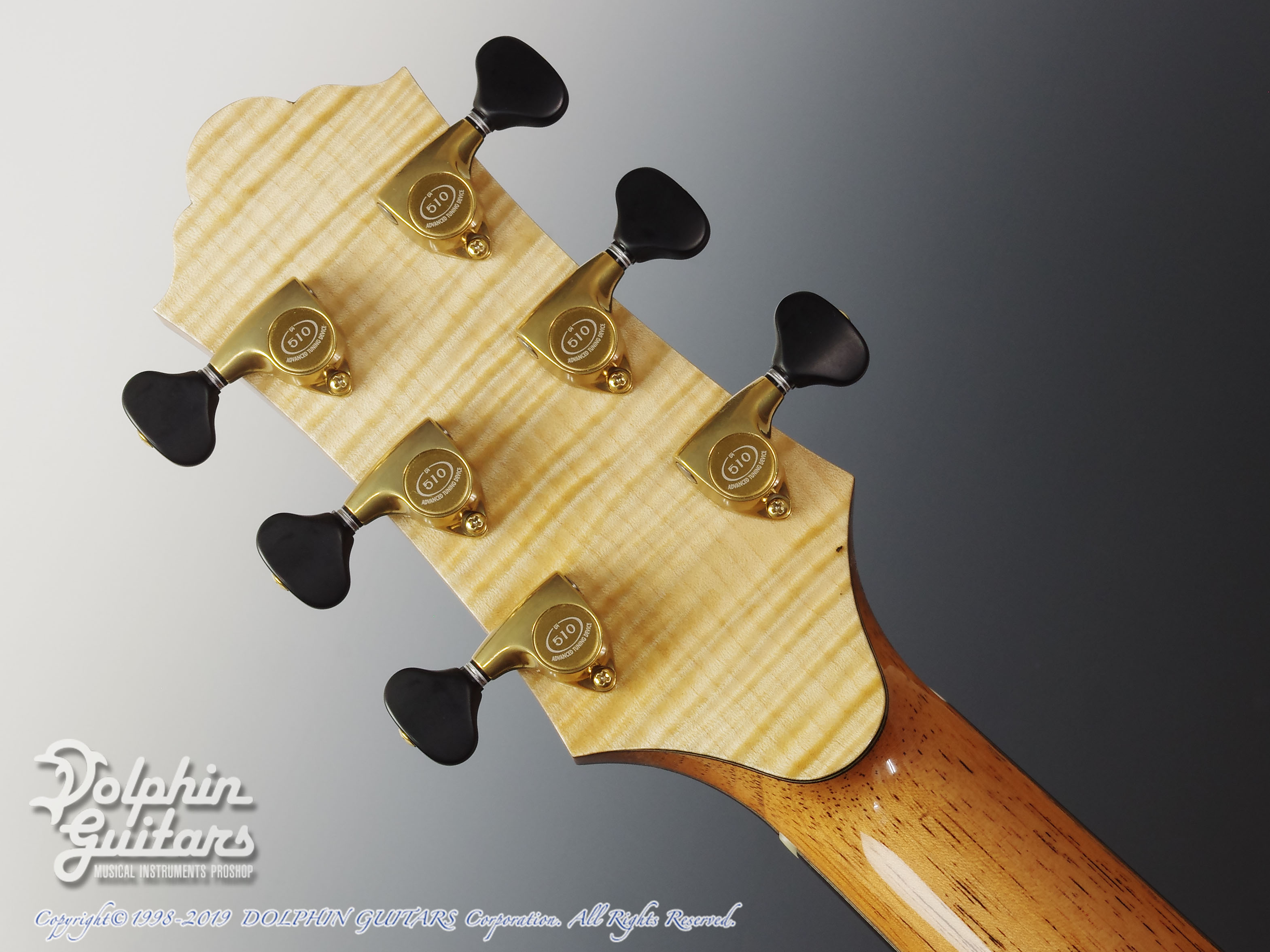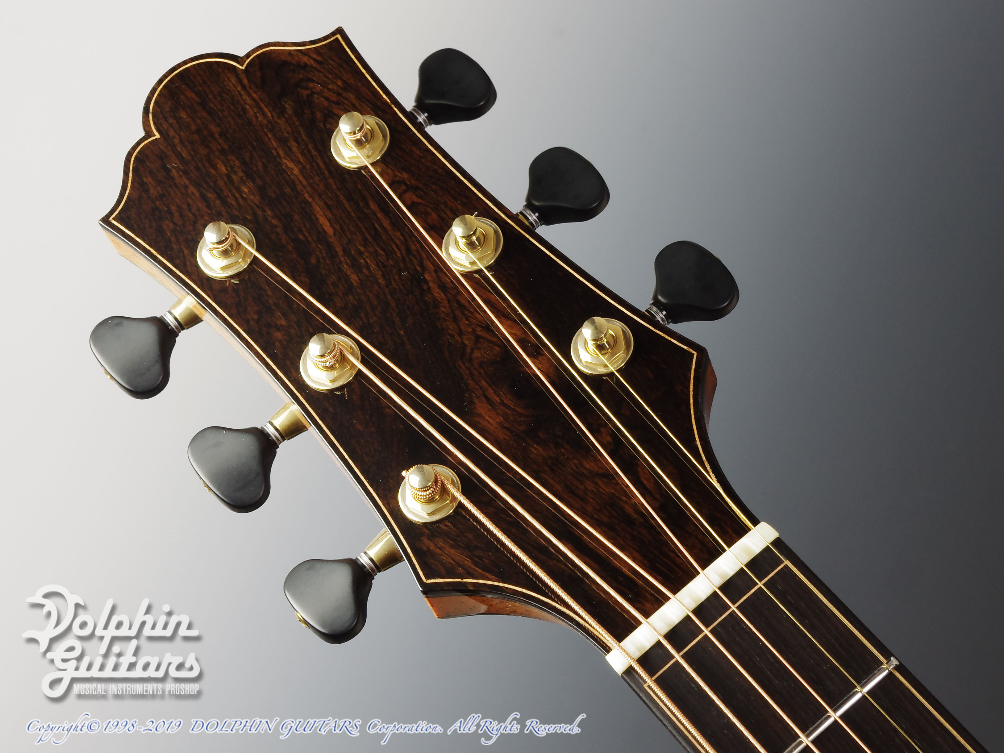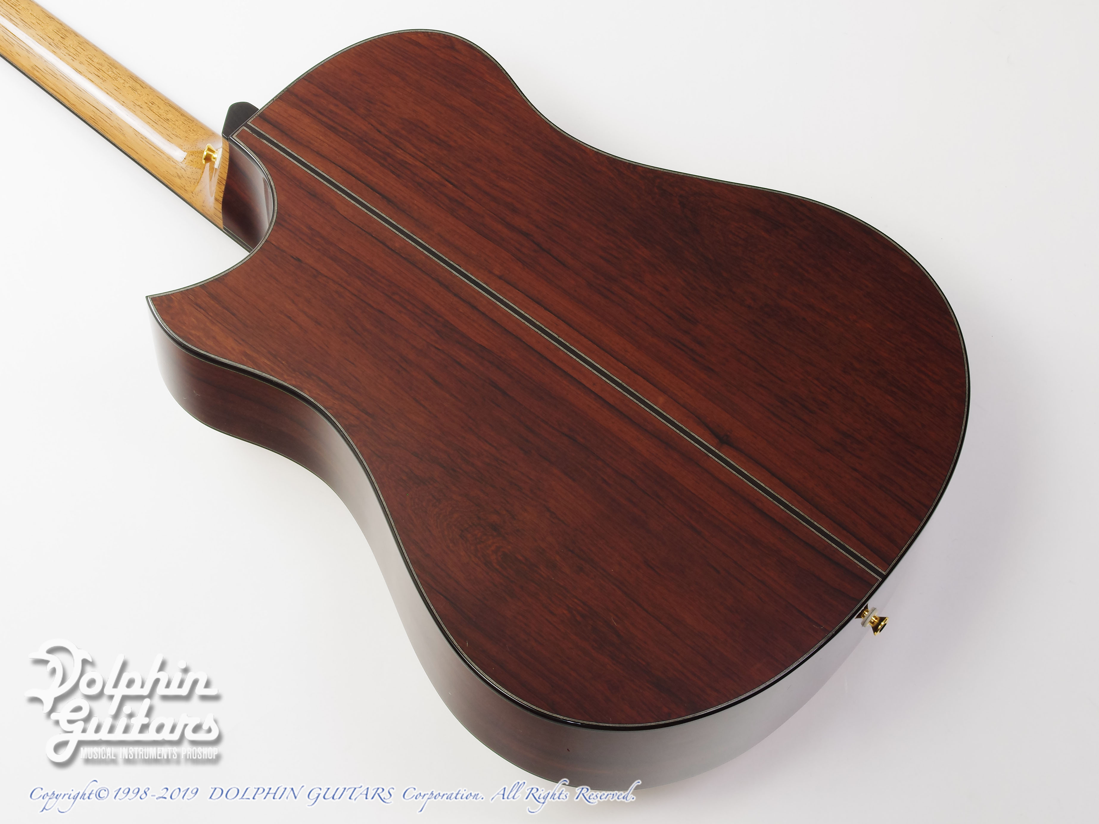 アディロンダック・スプルーストップ、マダガスカル・ローズウッドS&B、スパニッシュシダー1ピースネック、アフリカンブラックウッド指板、マダガスカル・ローズブリッジ、ブラックウッドバインディング、オリジナルウッドロゼッタ、ステンレスフレット、フローレンタイン3Dカッタウェイ、Gotoh510ペグ仕様。