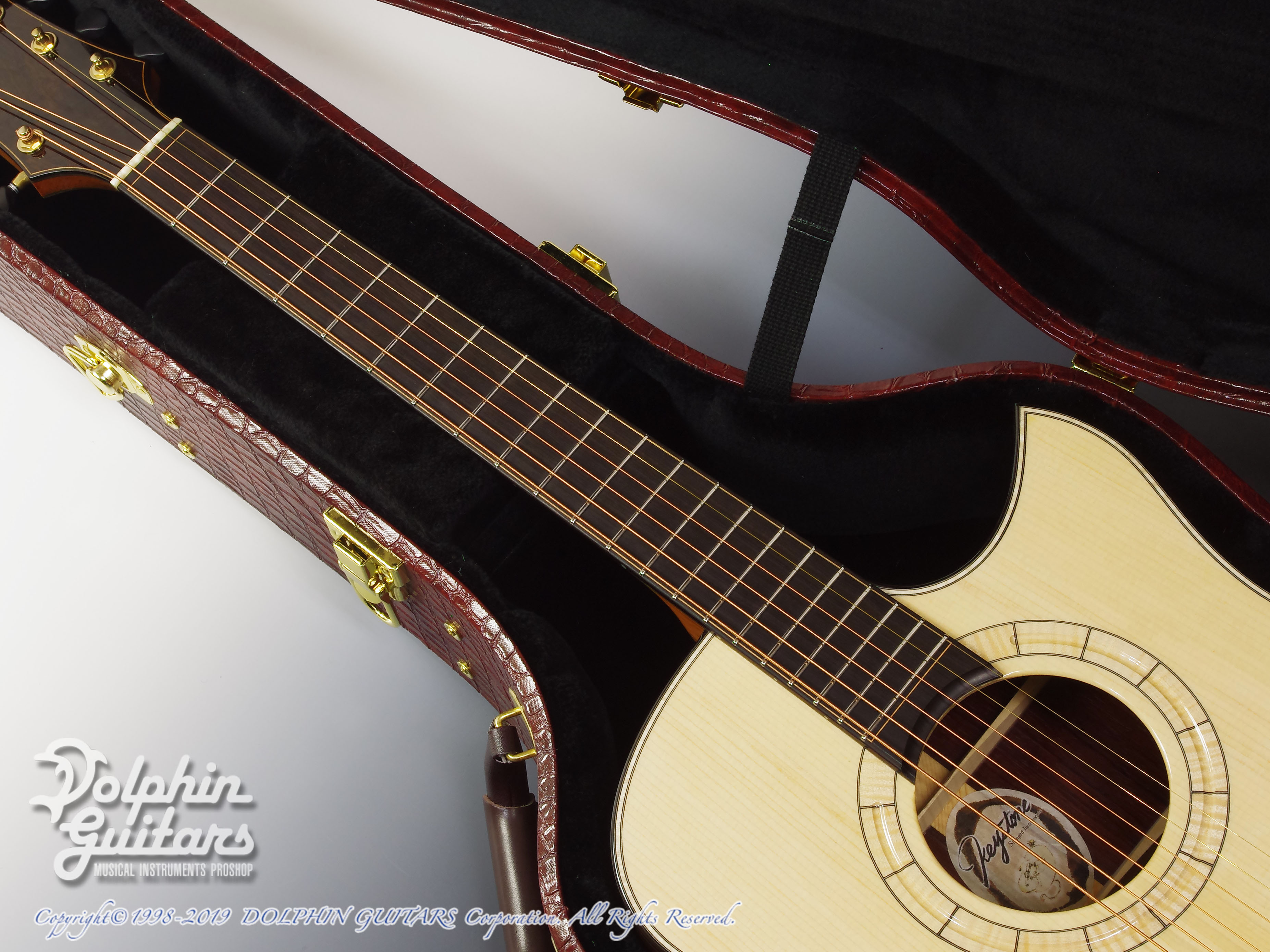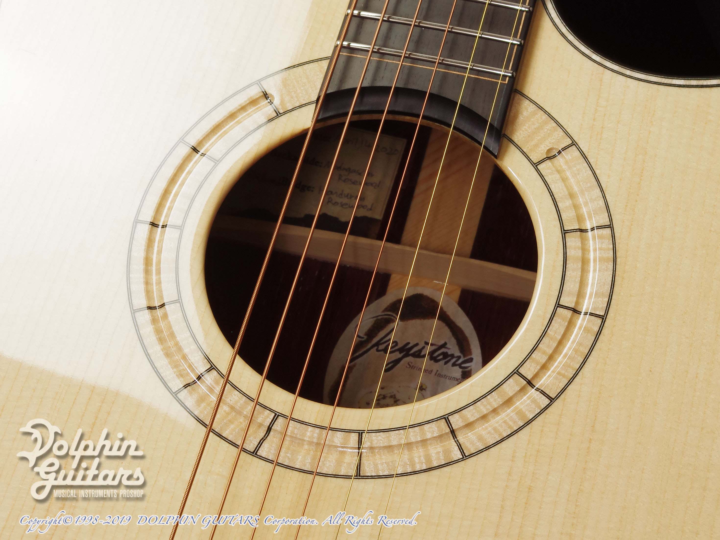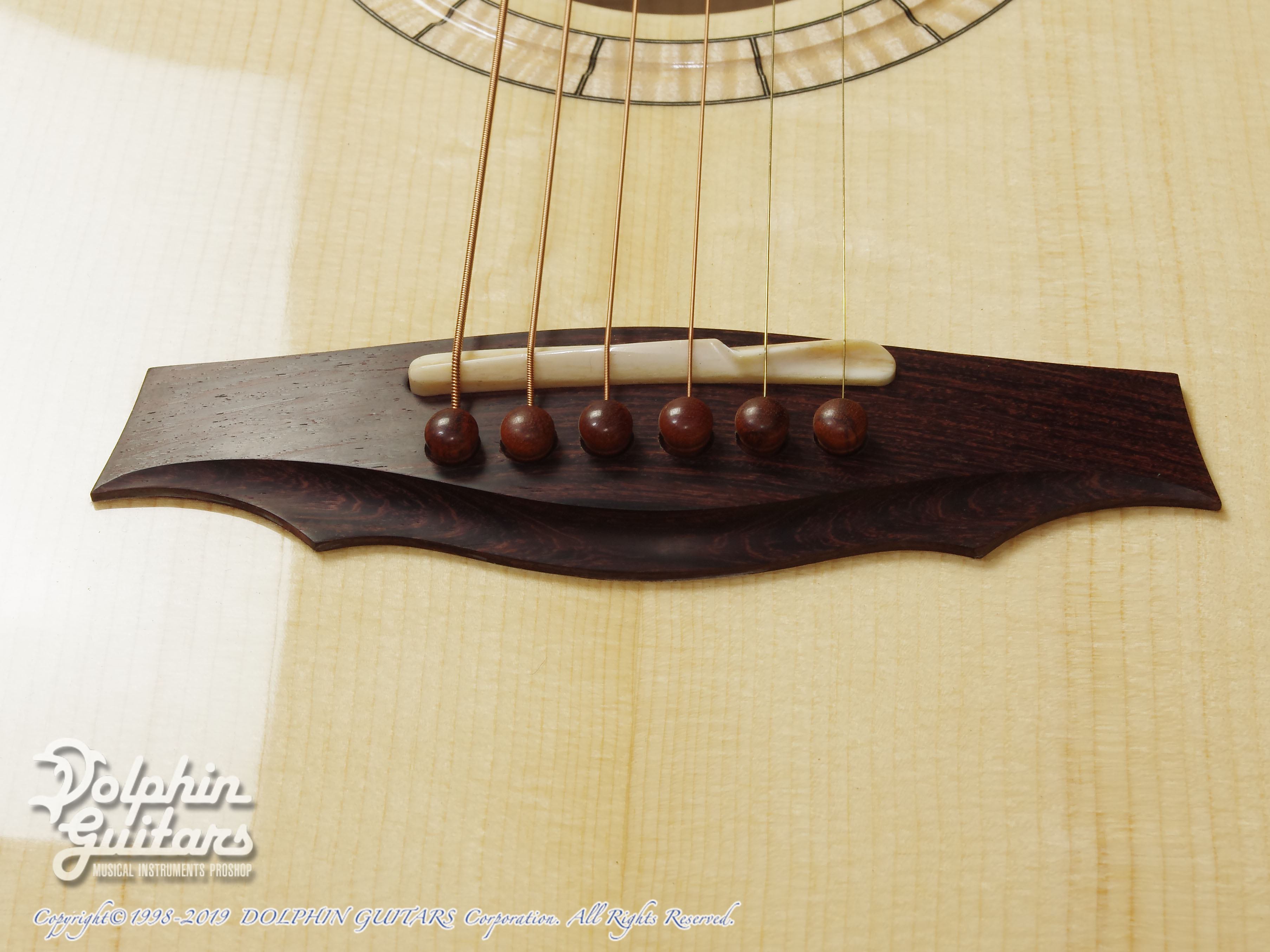 アディロンダック・スプルーストップ、マダガスカル・ローズウッドS&B、スパニッシュシダー1ピースネック、アフリカンブラックウッド指板、マダガスカル・ローズブリッジ、ブラックウッドバインディング、オリジナルウッドロゼッタ、ステンレスフレット、フローレンタイン3Dカッタウェイ、Gotoh510ペグ仕様。