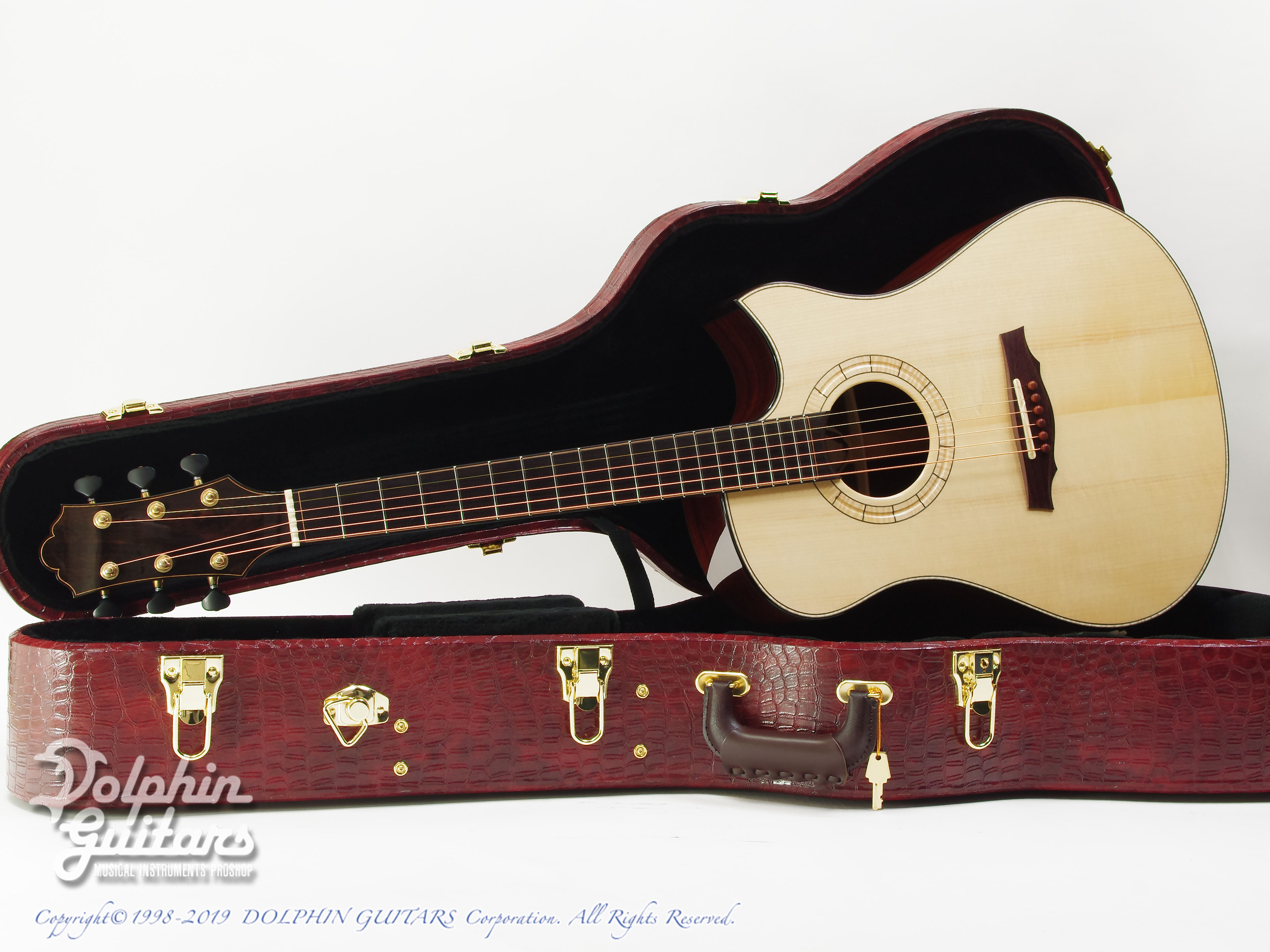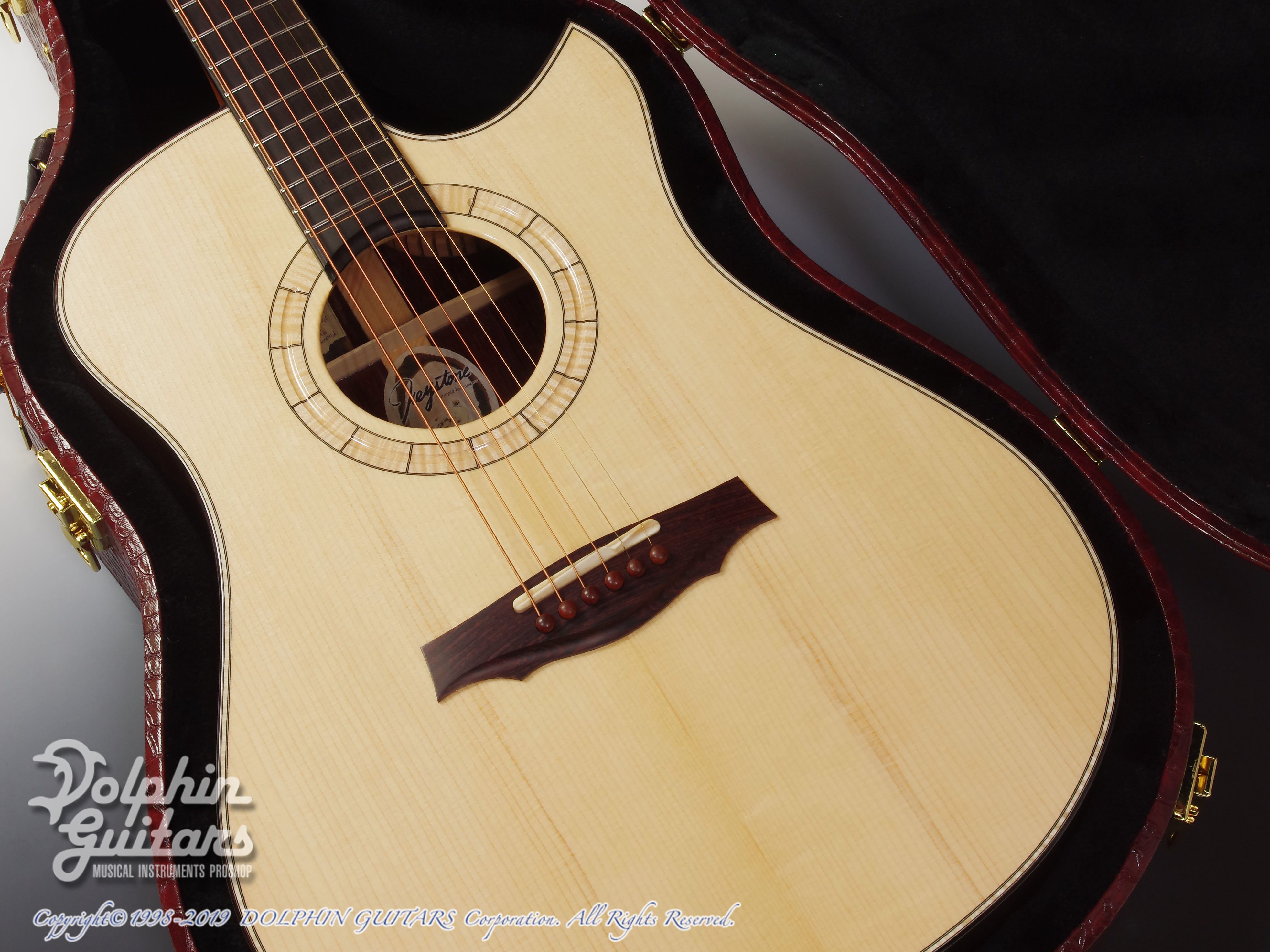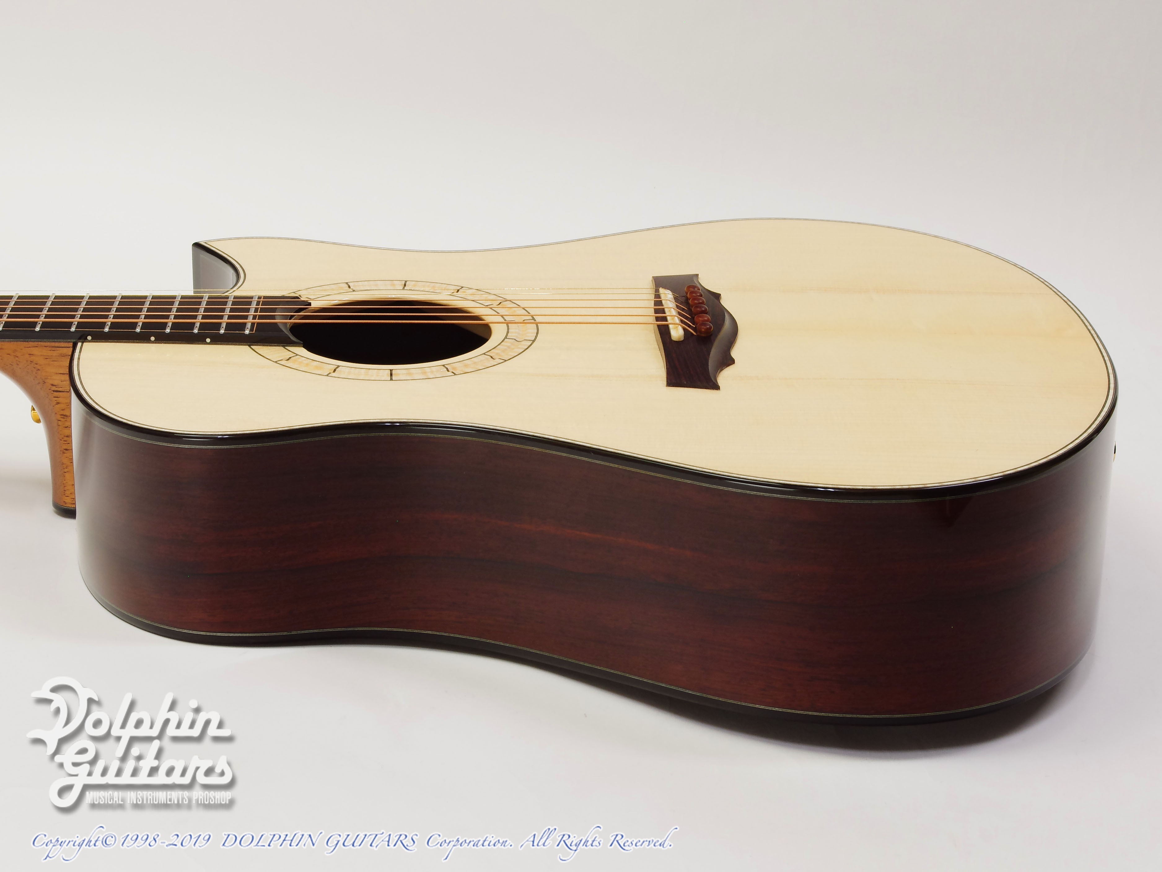 本器はオーソドックスなドレッドノートを一回り小振りにデザインされた"モディファイド・ドレッドノートスタイル"にオリジナルのカッタウェイを施したモデル Mod-D CutawayのCustomer Order Model。