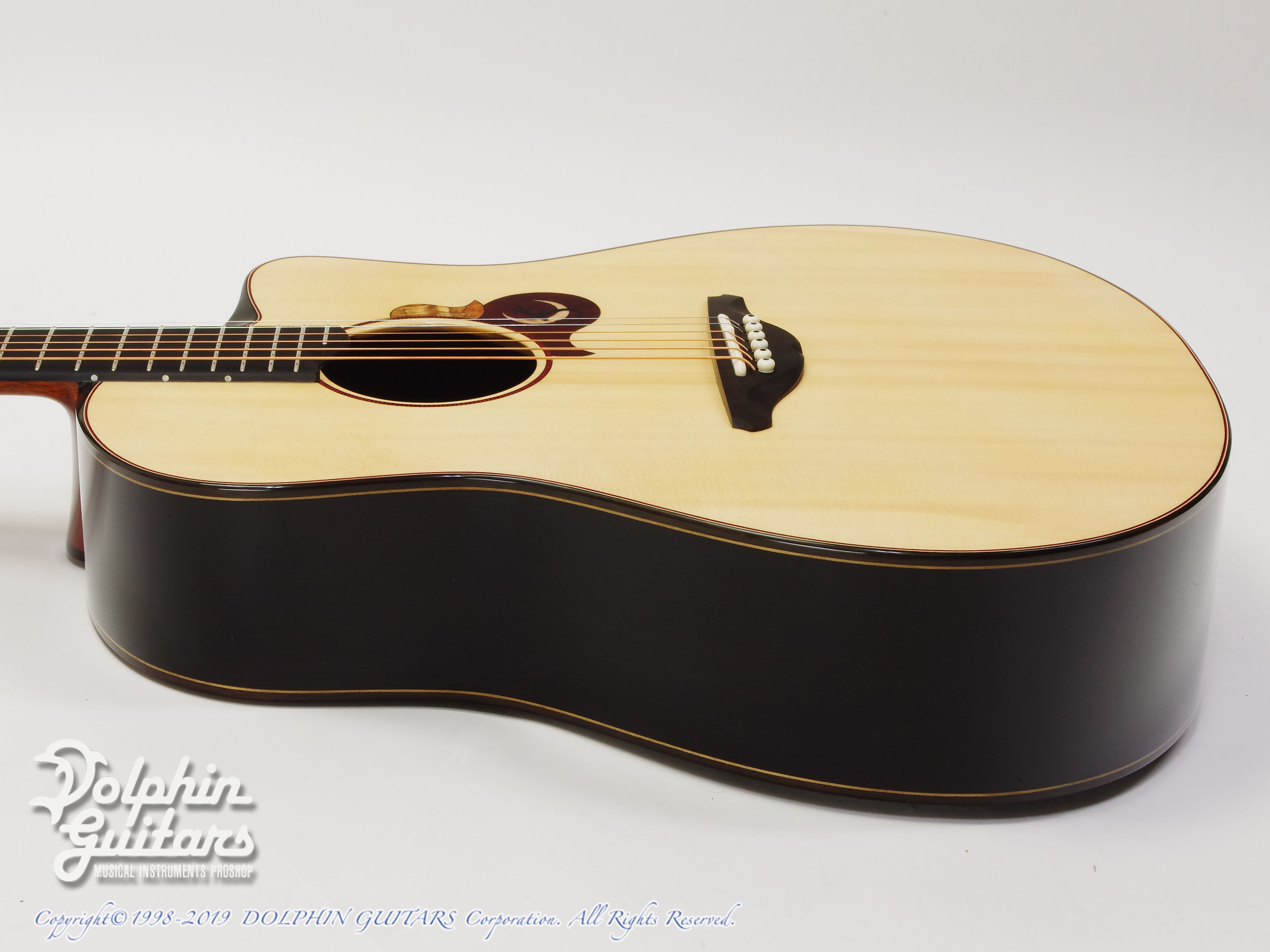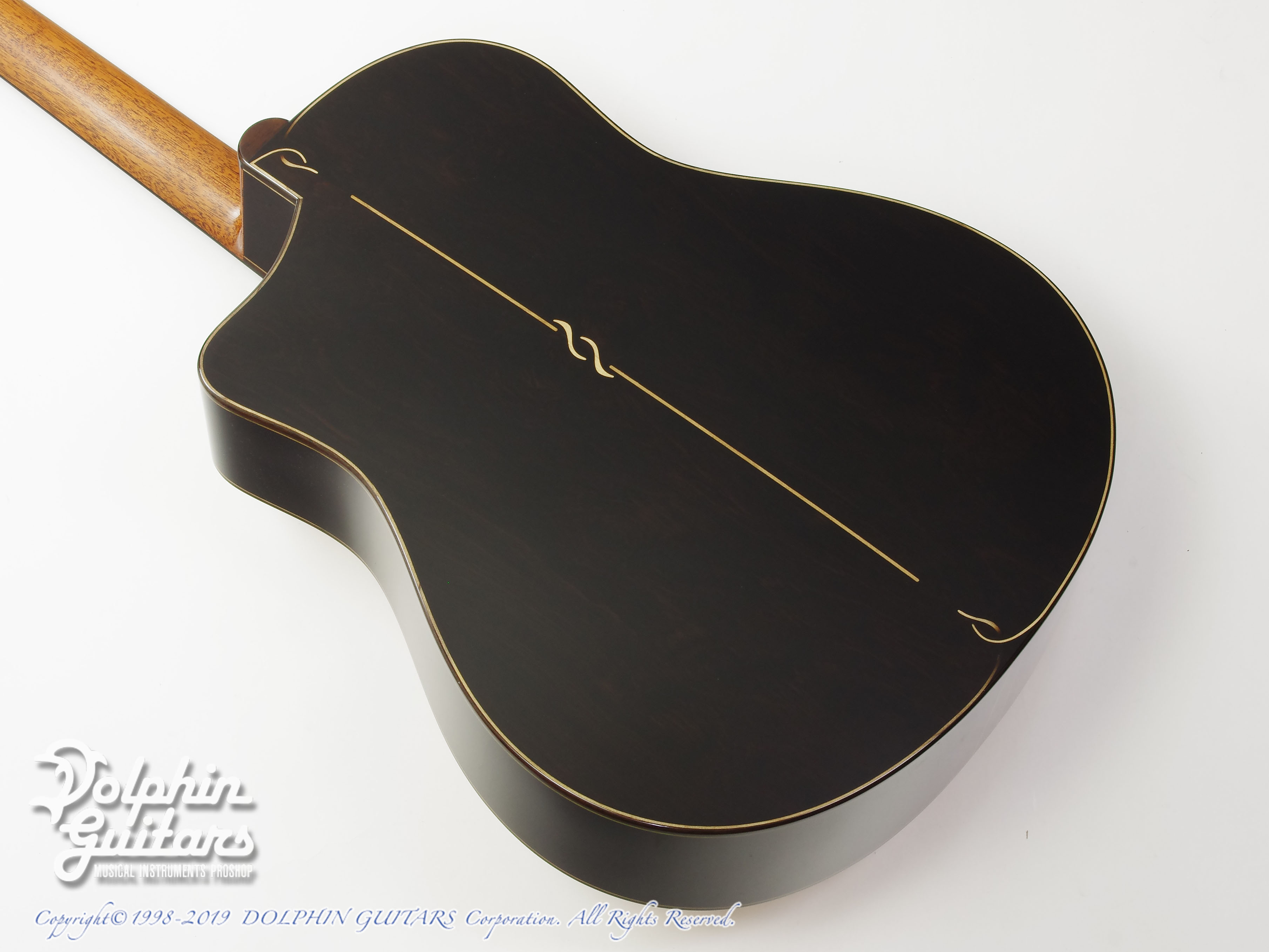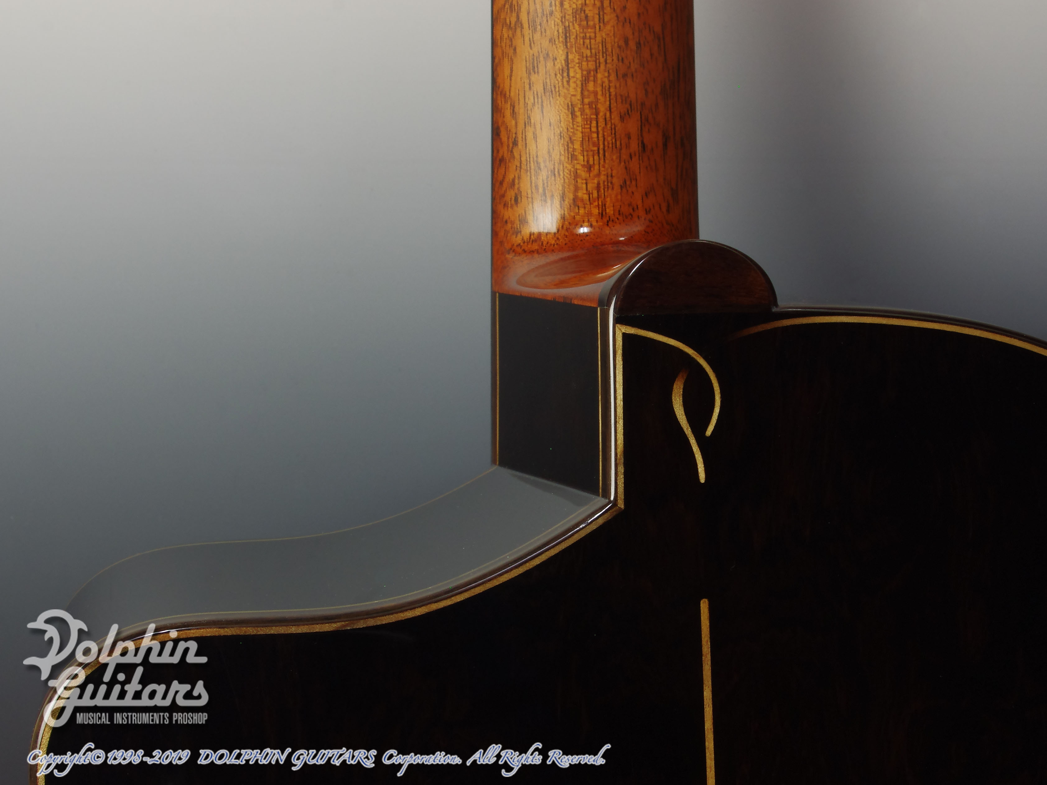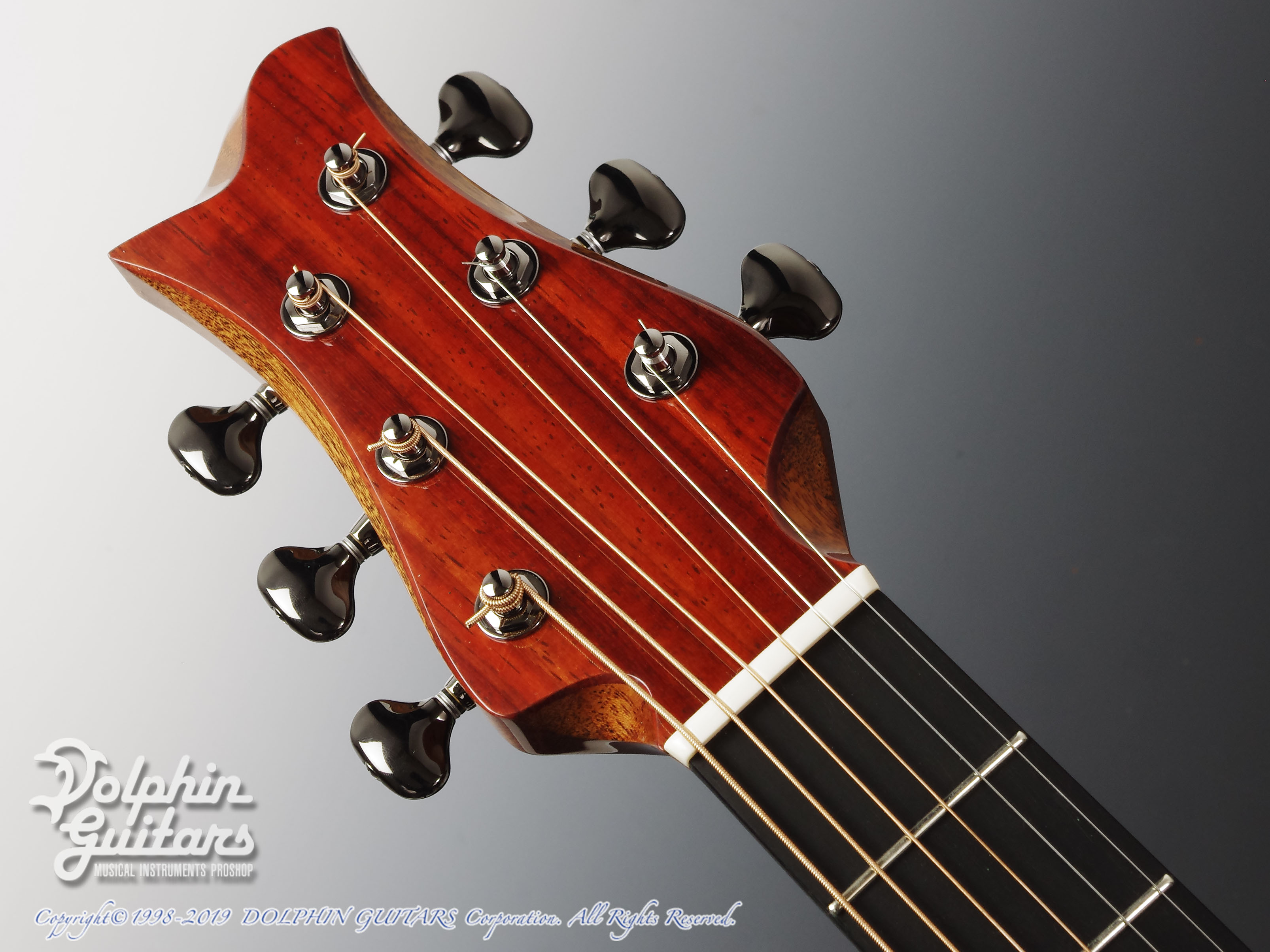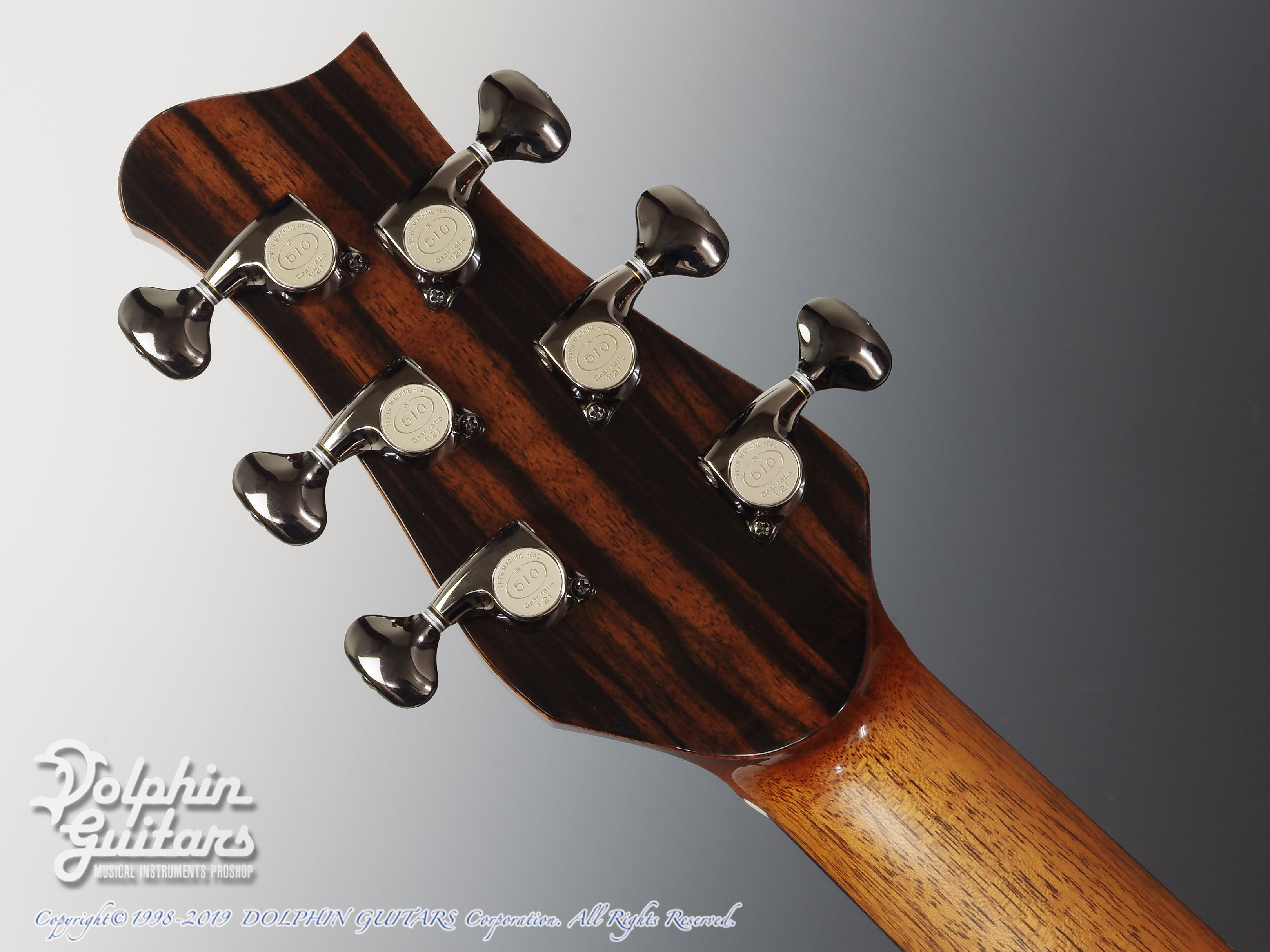 ジャーマン・スプルーストップ、アフリカンブラックウッドS&B、マホガニーネック、エボニー指板&駒、ヒールレス・ネックジョイント、ベータチタニュウム製のトラスロッド、べヴェルドカッタウェイ、スポルテッドメイプル×パドックによるビルトインPG、Gotoh SGL510ペグ。