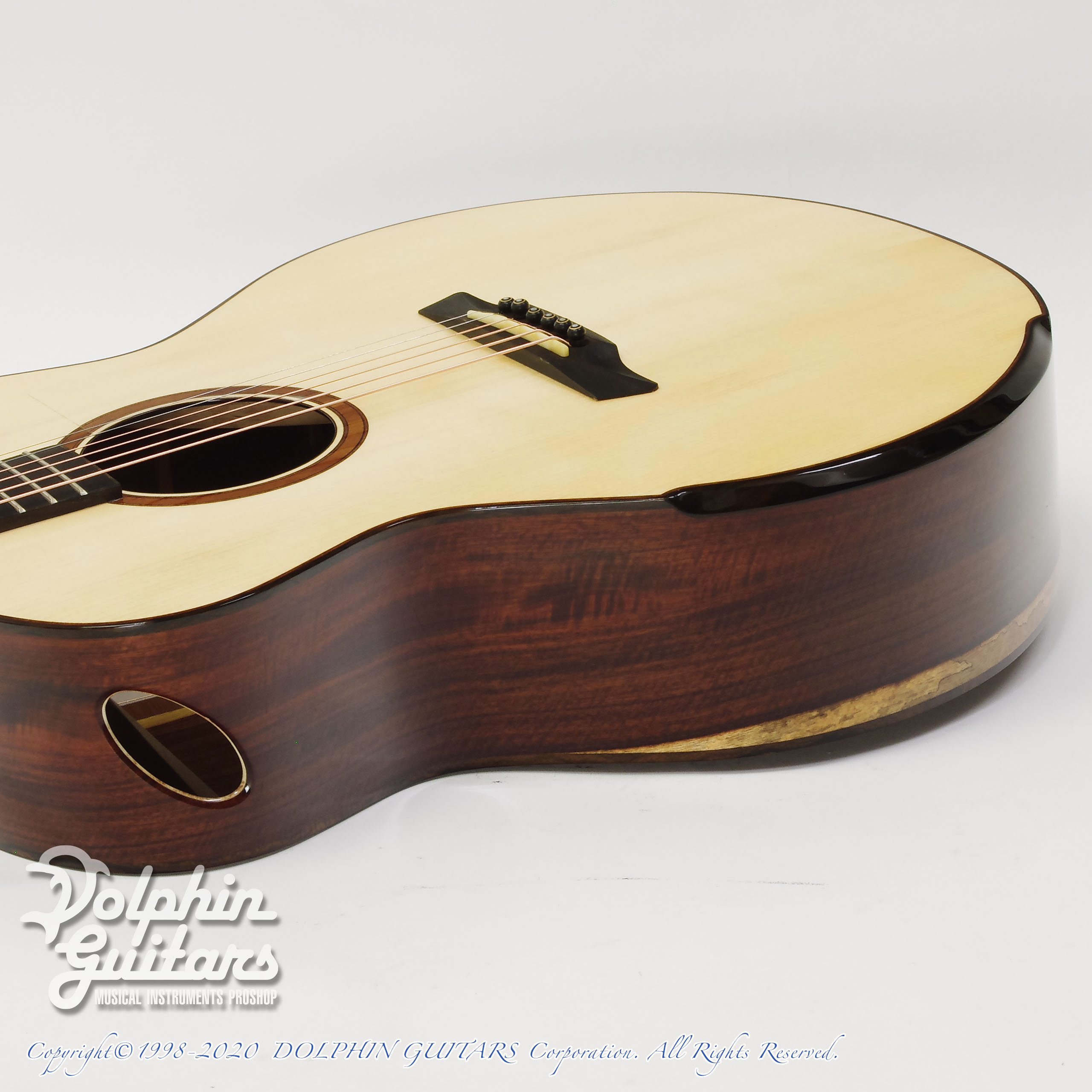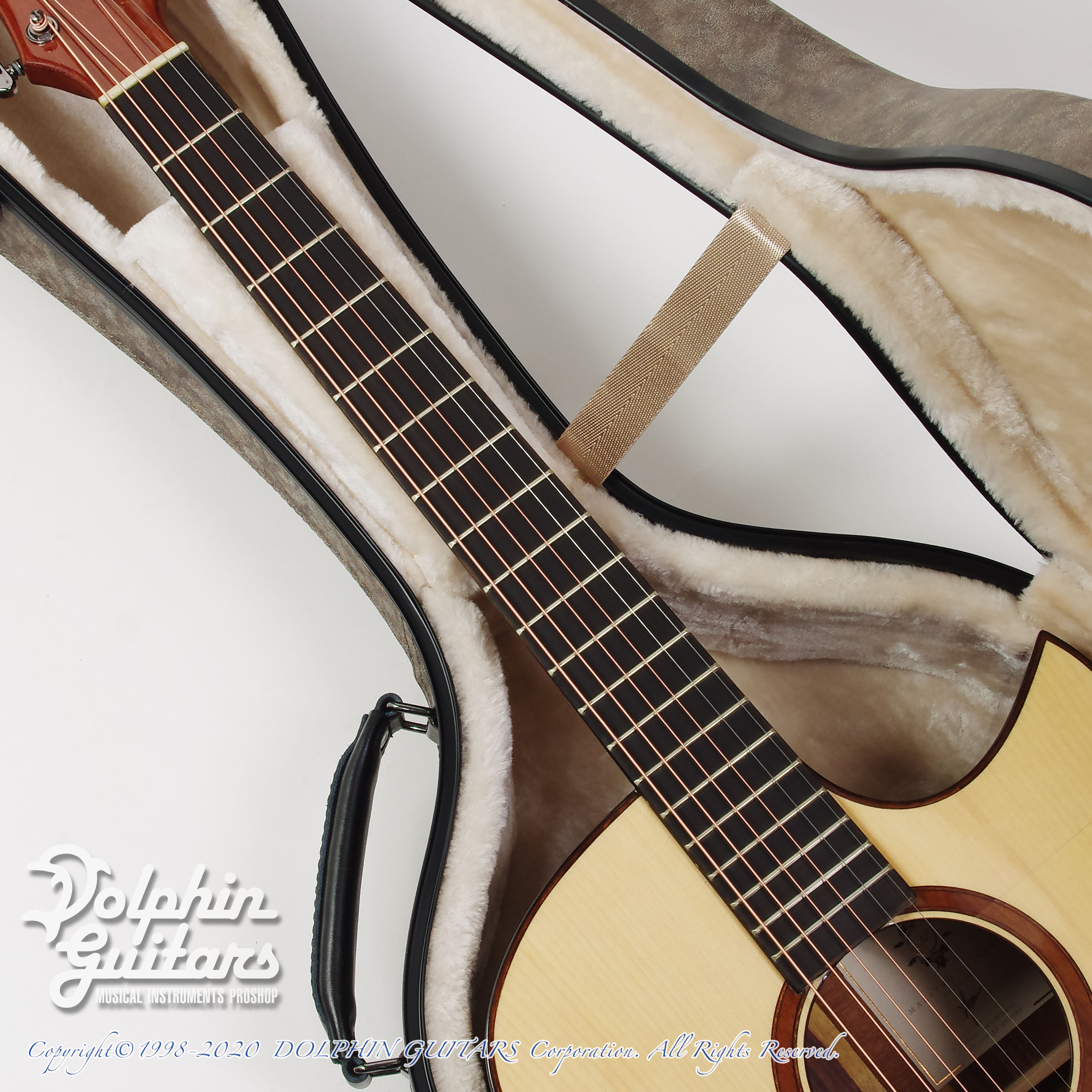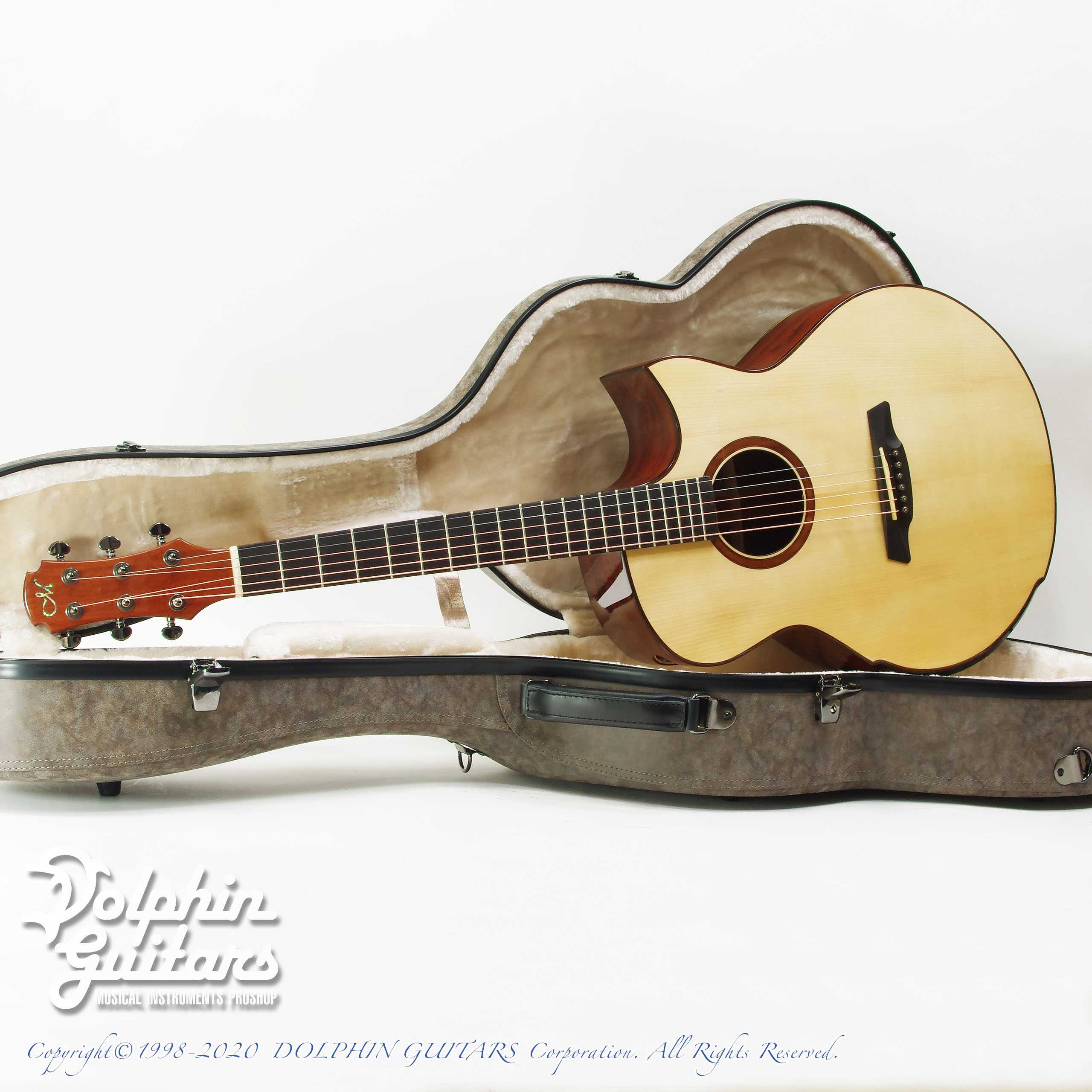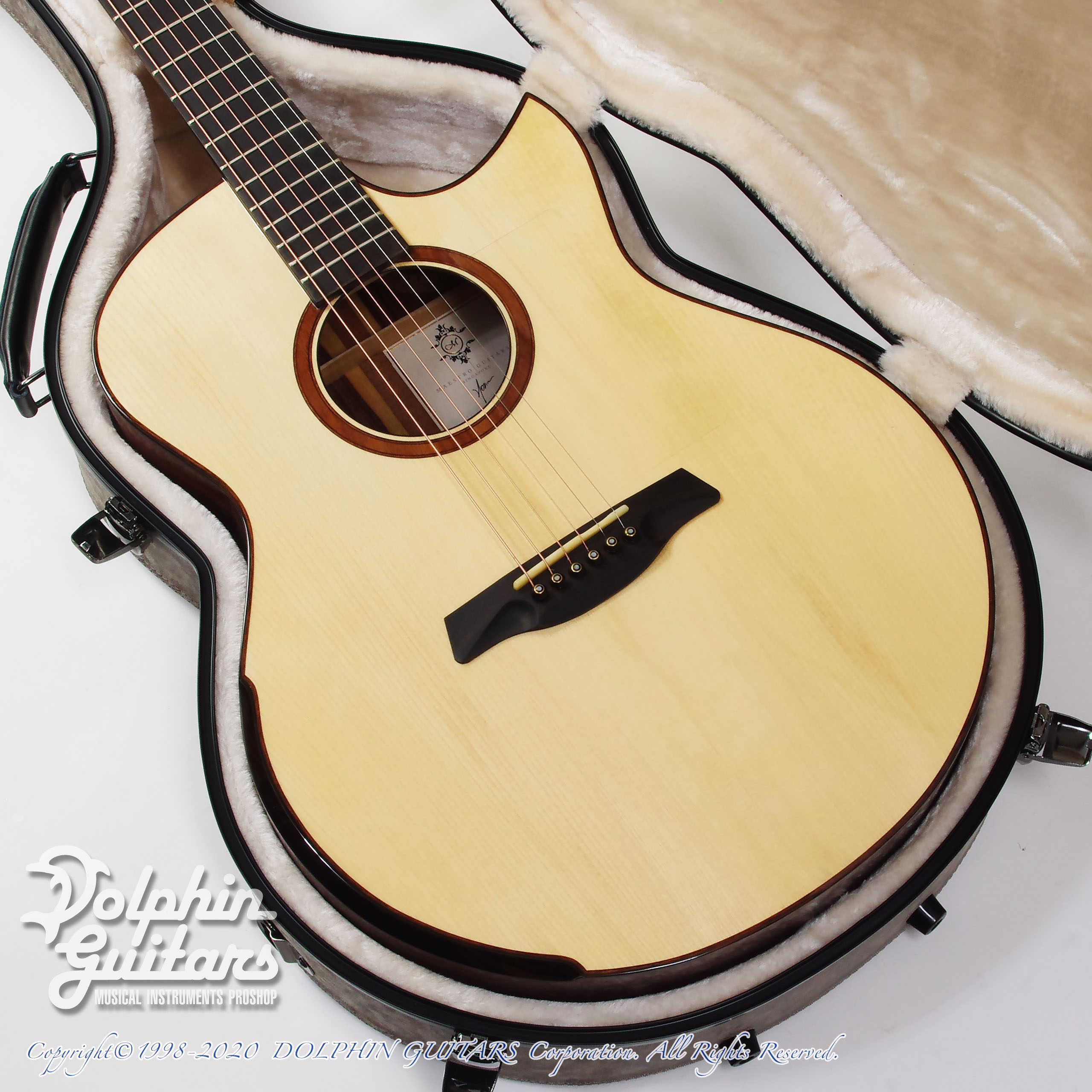 アディロンダック・スプルースTOP、サントス・ローズウッドS&B、カーヤ・マホガニーネック(カーボン補強)、ベベルド・アームレスト、サイド・サウンドポート、フローレンタイン・カッタウェイ、エボニー指板&ブリッジ、43,8mmナット、650mmスケール、グローバーペグ。