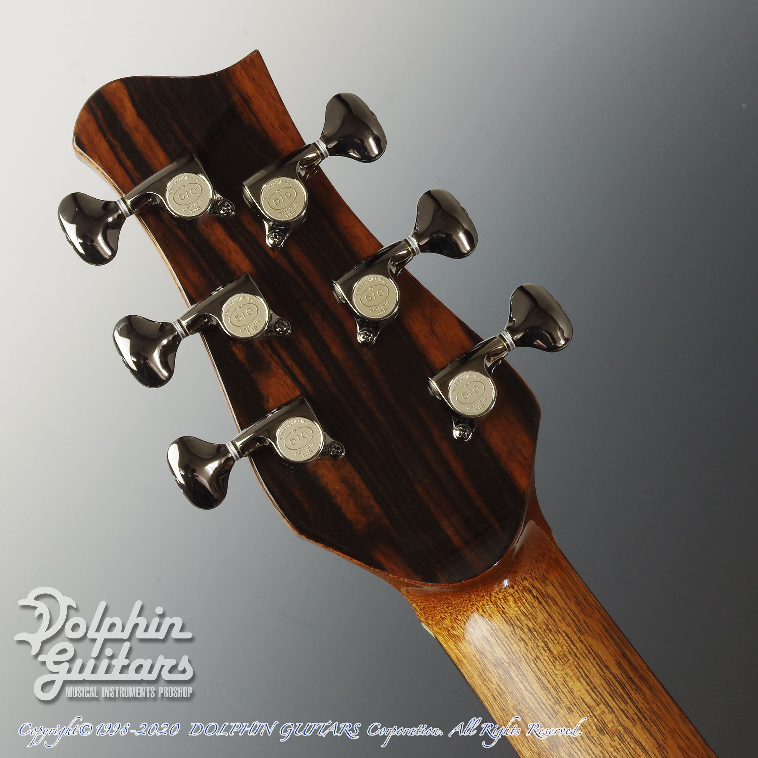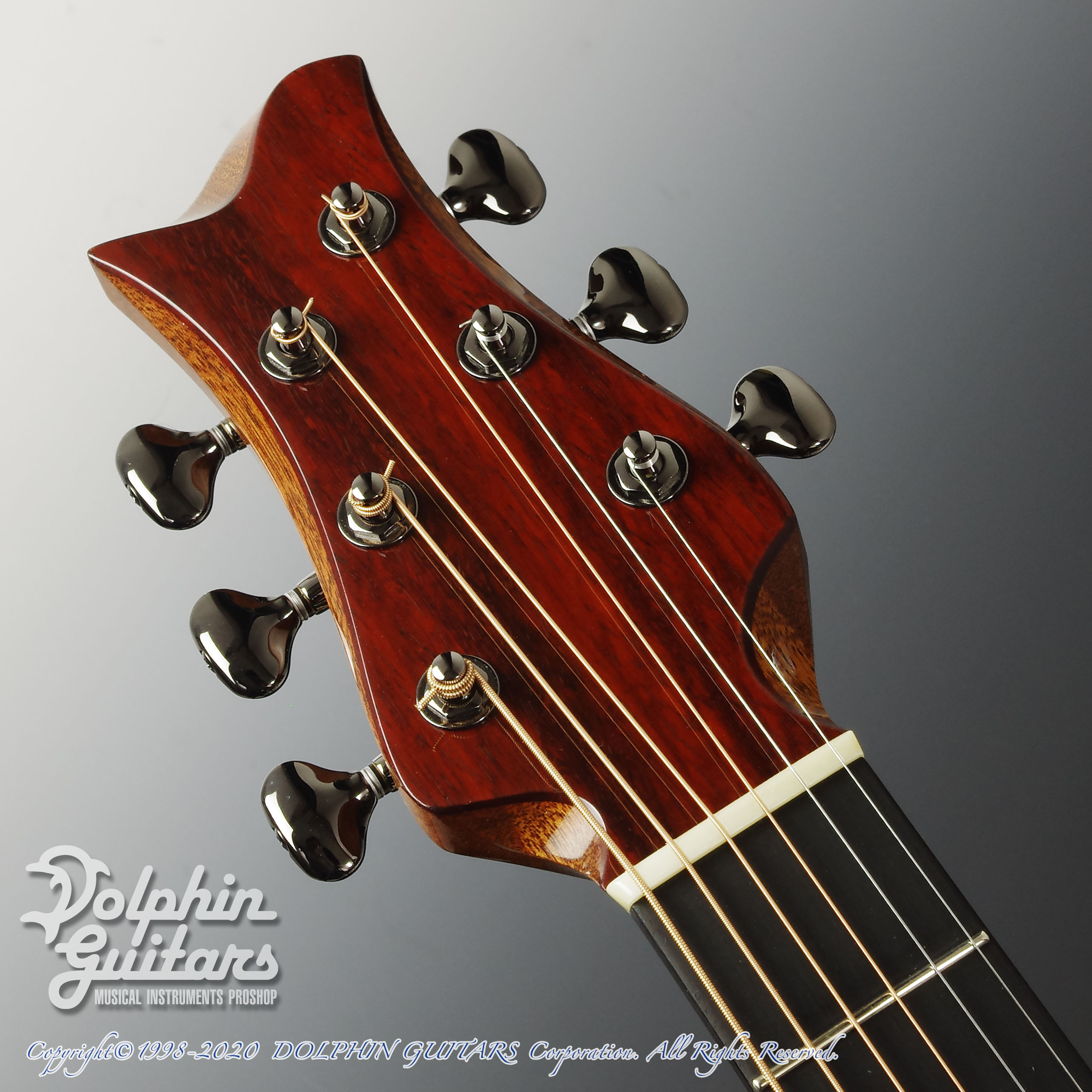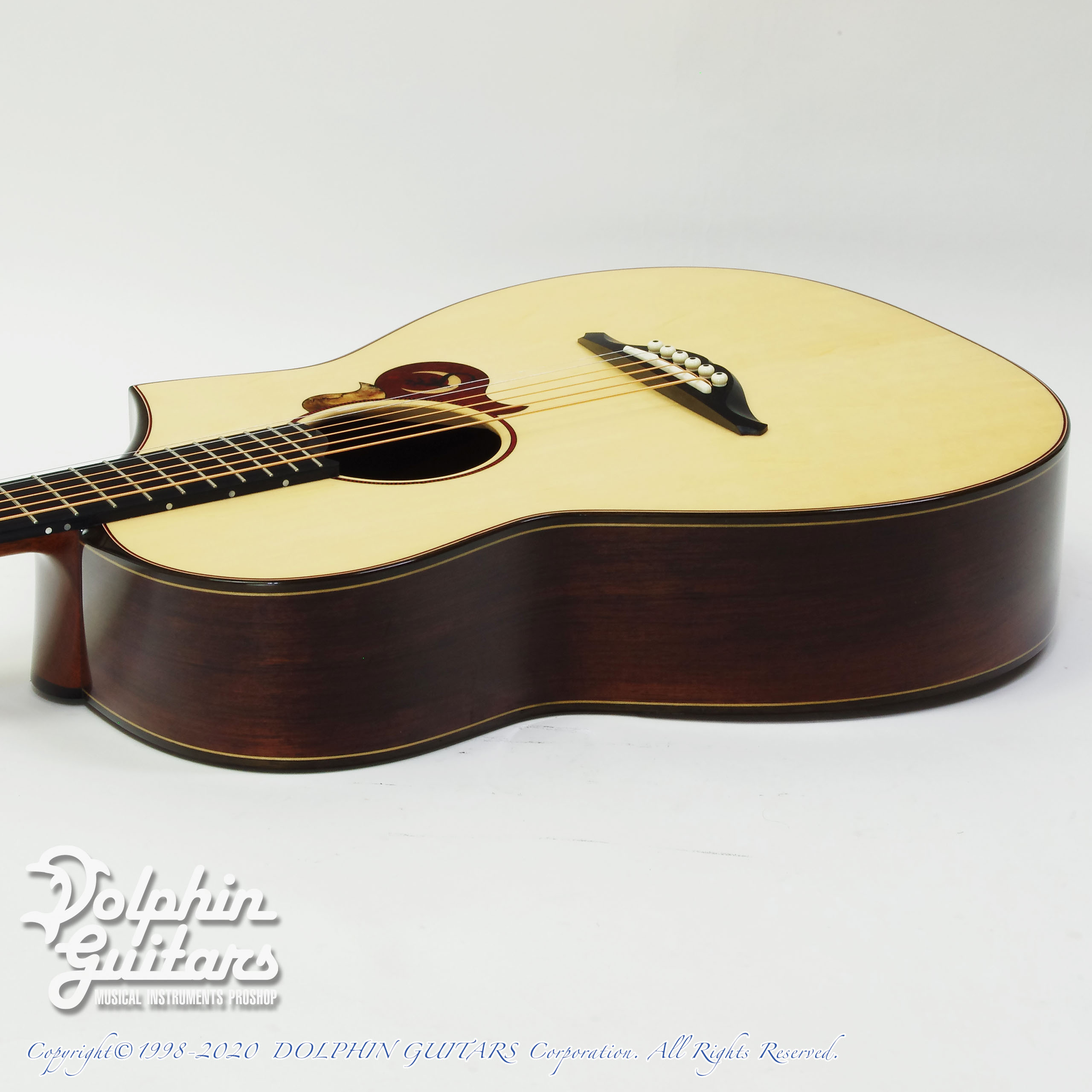 イングルマン・スプルースTOP、マダガスカル・ローズウッドS&B、ホンジュラス・マホガニーネック、エボニー指板&ブリッジ、パドゥーク・ヘッドプレート、ウッドバインディング、44mmナット幅、630mmスケール、ビルトインPG、Gotoh 510ペグ仕様。