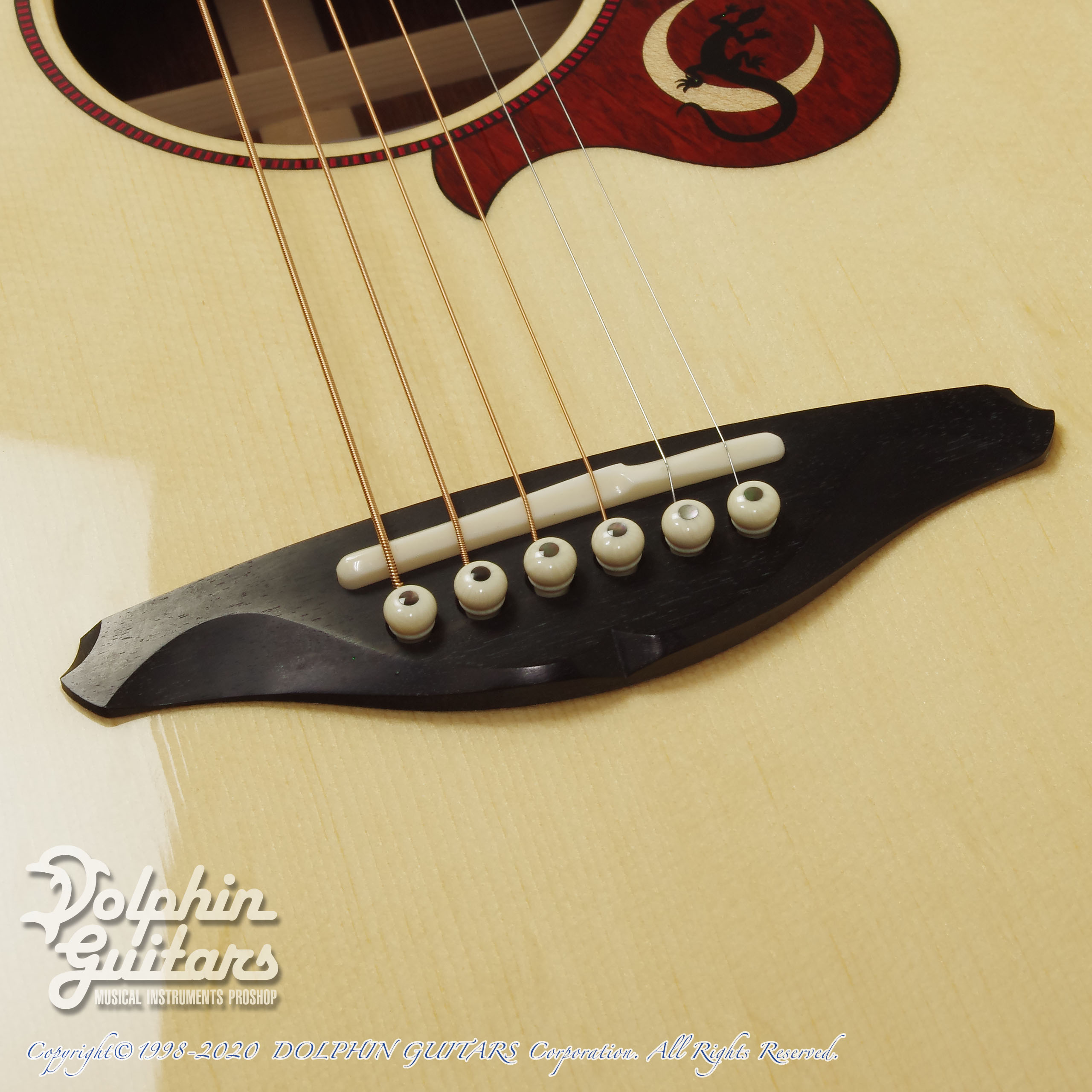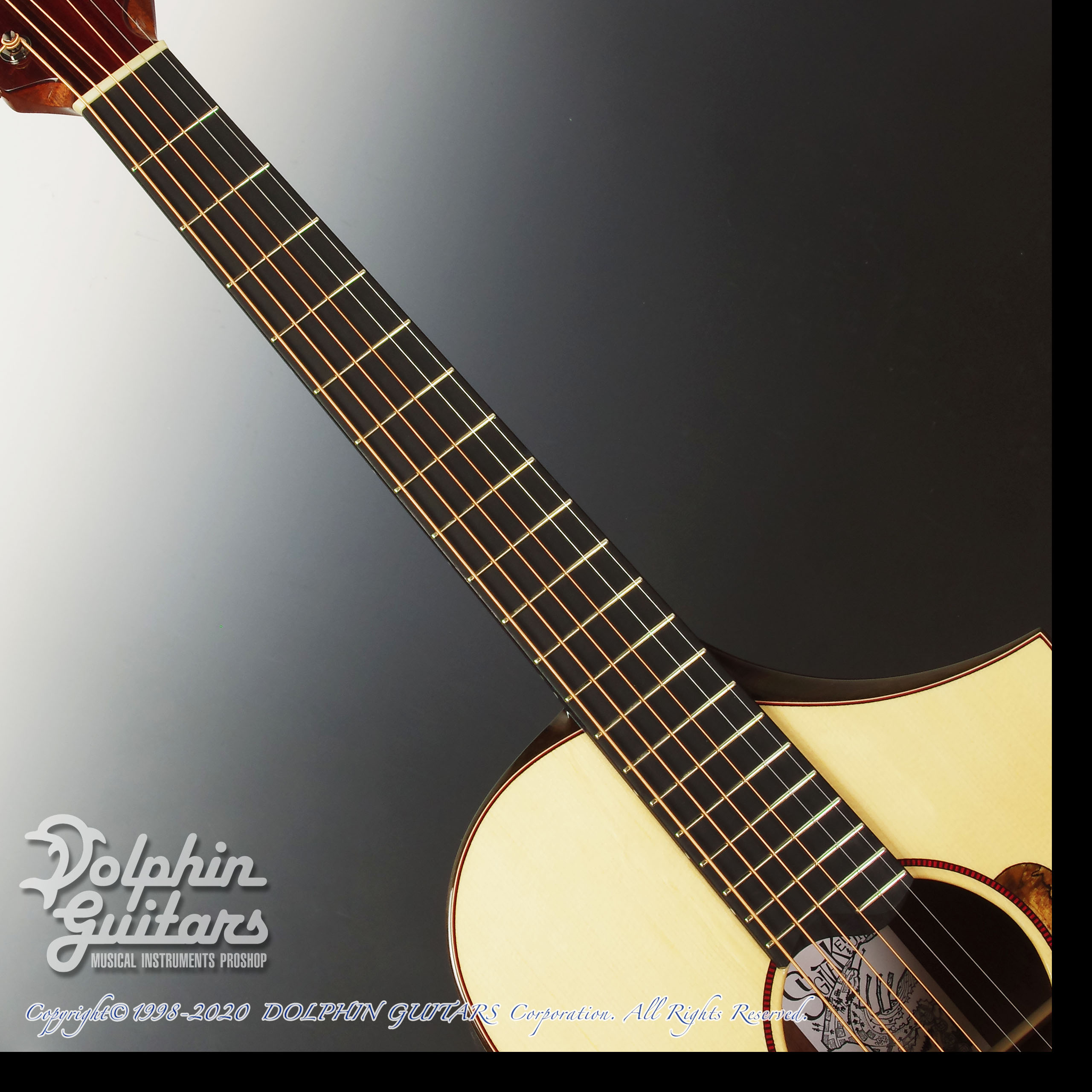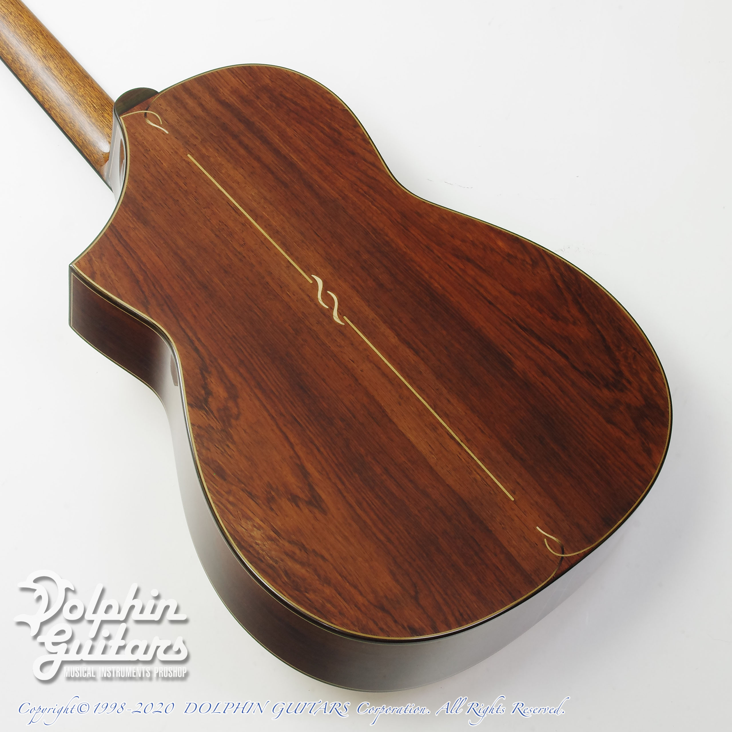 イングルマン・スプルースTOP、マダガスカル・ローズウッドS&B、ホンジュラス・マホガニーネック、エボニー指板&ブリッジ、パドゥーク・ヘッドプレート、ウッドバインディング、44mmナット幅、630mmスケール、ビルトインPG、Gotoh 510ペグ仕様。