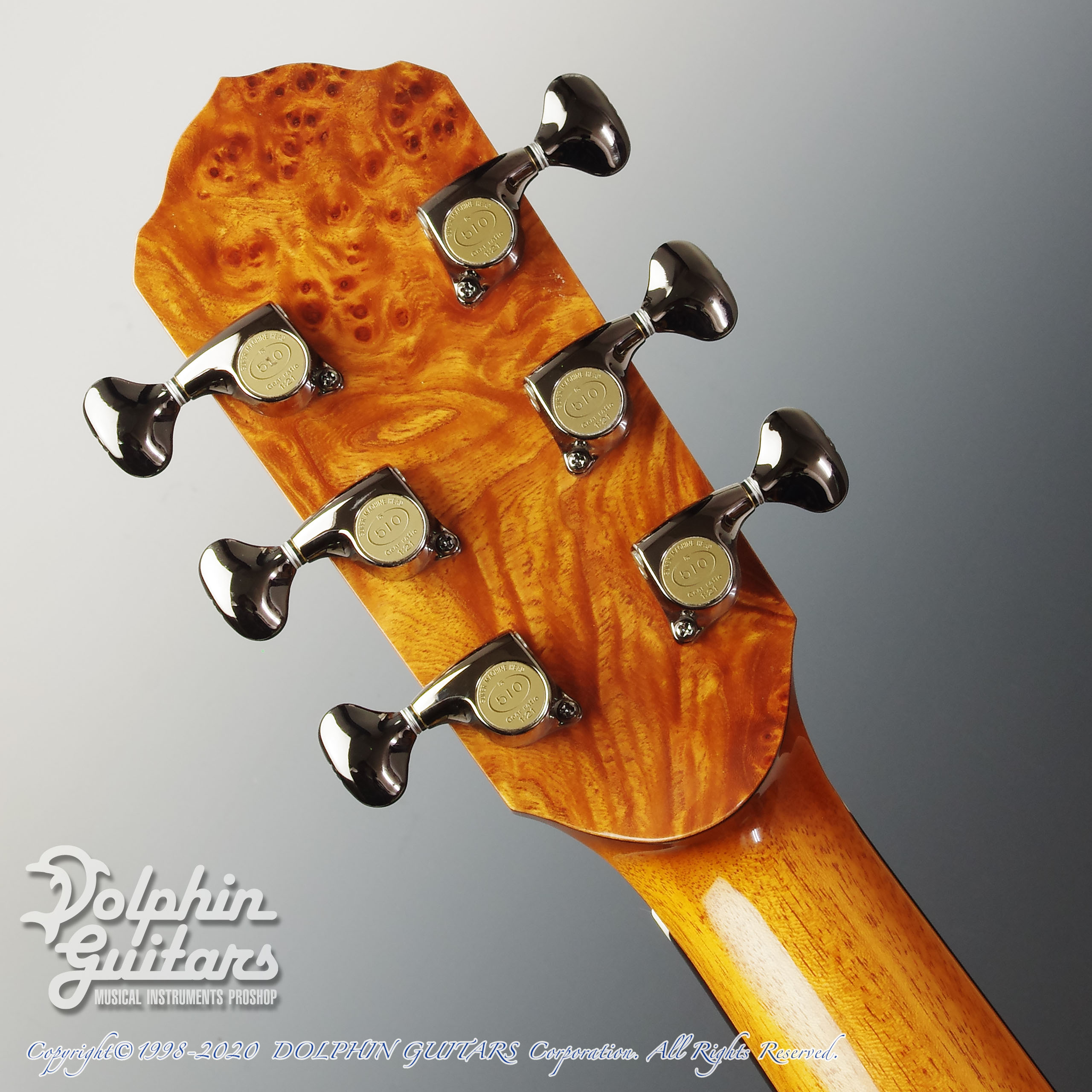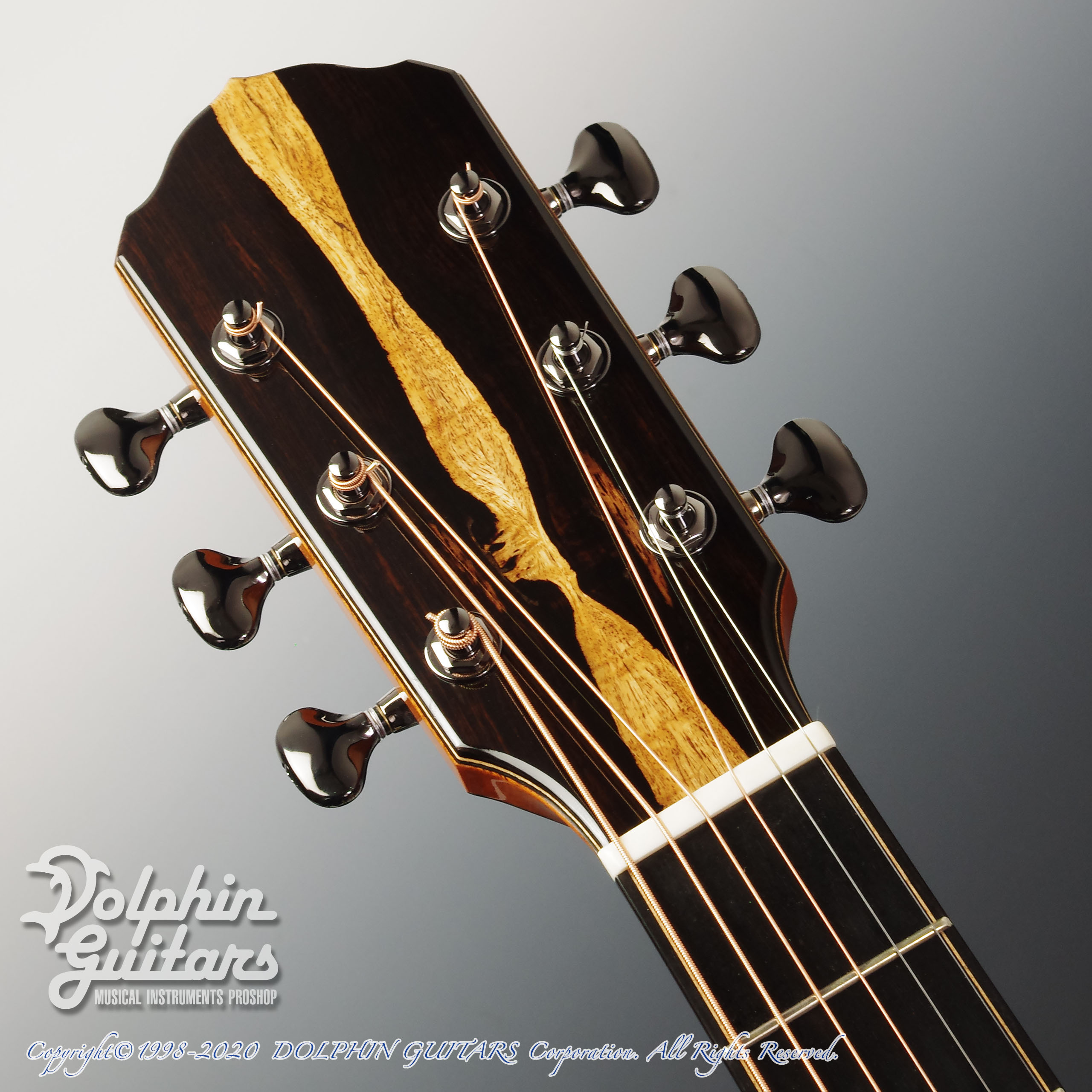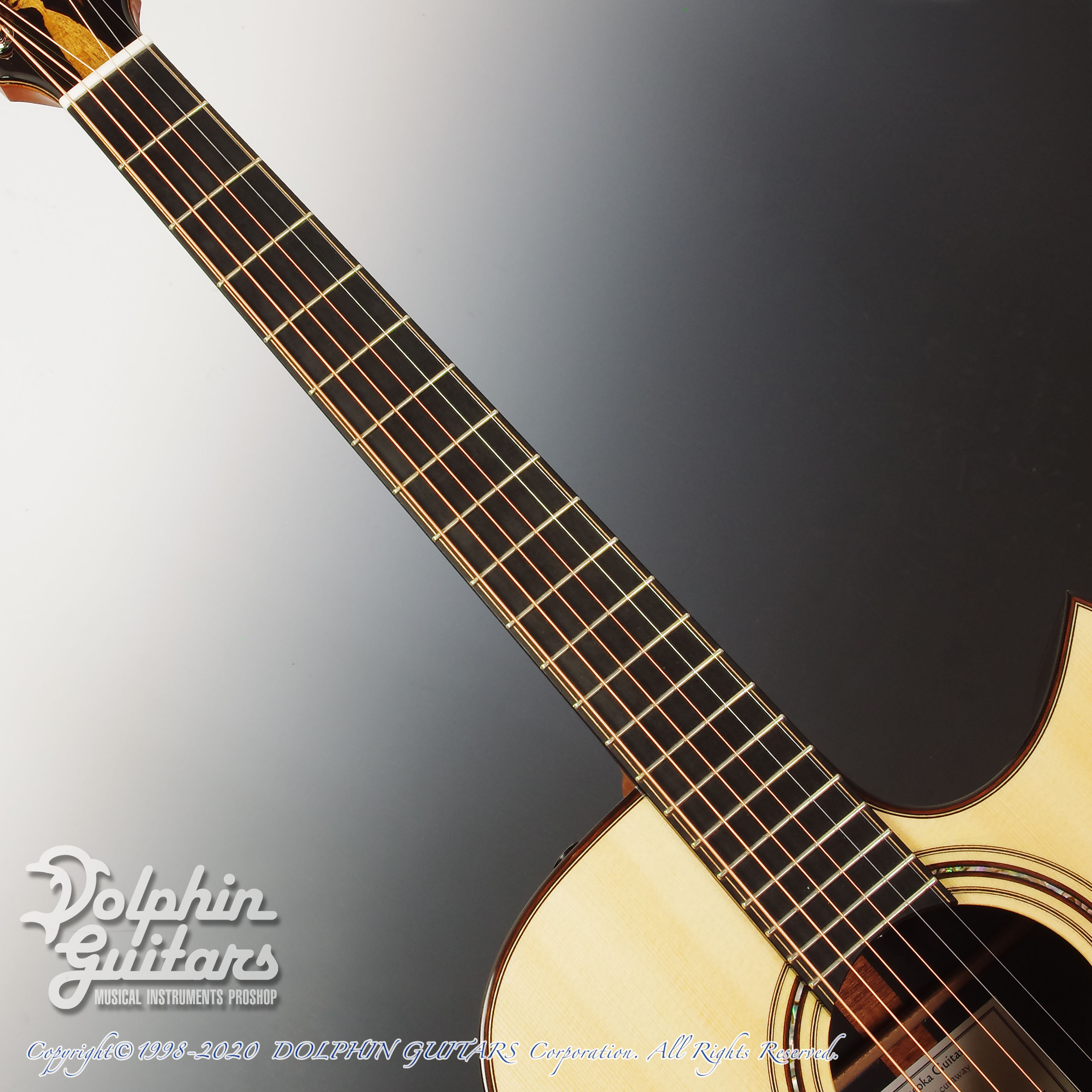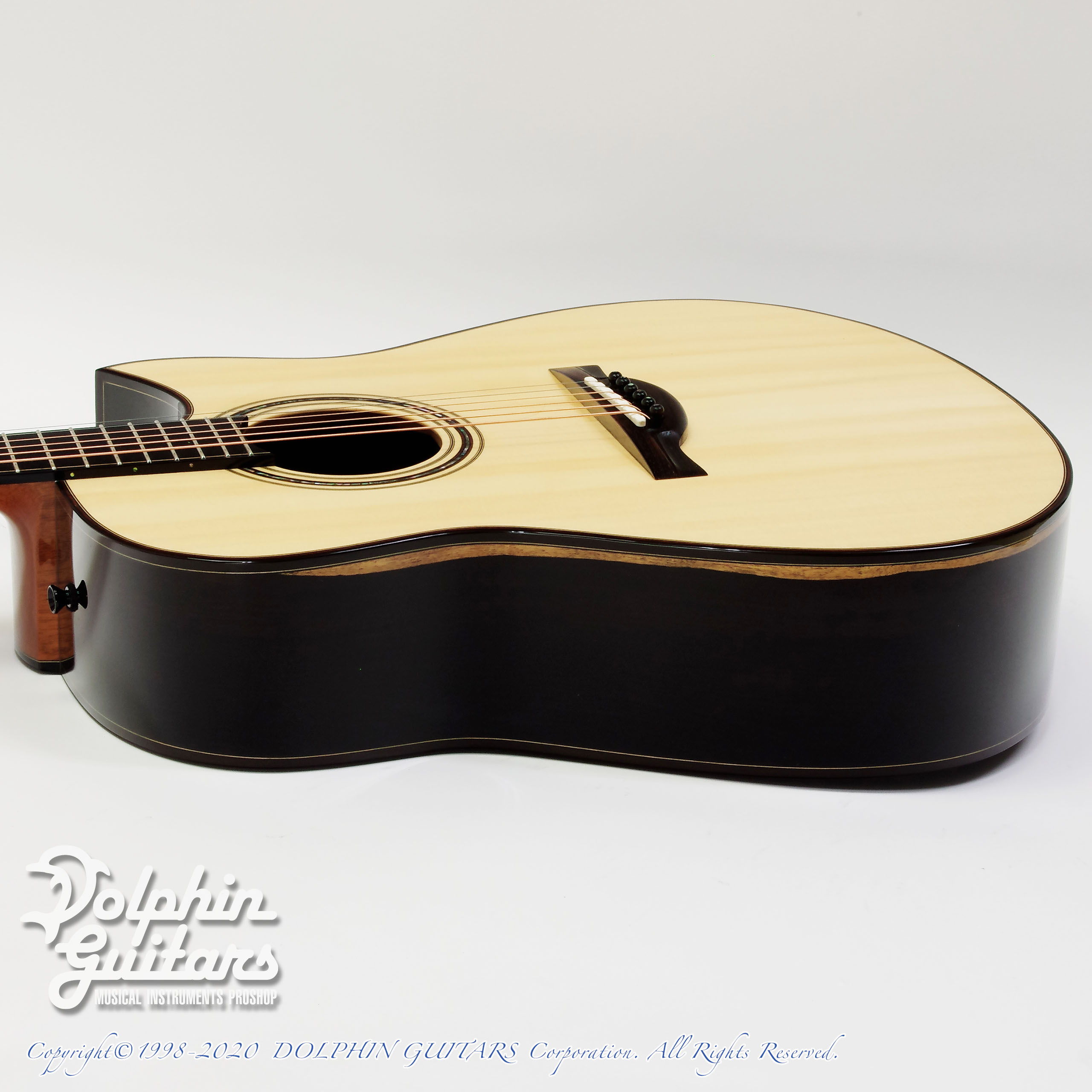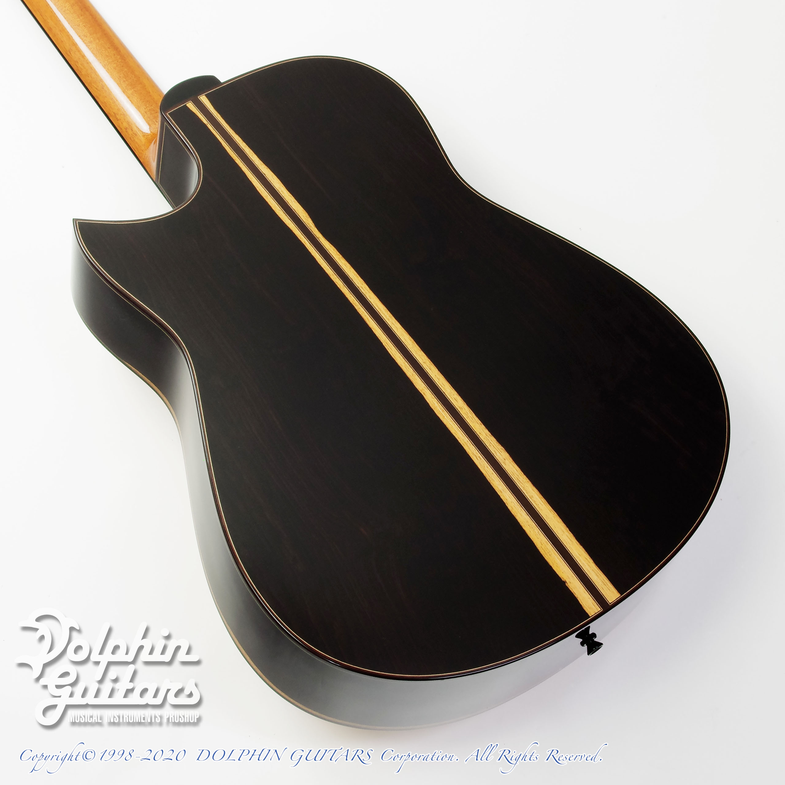 ジャーマン・スプルースTOP、アフリカン・ブラックウッドS&B、マホガニーネック、エボニー指板、ハカランダブリッジ、ブラックウッドバインディング、フローレンタイン・カッタウェイ、アバロンロゼッタ、Gotoh 510ペグ仕様。