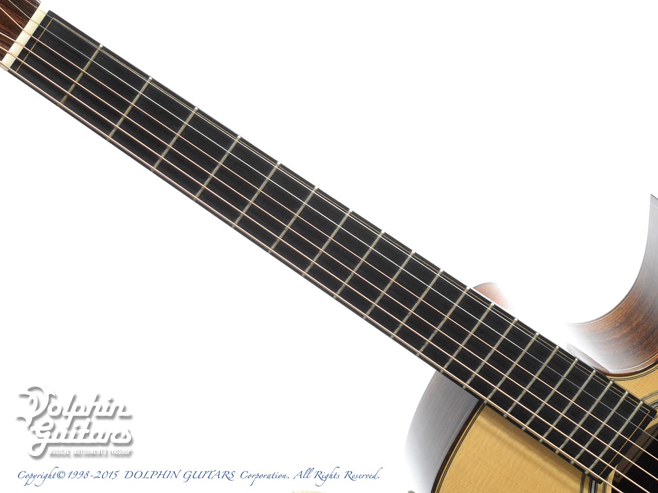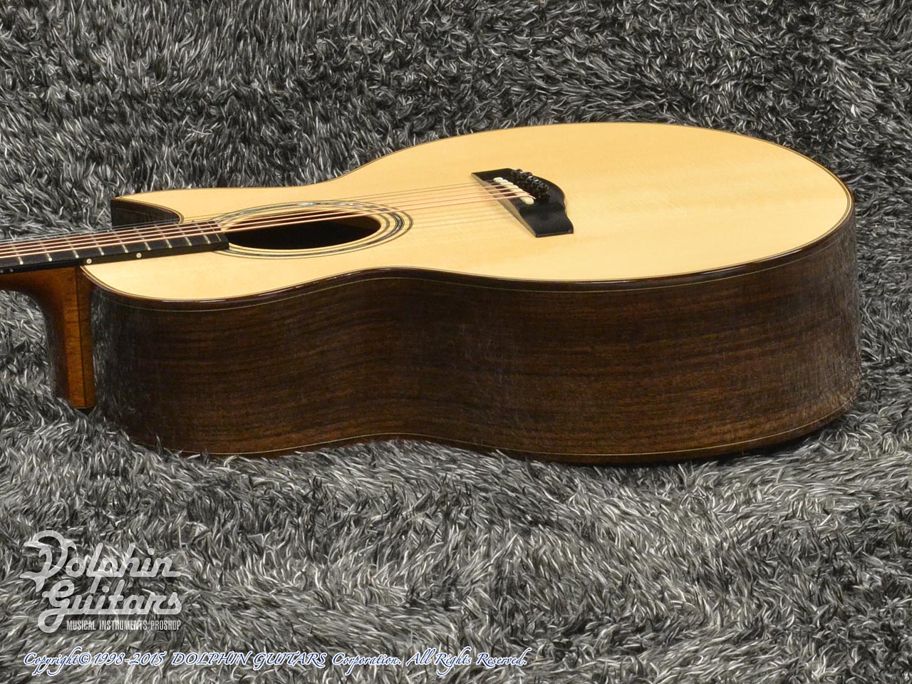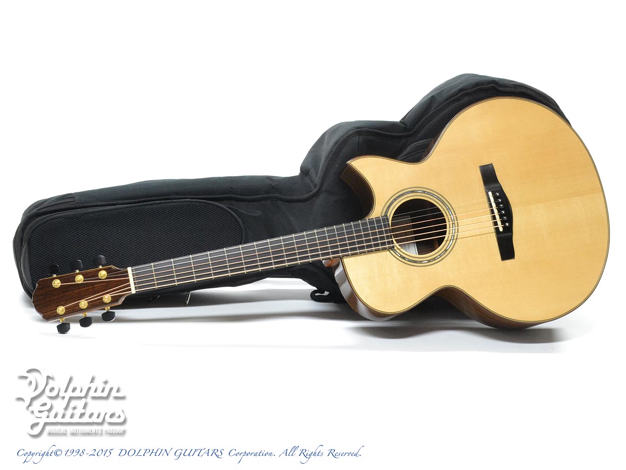 ヨーロピアンスプルース・トップ、インディアン・ローズウッド・サイド&バック、マホガニーネック、エボニー指板&駒、コア・ウッドバインディング、フローレンタインカッタウェイ、アバロン・ロゼッタ、ゴトー510糸巻き仕様。