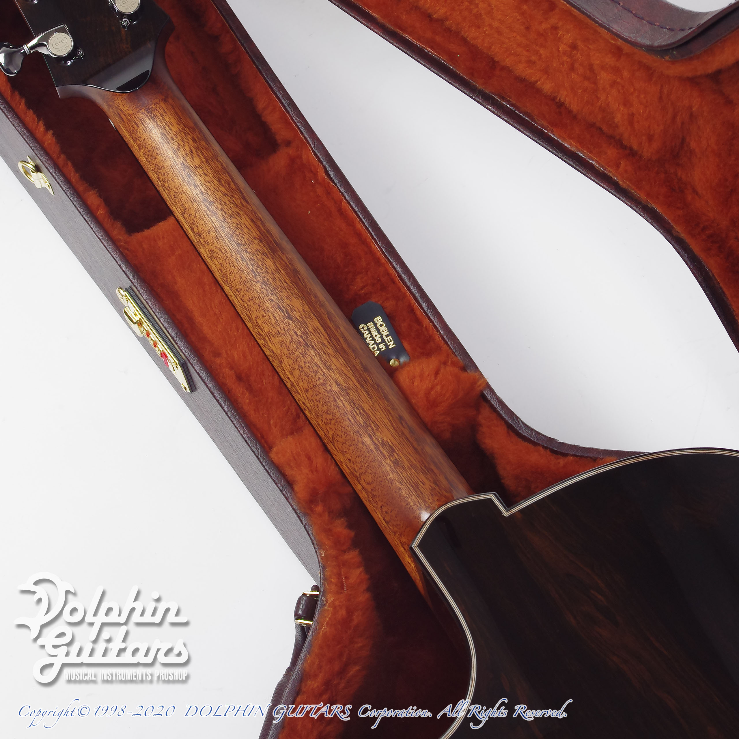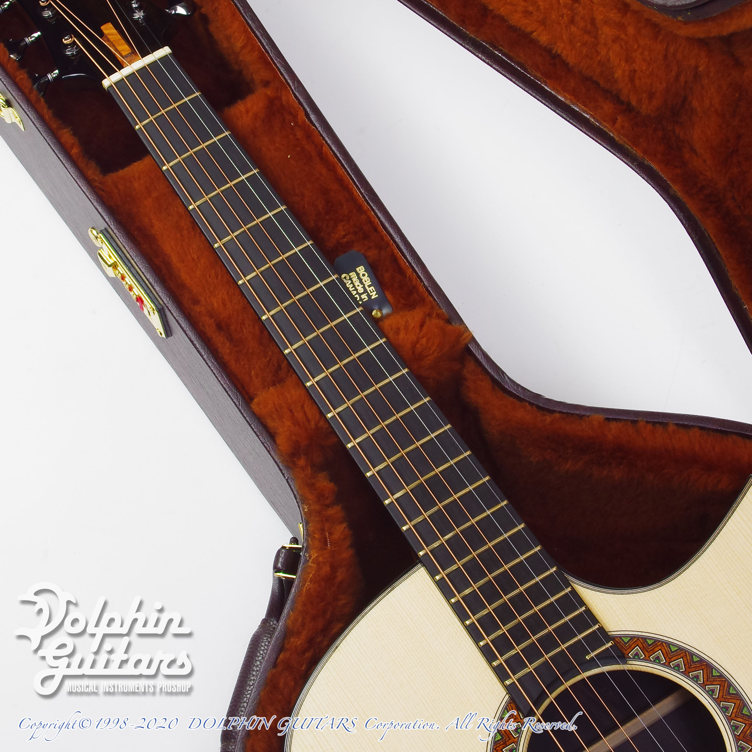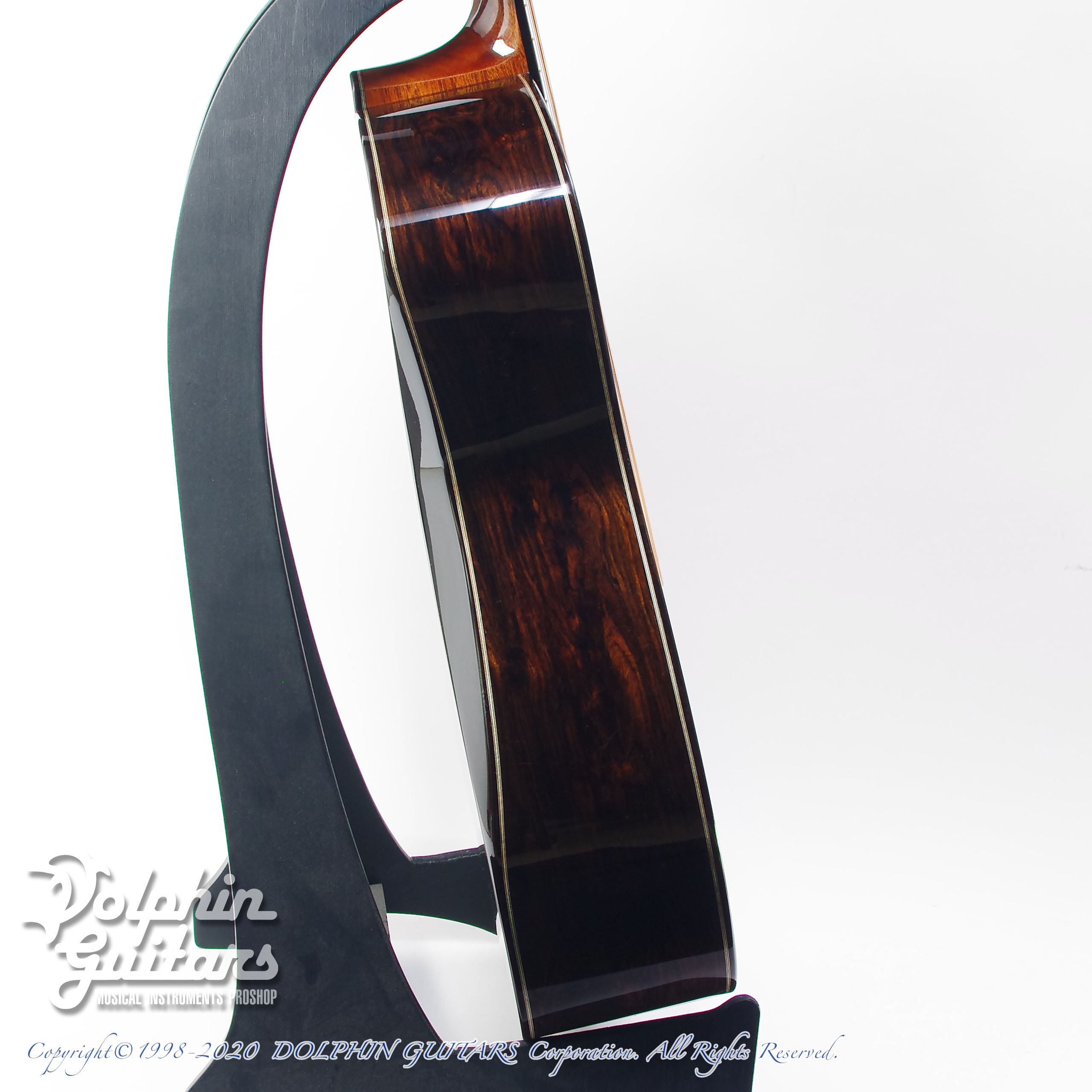 重厚感溢れるアフリカンブラックウッド。比重が大きく硬質であり、加工が難しい材で、希少材ということもあり量産メーカーでは使用されない木材です。音響特性に優れ、この材でしか出せない重低音域があり、それを藤井氏が見事なサウンドバランスに仕上げてくれました。リブレスト=バックコンター加工のオプションを加え、抱えた際のフィット間も抜群です。このバックコンターの効果は絶大で、一般的なドレッドノートと比較してもその抱え心地の良さは明確。リブレストと呼ばれるだけあって脇腹部分のフィット感も最高です。ラージボディを弾くのはストレスを感じる方にはこのリブレストがストレスを解消してくれる最高のオプションです。「ドレッドノートのサウンドは欲しい、けれど抱えるのに窮屈さを感じる」という方は本モデルを一度抱えて弾いていただけたらこのオプションの意味を瞬時にご理解いただけるかと思います。