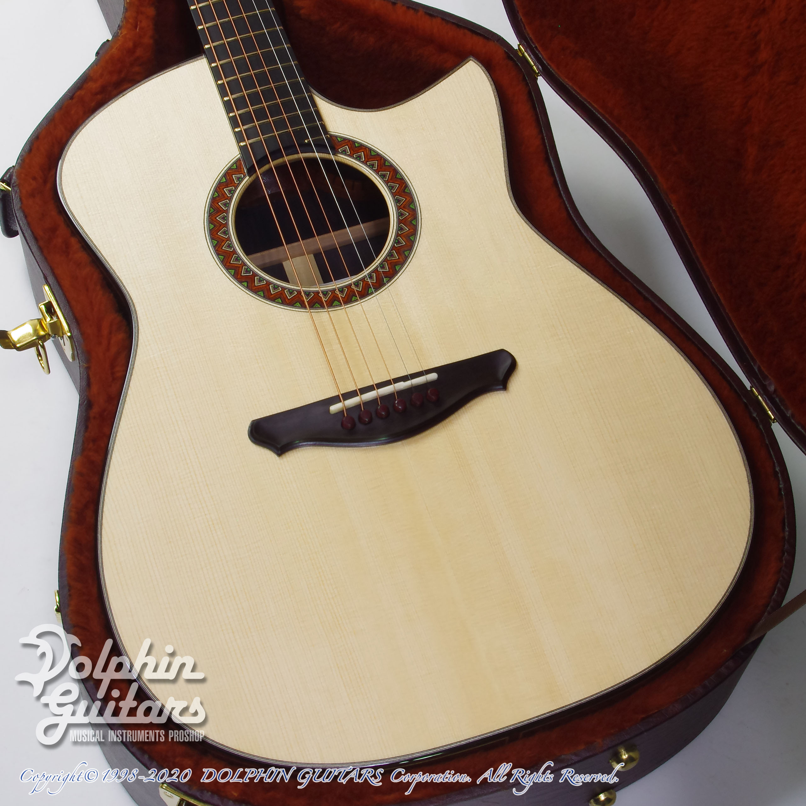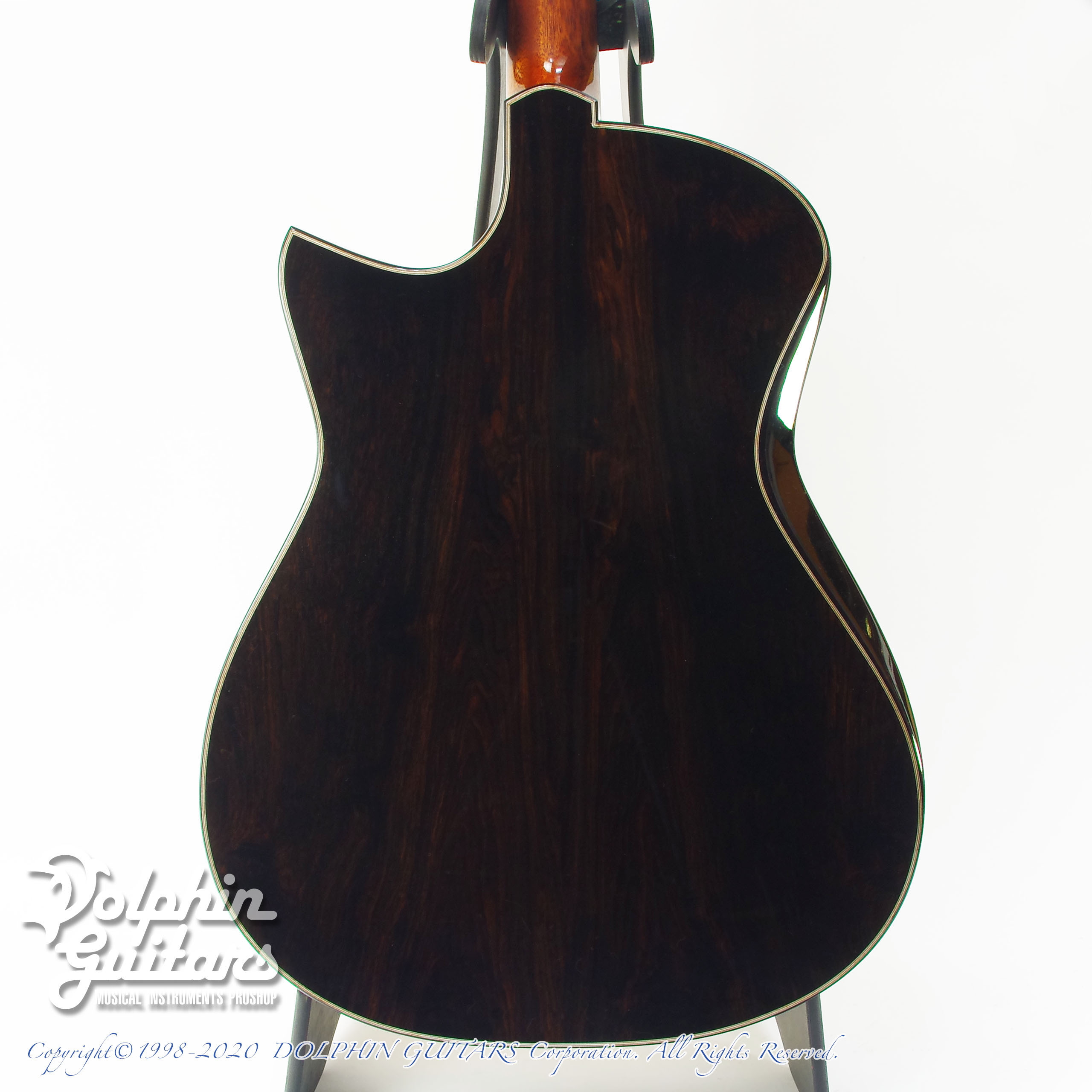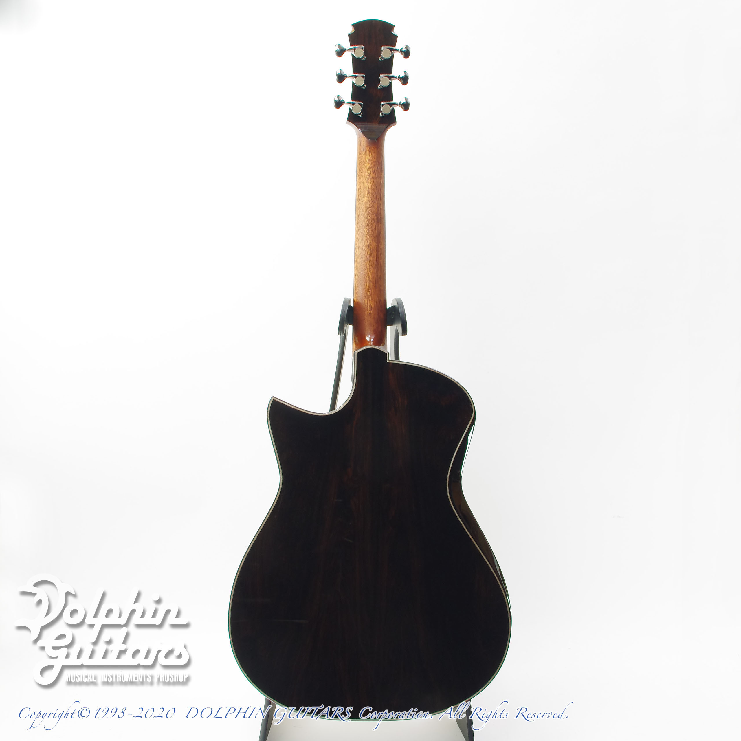 ジャーマン スプルースTOP、アフリカンブラックウッドS&B、マホガニーネック、エボニー指板、ハカランダブリッジ、リブレスト、ウッドロゼッタ(オリジナルモザイクデザイン)、フローレンタイン・カッタウェイ、44,5mmナット、643mmスケール、Gotoh510ペグ コスモブラック。