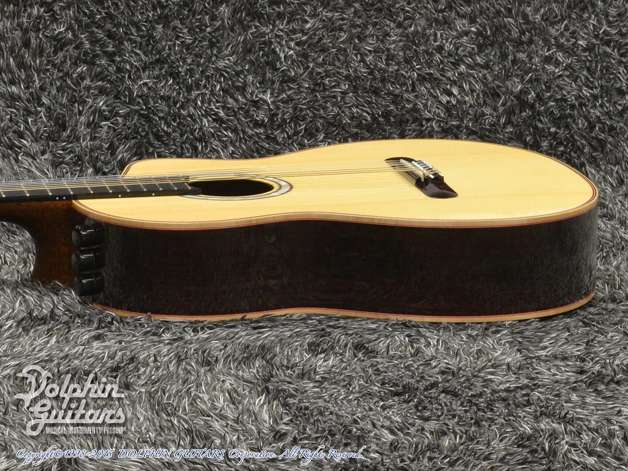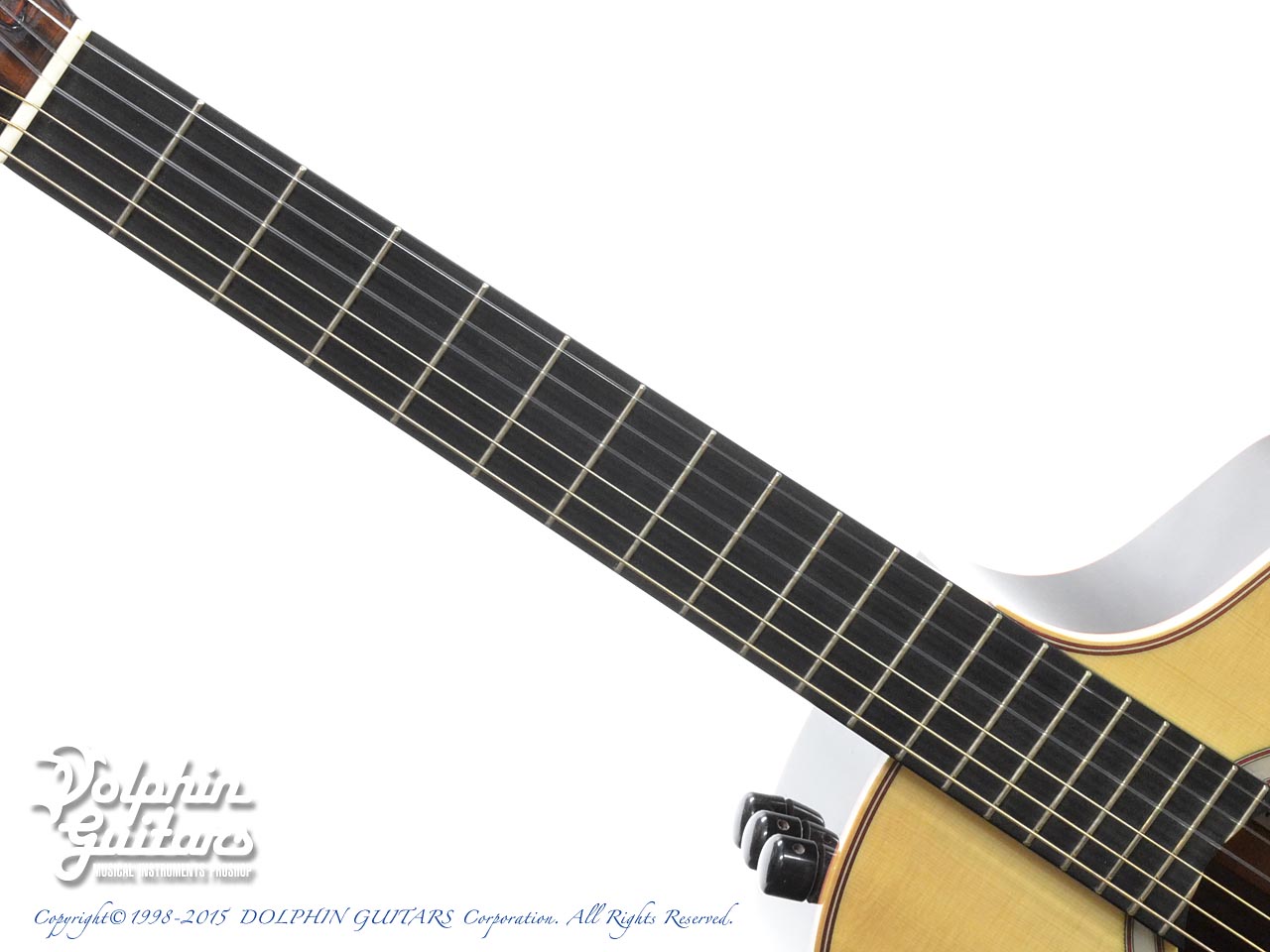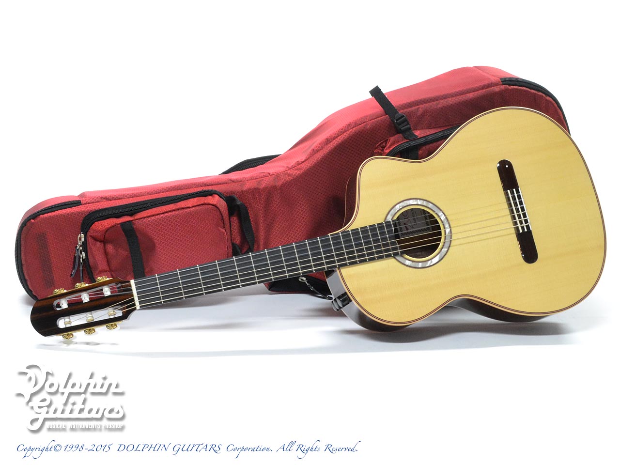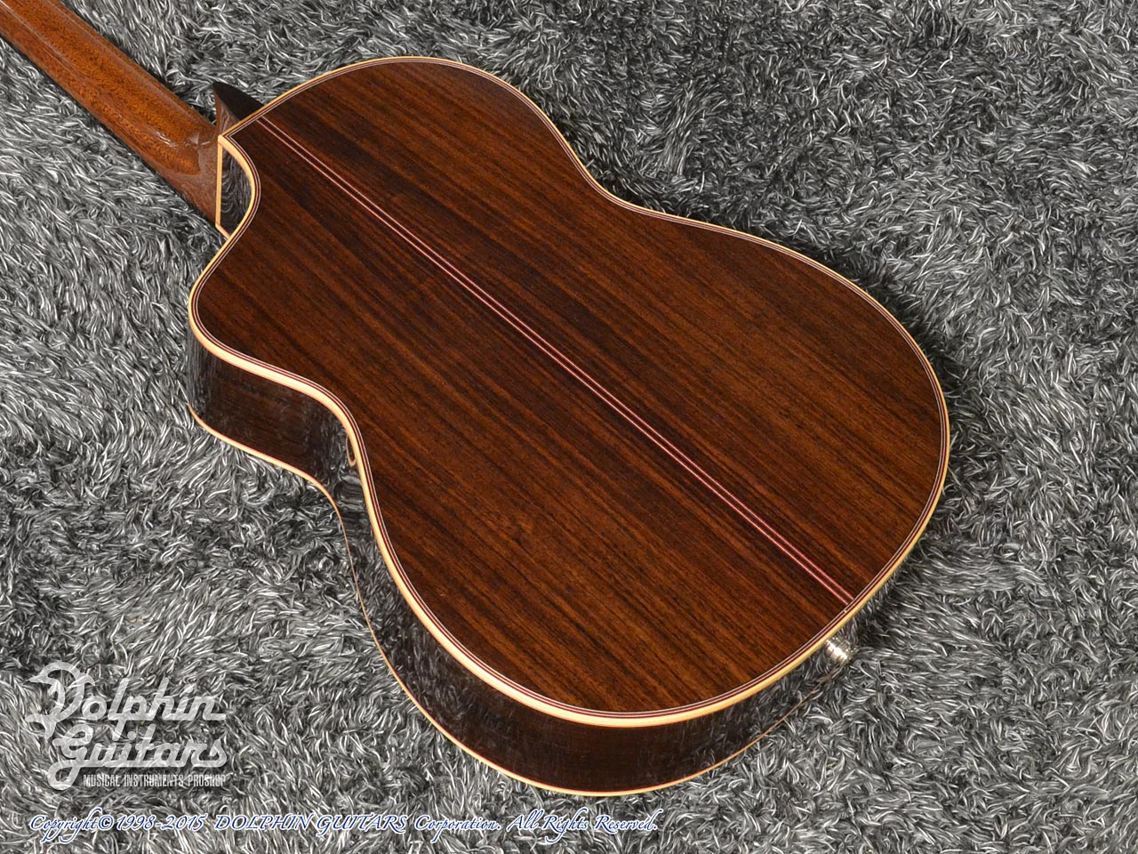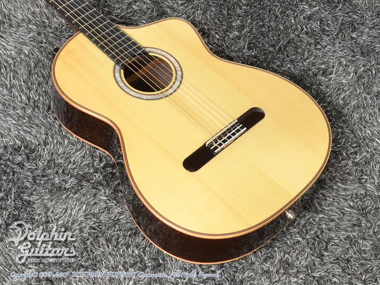 ジャーマン・スプルーストップ、インディアン・ローズウッドサイド&バック、エボニー指板&ローズウッド駒、MOPロゼッタインレイ、ZUCQデザイン・カッタウェイ。