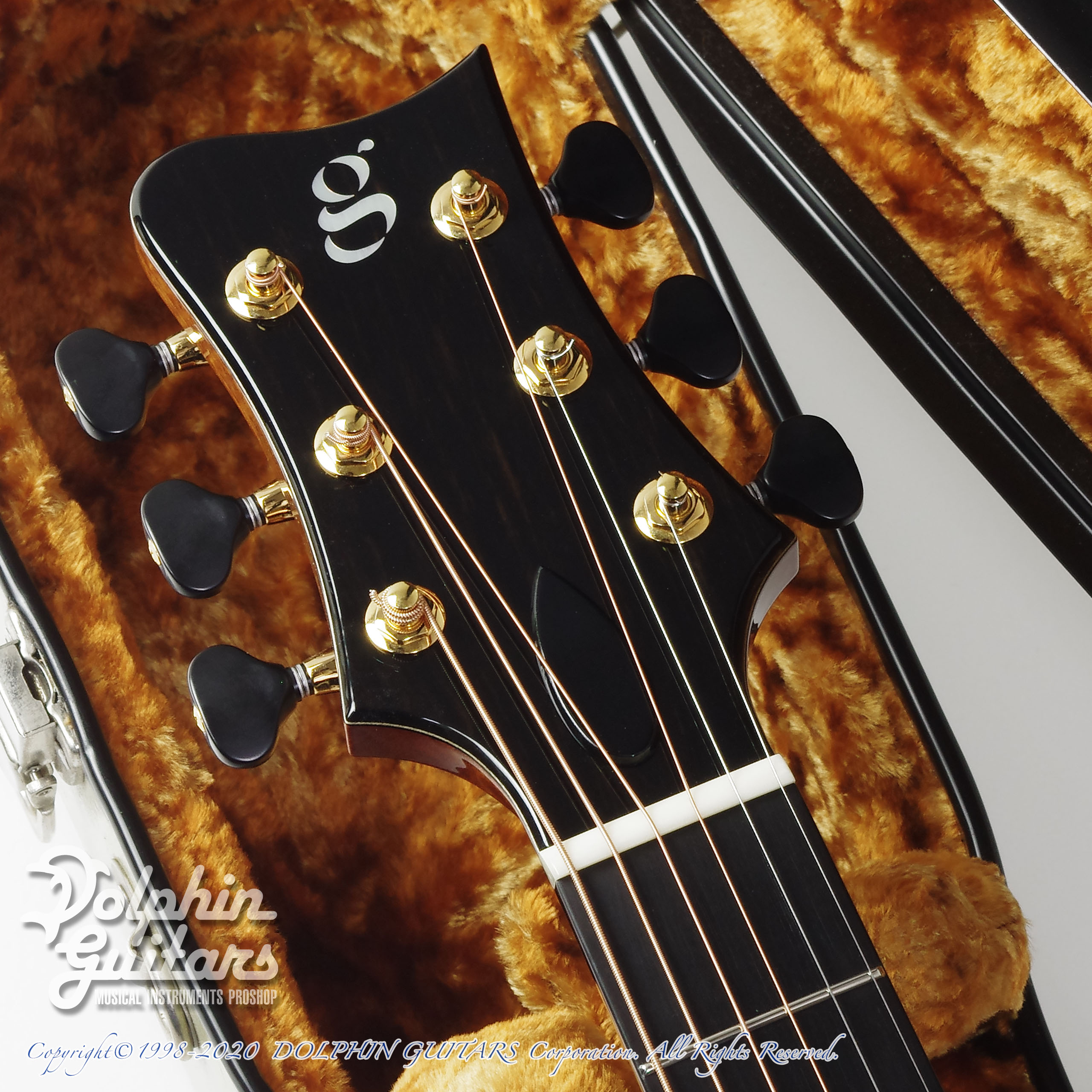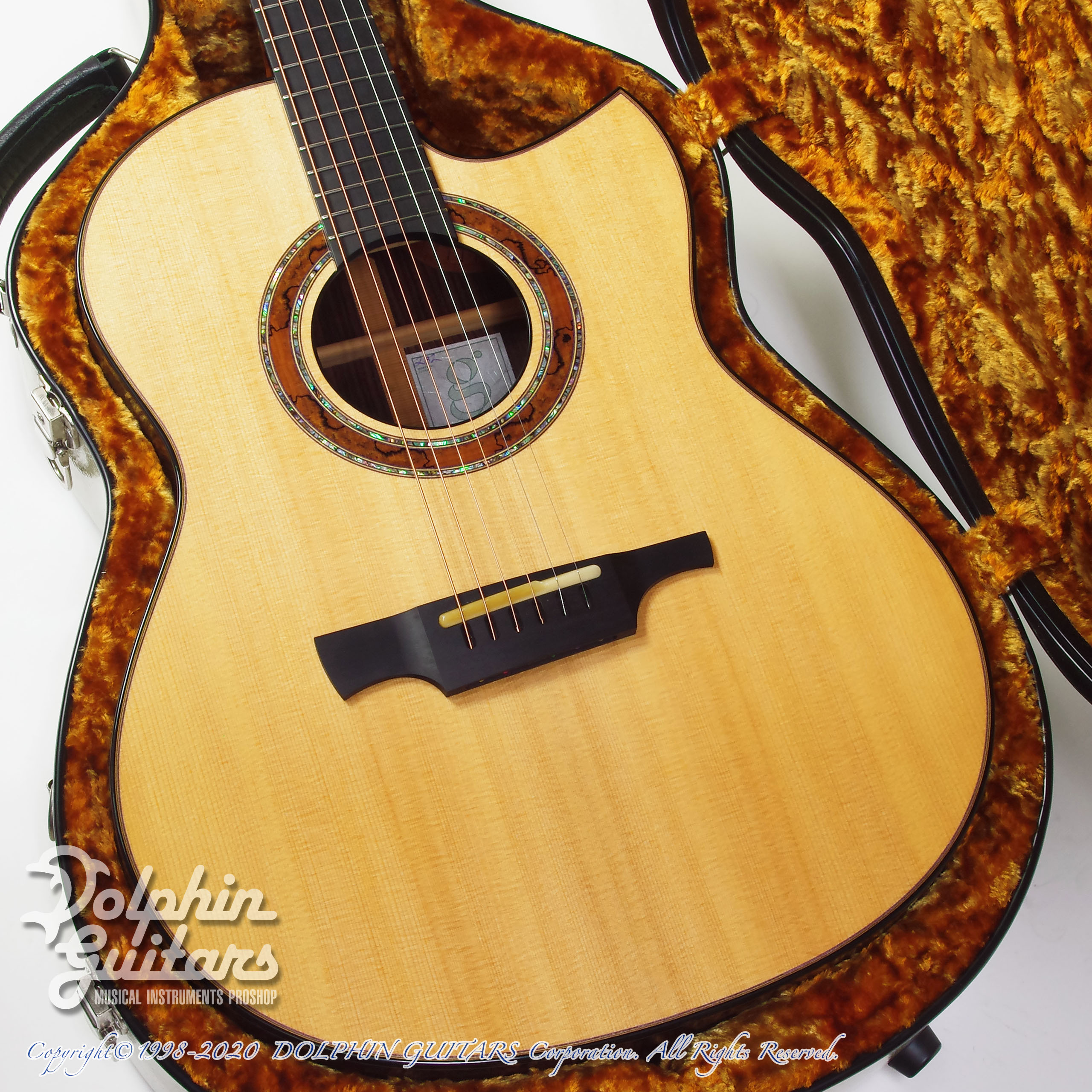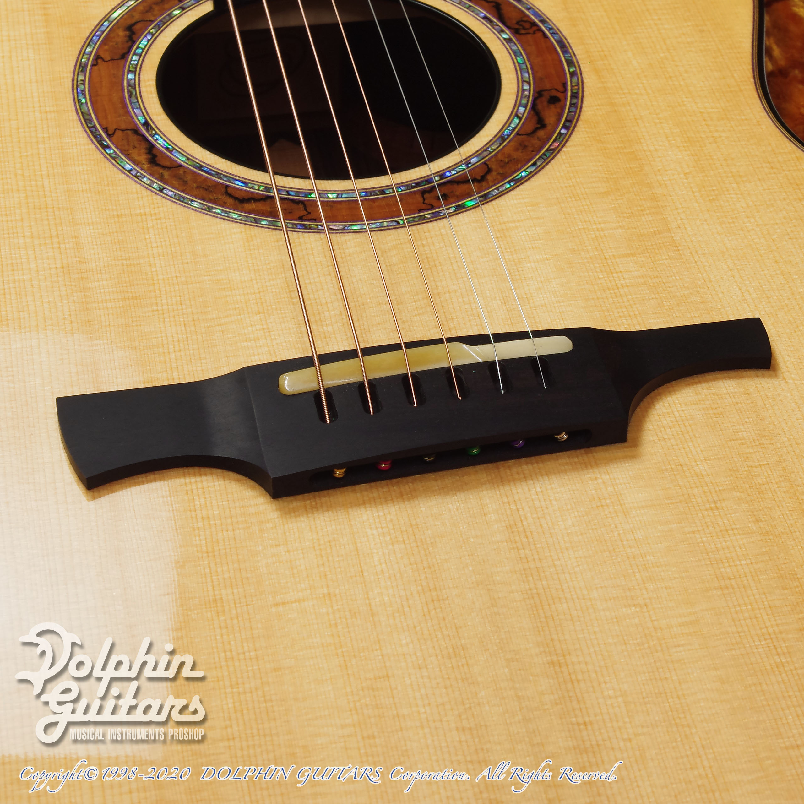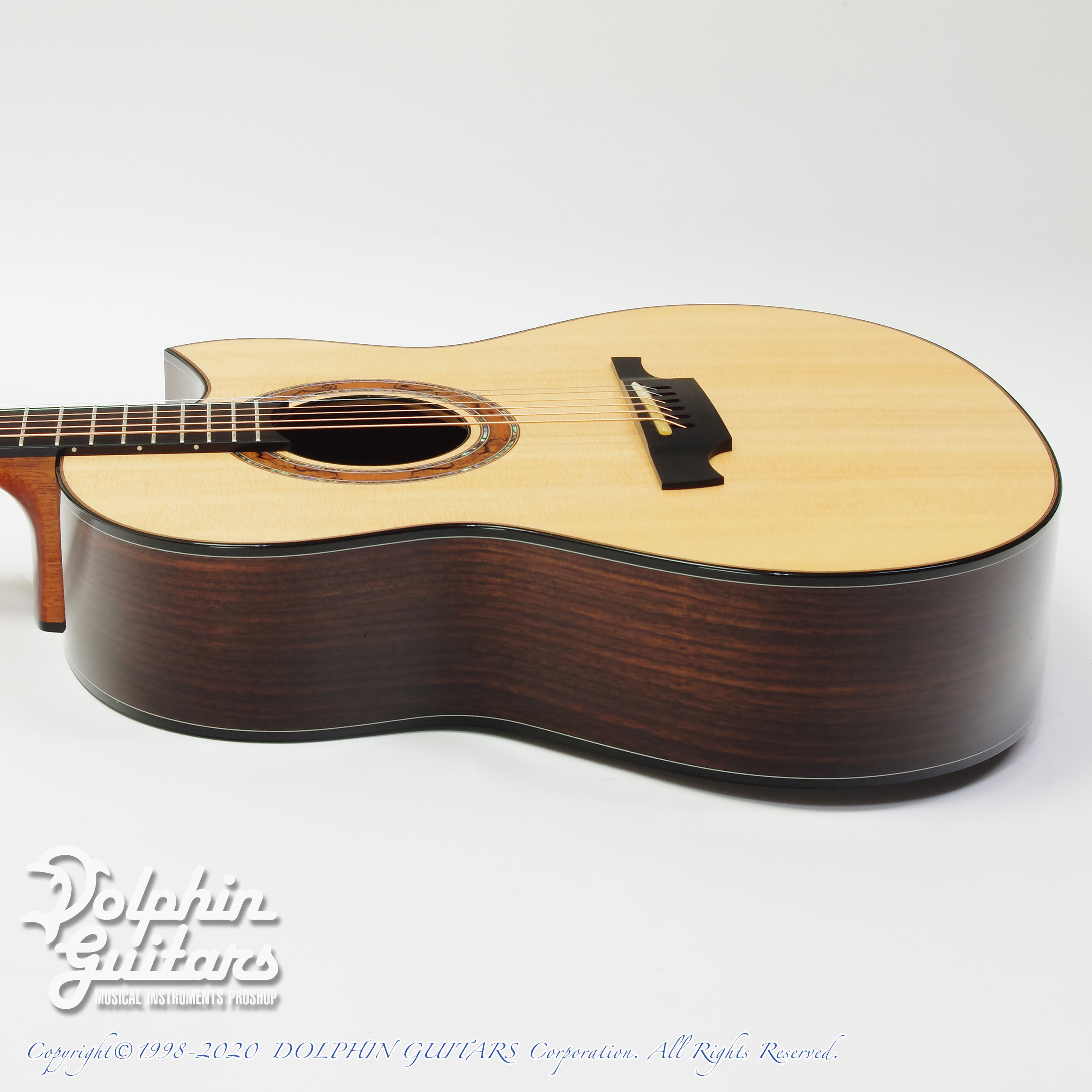 シトカ スプルースTOP、インディアン ローズウッドS&B、マホガニーネック、、エボニー指板&ブリッジ(ピンレス スルーブリッジ)、スポルテッドメイプル&パウアアバロン ロゼッタ、Gotoh 510ペグ。