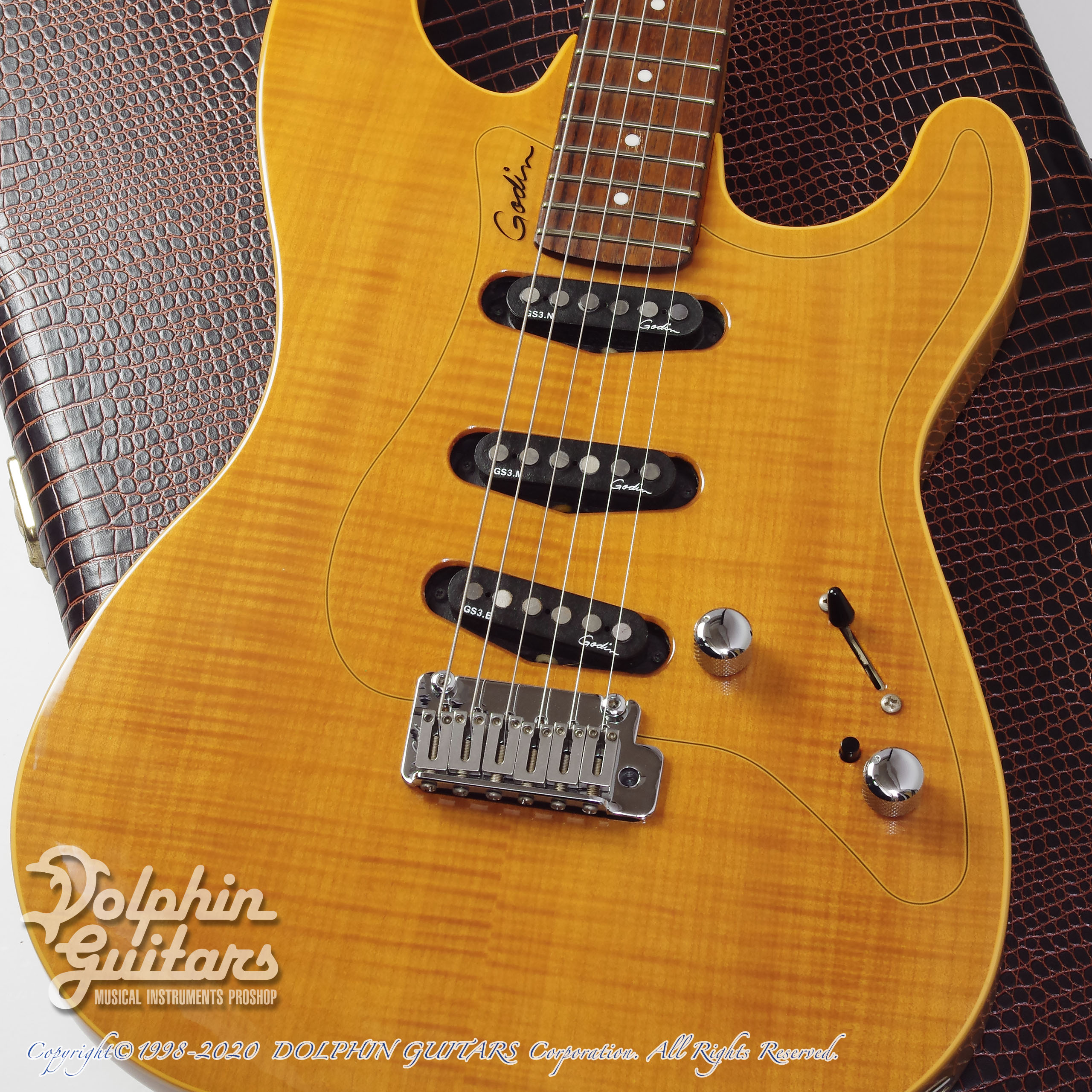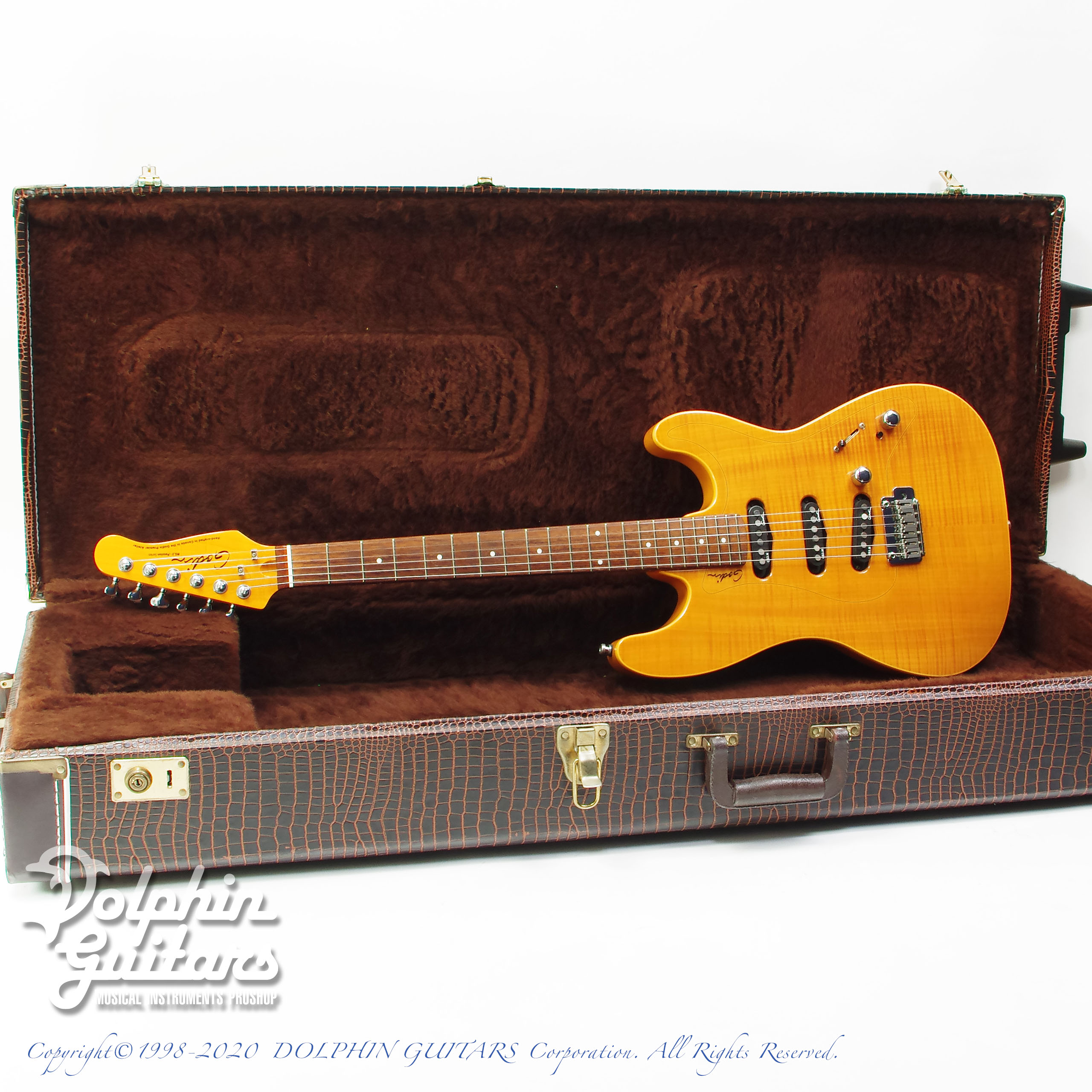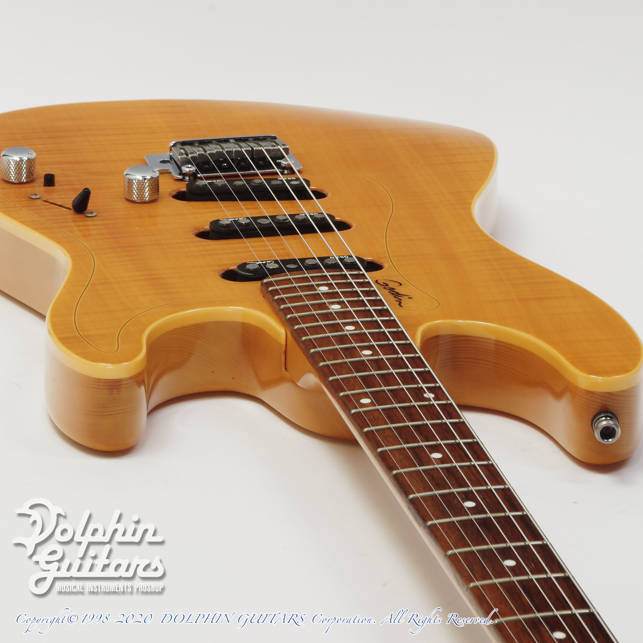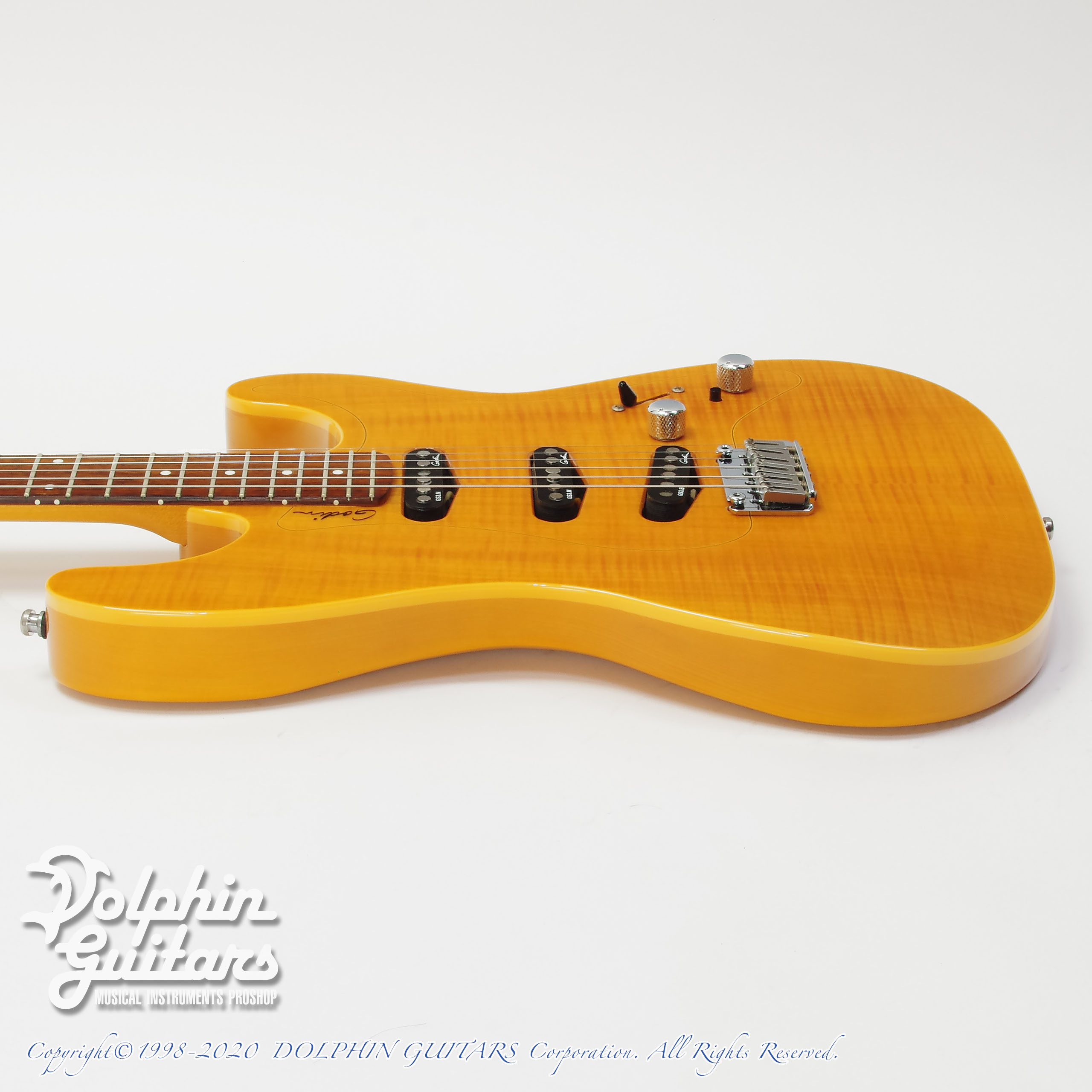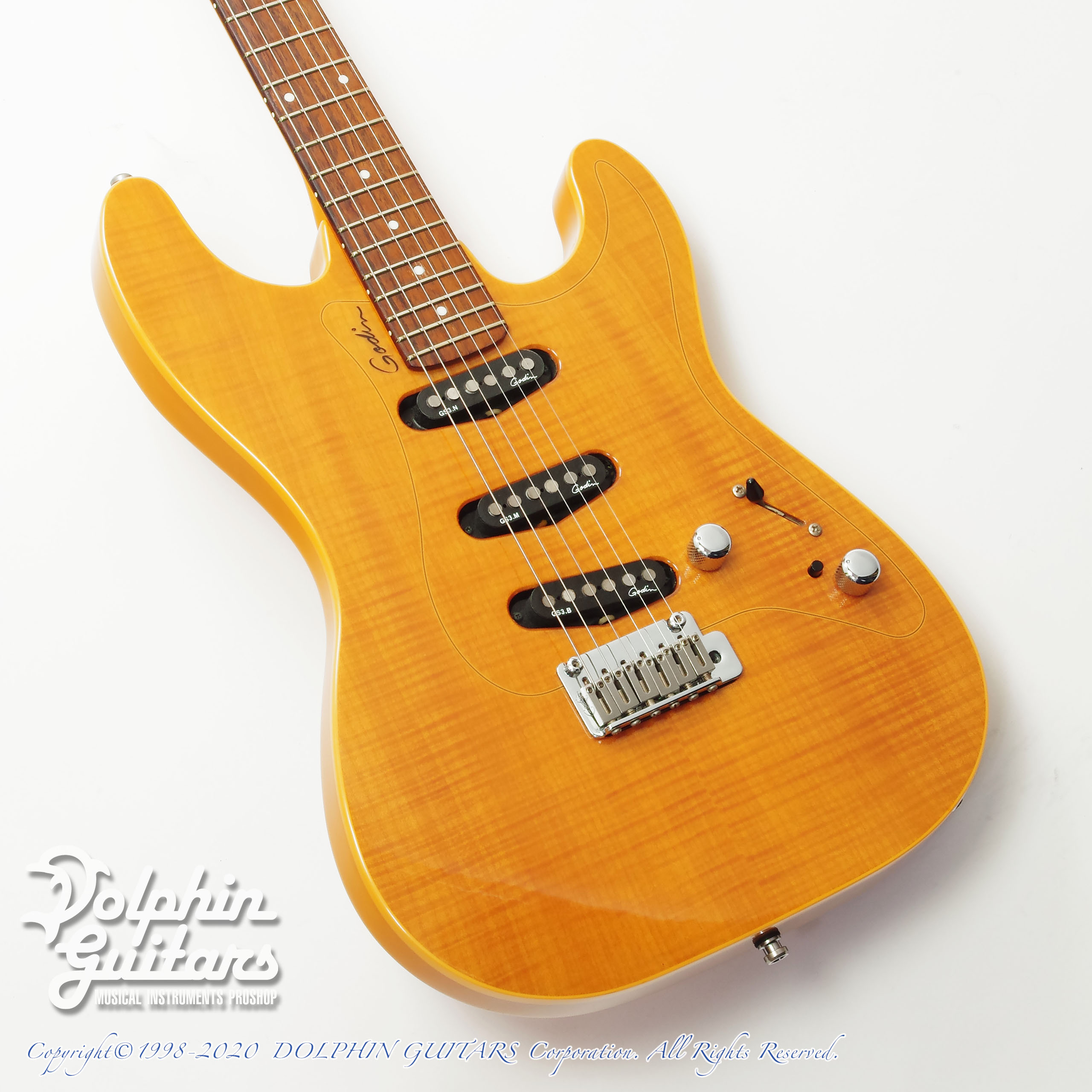 フレイムメイプルTOP、シトカスプルースボディ、メイプルネック、ローズウッド指板、ゴダンGS-3ピックアップ、Gotoh 510ペグ、22フレット仕様、H.D.Rスイッチ装備。