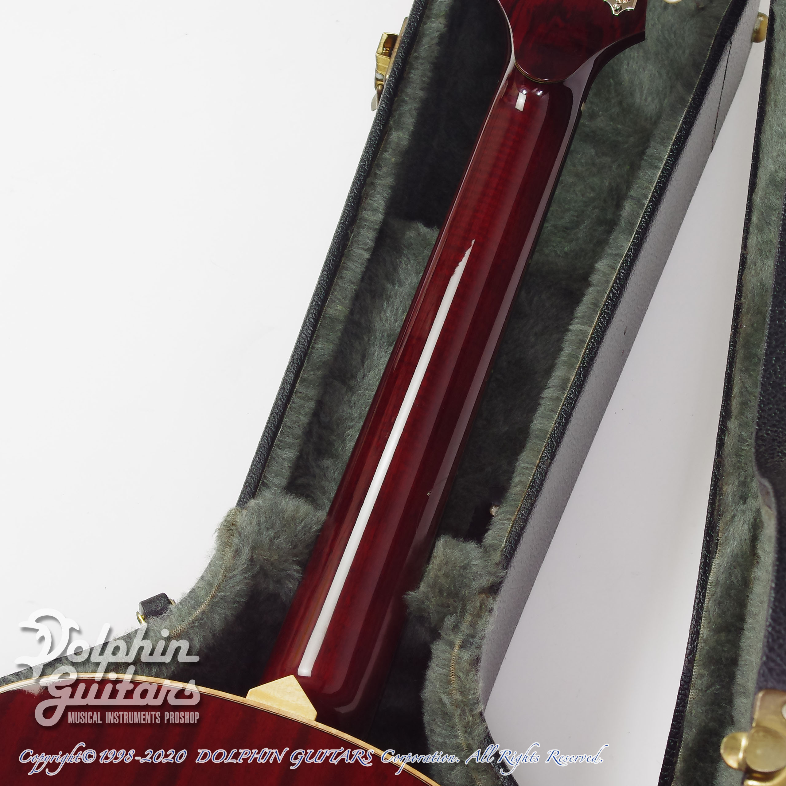 ネック材はフレイムの木目が美しいホンジュラスマホガニー1ピース。着色しているため遠目では分かりづらいですが、間近で見るともの凄いフレイムです。ネックシェイプはCシェイプ、ネックは傷も無くとても美しい状態です。ヒールキャップはメイプル。