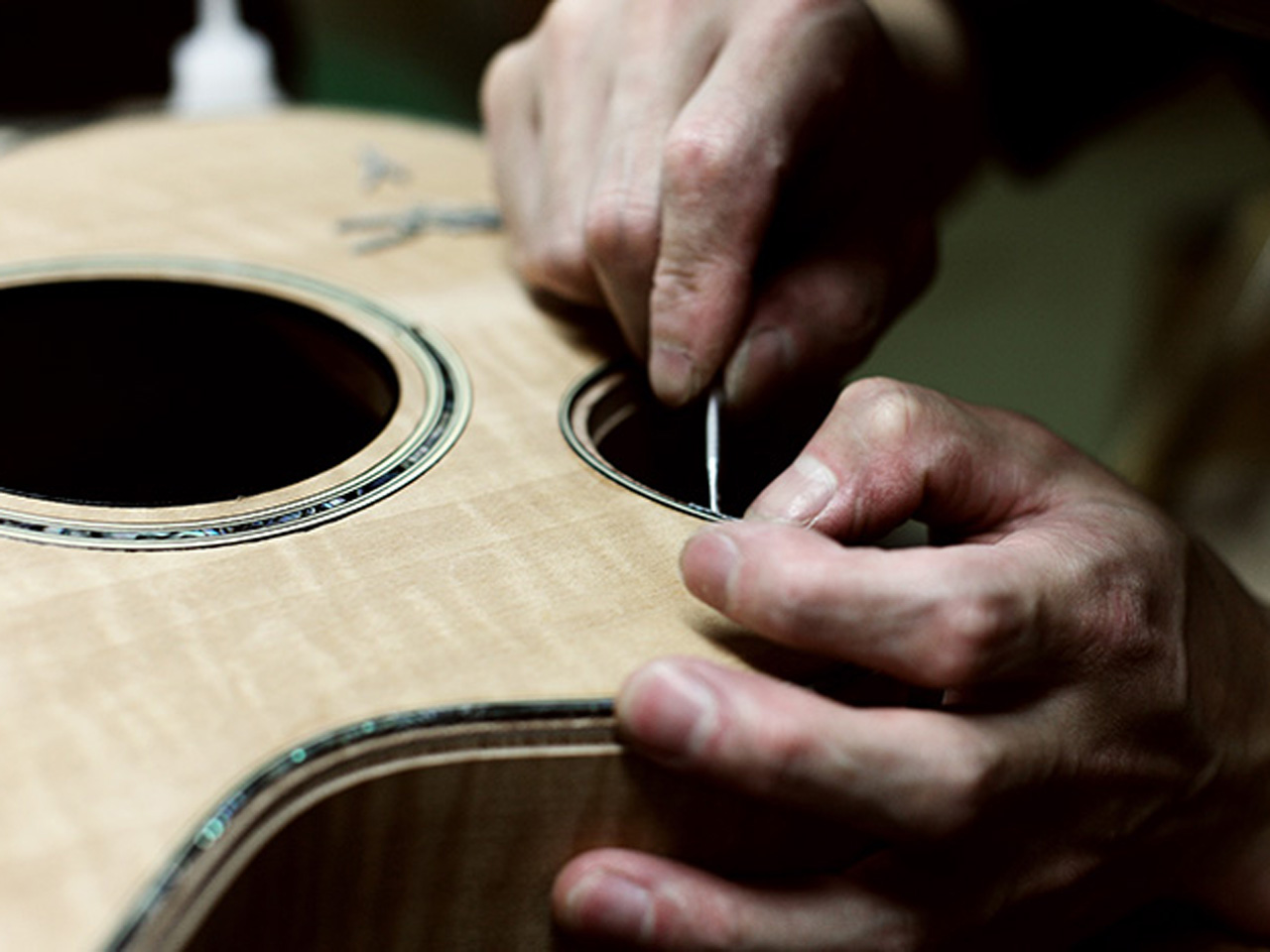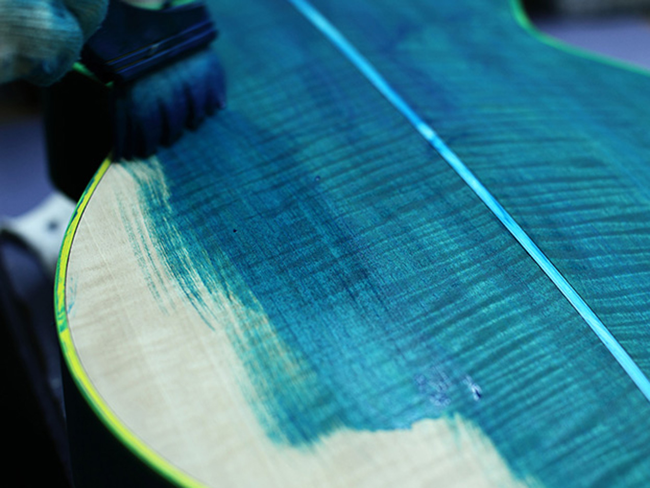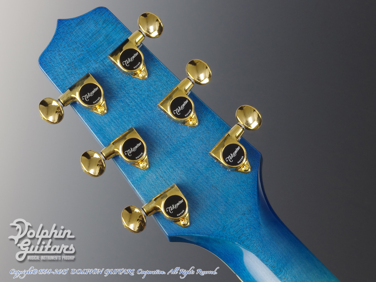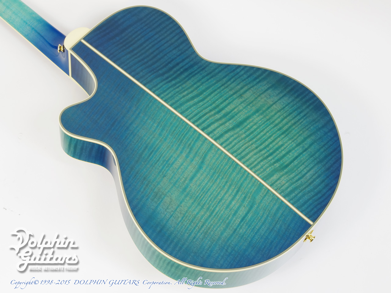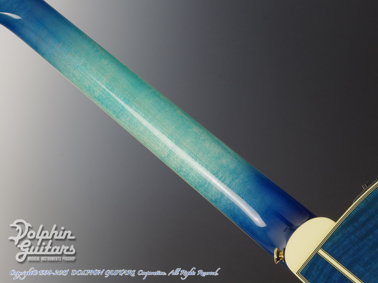 美しいトラ杢のフィギュアード・メイプルボディには、鮎が棲む岐阜の清流をイメージした翠色を着色し、
