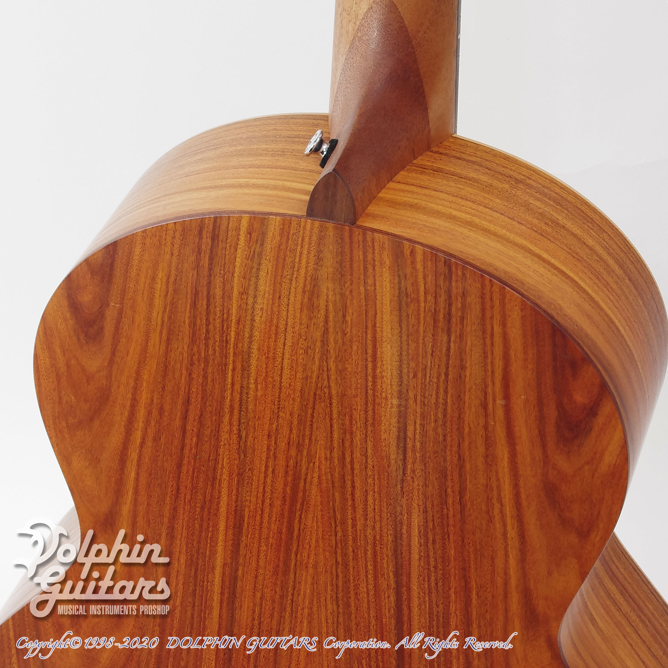 S-02はベベルコンター(アームレスト)にPUを標準装備。ボディ バインディング無し、塗装はツヤ消し仕上げのとてもシンプルなルックス。塗膜は非常に薄く、サウンドもウッディなニュアンスを感じさせます。スモールサイズですがベベルコンターが効果的です。