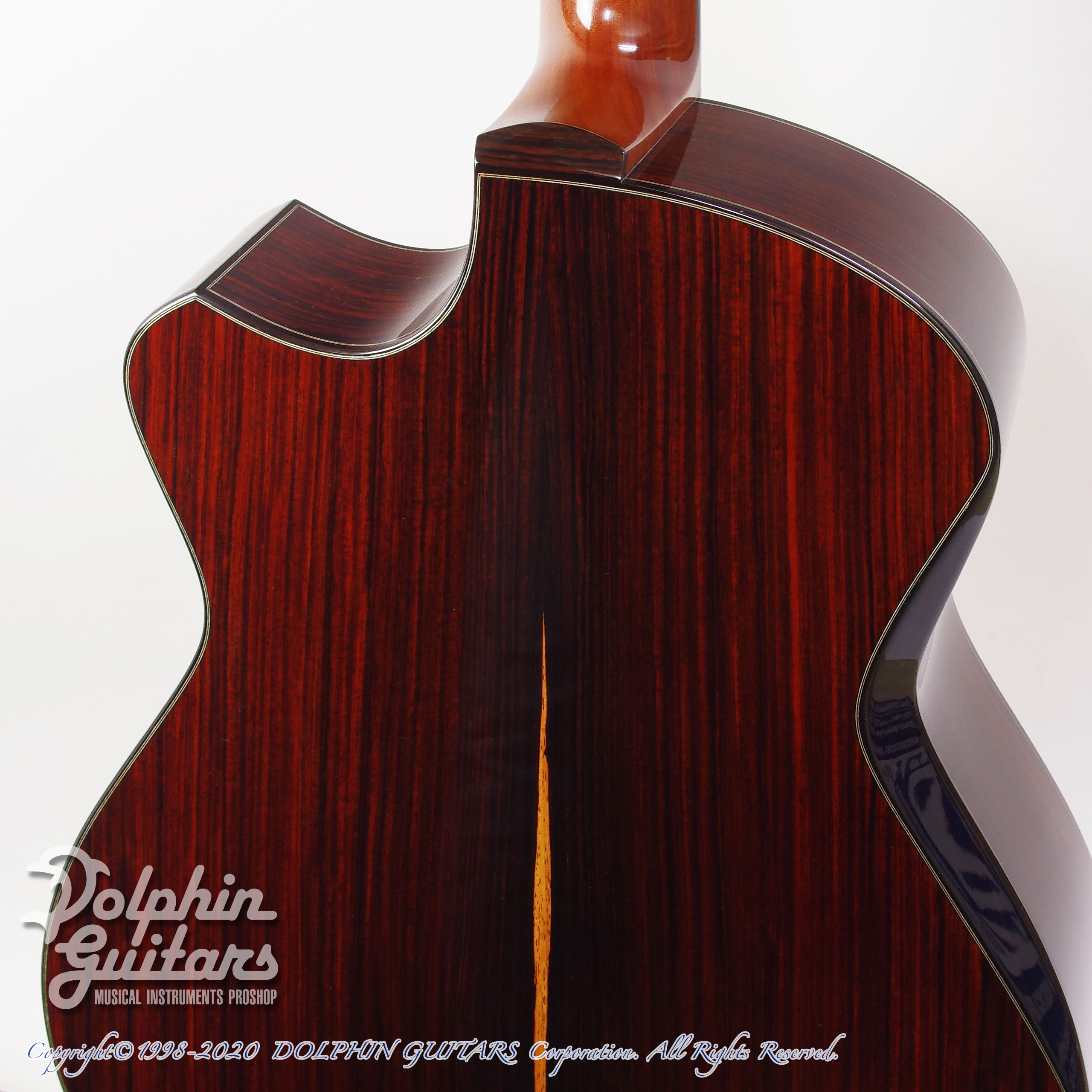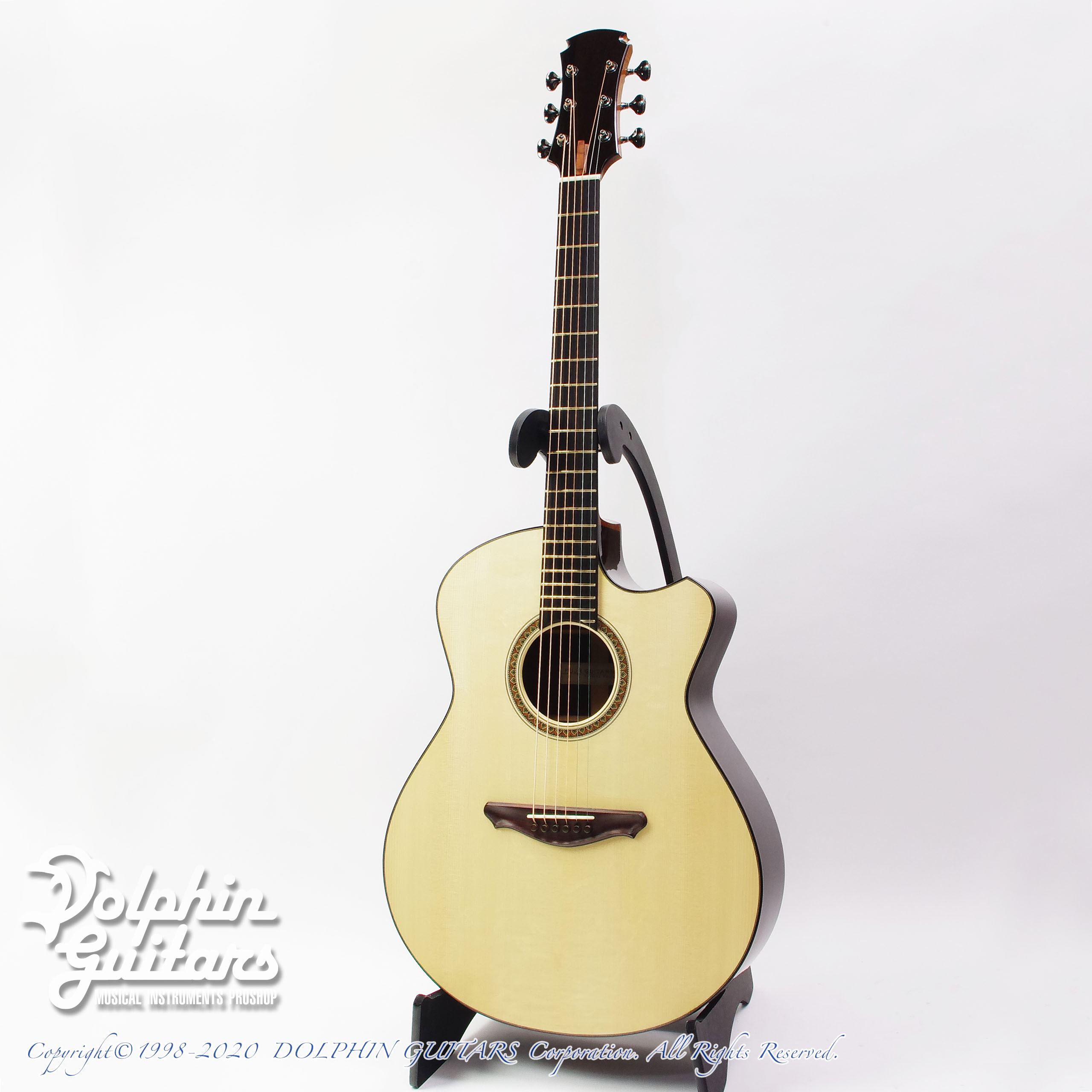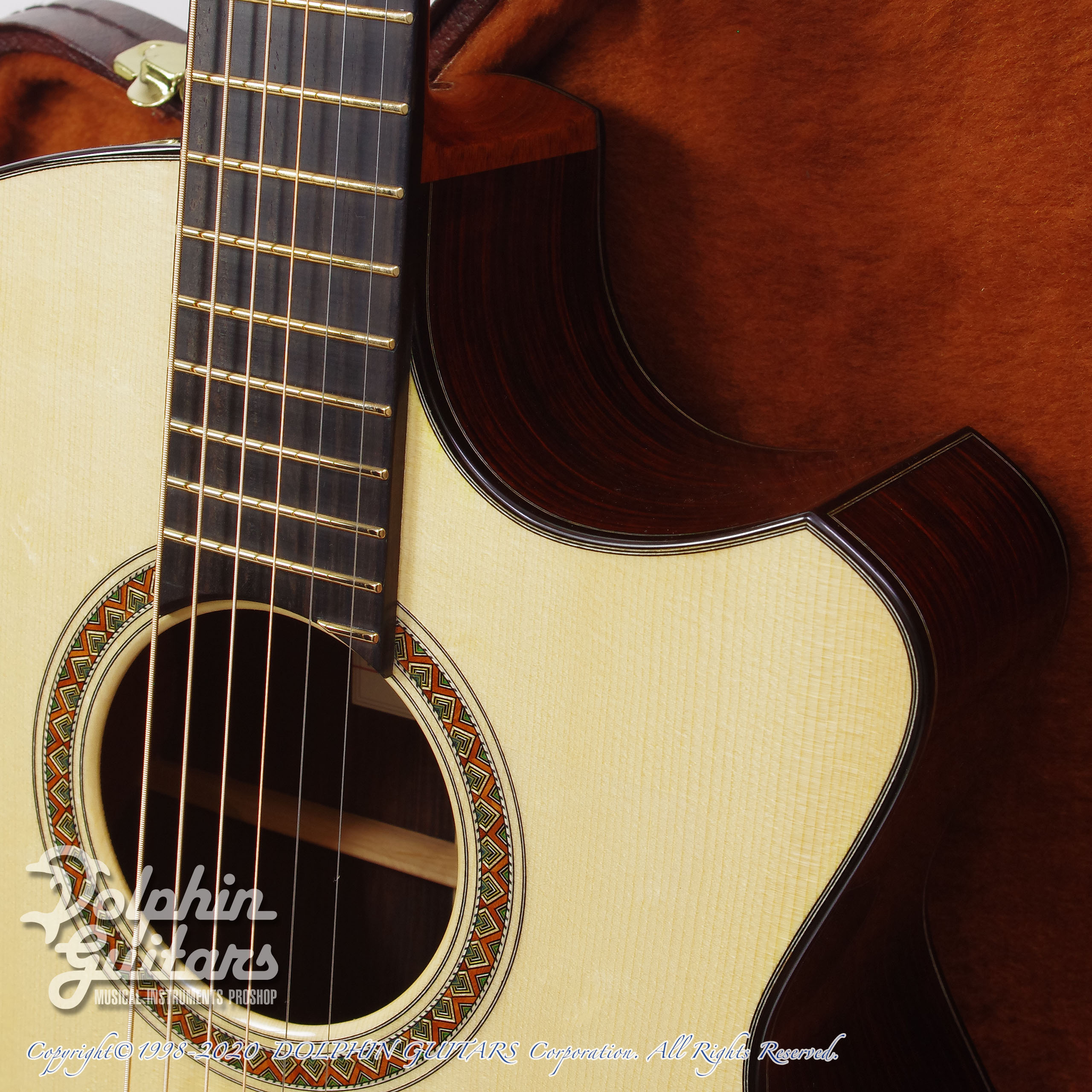 ジャーマンスプルースTOP、ココボロS&B、ホンデュラスマホガニーネック、エボニー指板、アマゾンローズブリッジ、リブレスト(バックコンター)、ウッドロゼッタ(オリジナルデザイン)、Gotoh510ペグ、フローレンタインカッタウェイ仕様。