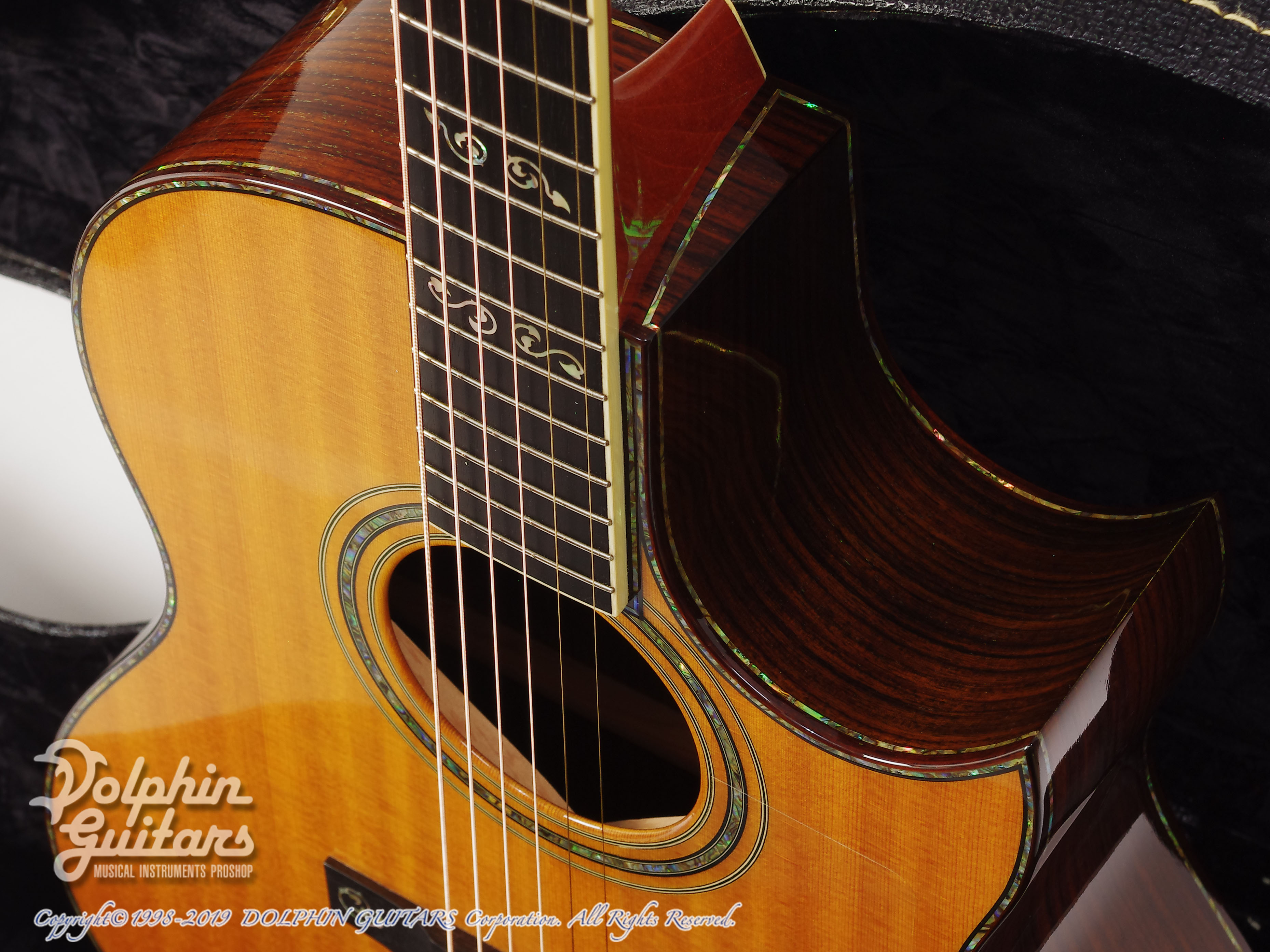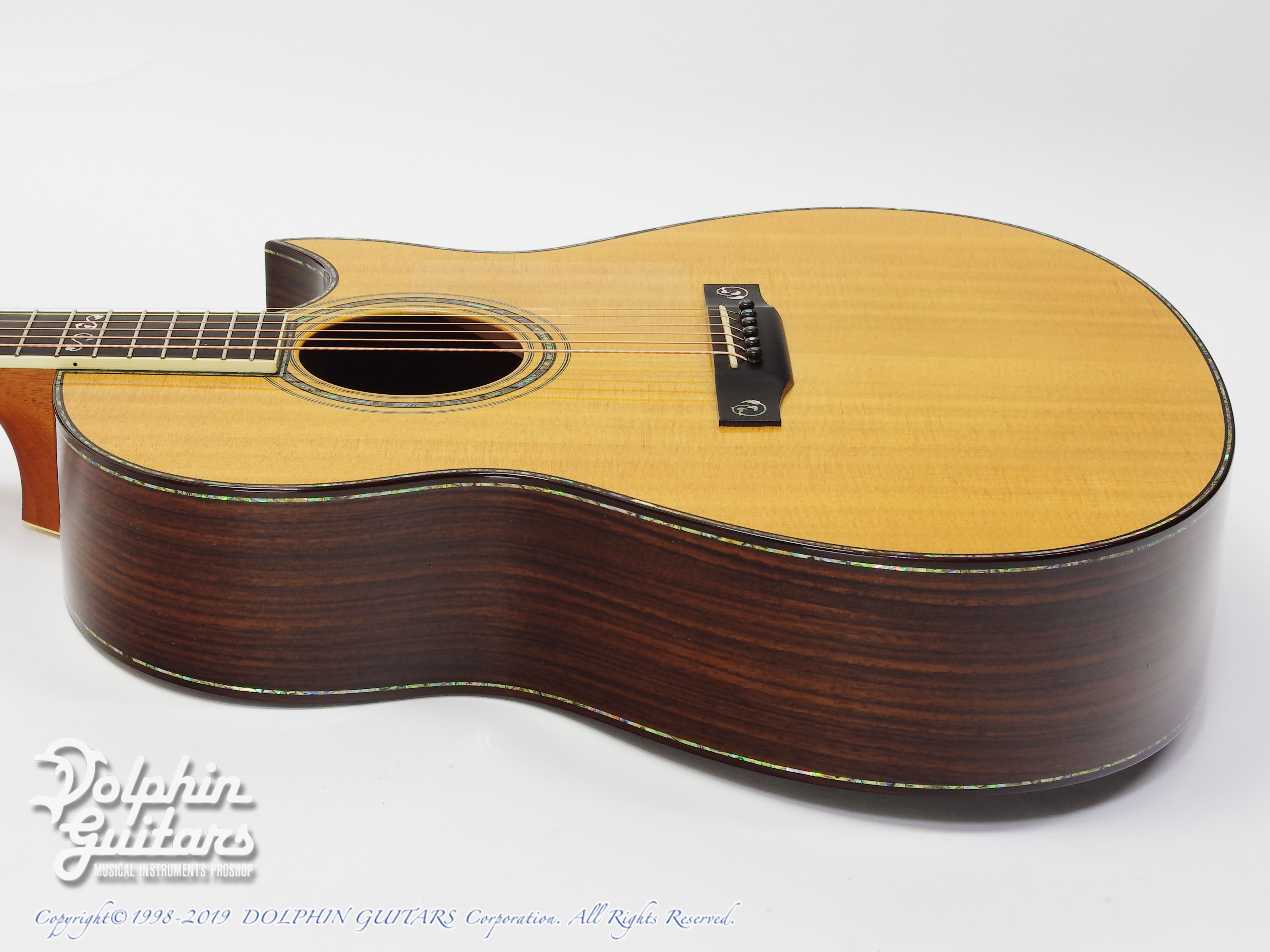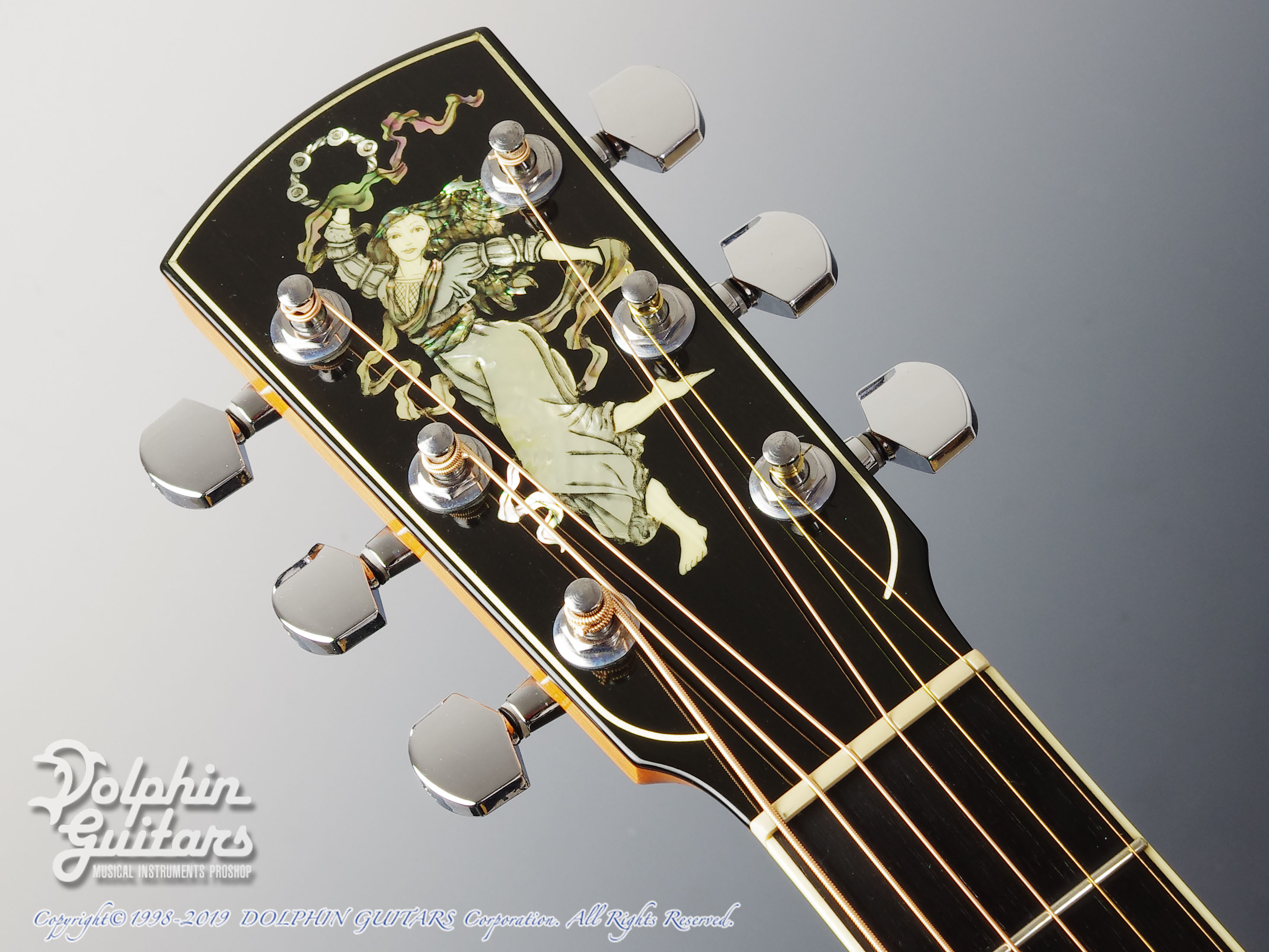 シトカ スプルースTOP、インディアンローズウッドS&B、エボニー指板&ブリッジ、アバロントリム&ロゼッタ、タンバリンガールインレイ、フローレンタインカッタウェイ、クリアPG、シャーラーロトマティックペグ。