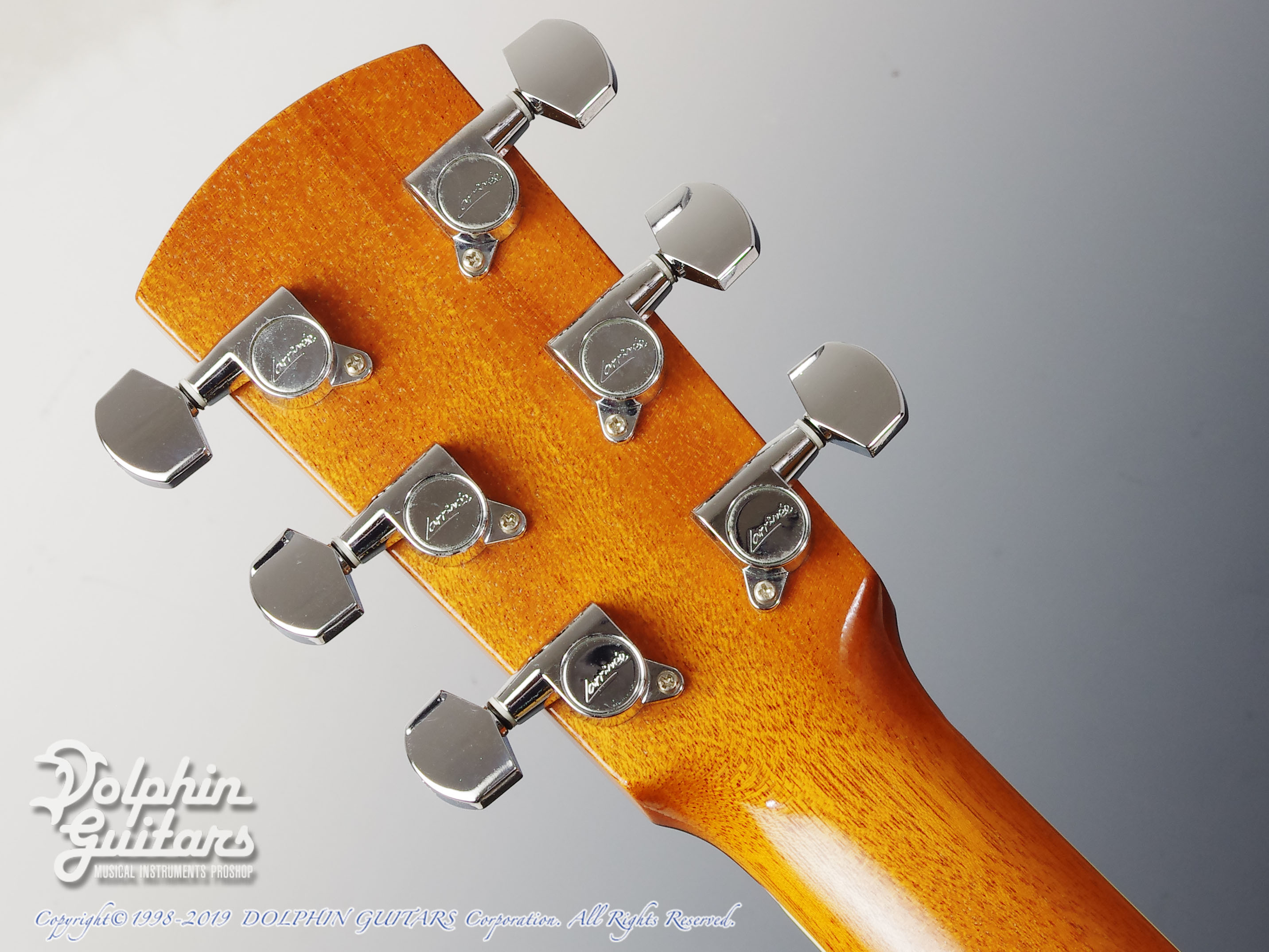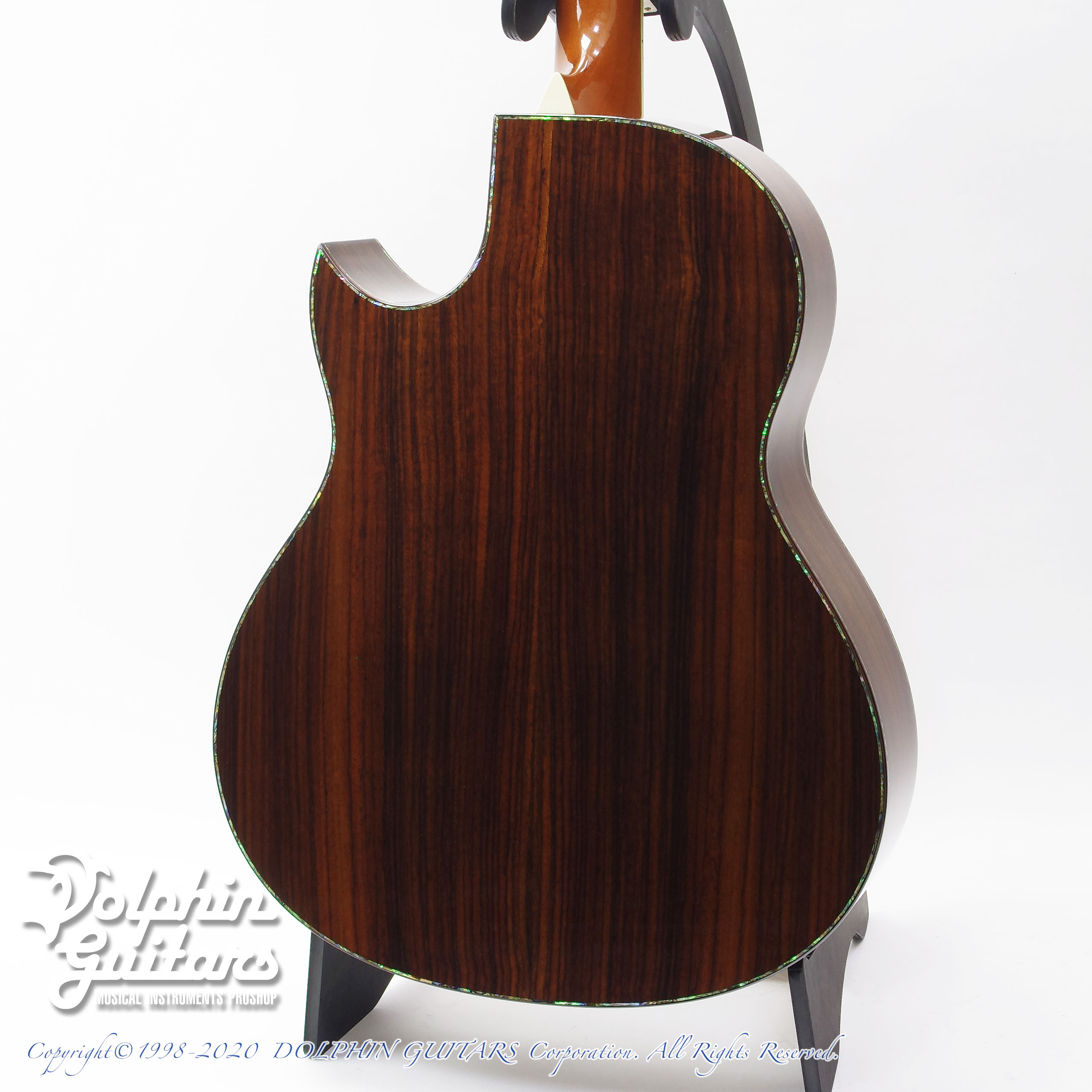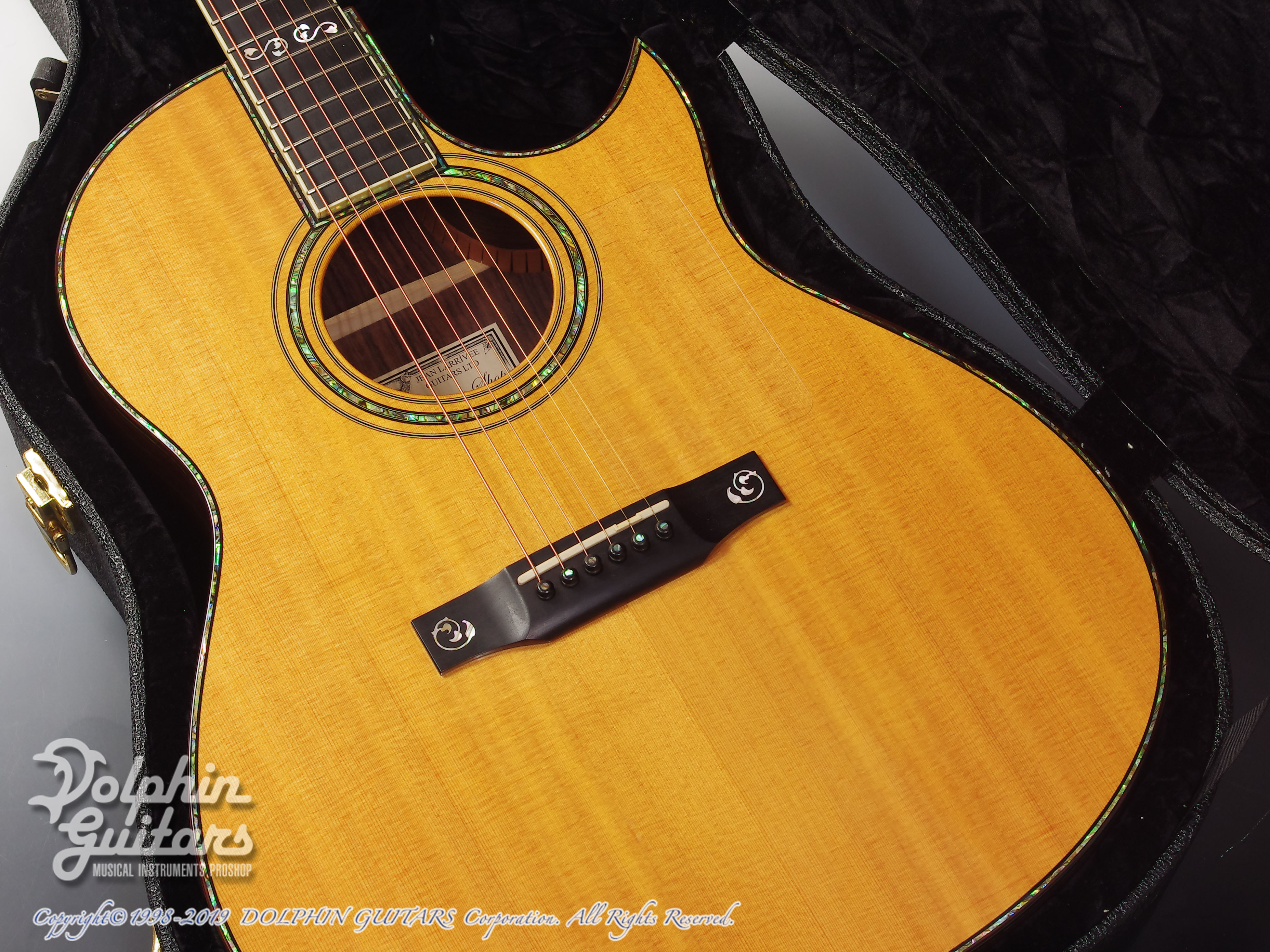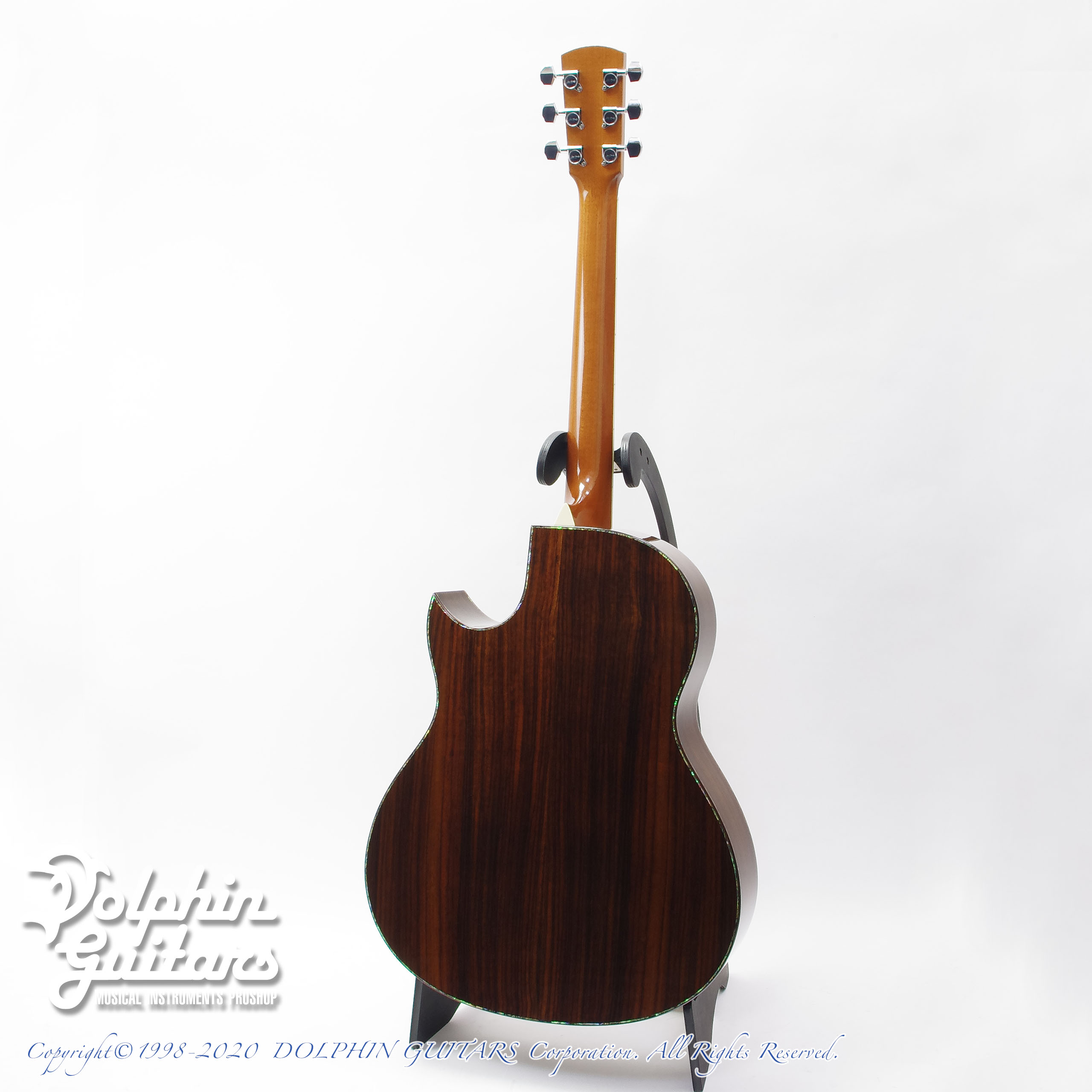 シトカ スプルースTOP、インディアンローズウッドS&B、エボニー指板&ブリッジ、アバロントリム&ロゼッタ、タンバリンガールインレイ、フローレンタインカッタウェイ、クリアPG、シャーラーロトマティックペグ。
