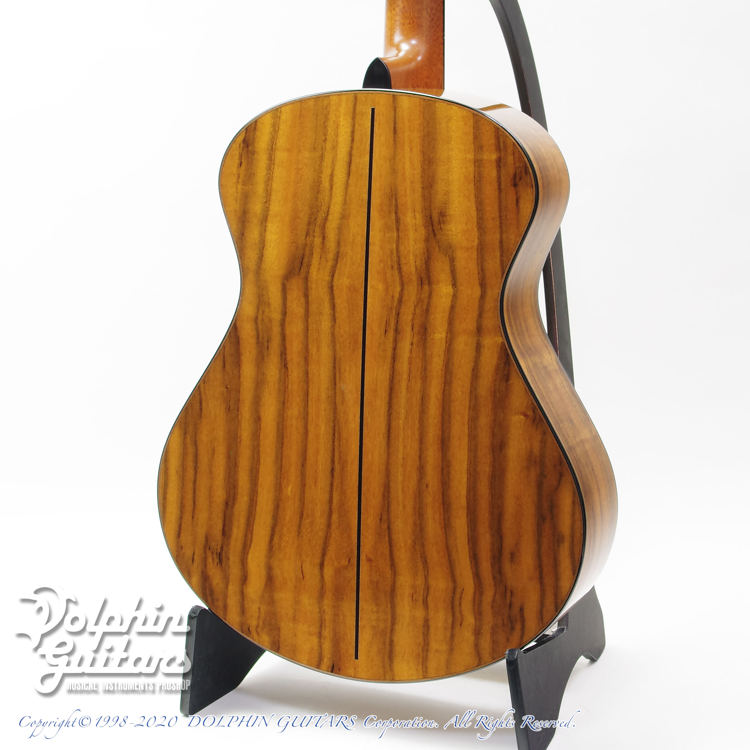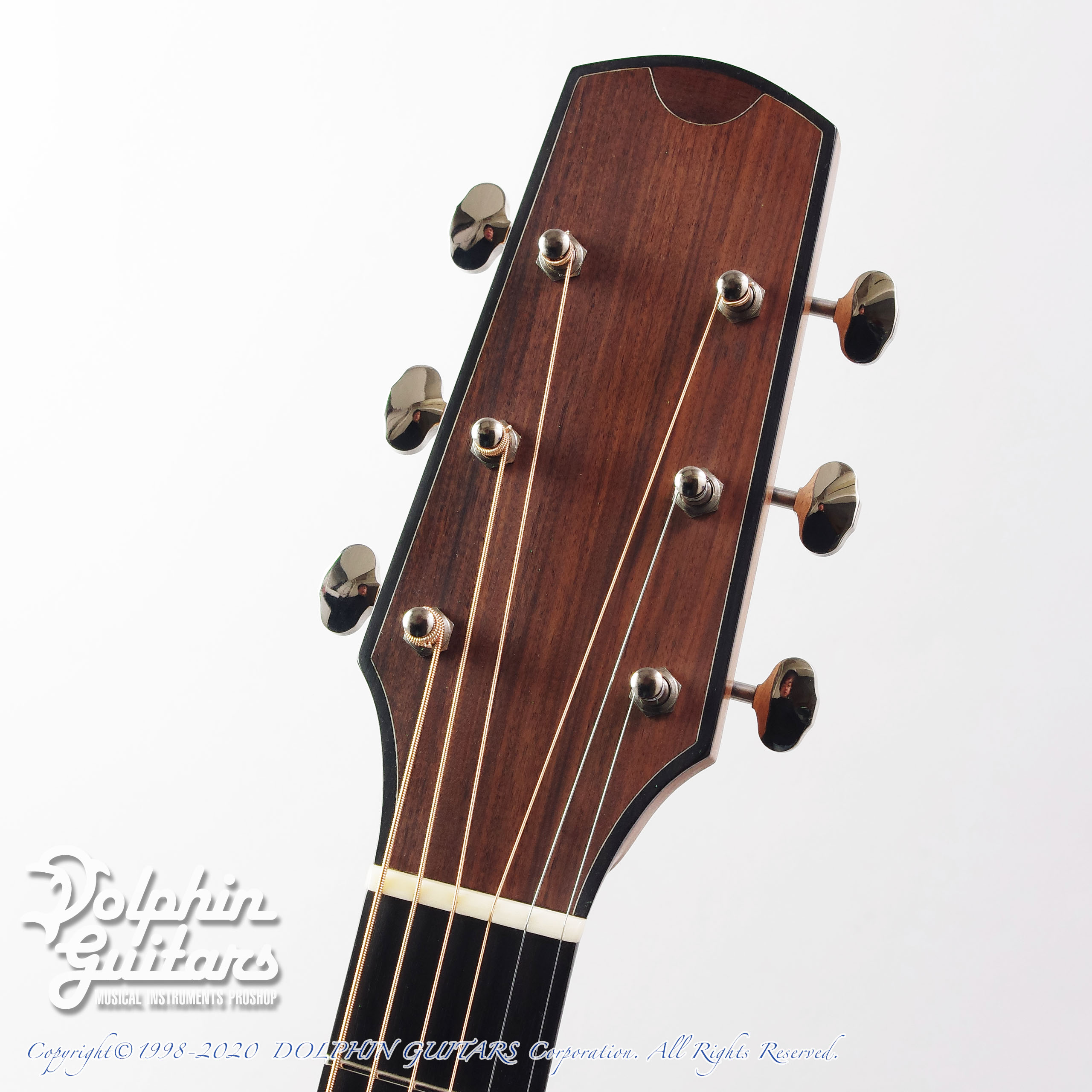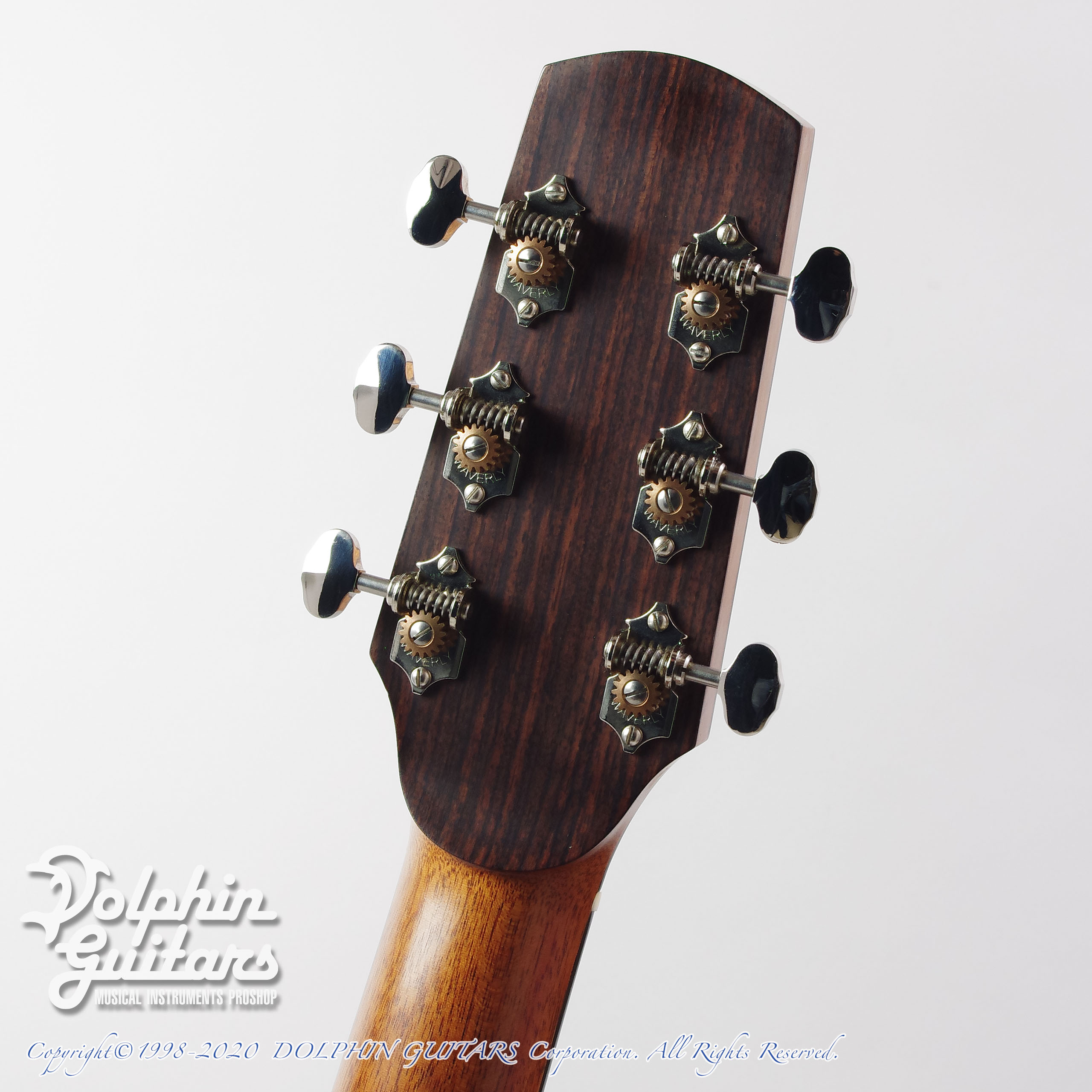 本作は外観的にはシンプルな装飾ですが、内部構造は非常に個性的で、ボディバックのCapped X-braceと呼ばれるブレイシングは、一見して彼のギターであるとわかると同時に、強度アップ、サウンドコントロールと重要な要素の一つであります。