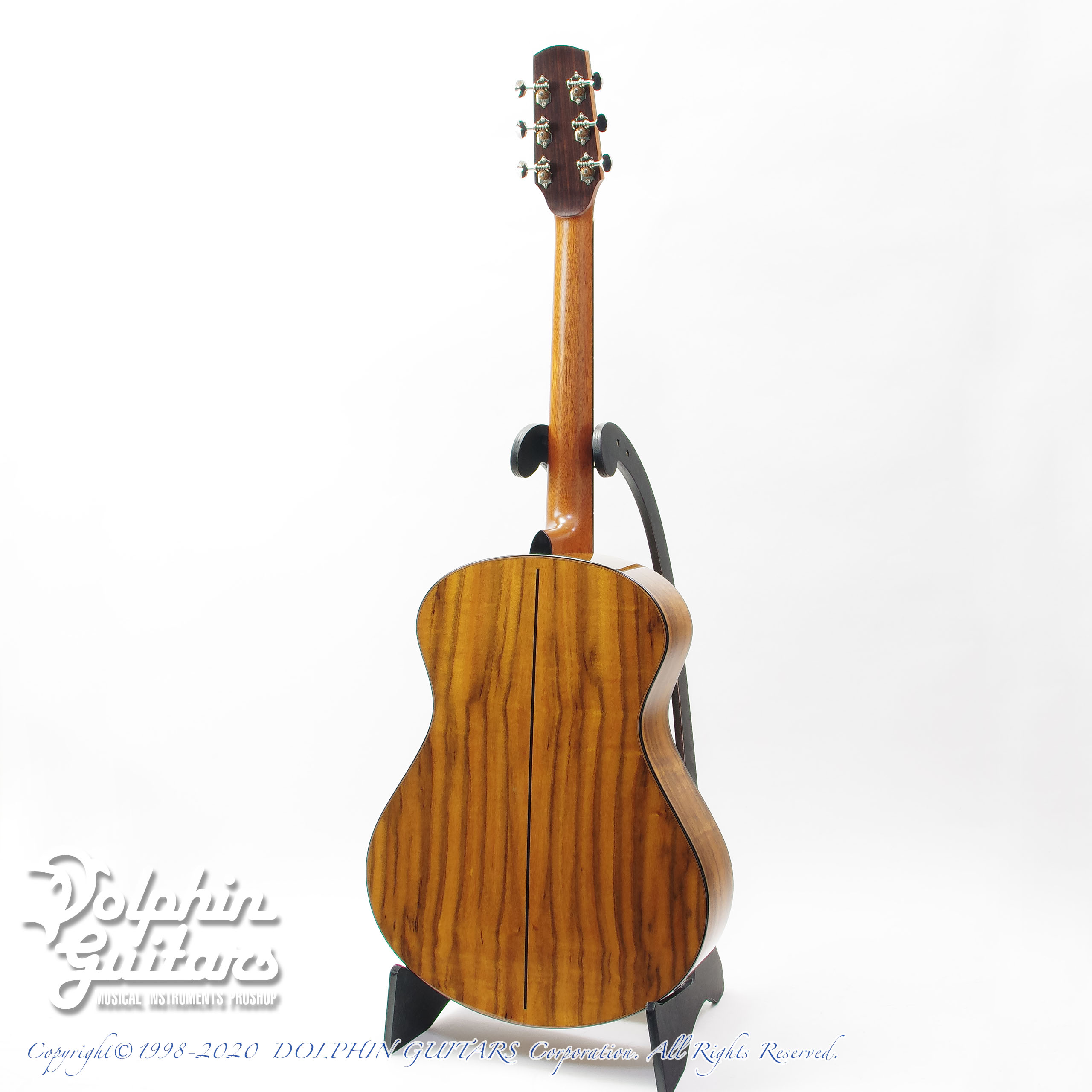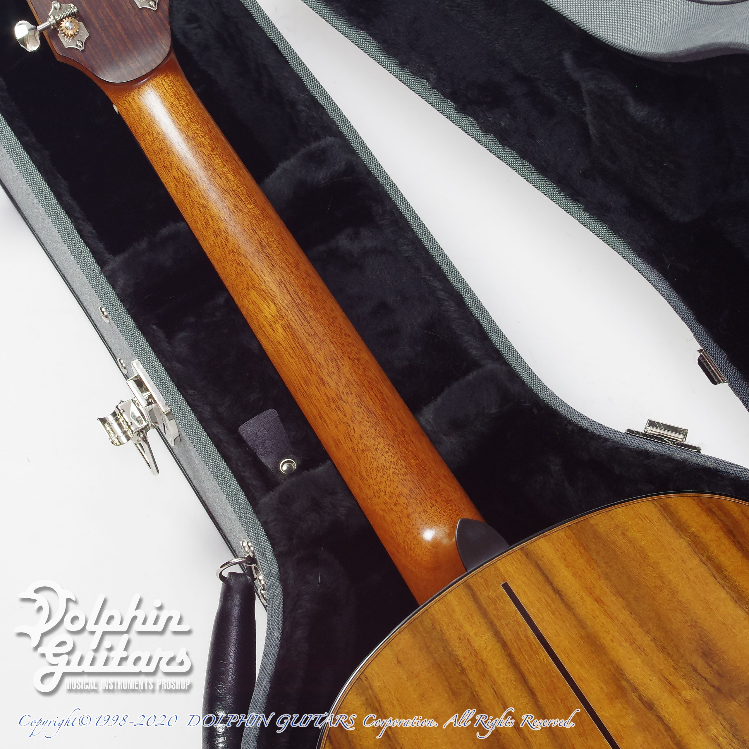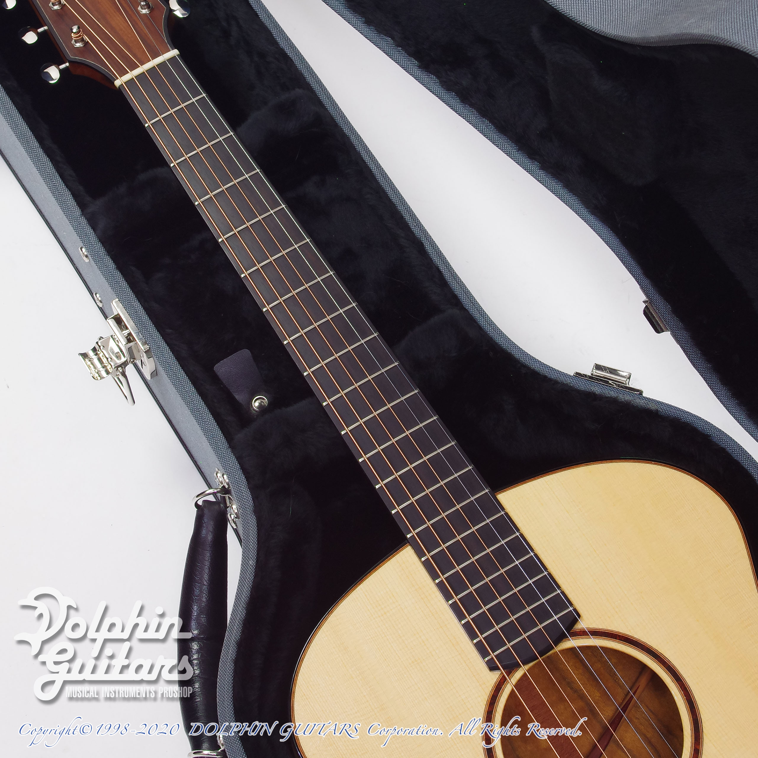 本作は外観的にはシンプルな装飾ですが、内部構造は非常に個性的で、ボディバックのCapped X-braceと呼ばれるブレイシングは、一見して彼のギターであるとわかると同時に、強度アップ、サウンドコントロールと重要な要素の一つであります。