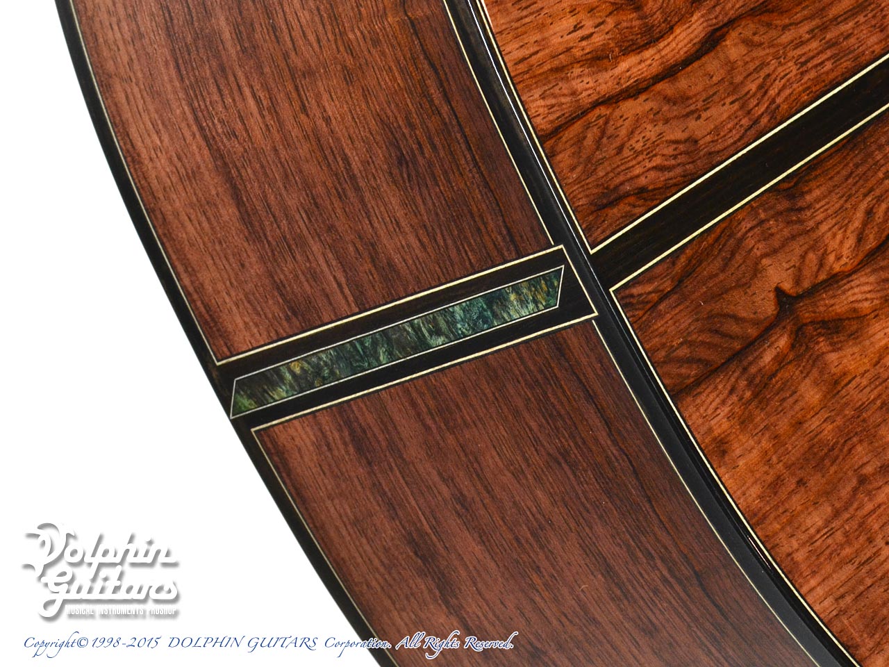 サイドバックに使用しているほのかにピンクがかった柾目材のパロエスクリトは、よく見ると細かいフレイムがびっしりと詰まった素晴らしい杢です。