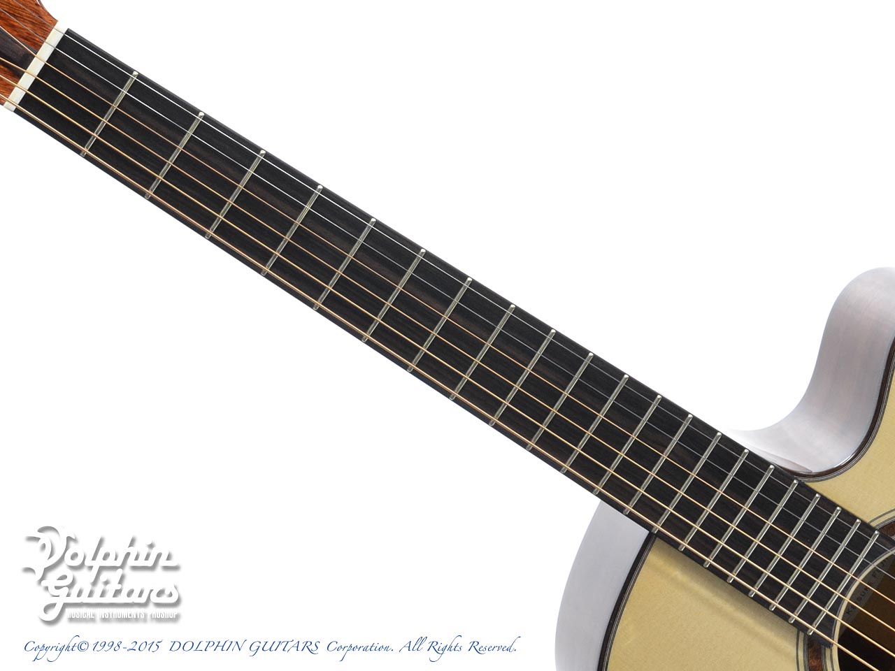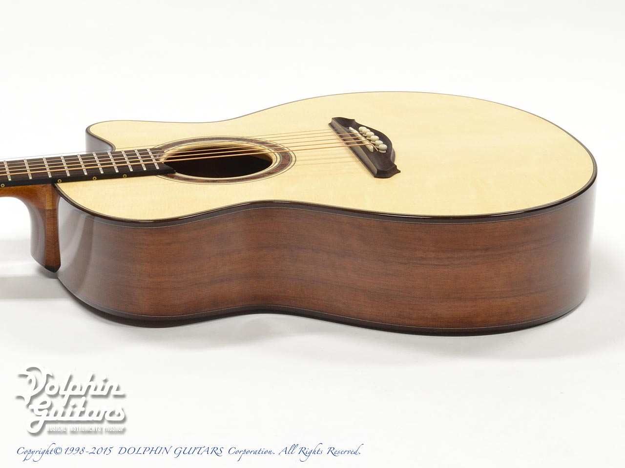 ベアクロウ・ジャーマン・スプルース・トップ、サチャ・ローズウッド・サイド&バック、ストライプド・エボニー指板&アマゾン・ローズウッド駒、ヴェネチアン・カッタウェイ、サティーネ・ヘッドプレート、ゴトー510糸巻き。ロゼッタにはキルテッド・マホガニーを配しております。