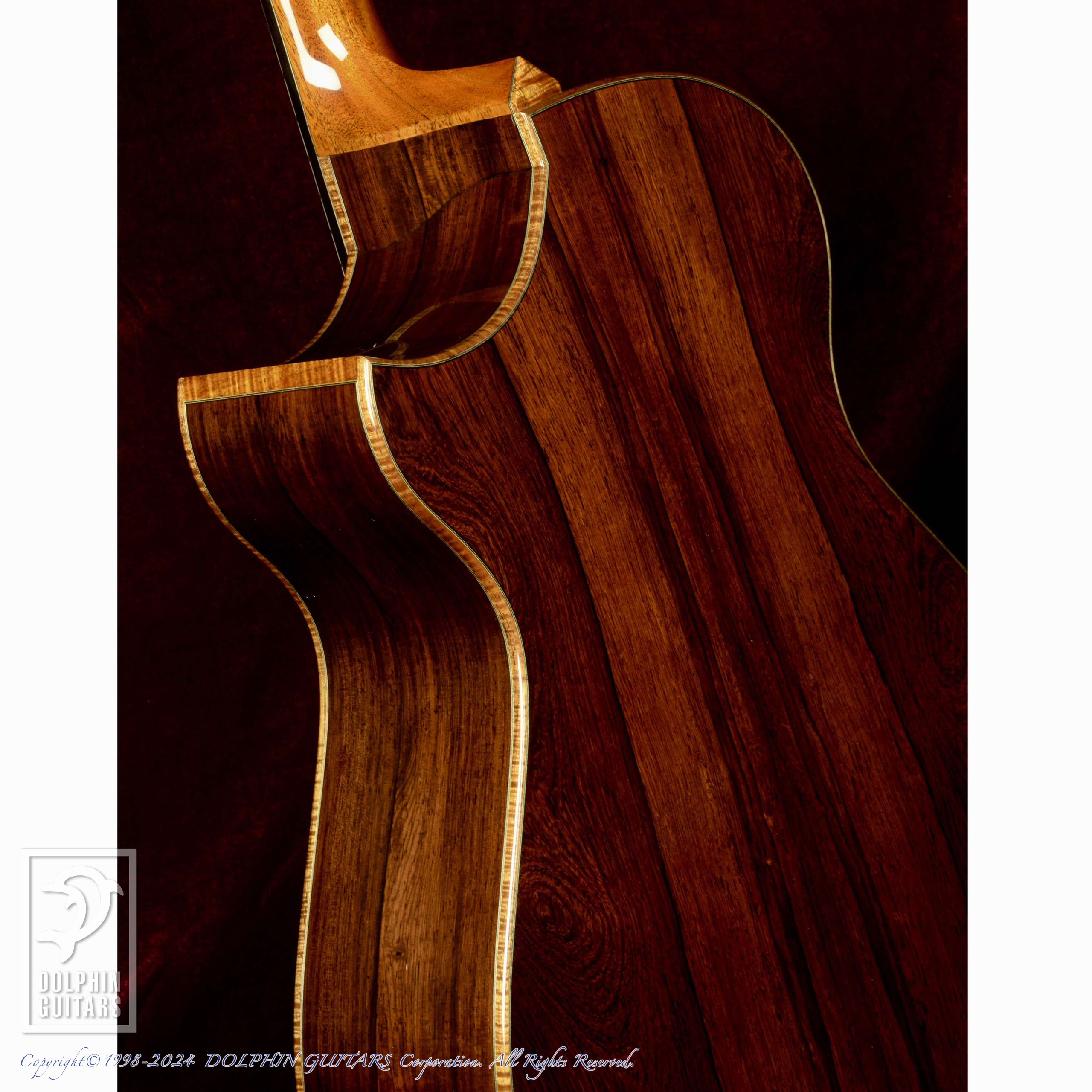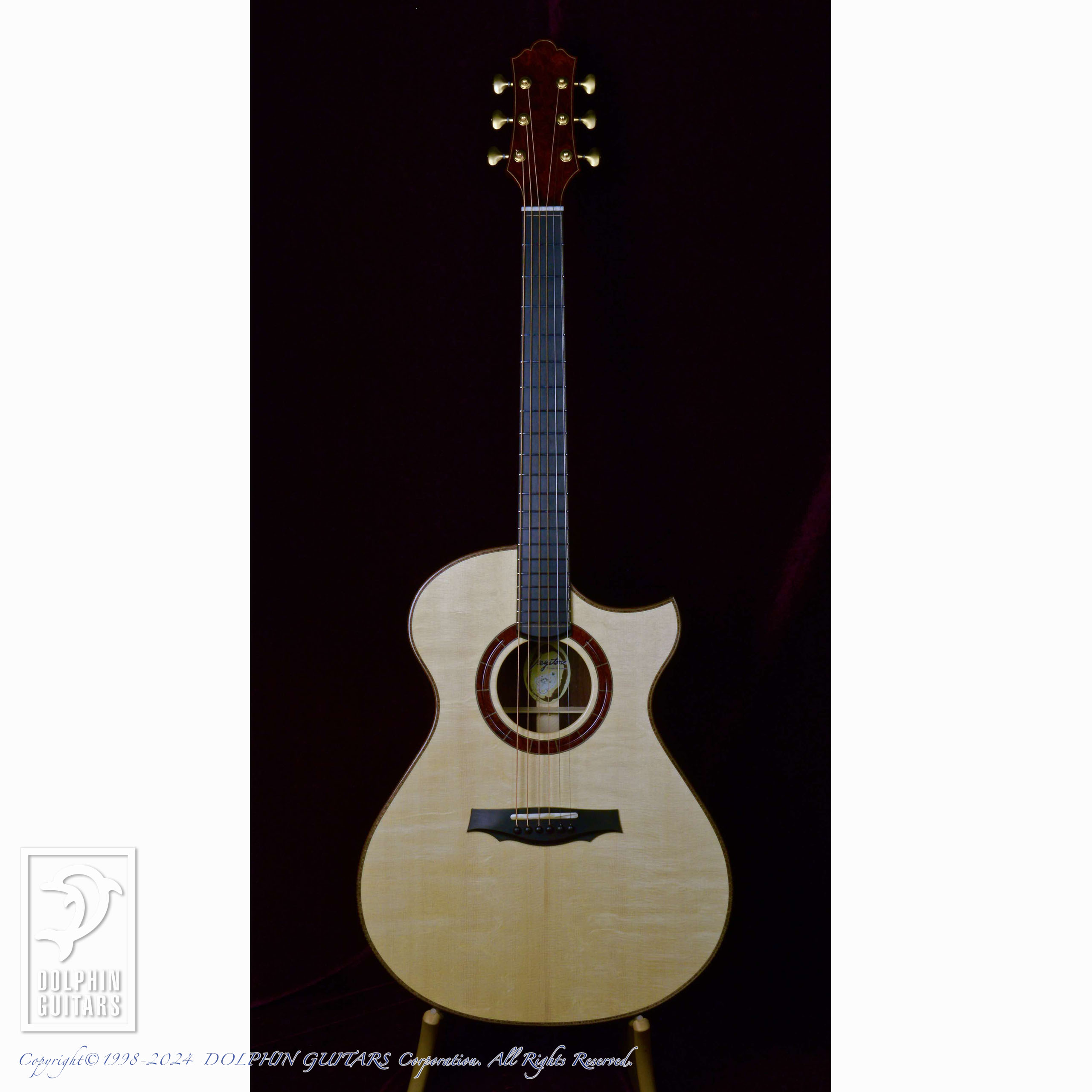 SJスタイルにジャーマンスプルースTop、マダガスカルローズウッドS&Bなどのカスタムが施された本器。ボディ材の杢目もさることながら、鏡のような塗装の質感や、フレイム杢のびっしり入ったハワイアンコアのバインディングなど、アバロンなどを用いずシンプルな装飾でありながら全体から高級感を漂わせています。